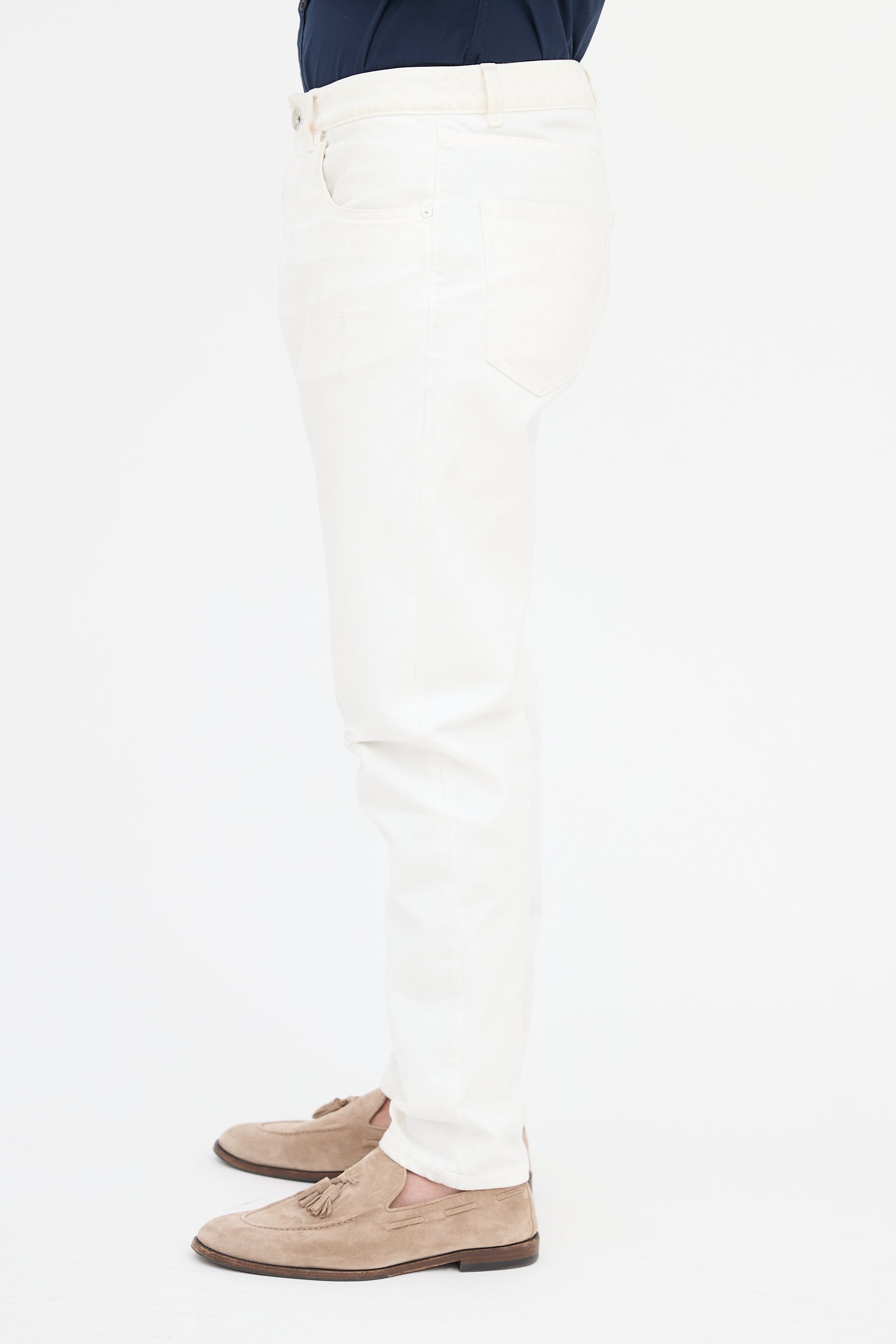 Pre-owned Brunello Cucinelli white leisure fit jeans featuring tapered leg, articulated knee, five pocket styling, embroidered logo at change pocket, brown leather Jacron patch, distressing, and button fly.