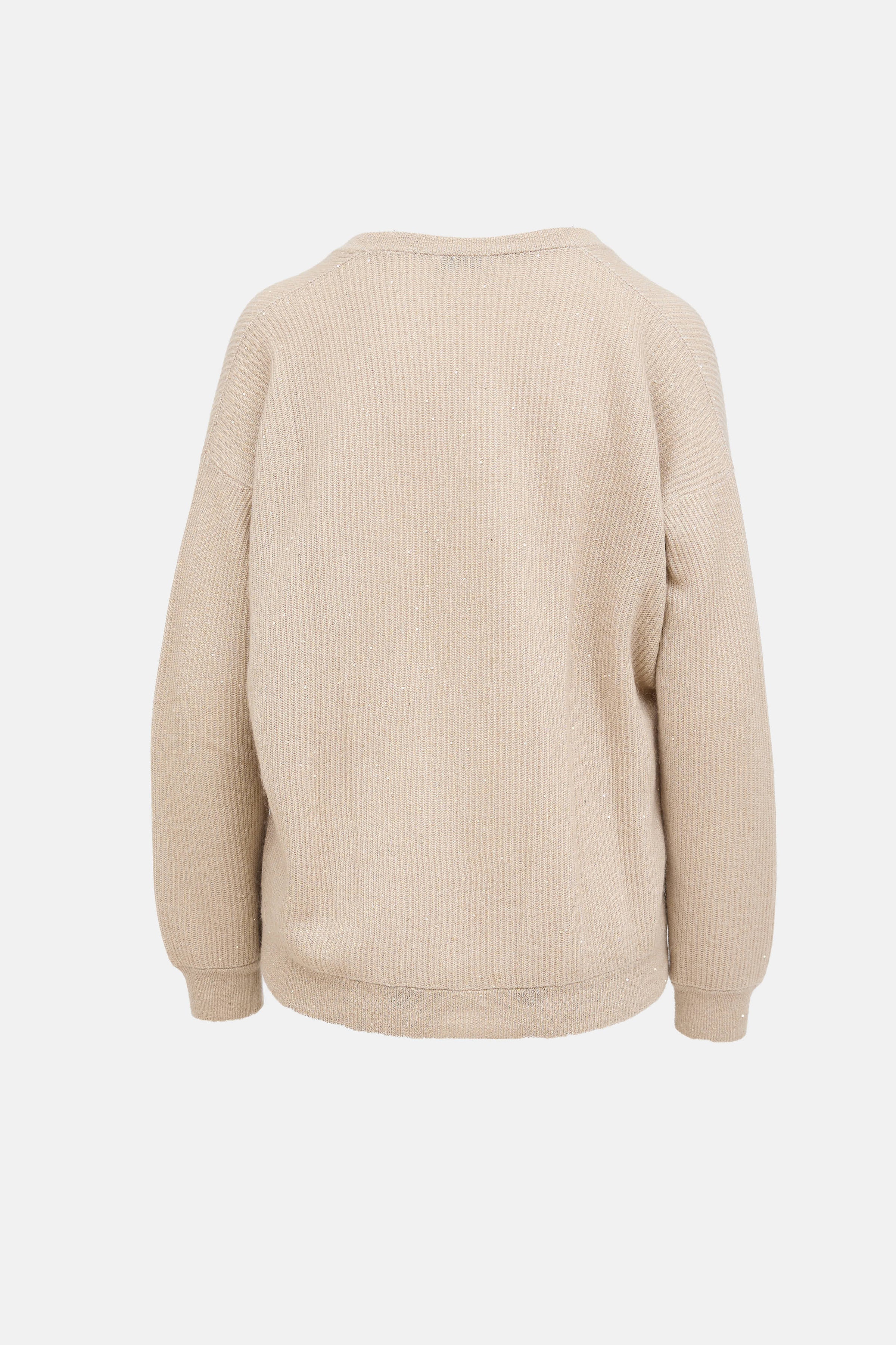 Pre-owned Brunello Cucinelli beige long sleeve sweater featuring v-neckline, sequin embellishments, and ribbed throughout.