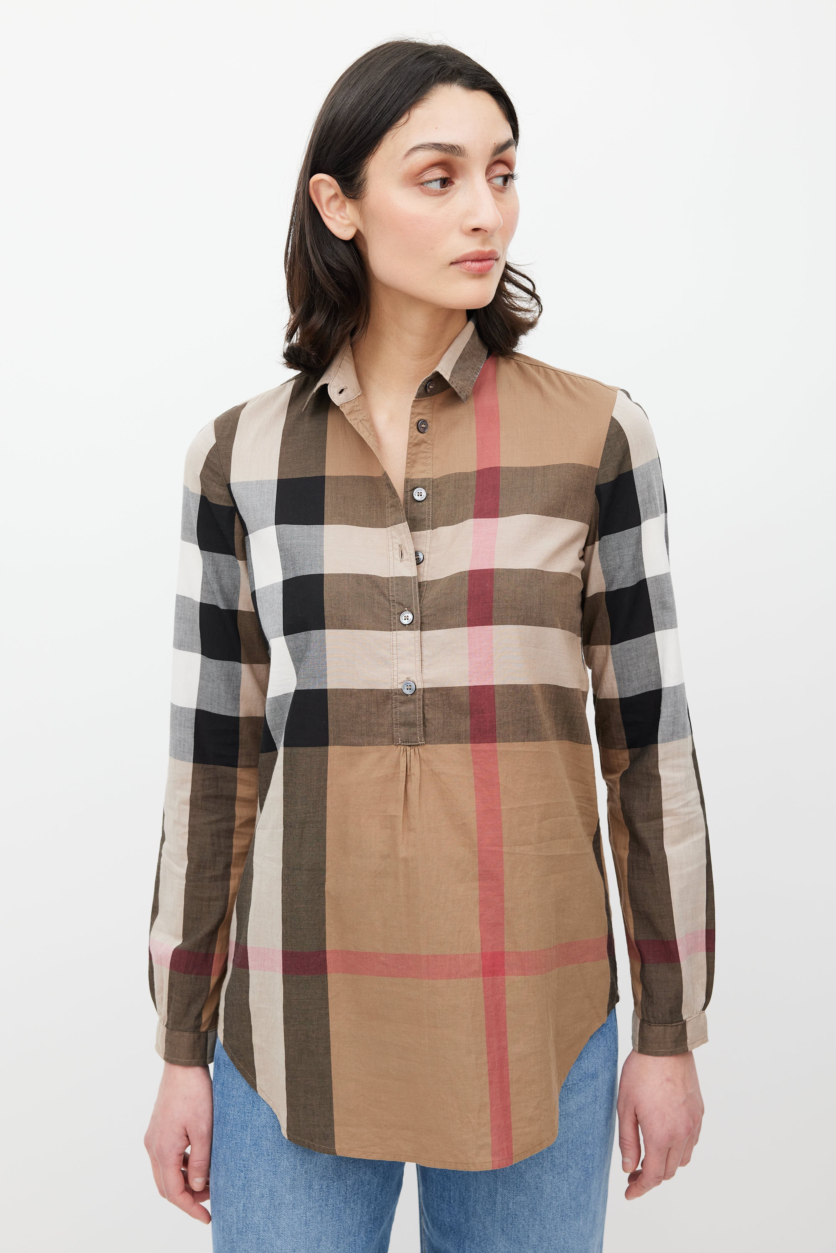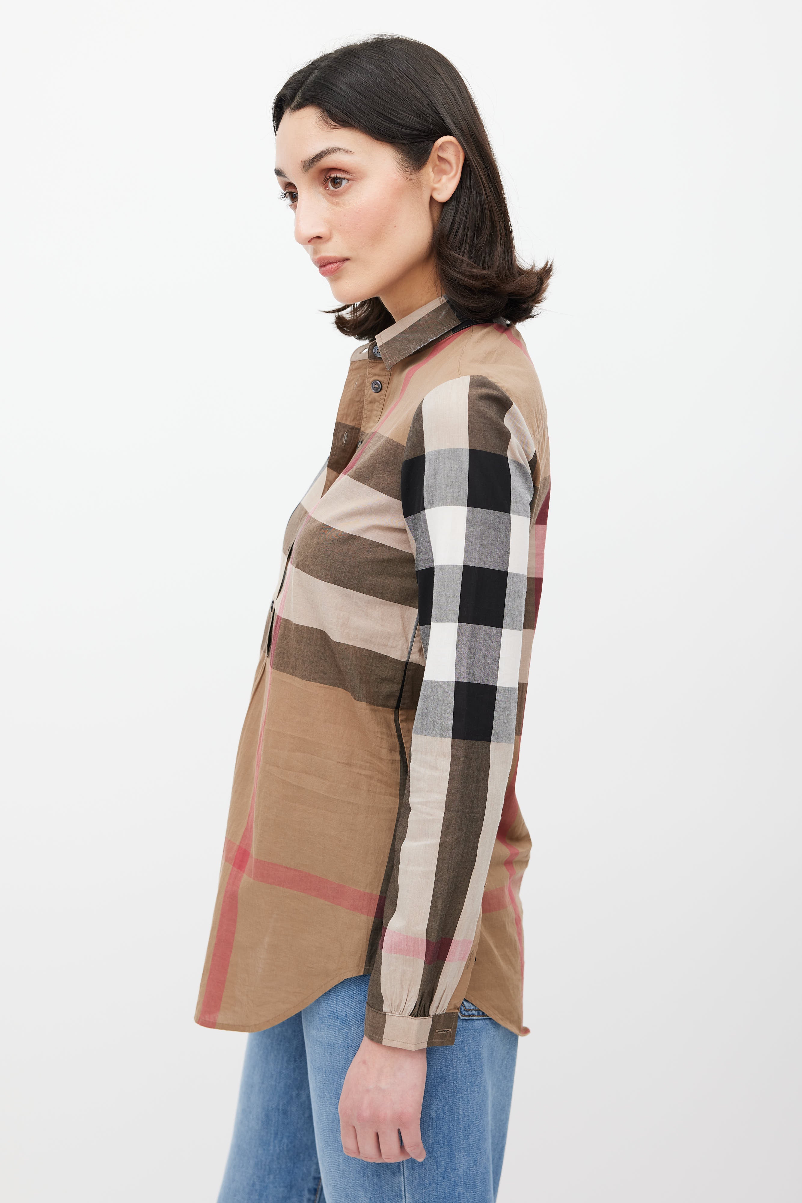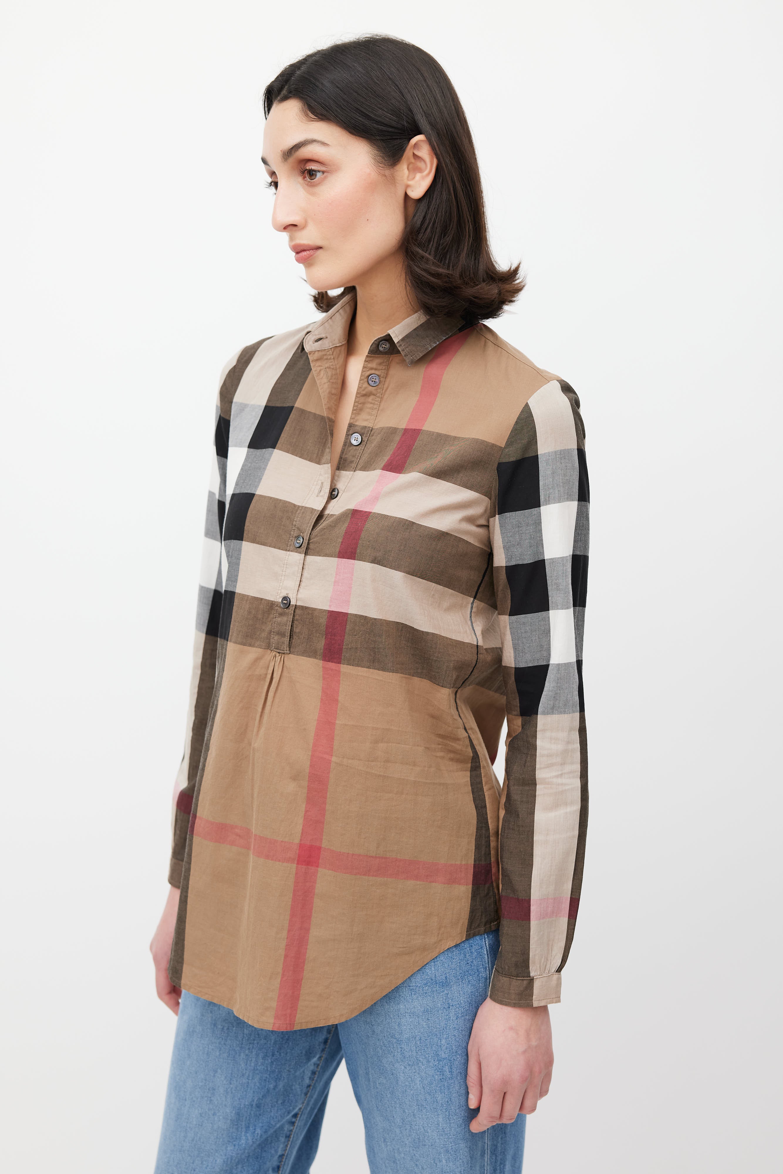 Pre-owned Burberry brown top featuring a multicolour Nova Check pattern throughout, pointed collar, long sleeves with buttoned cuffs, and quarter button up closure.