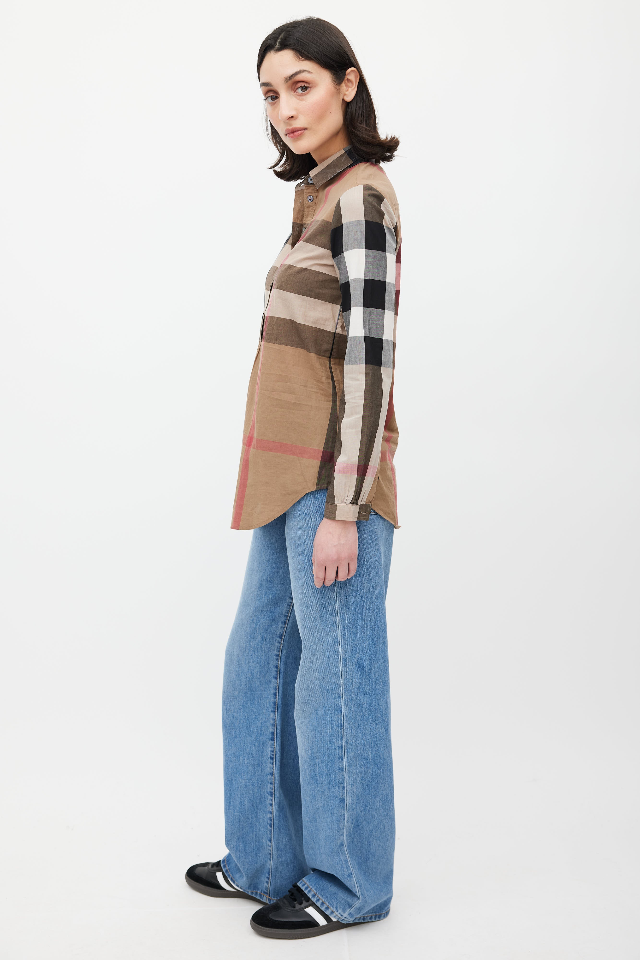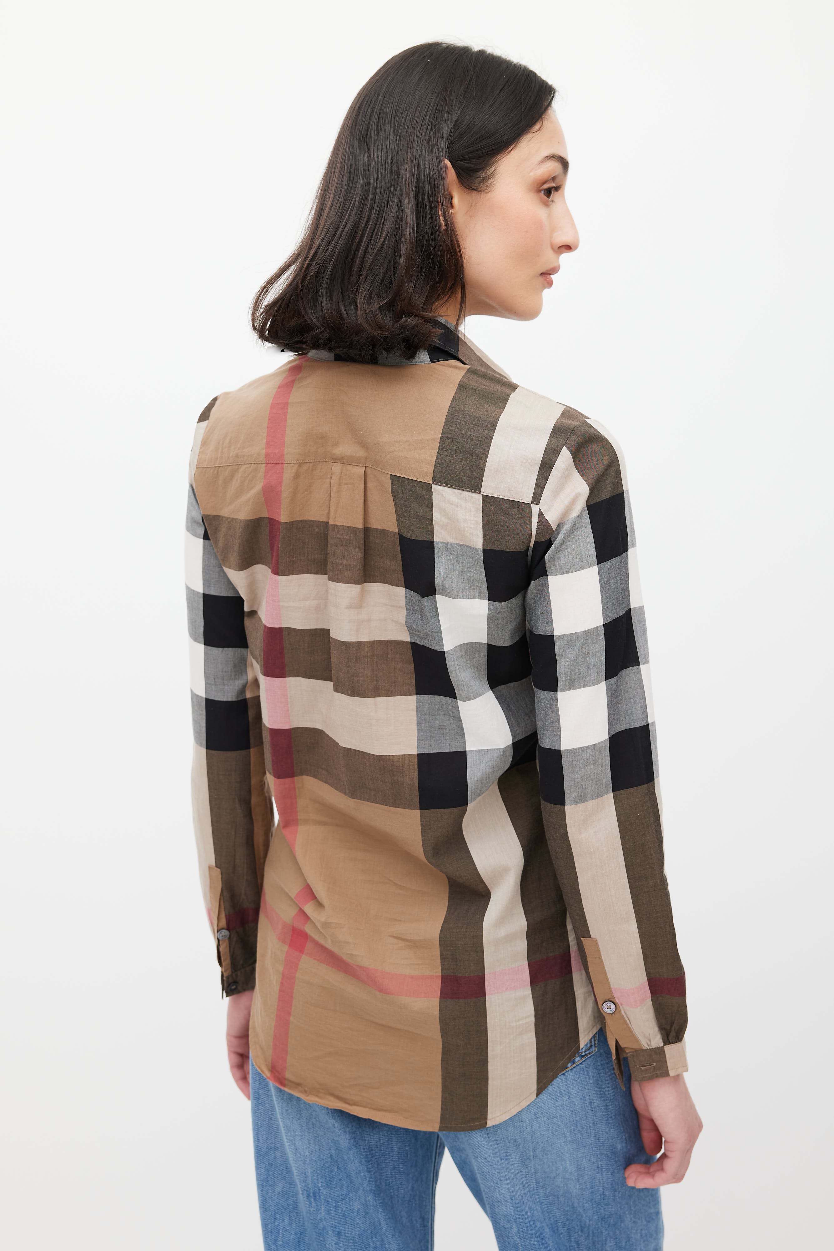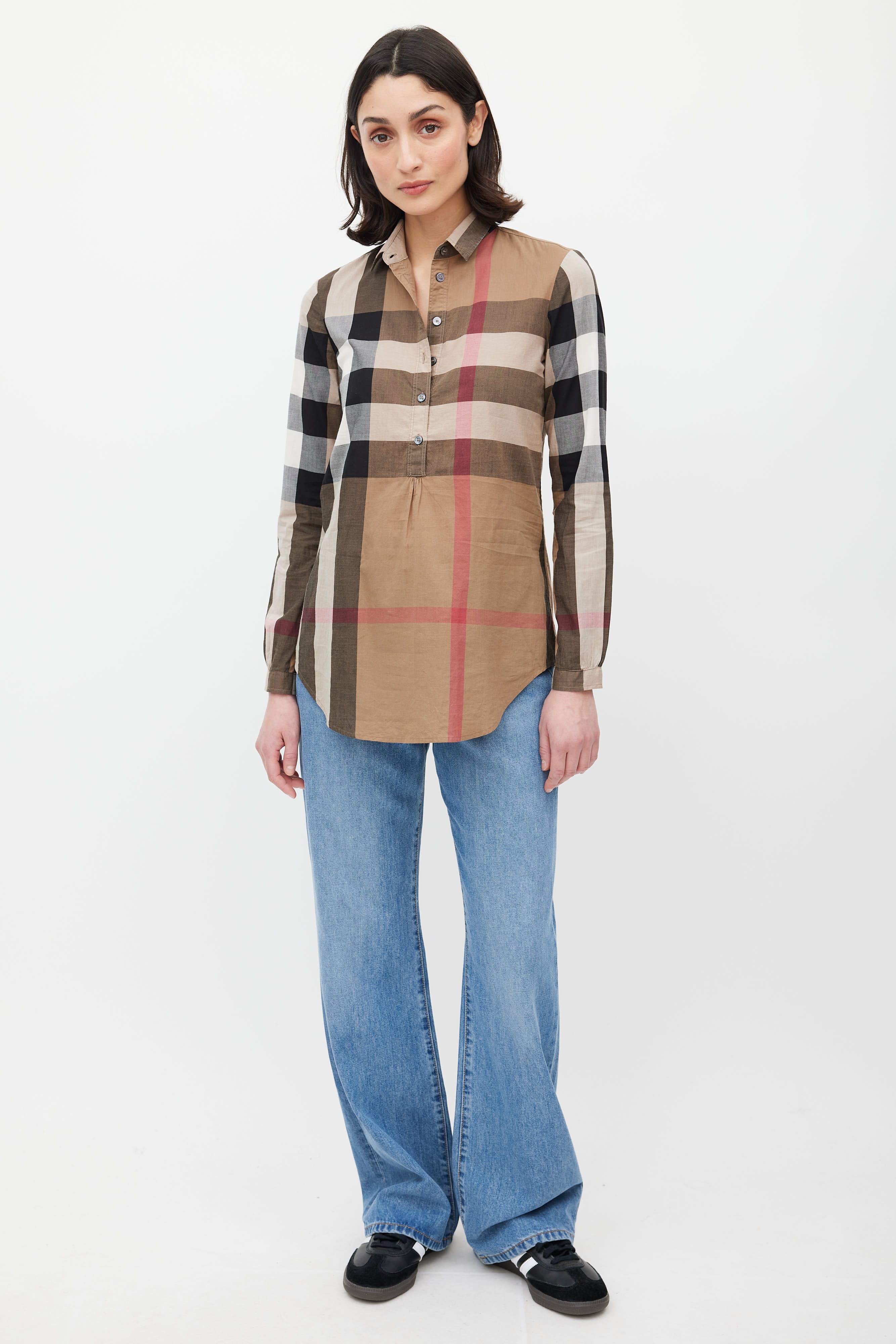 Pre-owned Burberry brown top featuring a multicolour Nova Check pattern throughout, pointed collar, long sleeves with buttoned cuffs, and quarter button up closure.