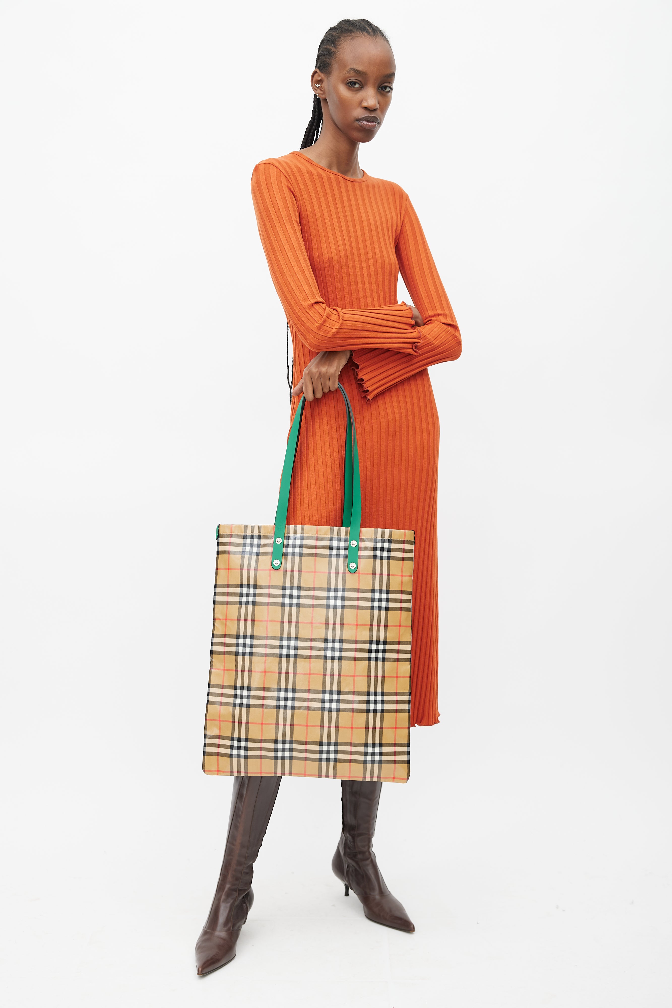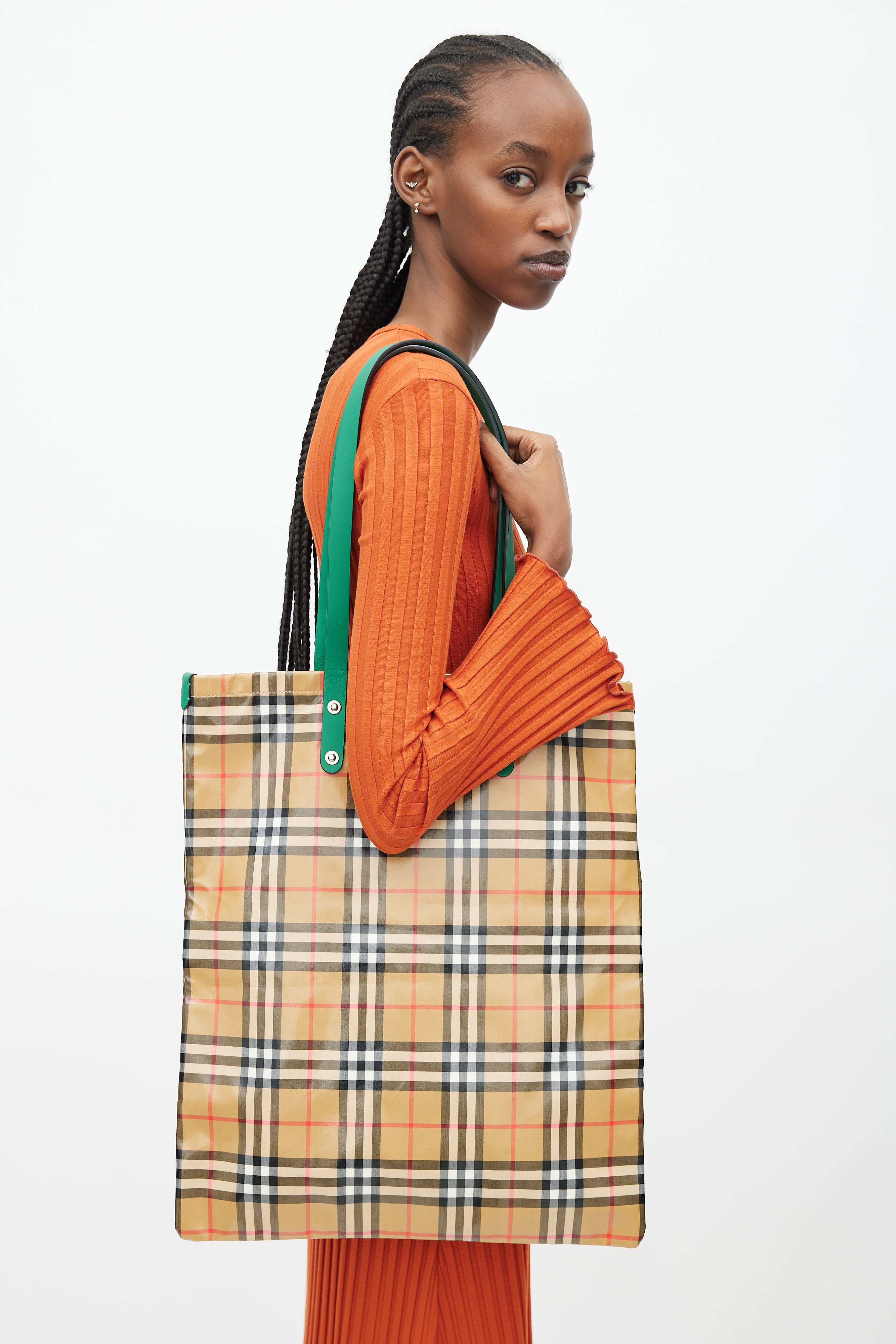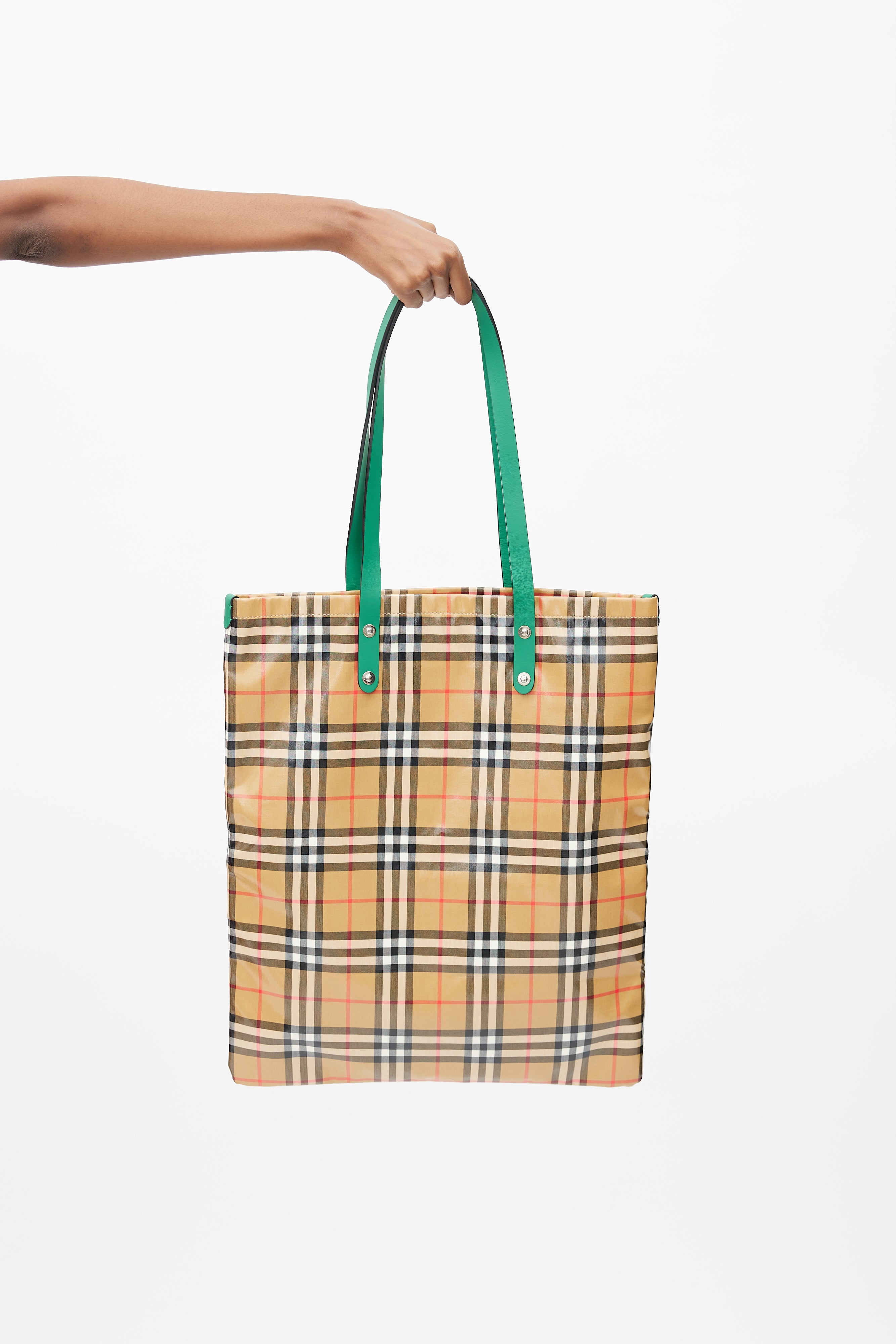Pre-owned Burberry brown tote bag featuring green leather top handles, silver tone hardware, signature Nova Check print, and open compartment. Comes with original dust bag.