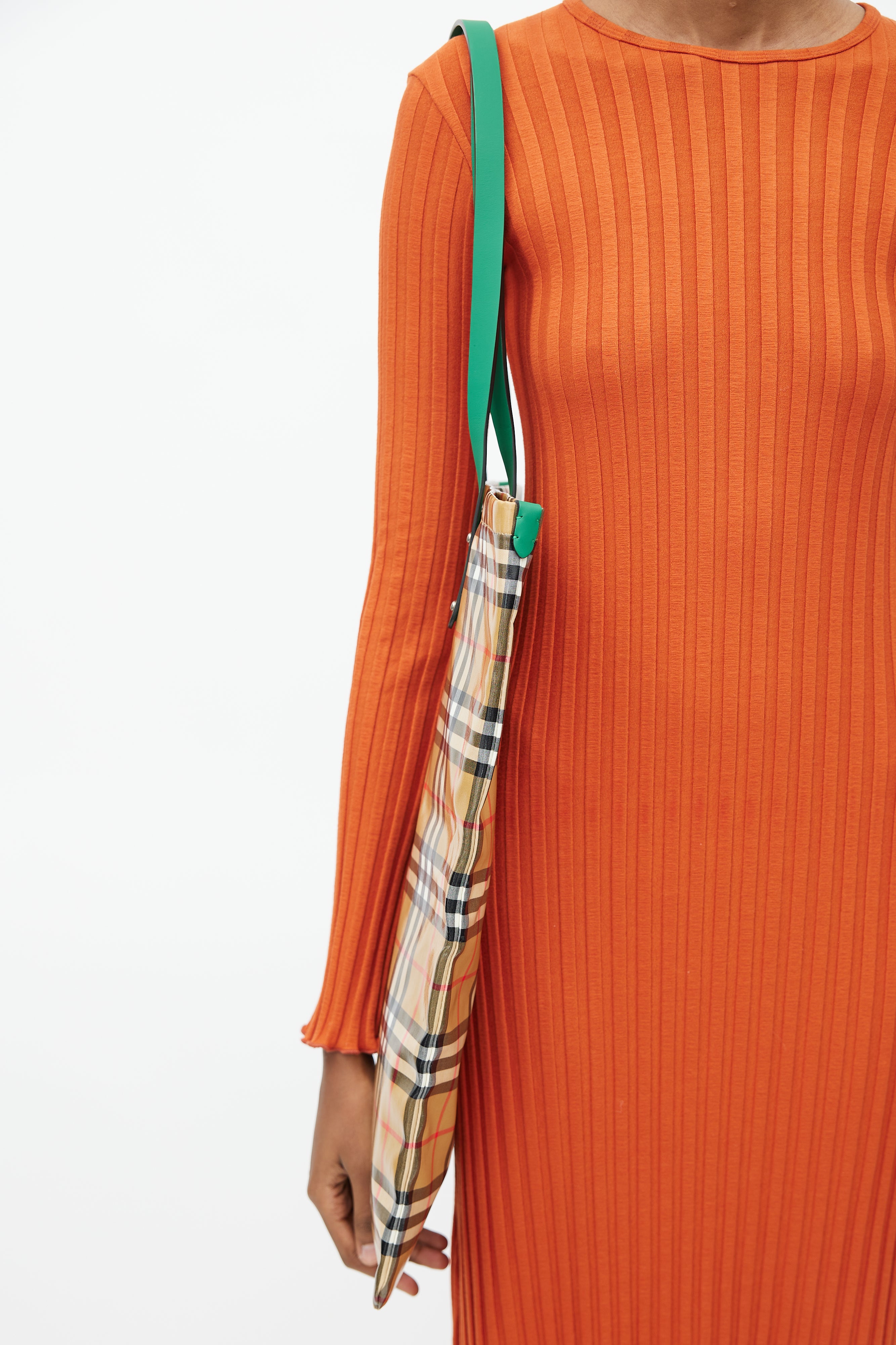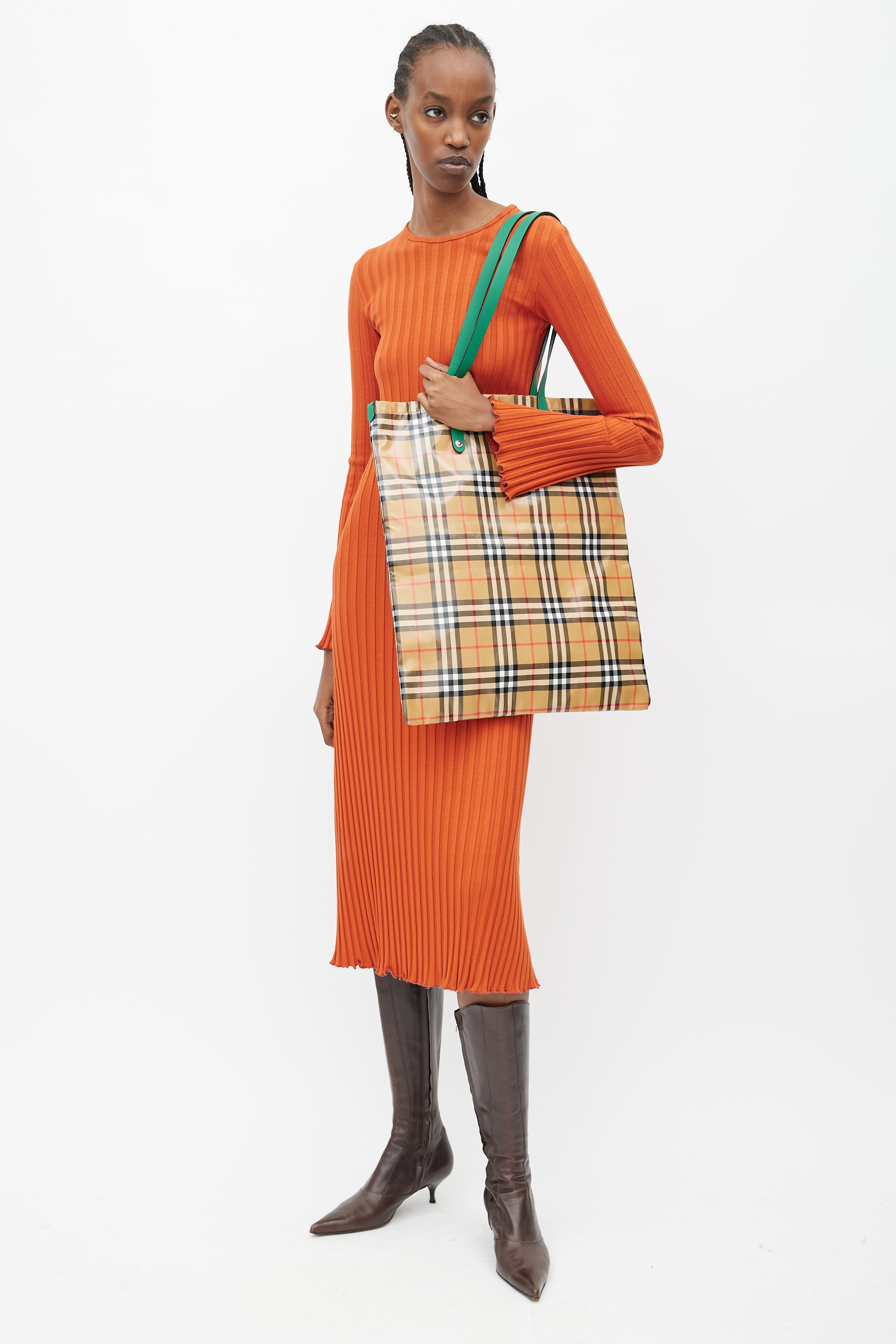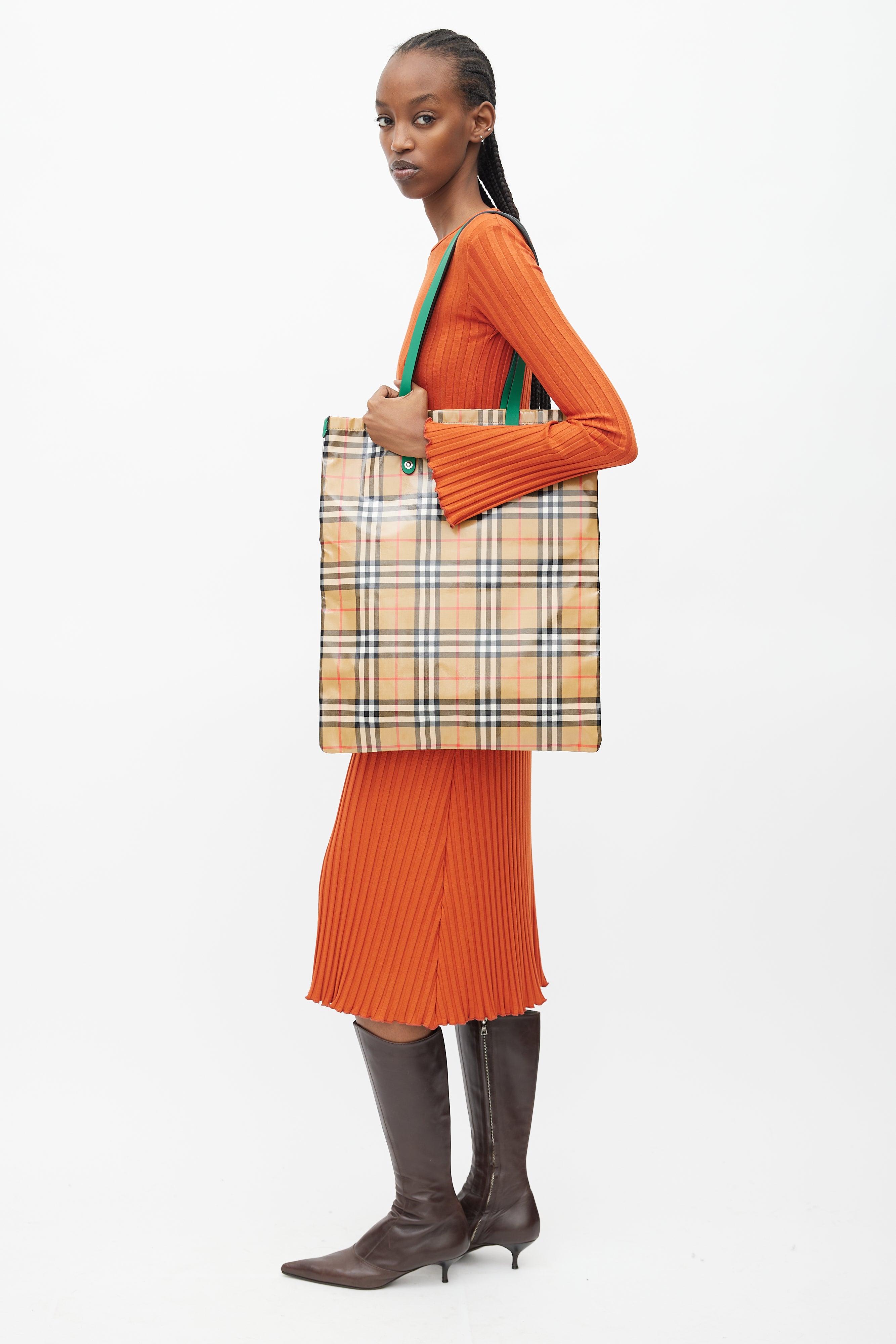 Pre-owned Burberry brown tote bag featuring green leather top handles, silver tone hardware, signature Nova Check print, and open compartment. Comes with original dust bag.