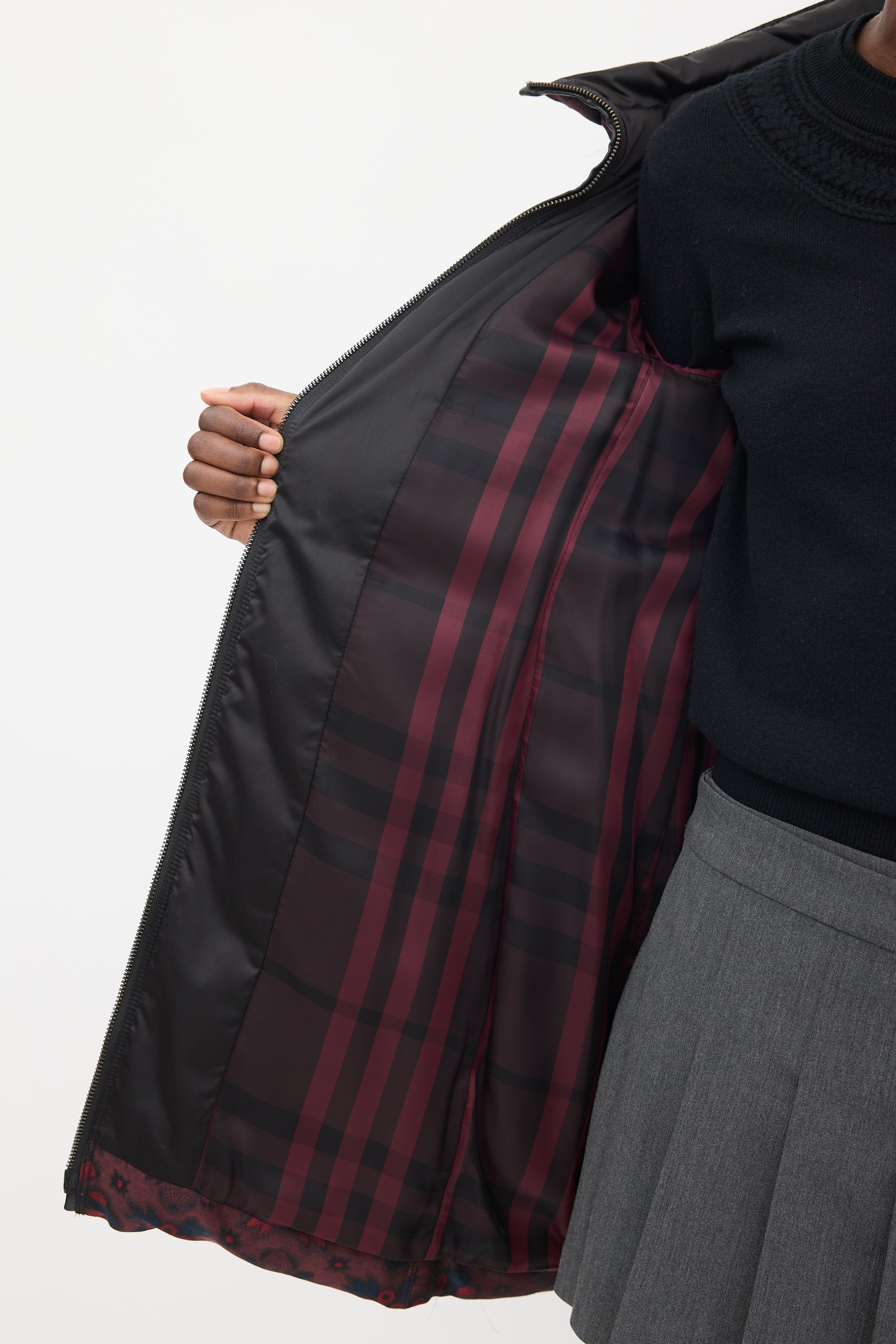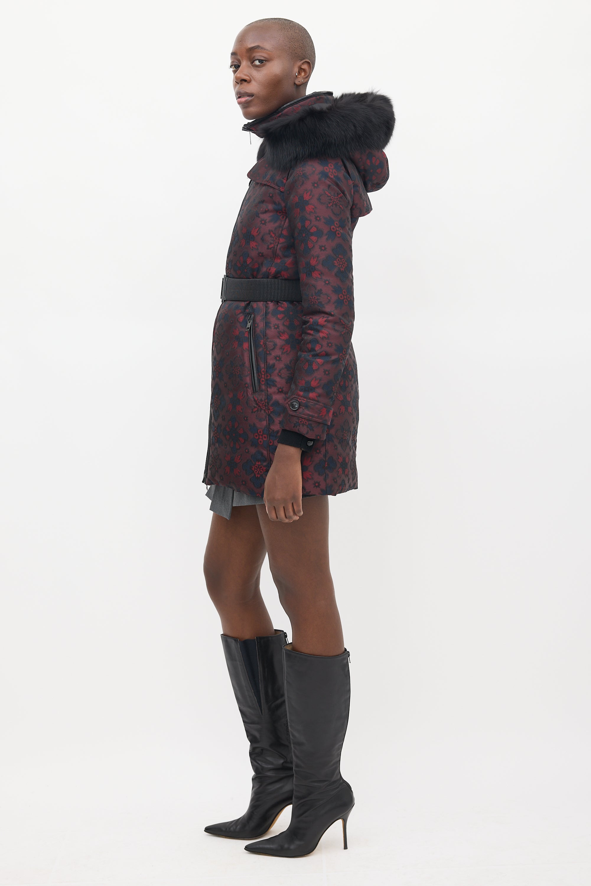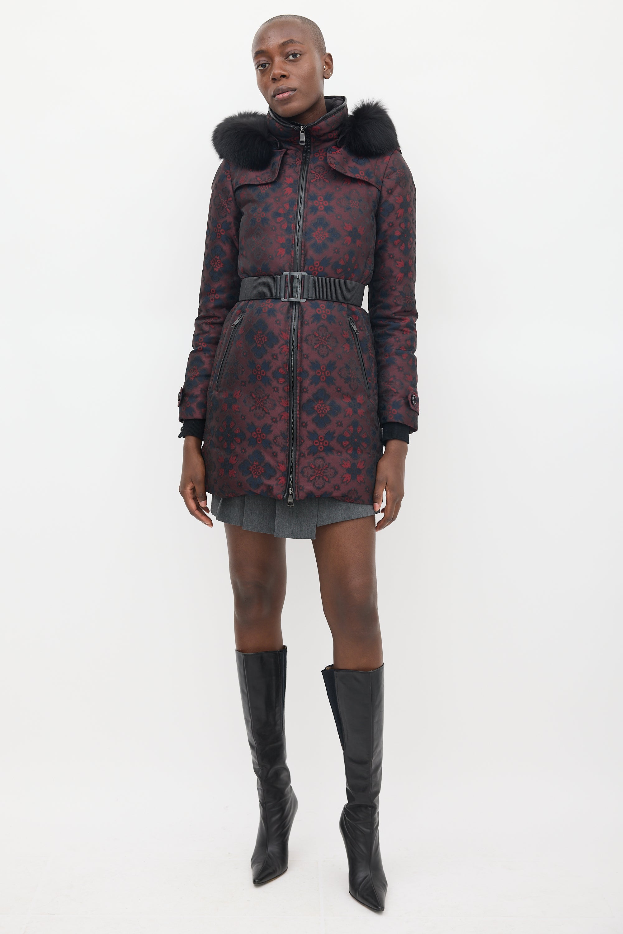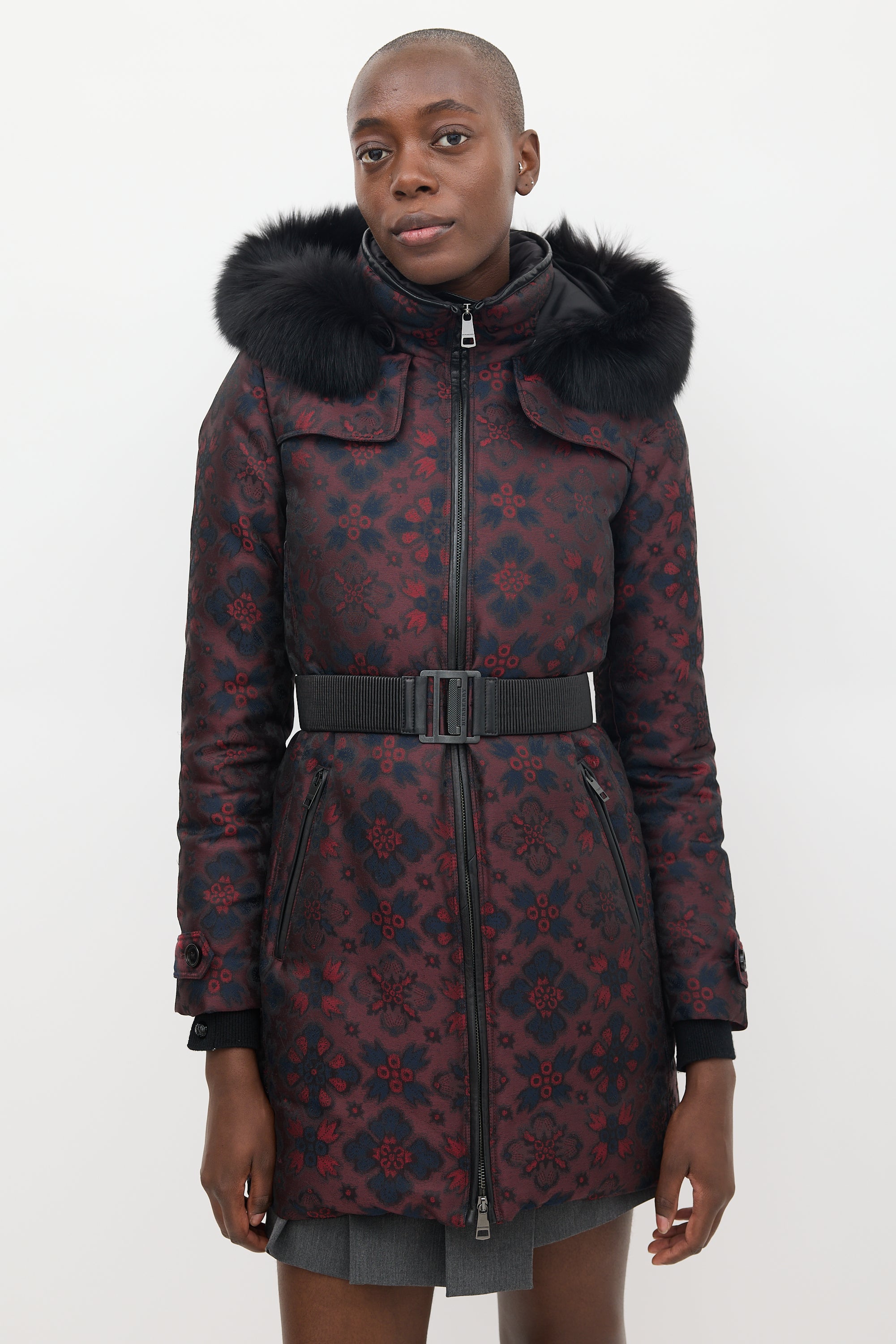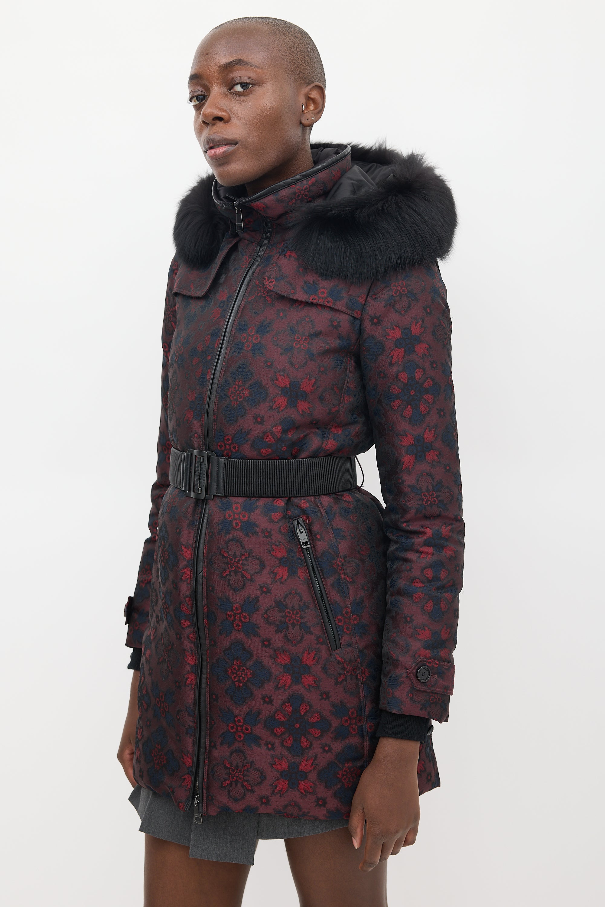 Pre-owned Burberry burgundy and multicolour coat featuring a floral jacquard throughout, funnel collar, double zip up front, two zip pockets at front hip, detachable fur trimmed hood, epaulettes at shoulders, belted waist, and long sleeves with buttoned straps at cuffs. Lined.
