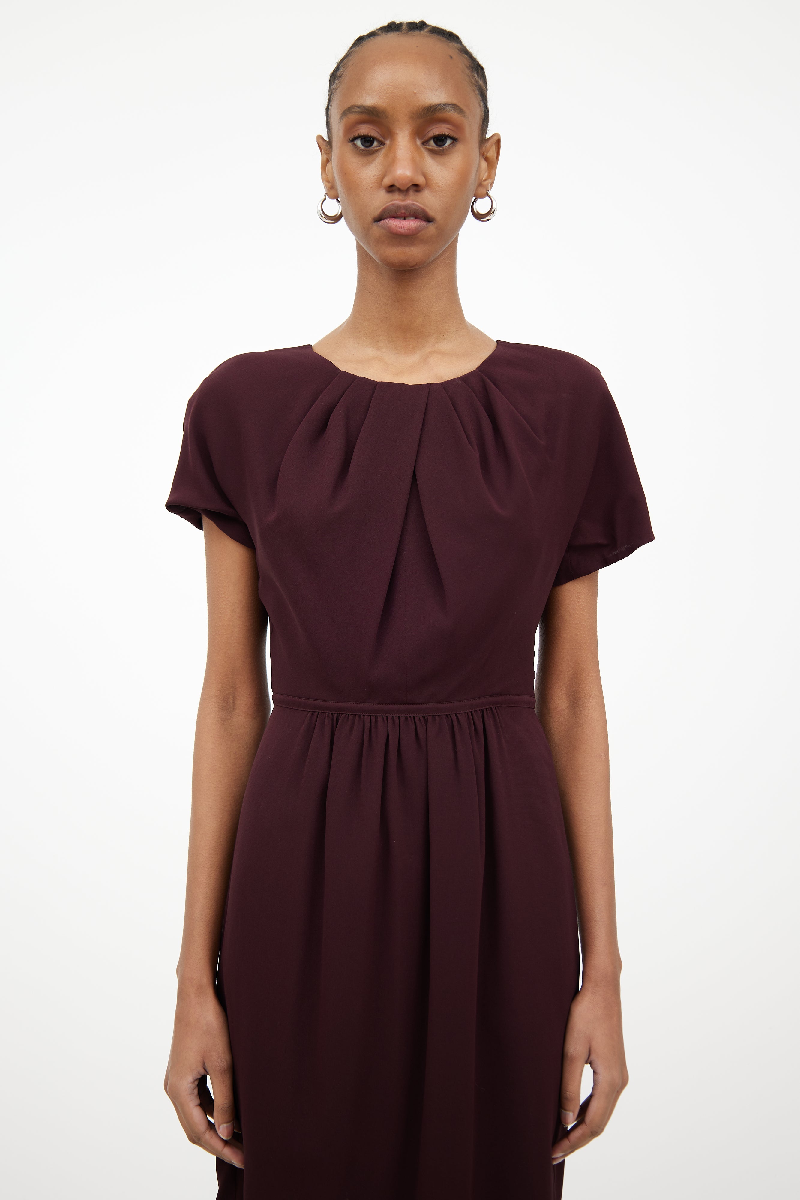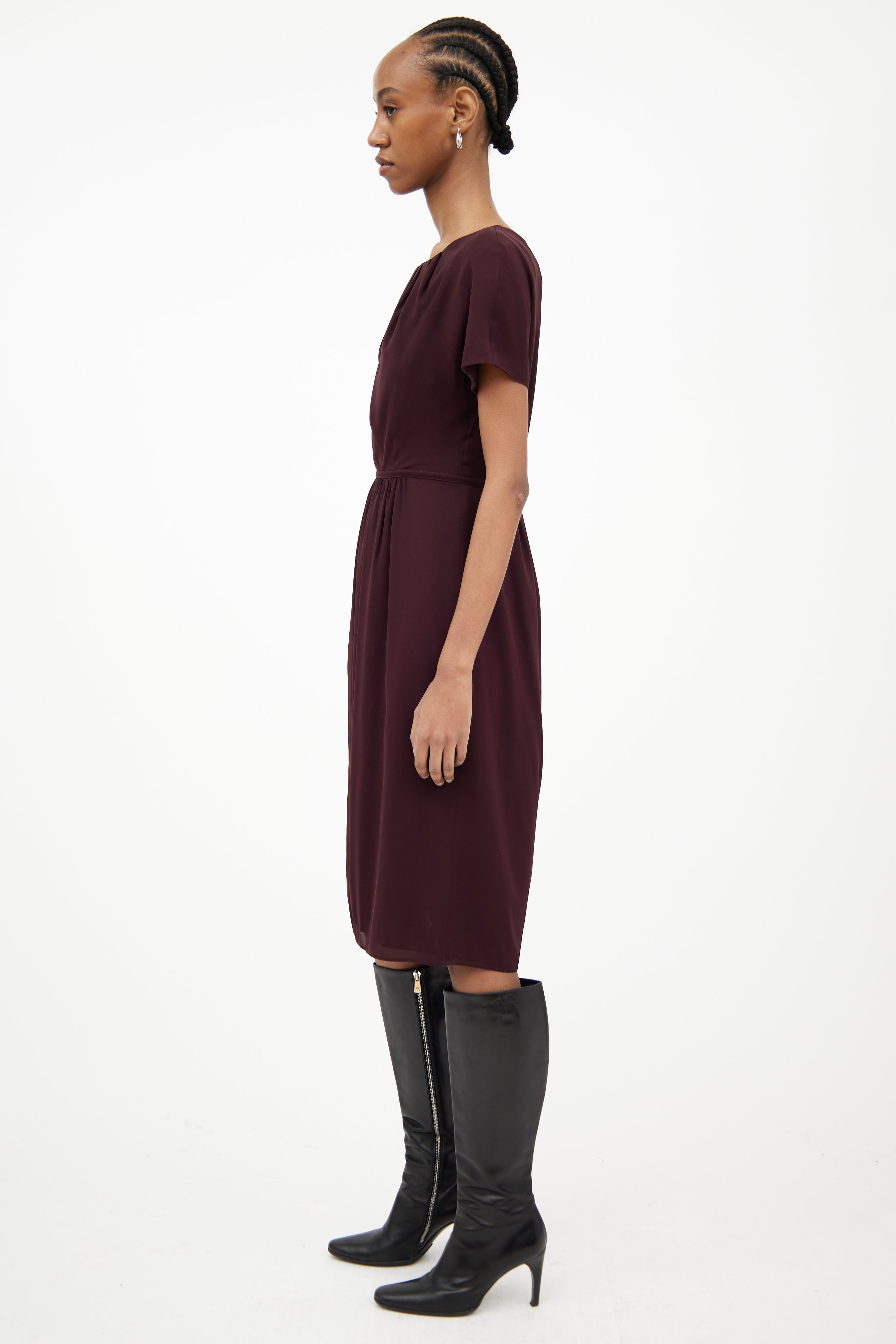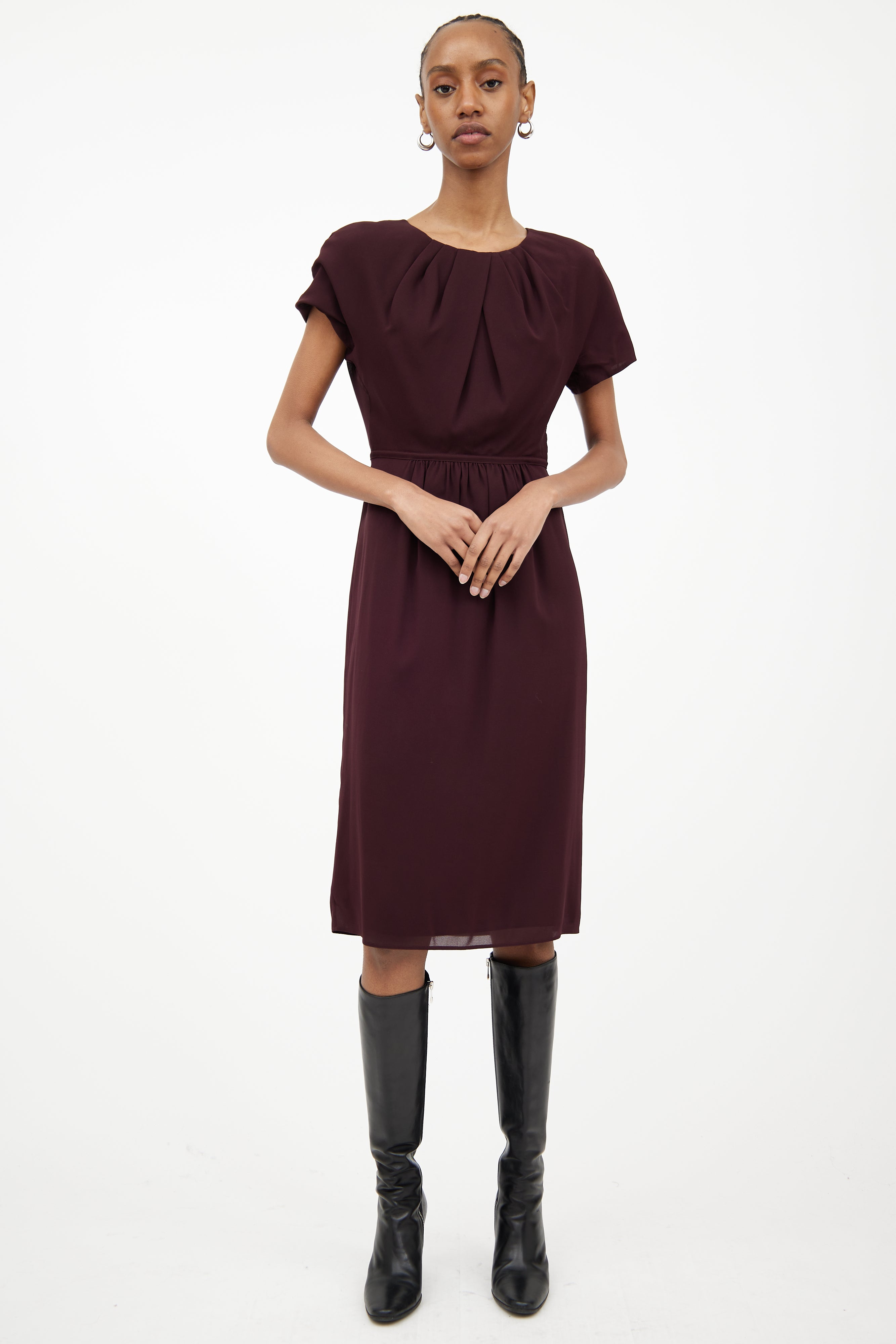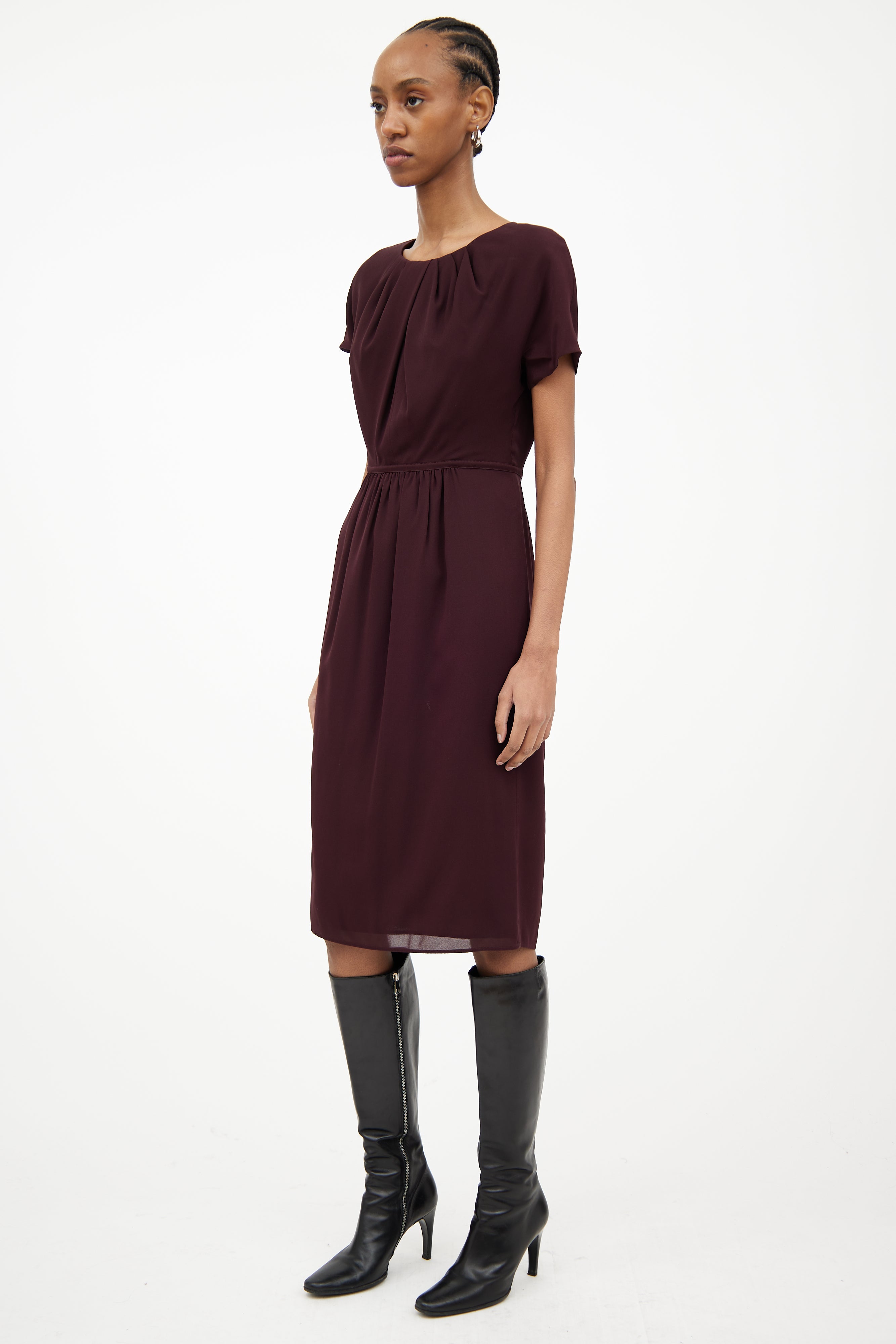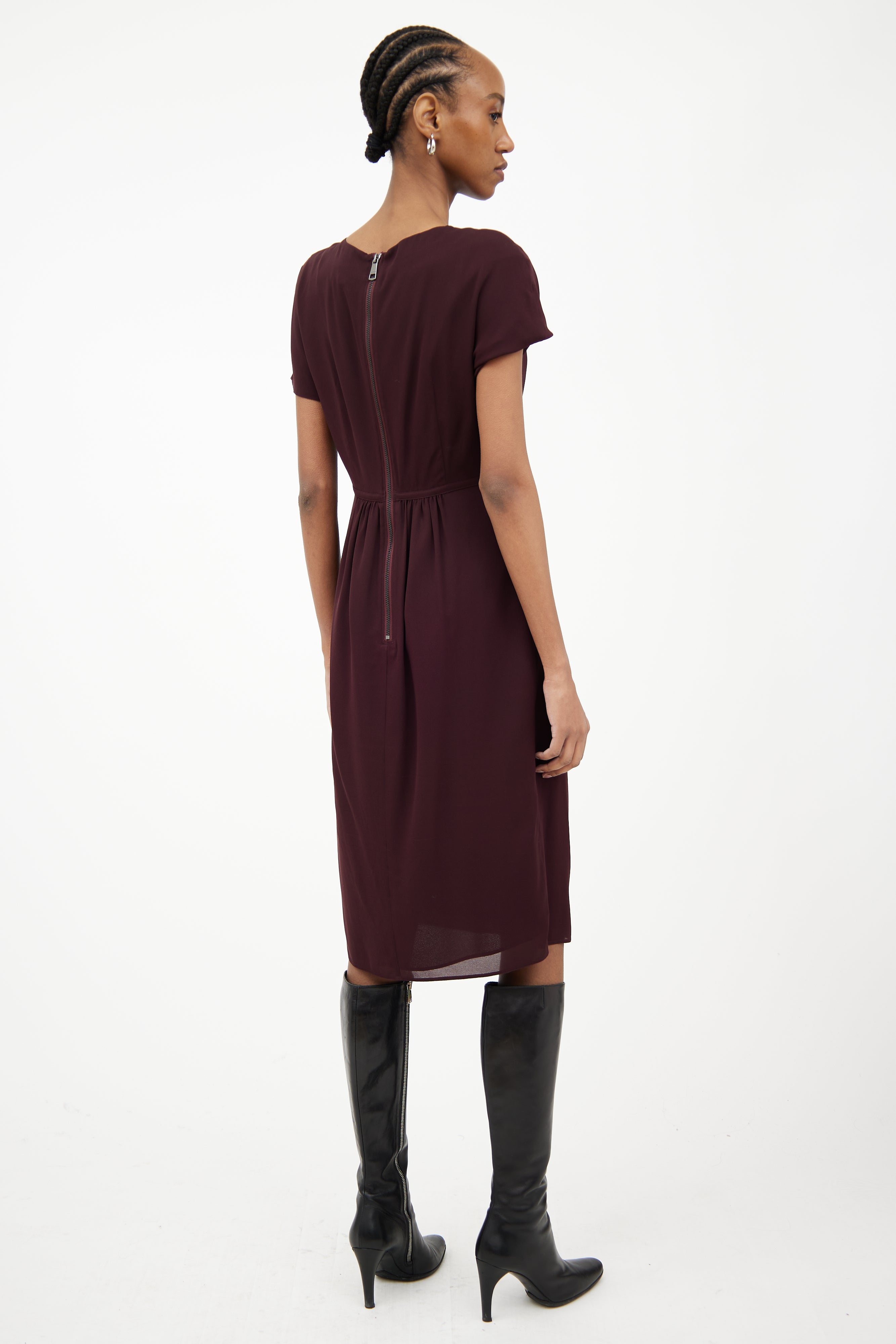 Pre-owned Burberry bugundy silk midi dress featuring round gathered neckline, short sleeves, back zip closure, piping detail at waist, gathering throughout skirt. Fully lined.