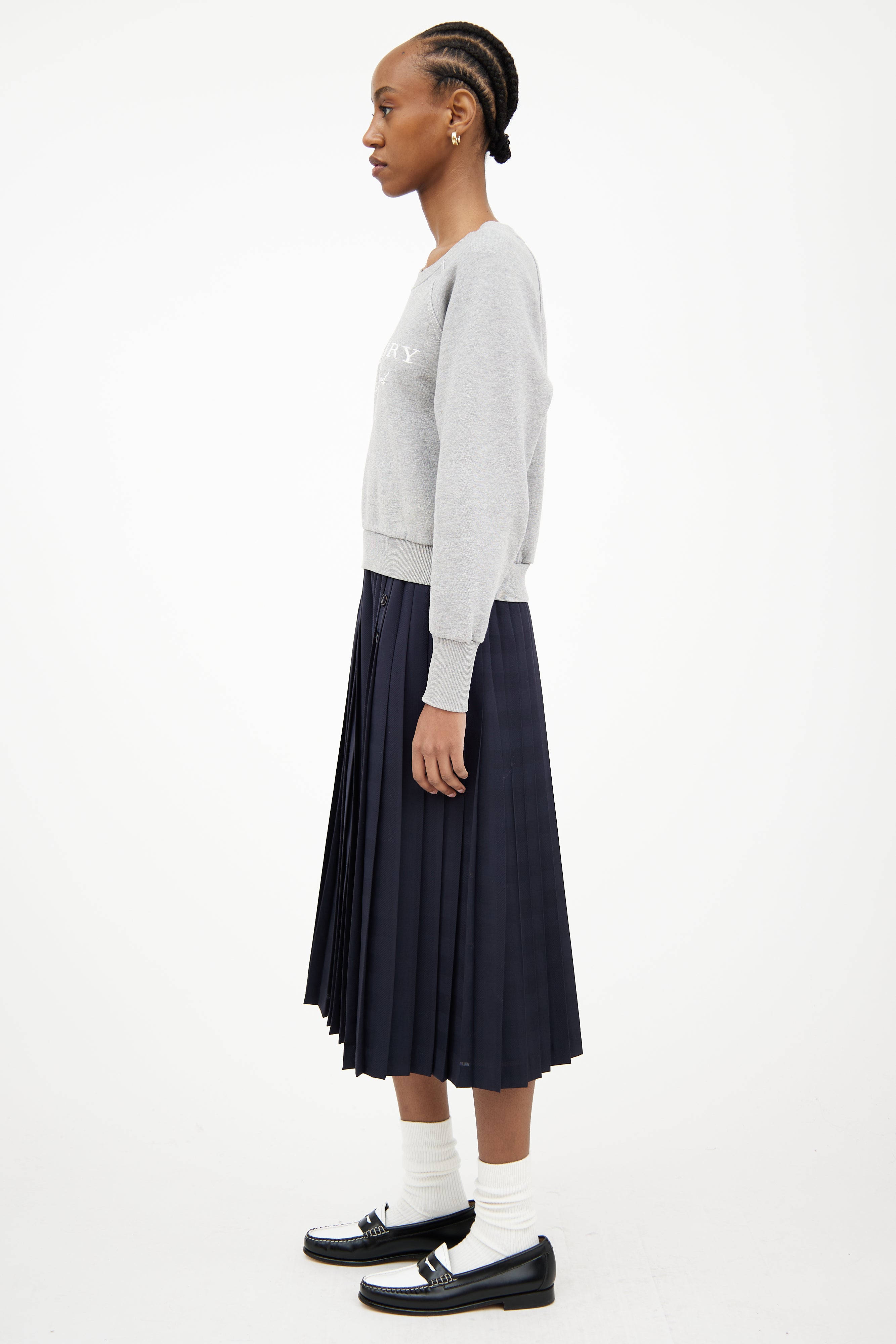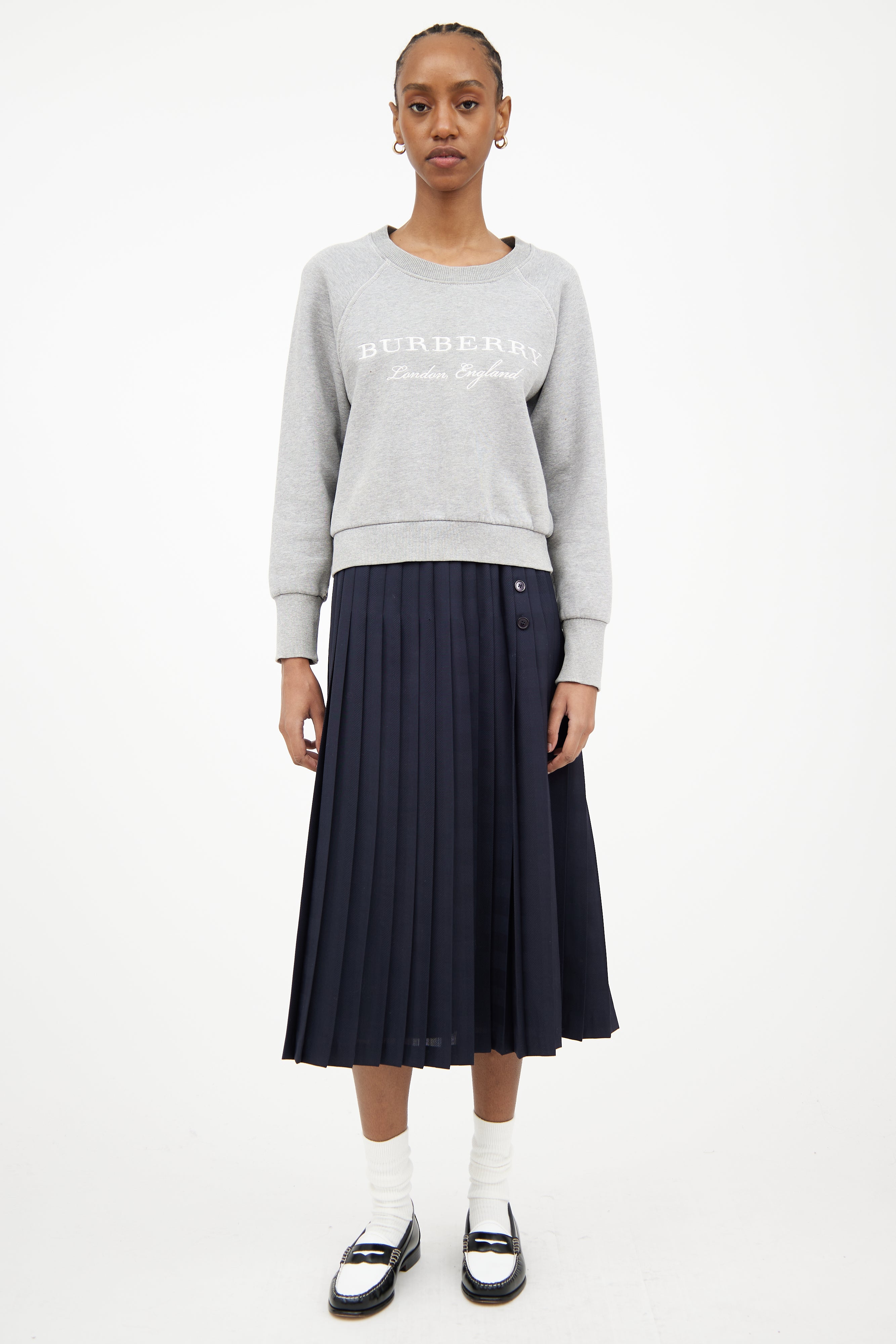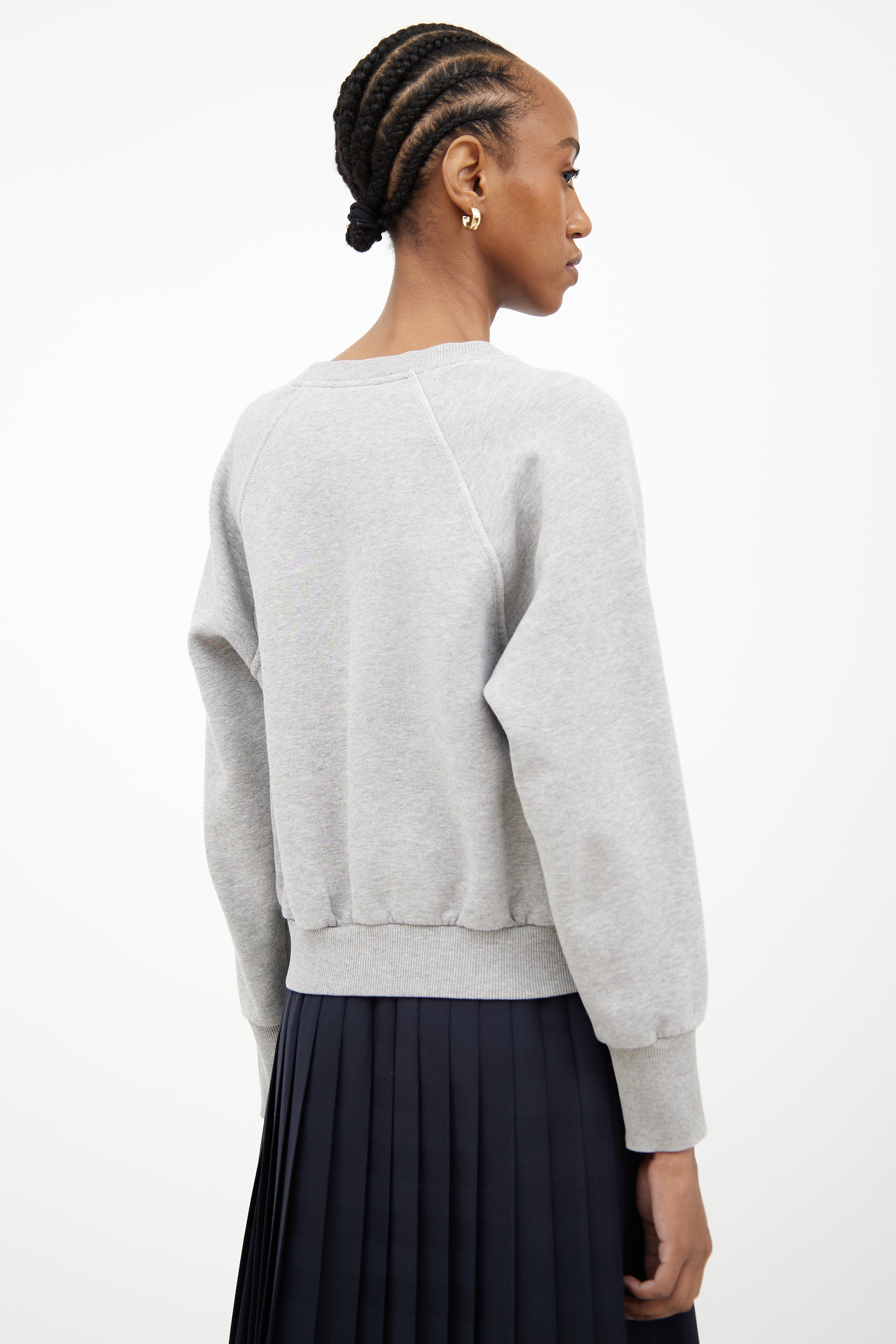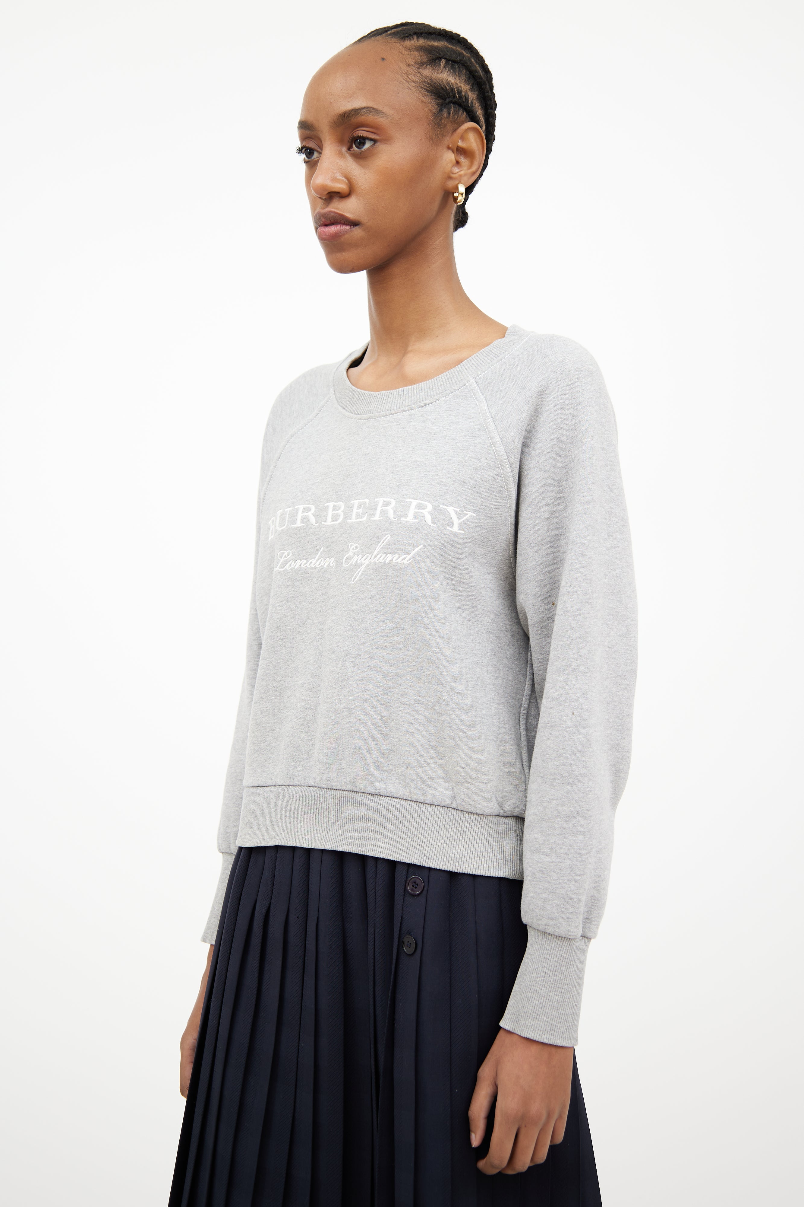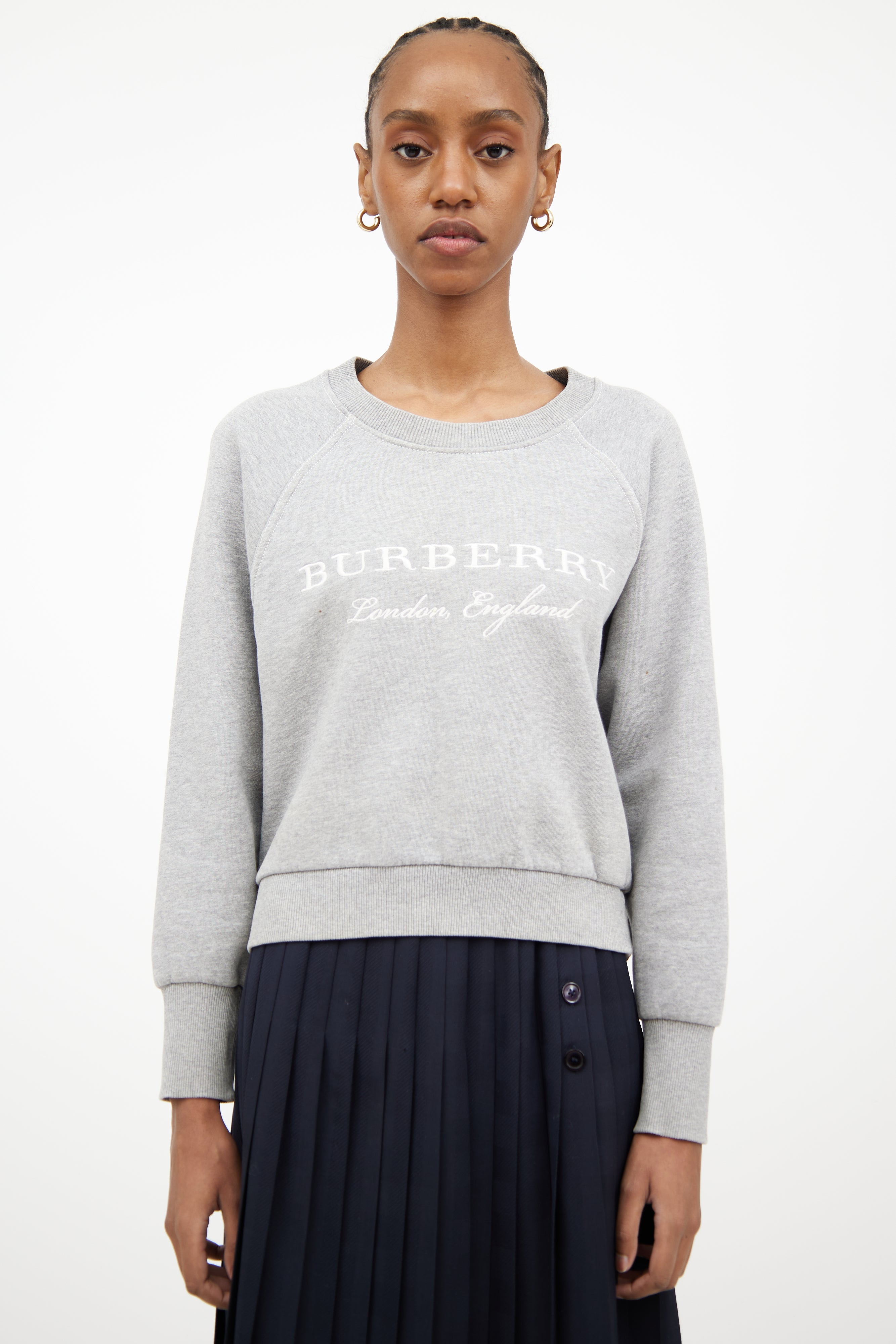 Pre-owned Burberry heather grey crewneck sweatshirt featuring long raglan sleeves with ribknit cuffs, ribknit hem, cropped fit and white logo embroidery across front.