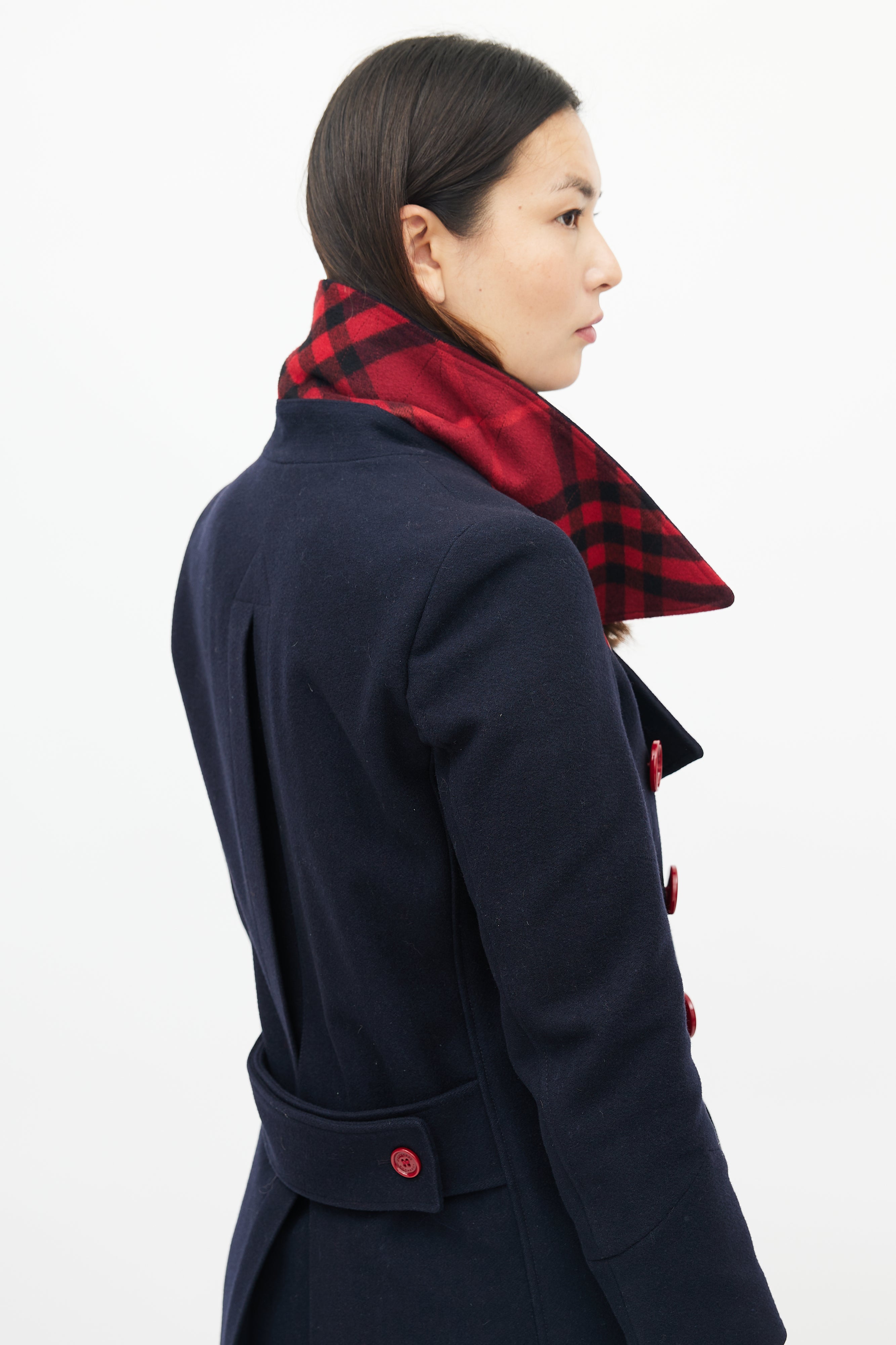 Pre-owned Burberry navy mid-length bridge coat featuring large double breasted red buttons at front, red signature check at underside collar, broad notched lapel, flap slash pockets at side, buttoned panel at back, and long single vent at back.