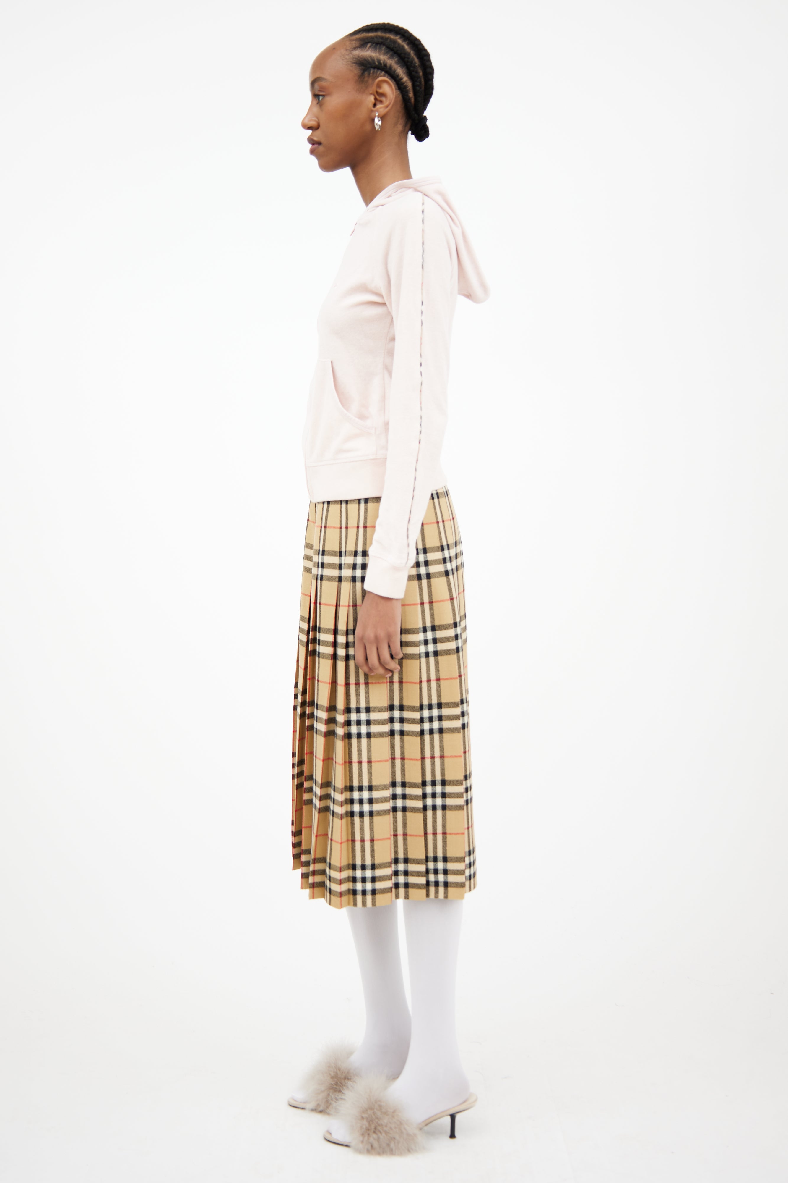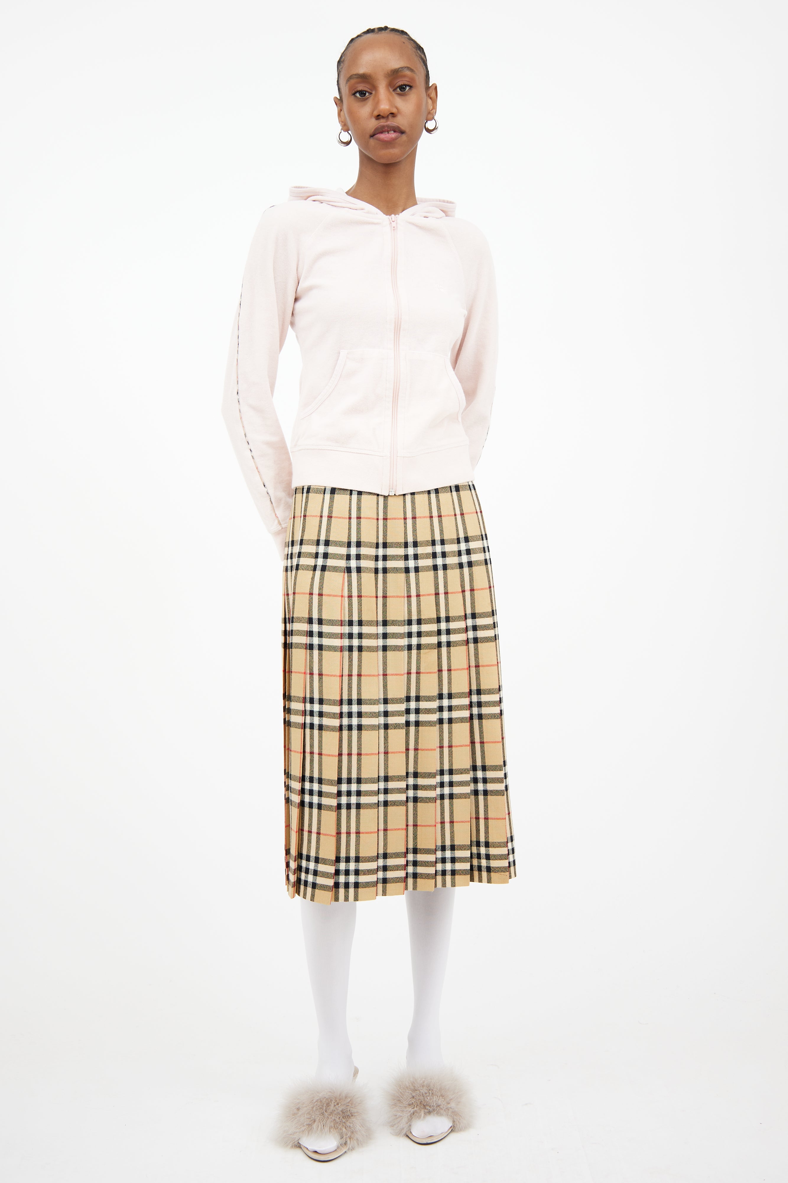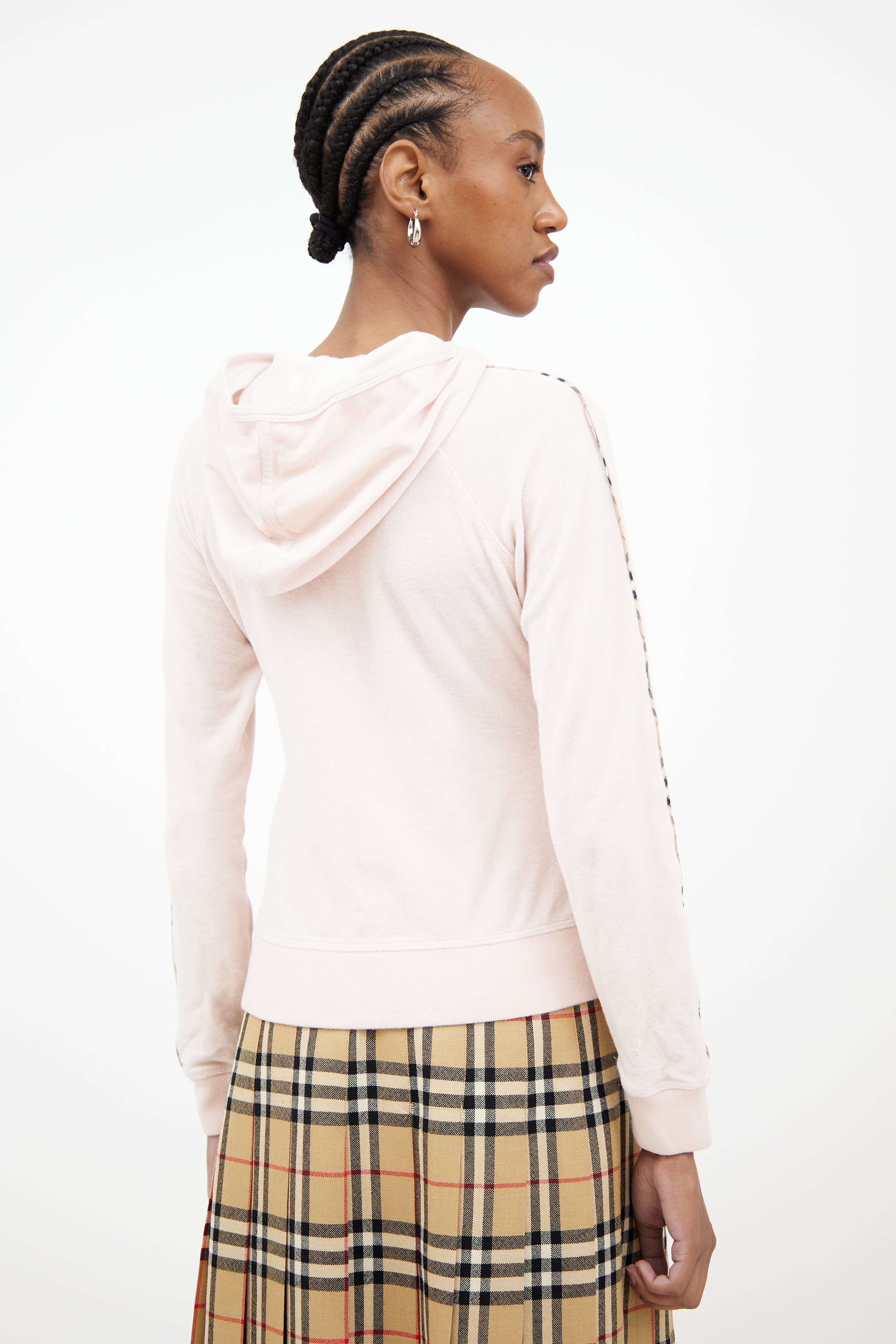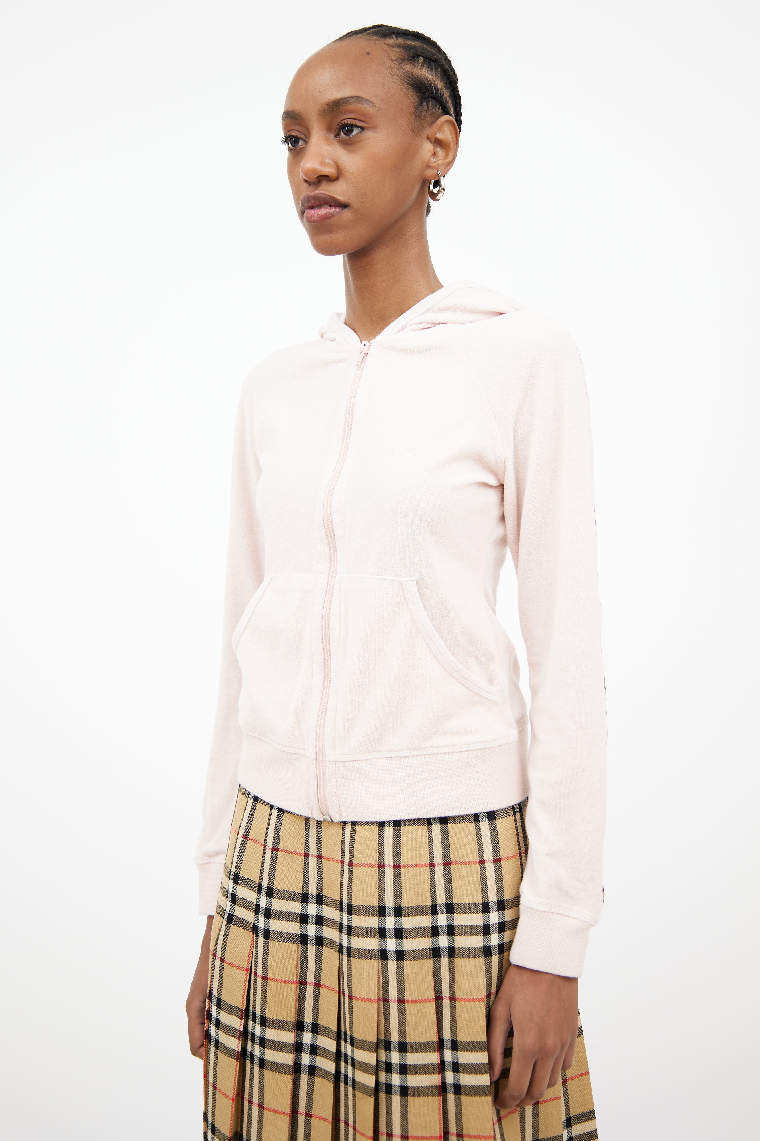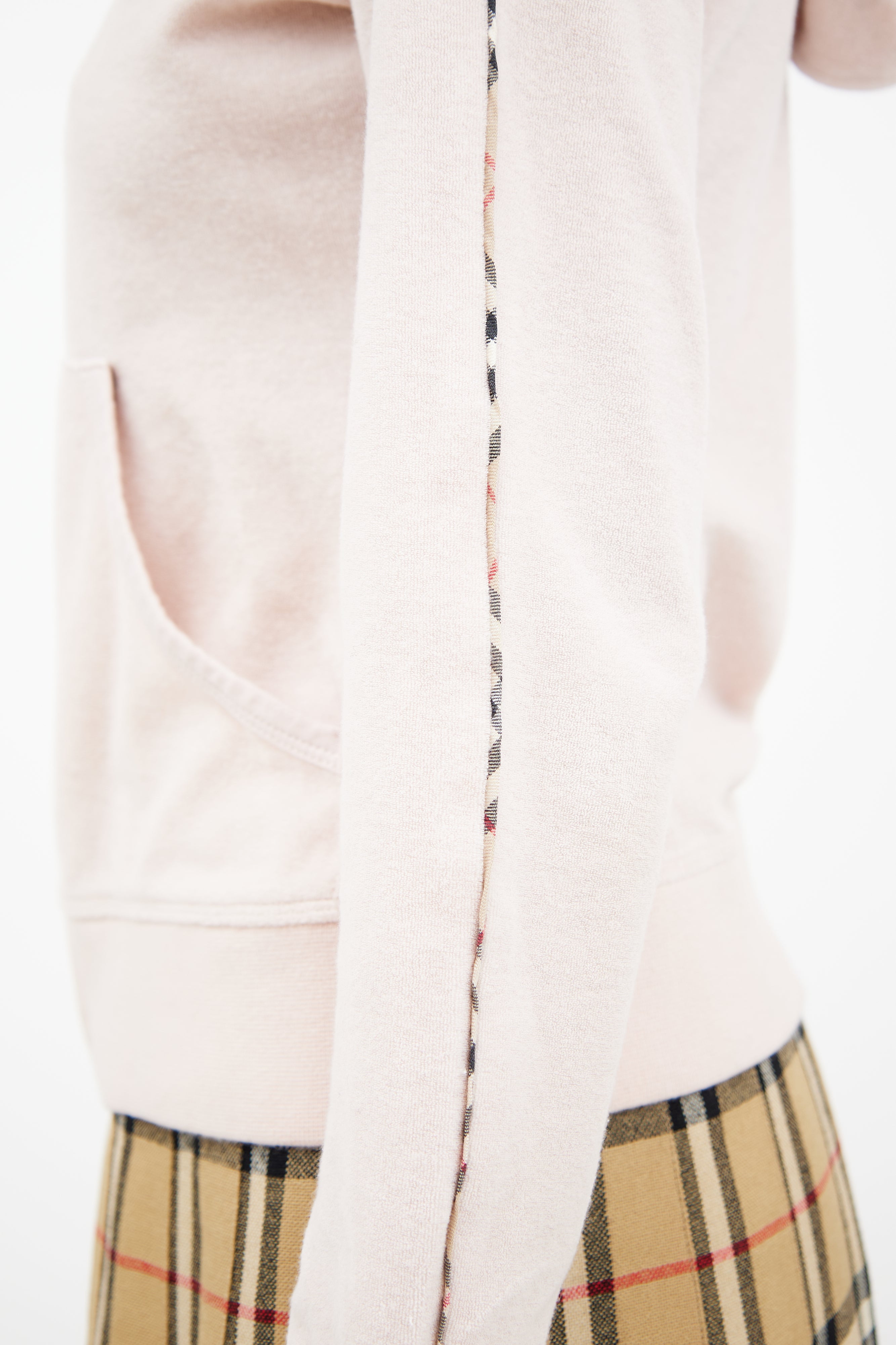 Pre-owned Burberry light pink terry cloth hoodie featuring long raglan sleeves with rib knit cuffs, zip front closure, rib knit hem, tonal embroidered logo at chest, pouch pocket at front and signaure check piping detail at sleeve.