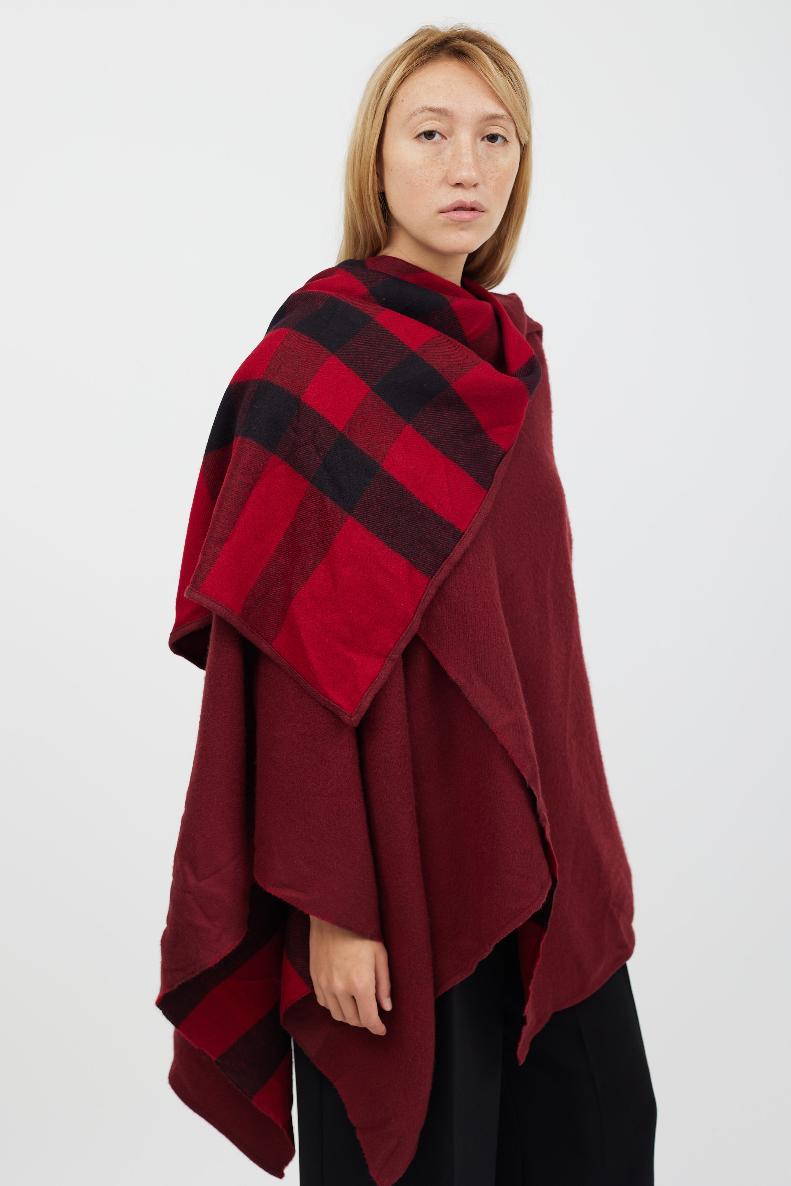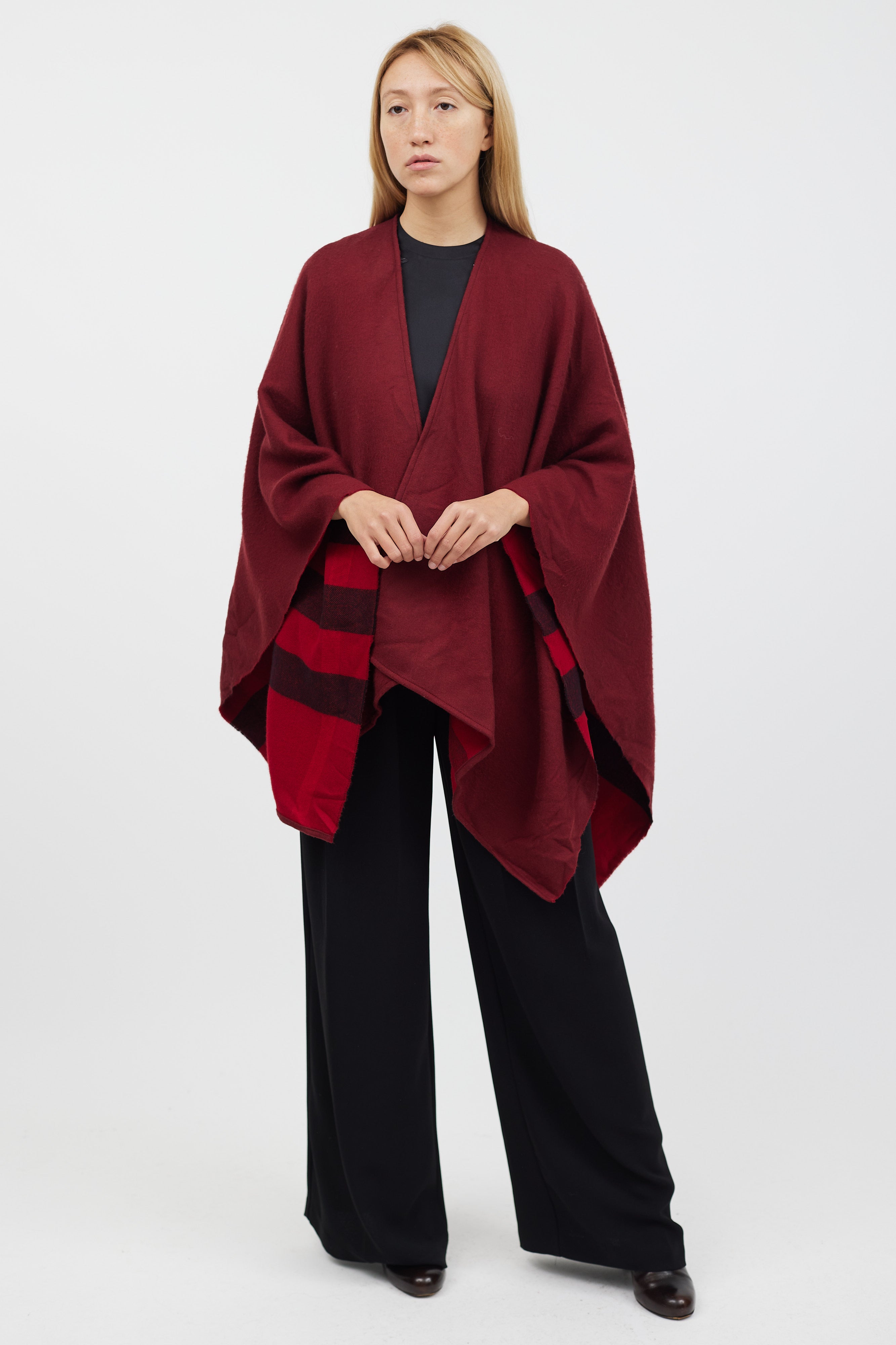 Pre-owned Burberry red wool shawl featuring long sleeves, black plaid lining, and open front.