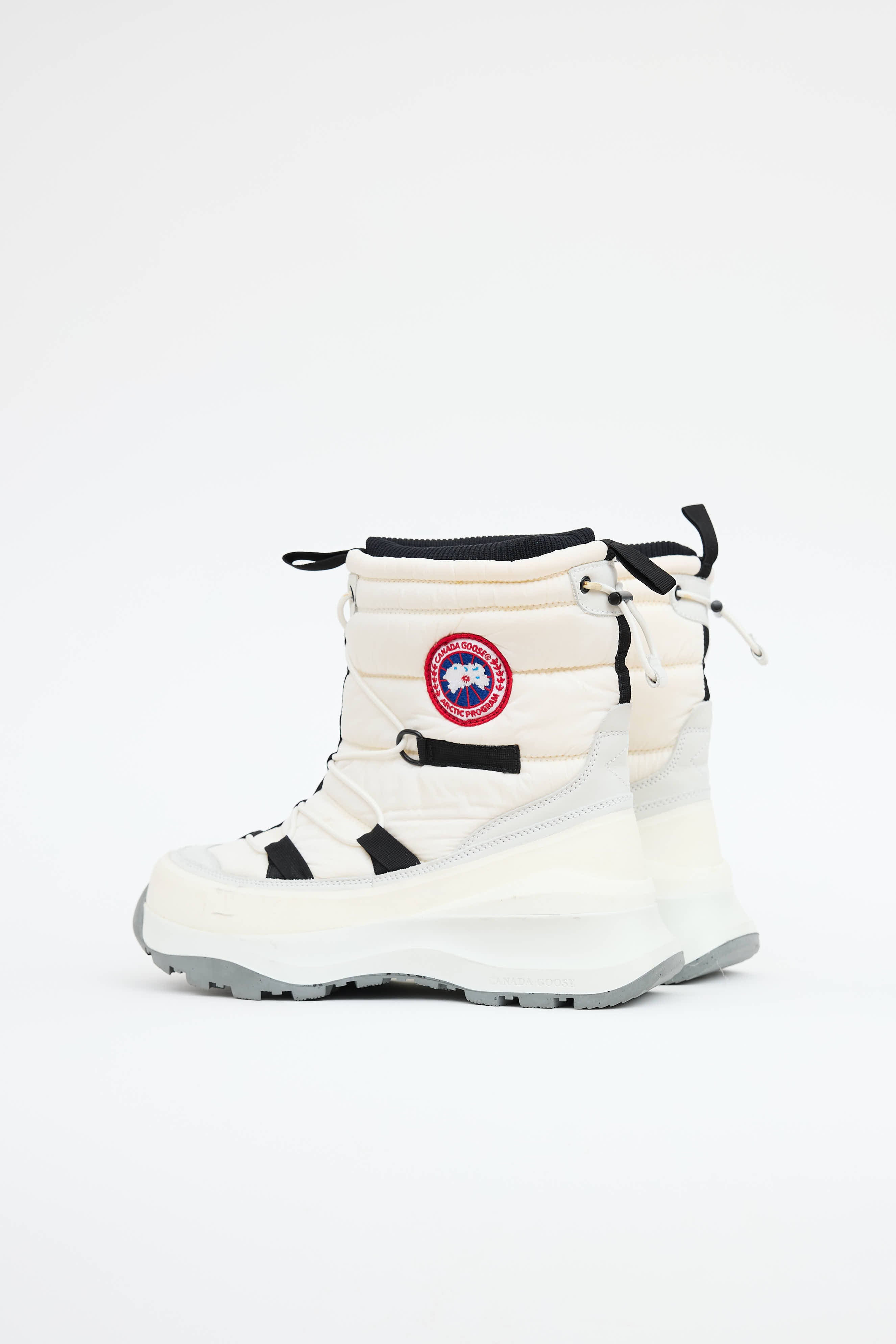 Pre-owned Canada Goose white Toronto boots featuring rubber chunky sole, slip on entry, signature logo patch at side, draw string and cord lace up detail and ribbed quilted layer at entry.