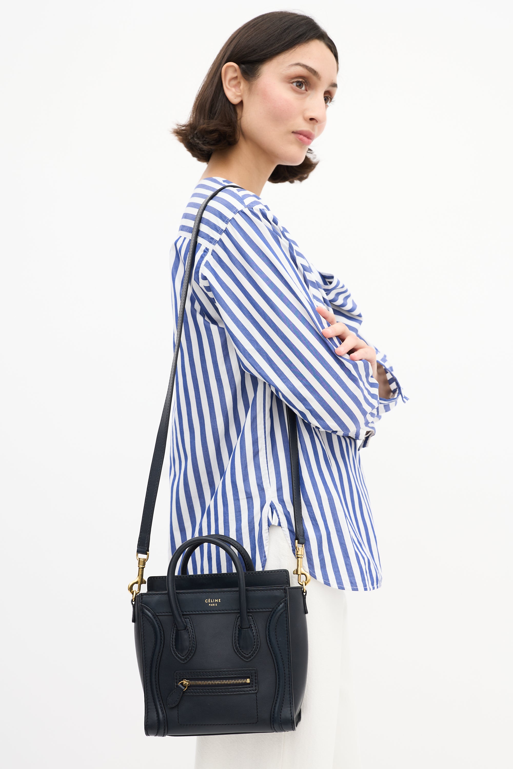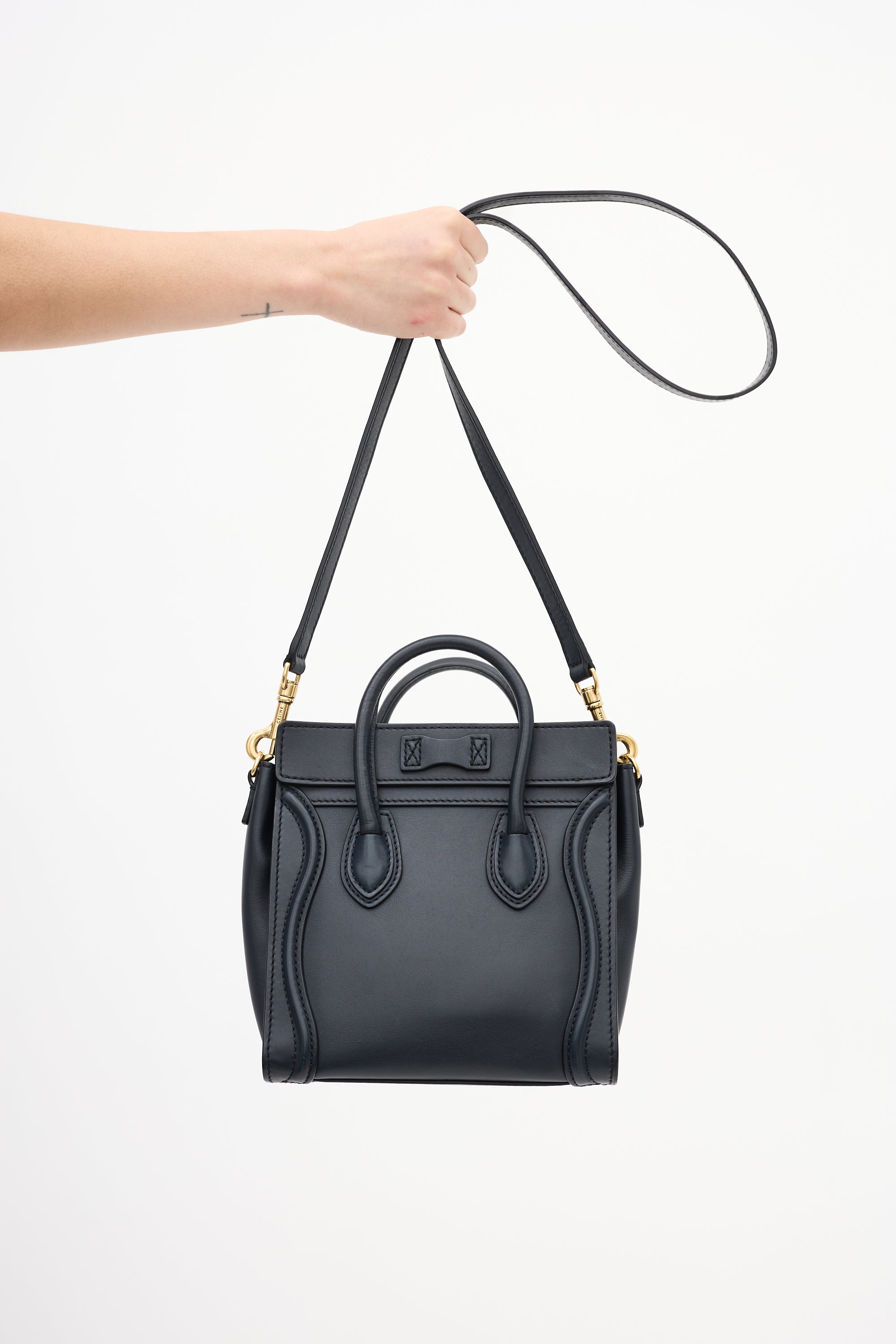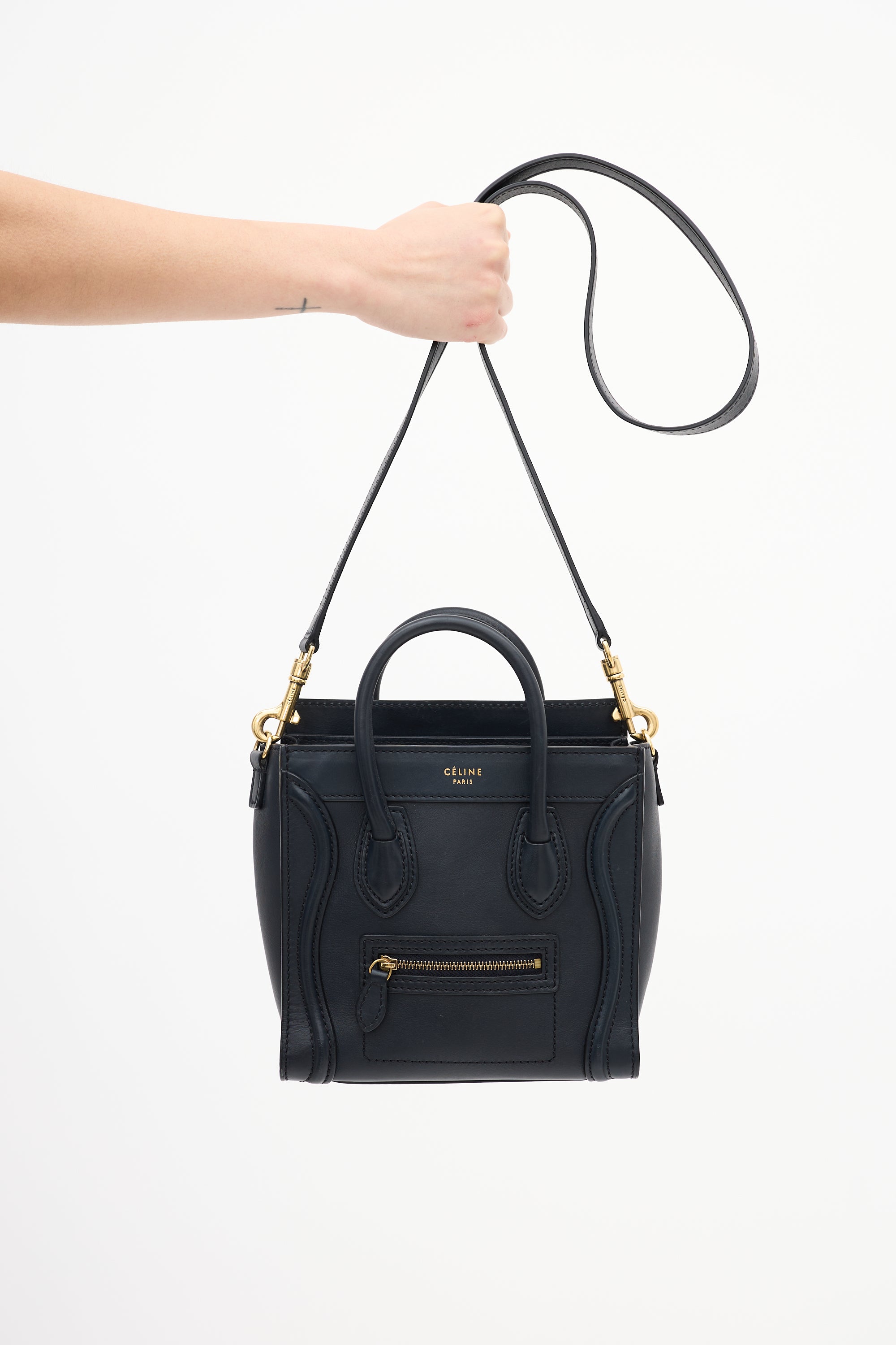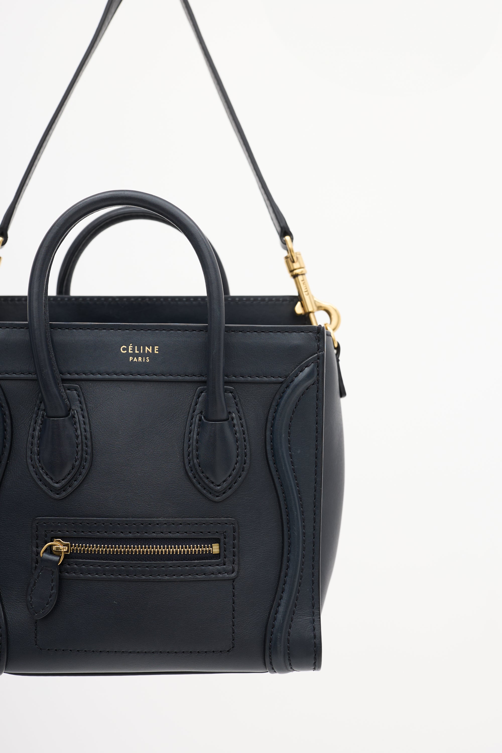 Pre-owned Celine 2012 navy leather Micro Luggage tote bag featuring tonal stitching, gold tone hardware, gold tone foil logo at top centre front, one zip pocket at front, dual rolled top handles, detachable leather shoulder strap, top zip closure, and one lined main compartment with one slip pocket.