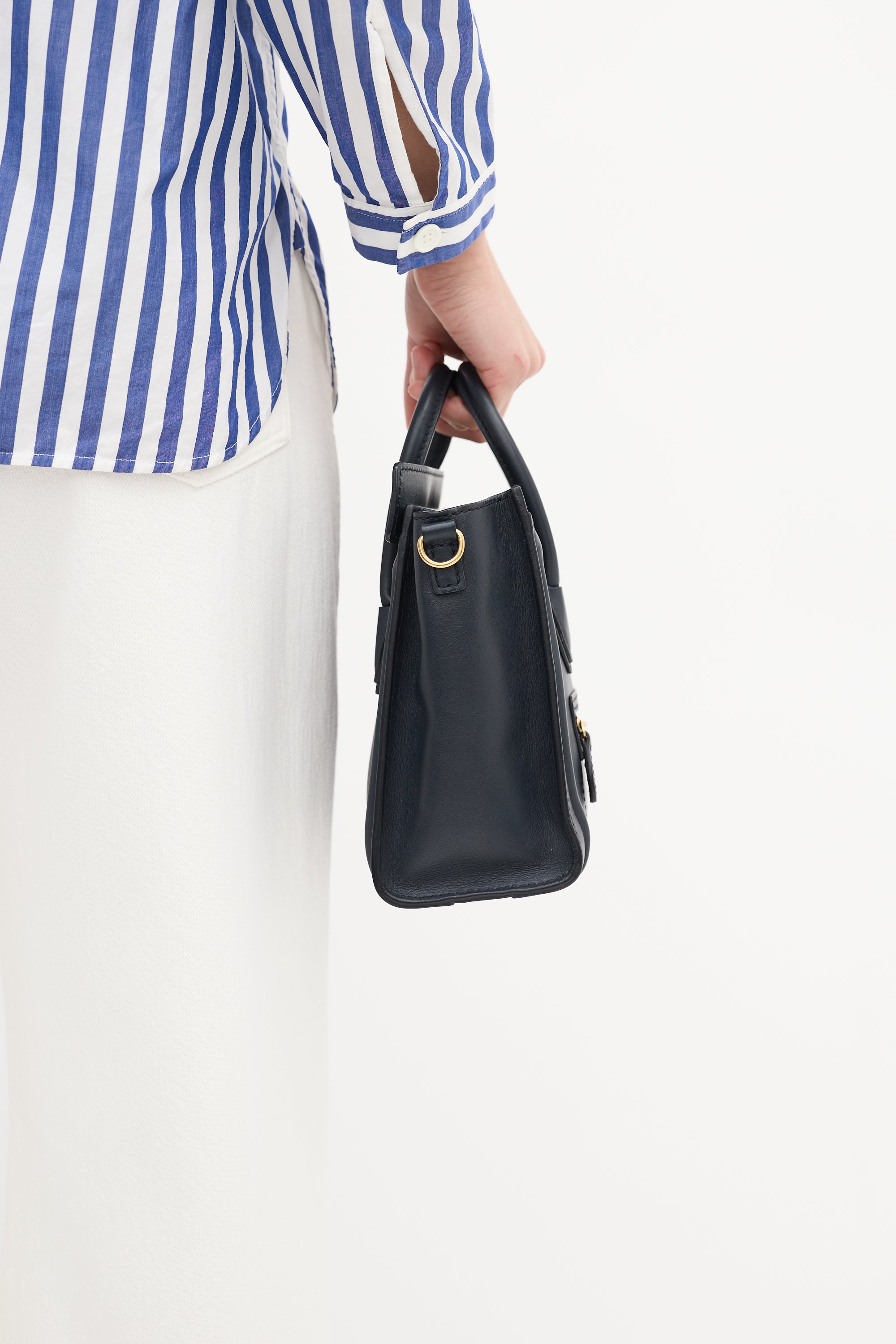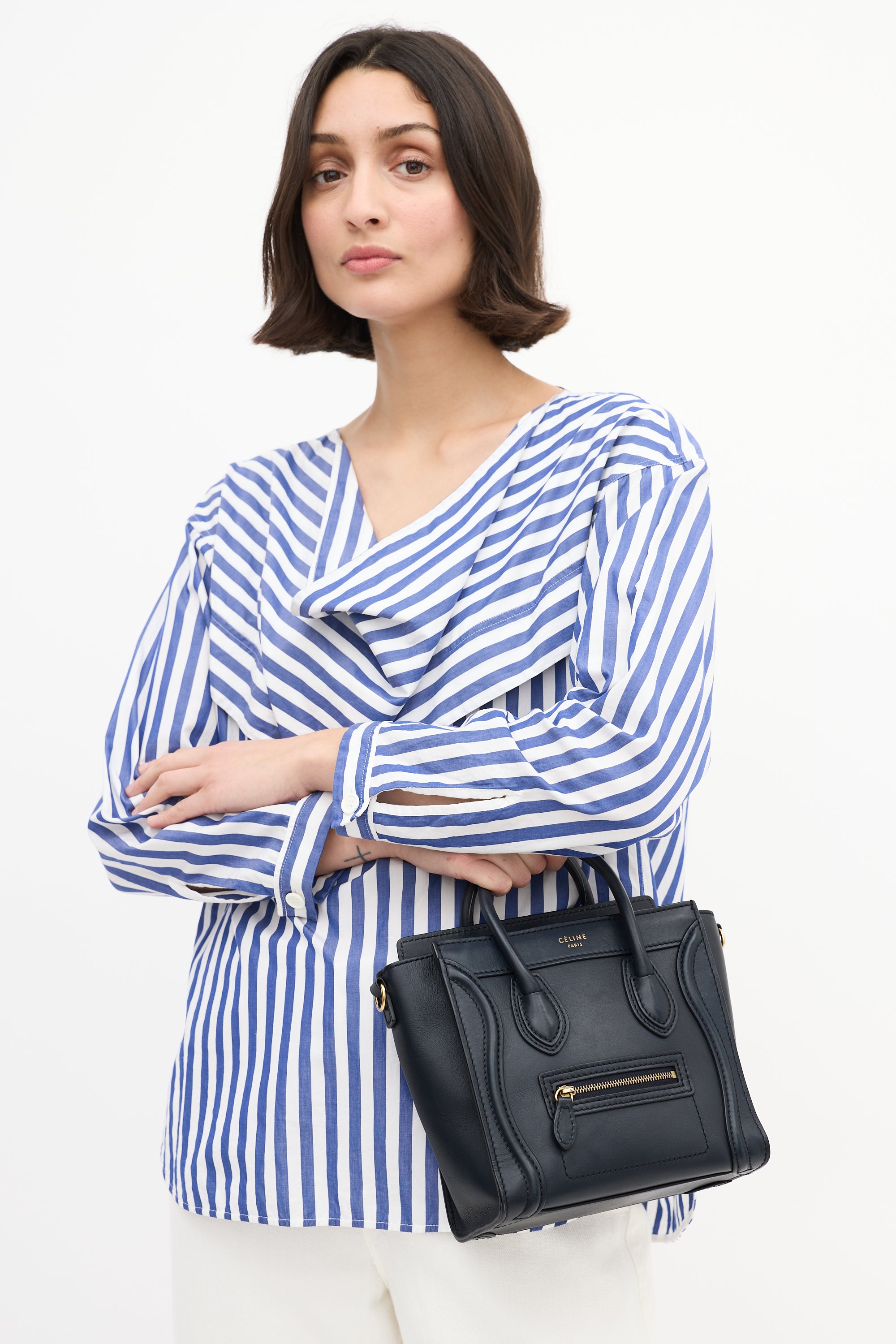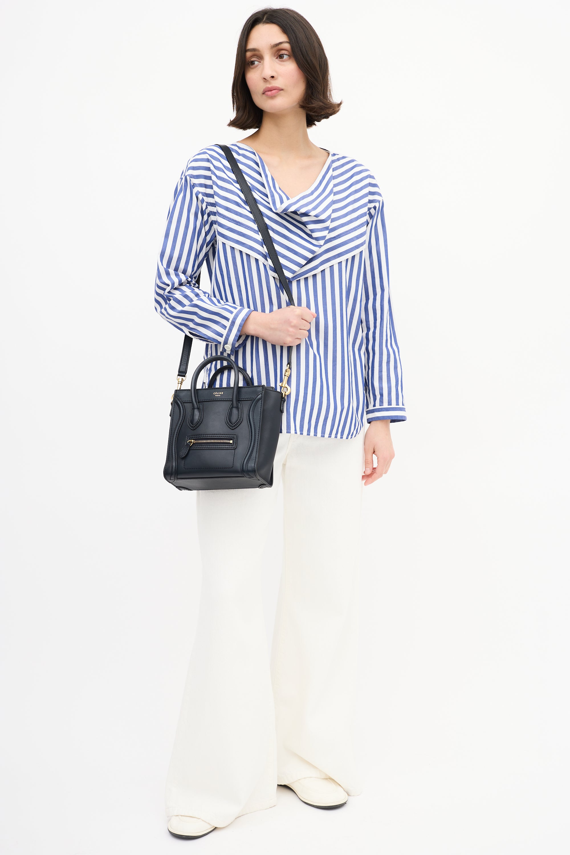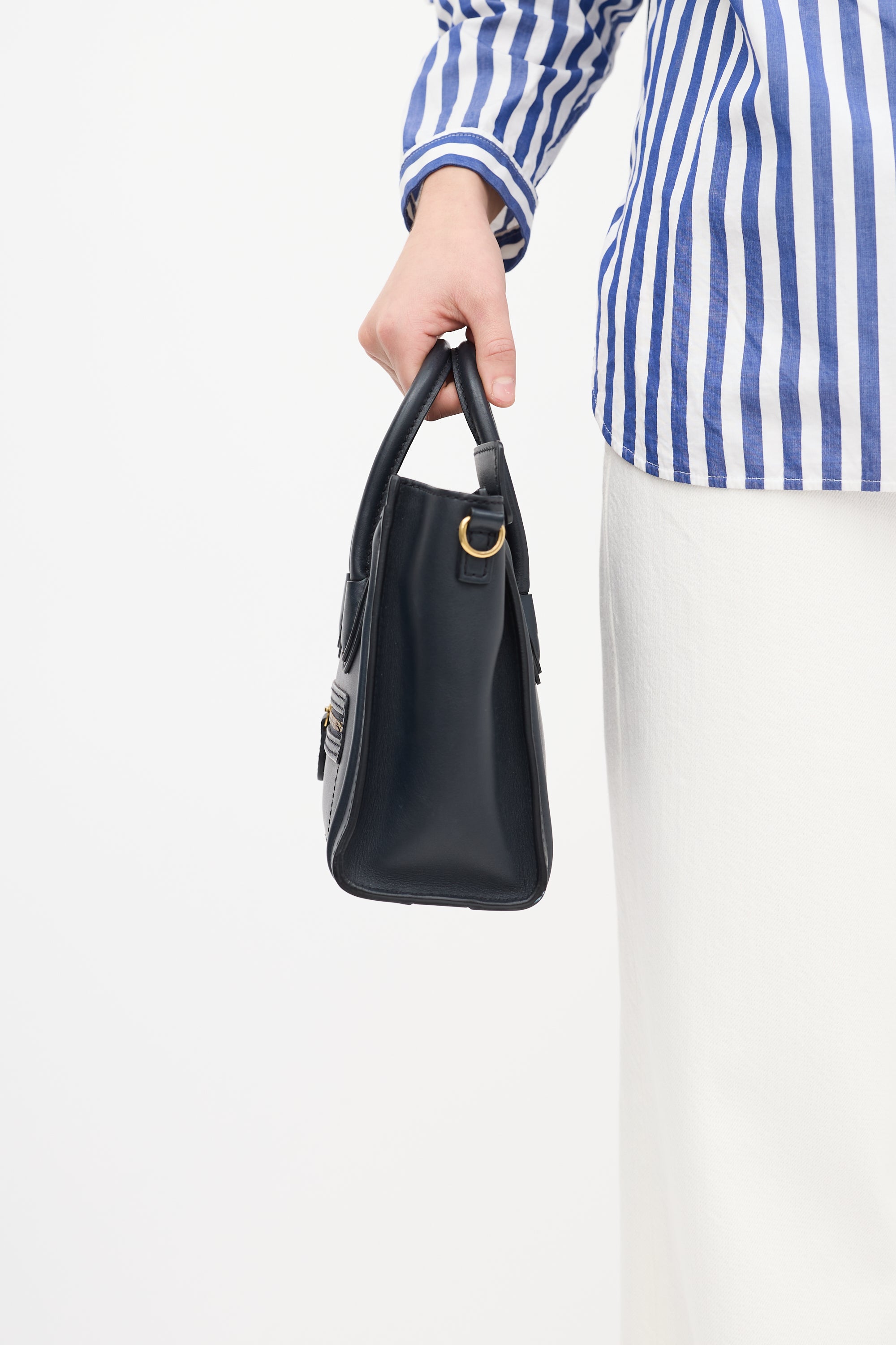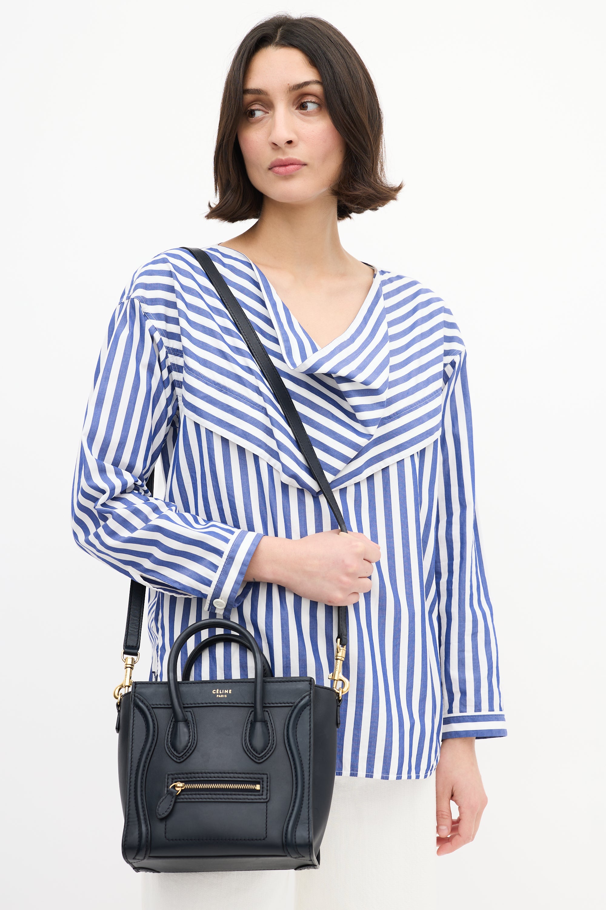 Pre-owned Celine 2012 navy leather Micro Luggage tote bag featuring tonal stitching, gold tone hardware, gold tone foil logo at top centre front, one zip pocket at front, dual rolled top handles, detachable leather shoulder strap, top zip closure, and one lined main compartment with one slip pocket.