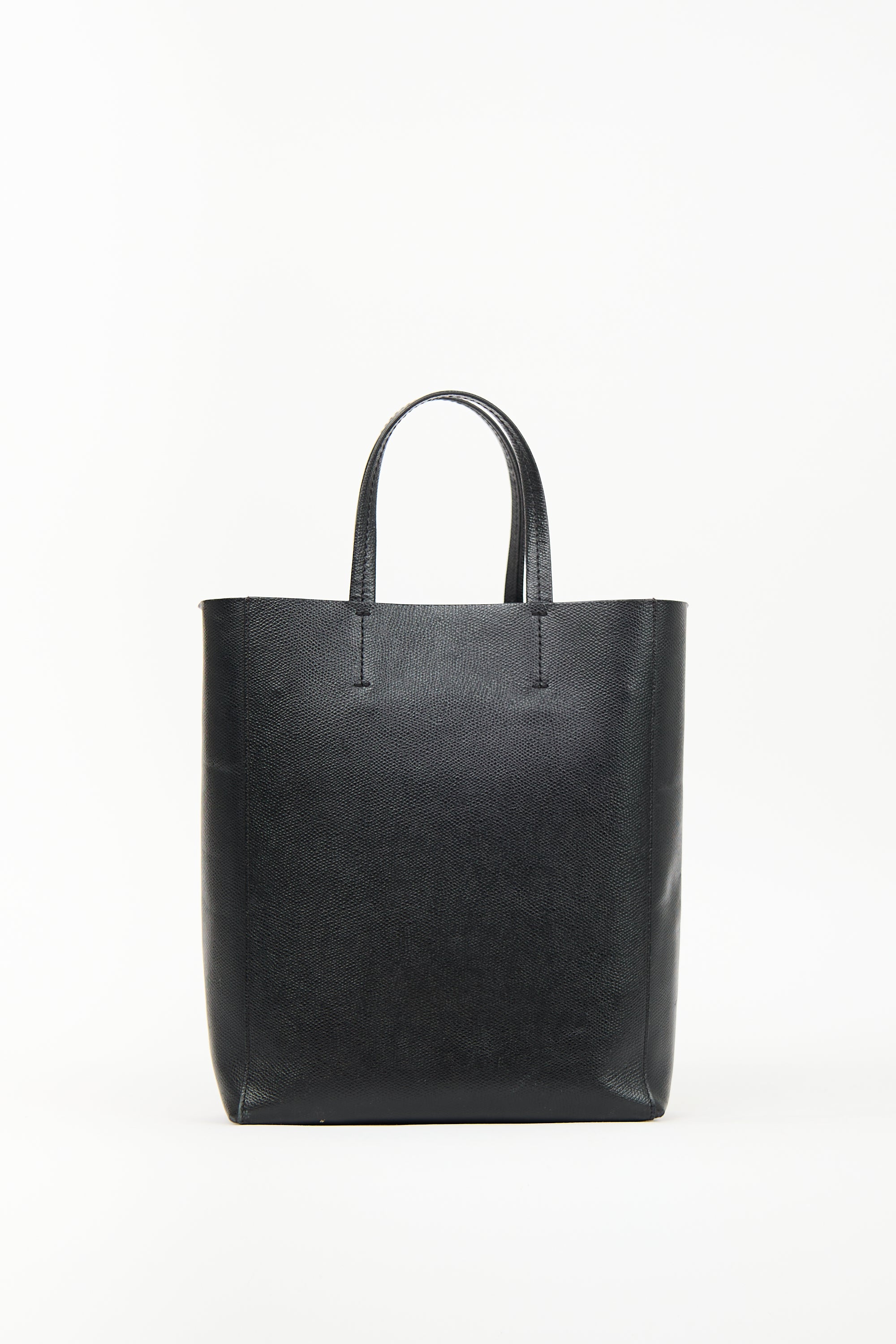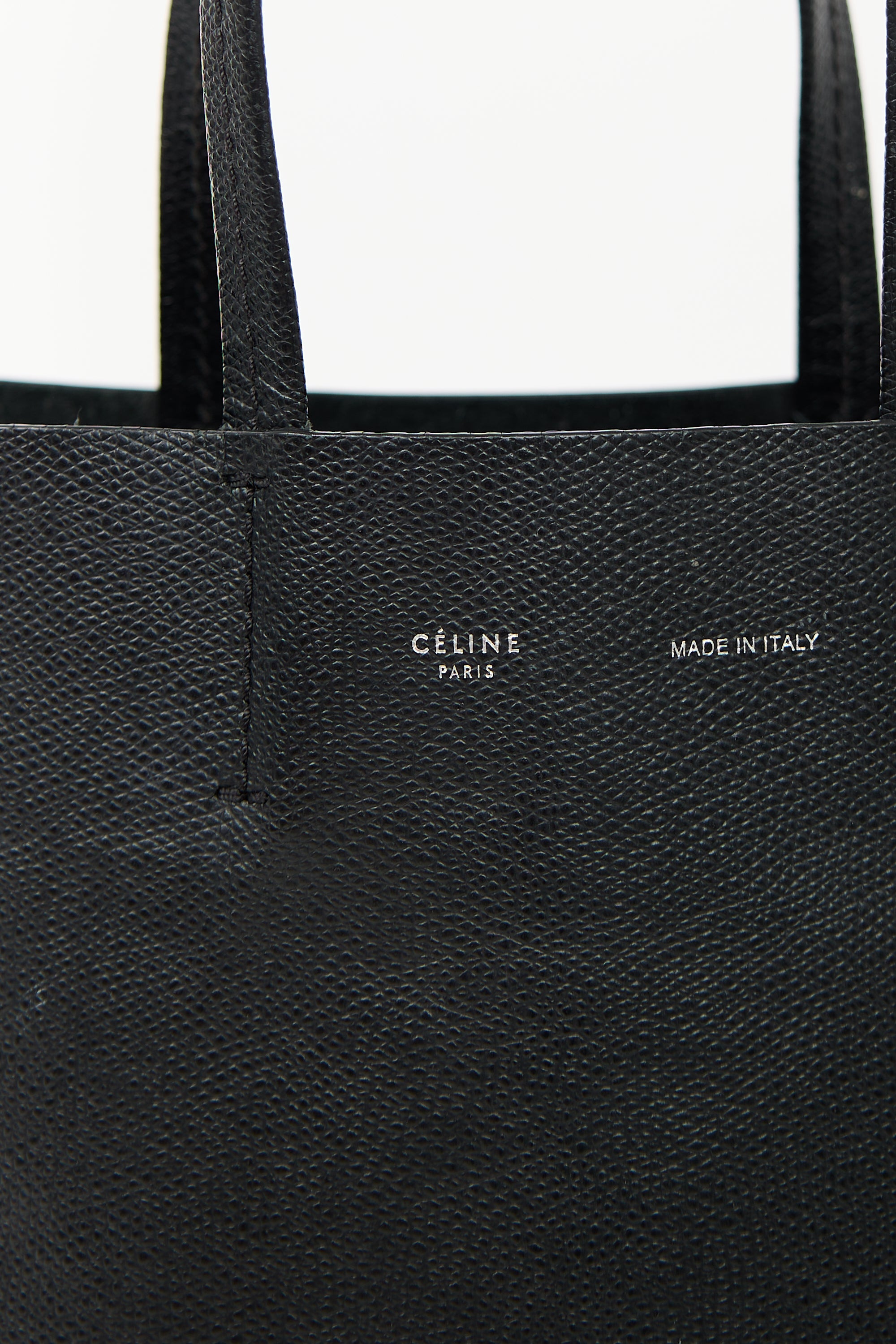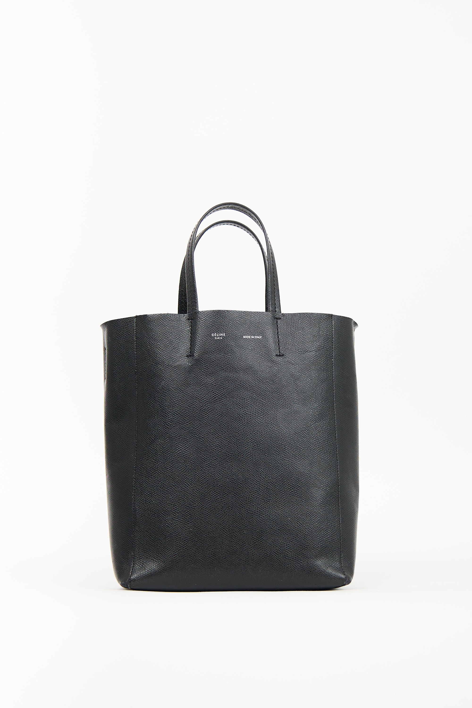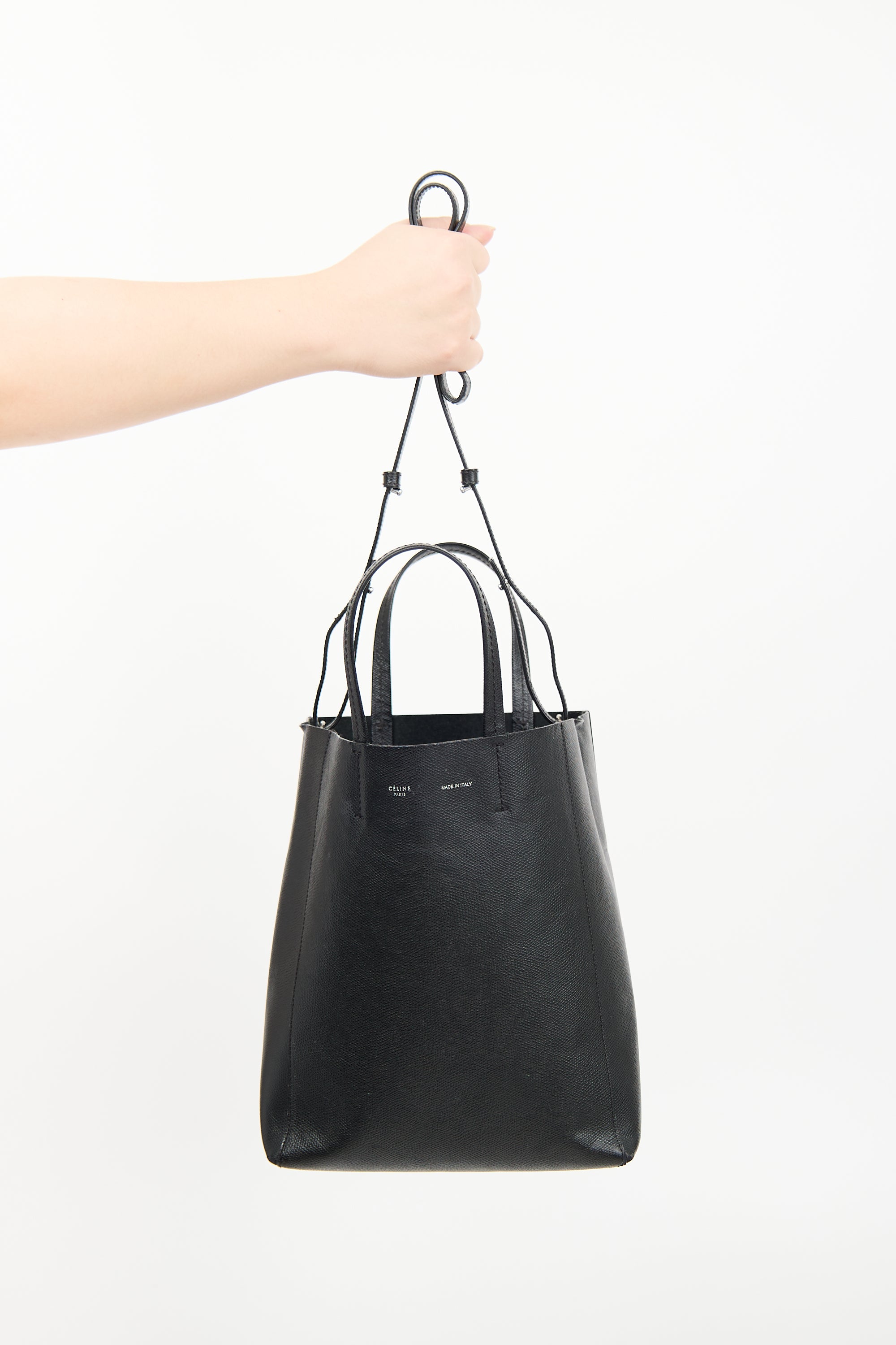 Pre-owned Celine 2018 black leather Cabas crossbody bag featuring silver tone stamped logo at top centre front, dual flat top handles, removable and adjustable shoulder strap, open top, and one lined main compartment with single zip pocket. Comes with original dust bag.