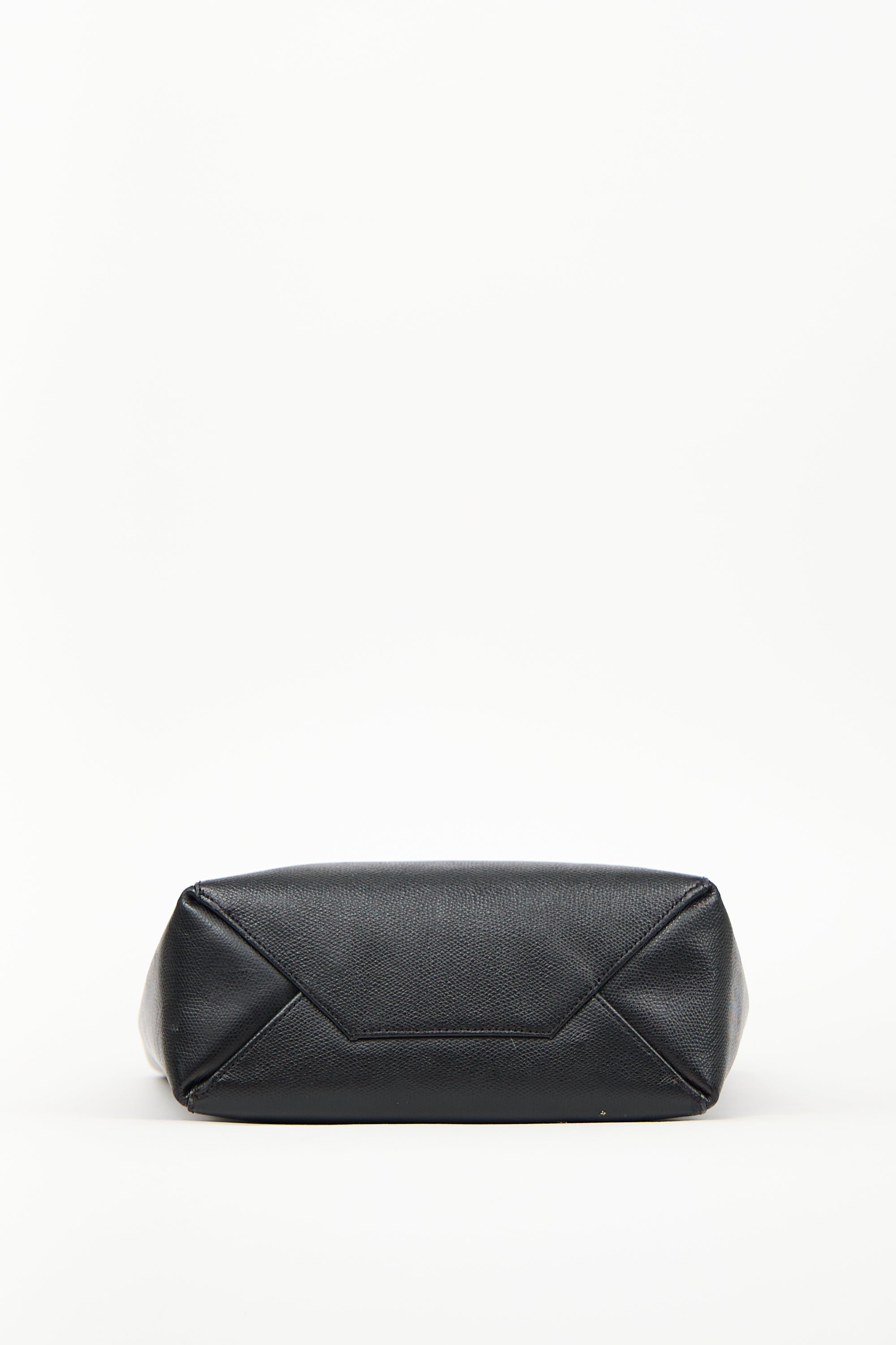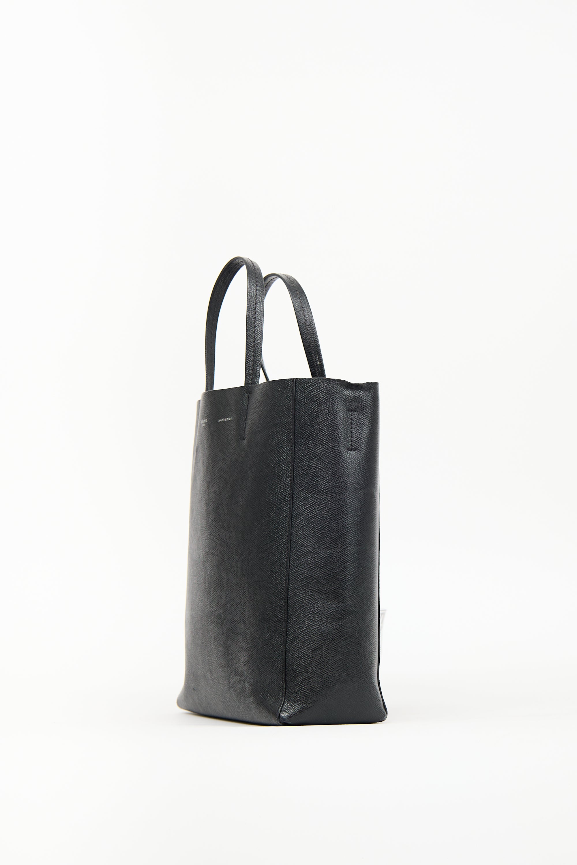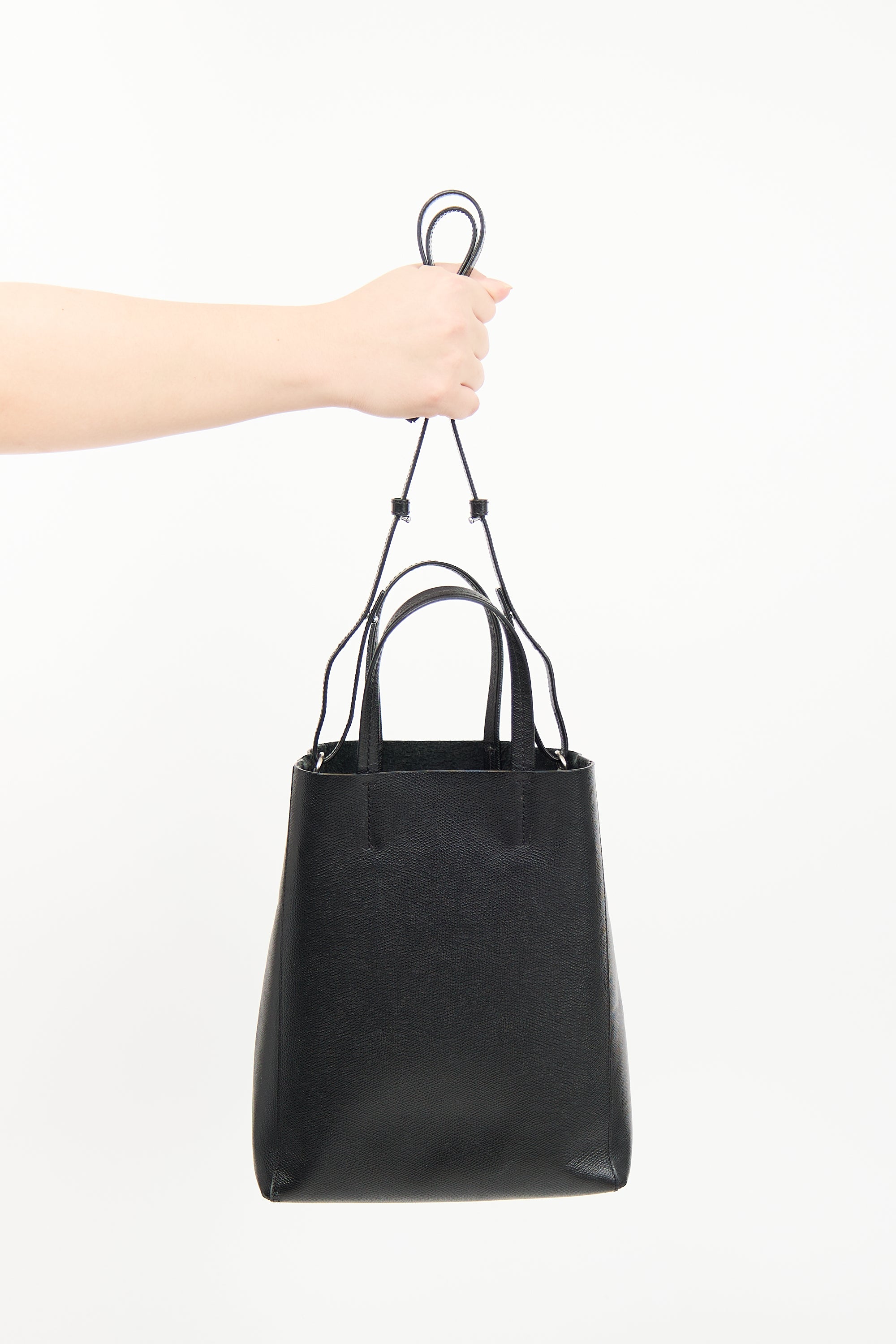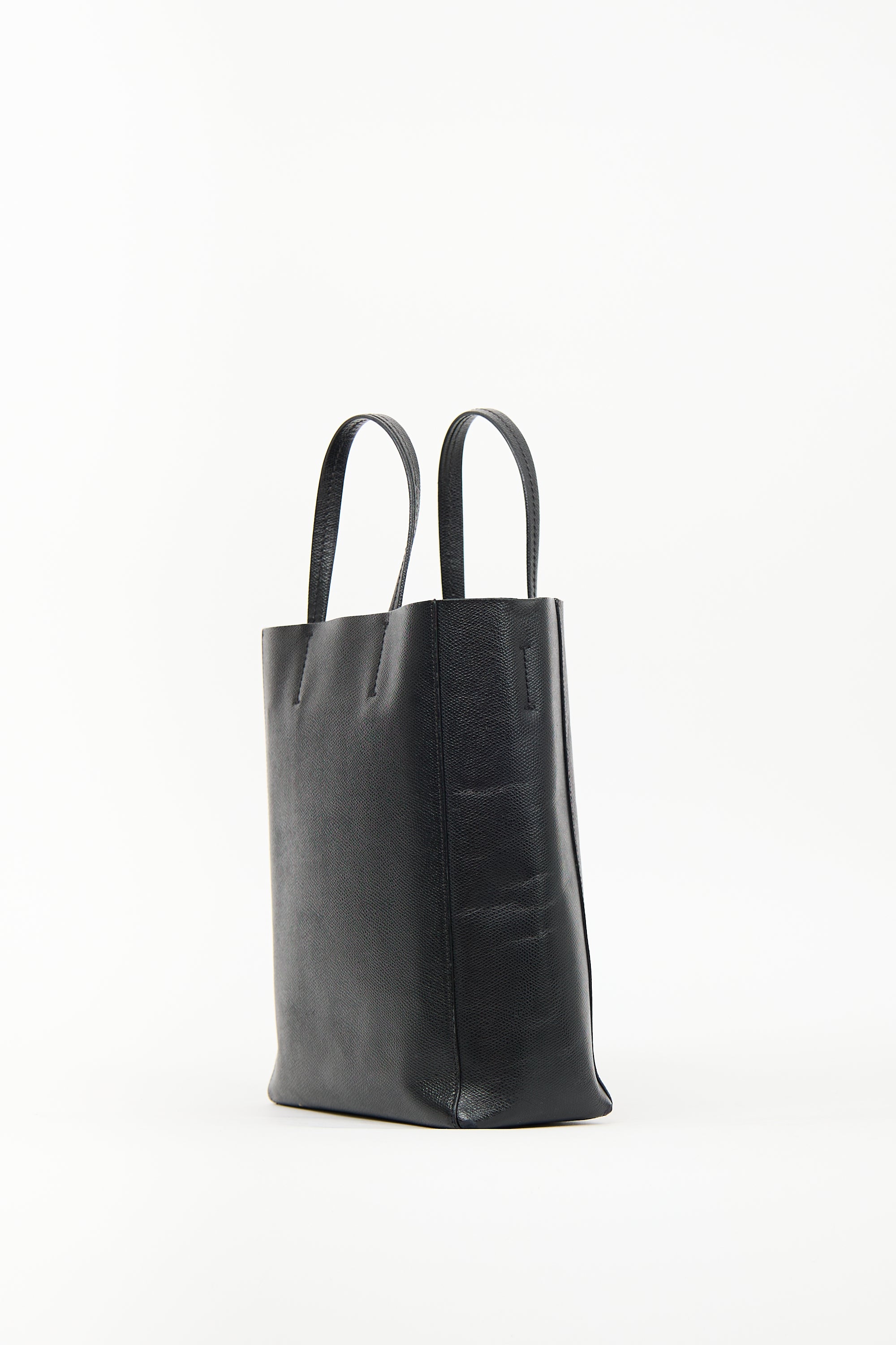 Pre-owned Celine 2018 black leather Cabas crossbody bag featuring silver tone stamped logo at top centre front, dual flat top handles, removable and adjustable shoulder strap, open top, and one lined main compartment with single zip pocket. Comes with original dust bag.