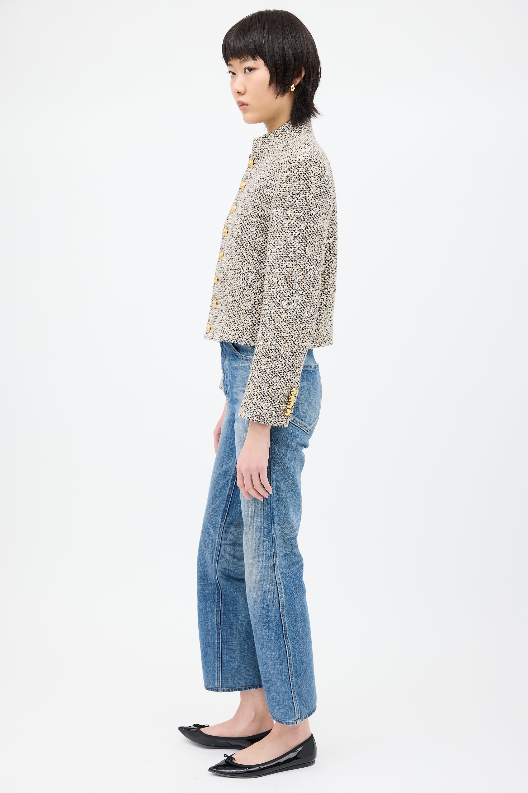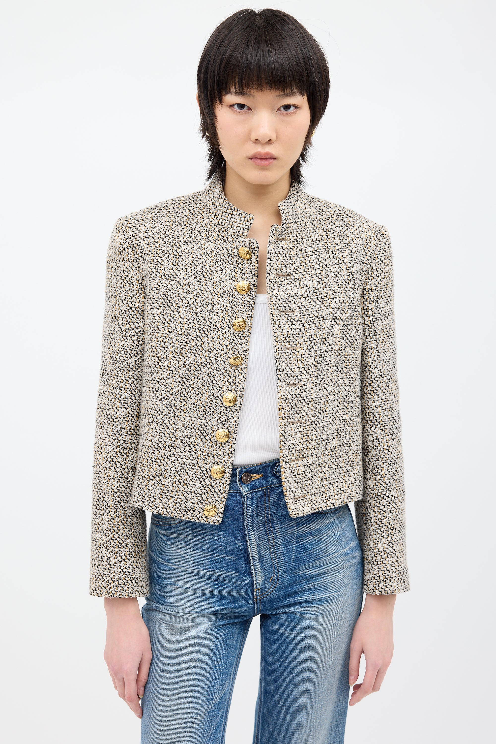 Pre-owned Celine beige and multicolour tweed jacket featuring a stand collar, gold tone buttons with crest motif, button up front, buttoned cuffs, and two interior pockets. Lined.