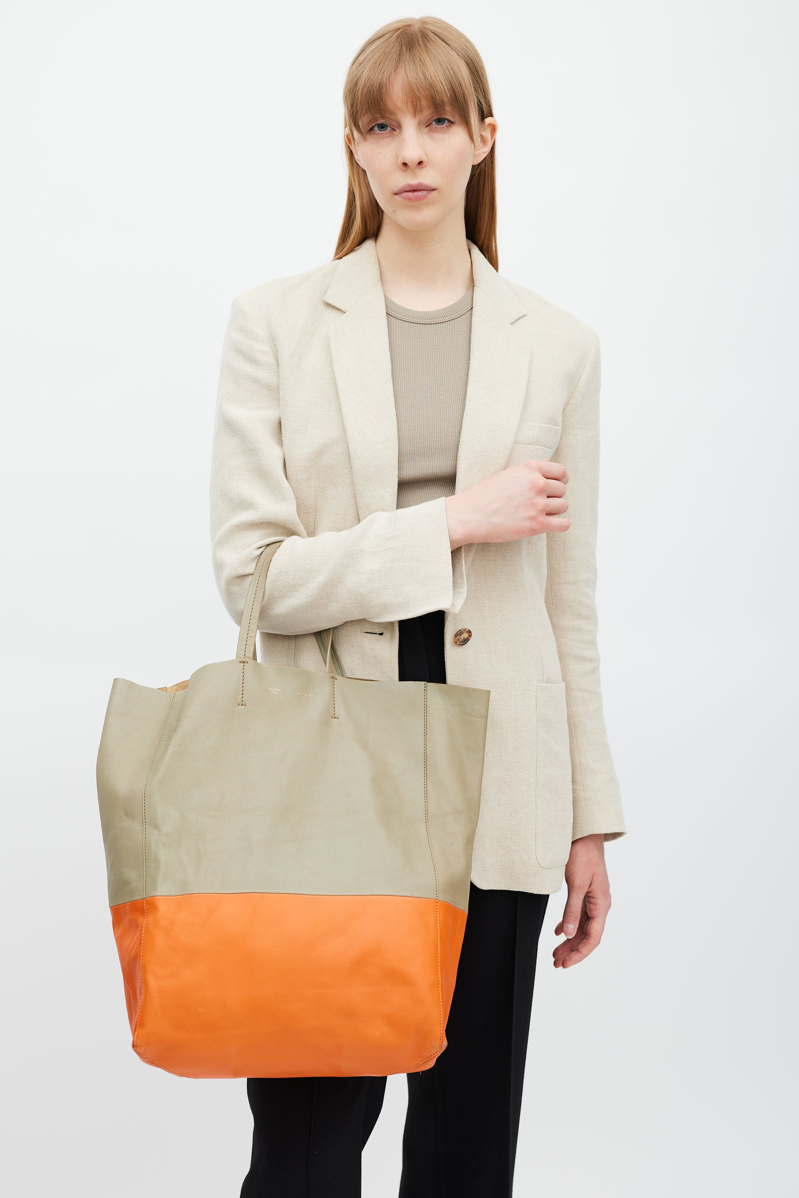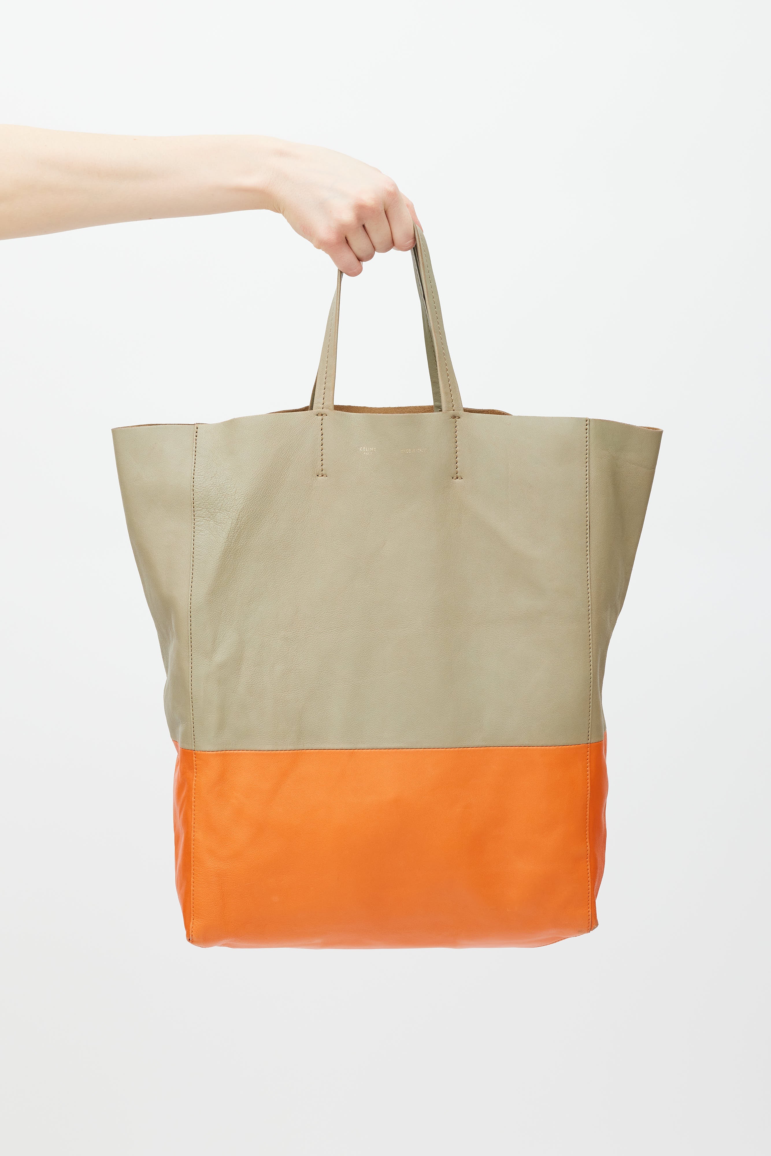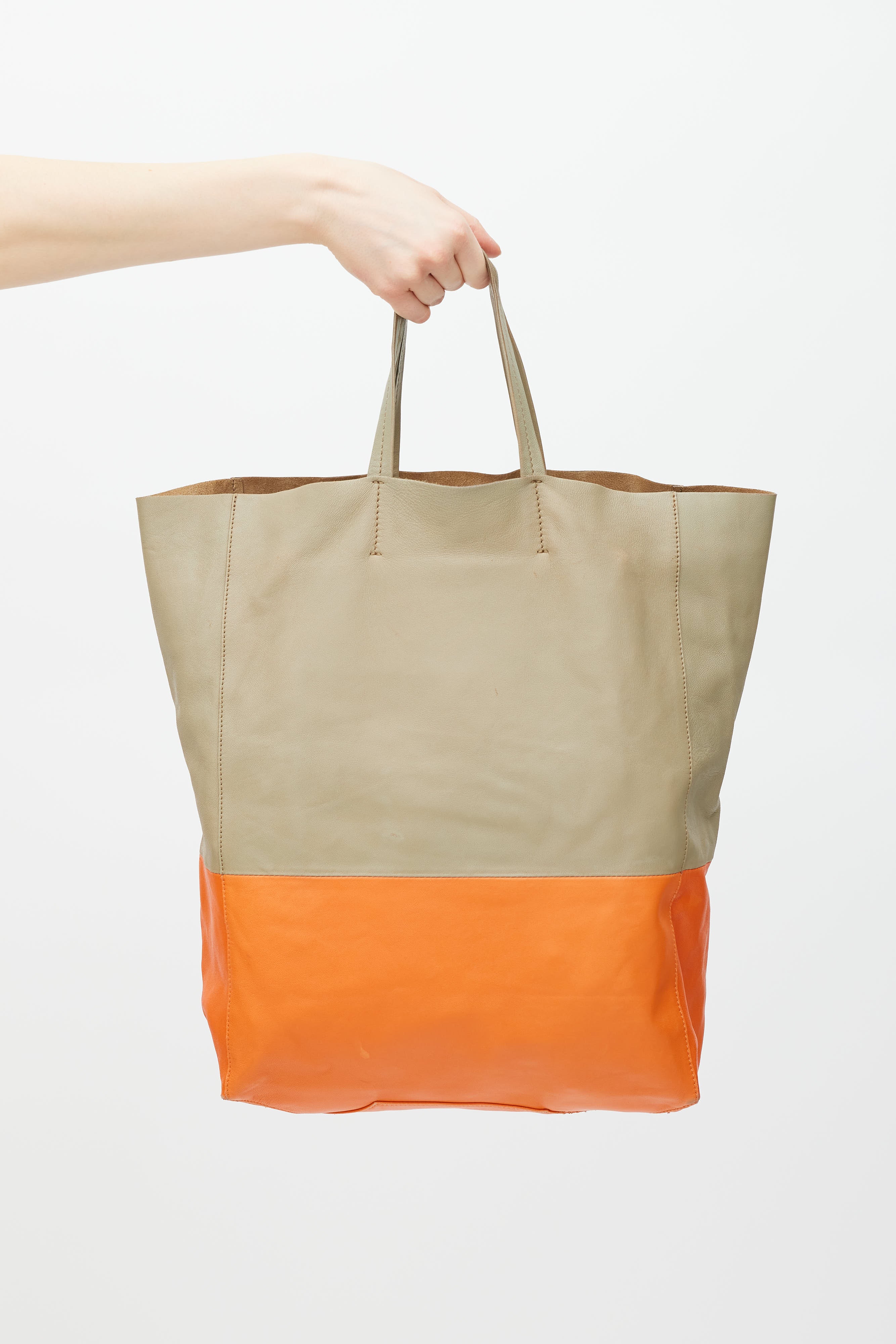 Pre-owned Celine beige Cabas leather tote featuring orange panelling, two top handles, and one main compartment with one zip pocket.