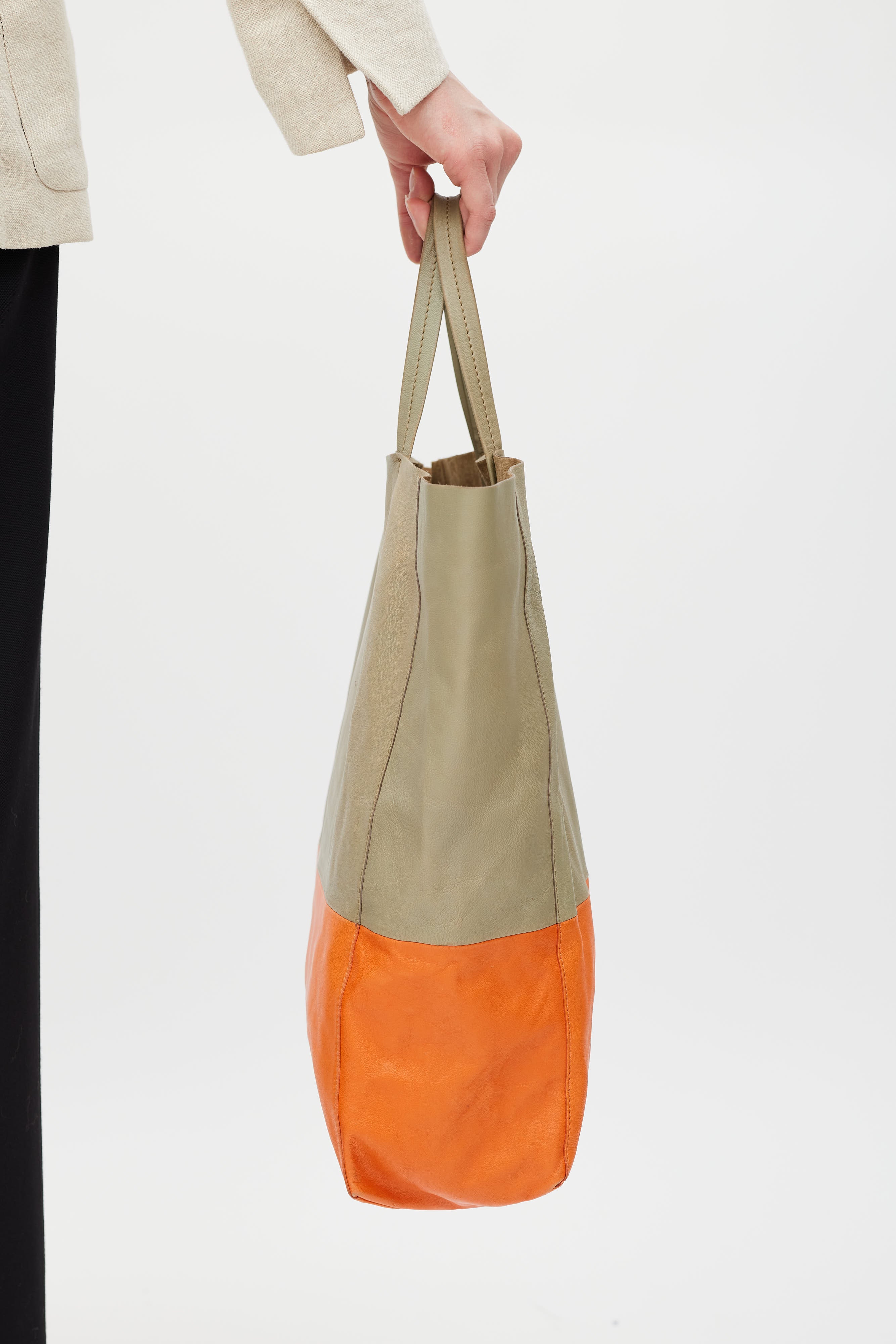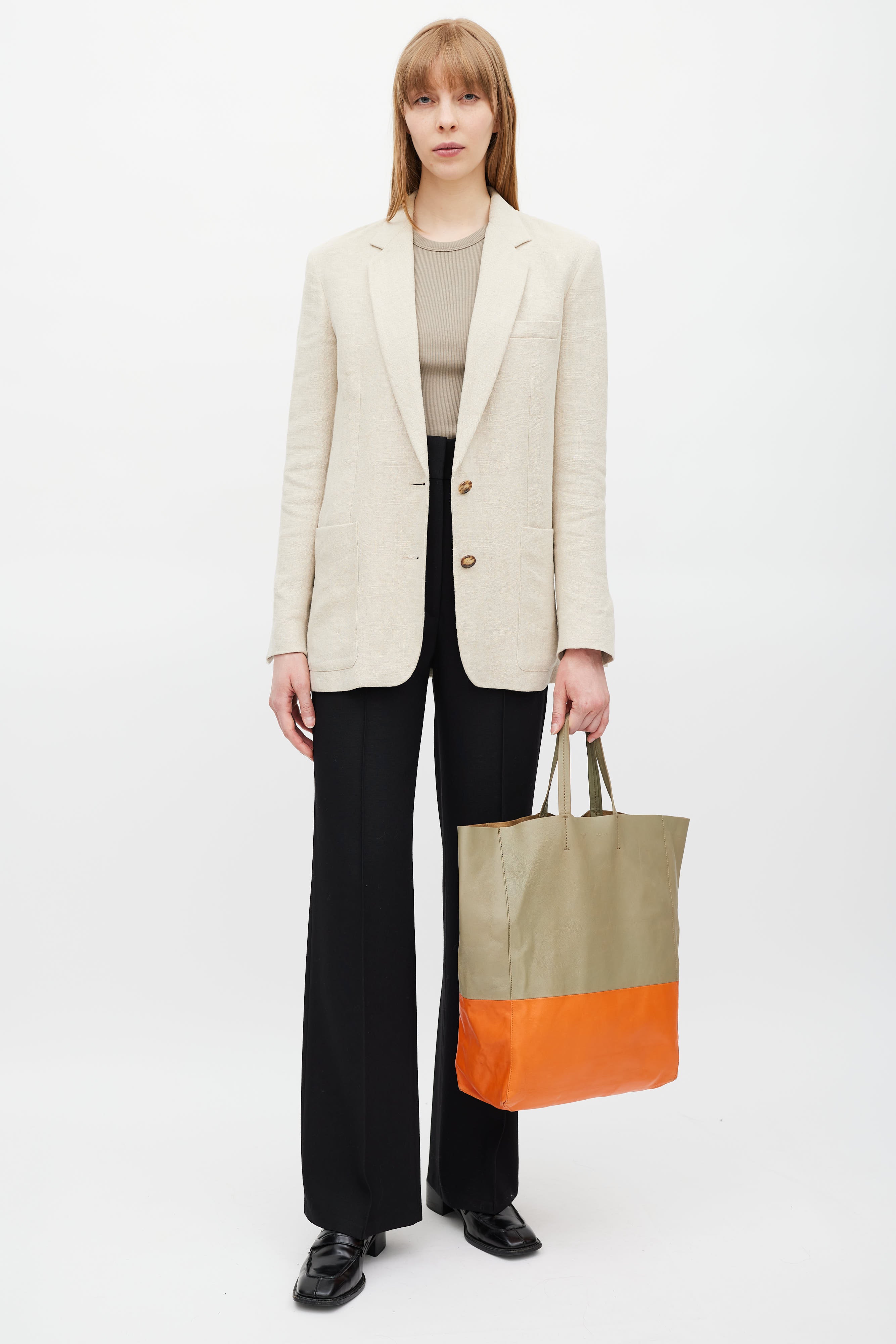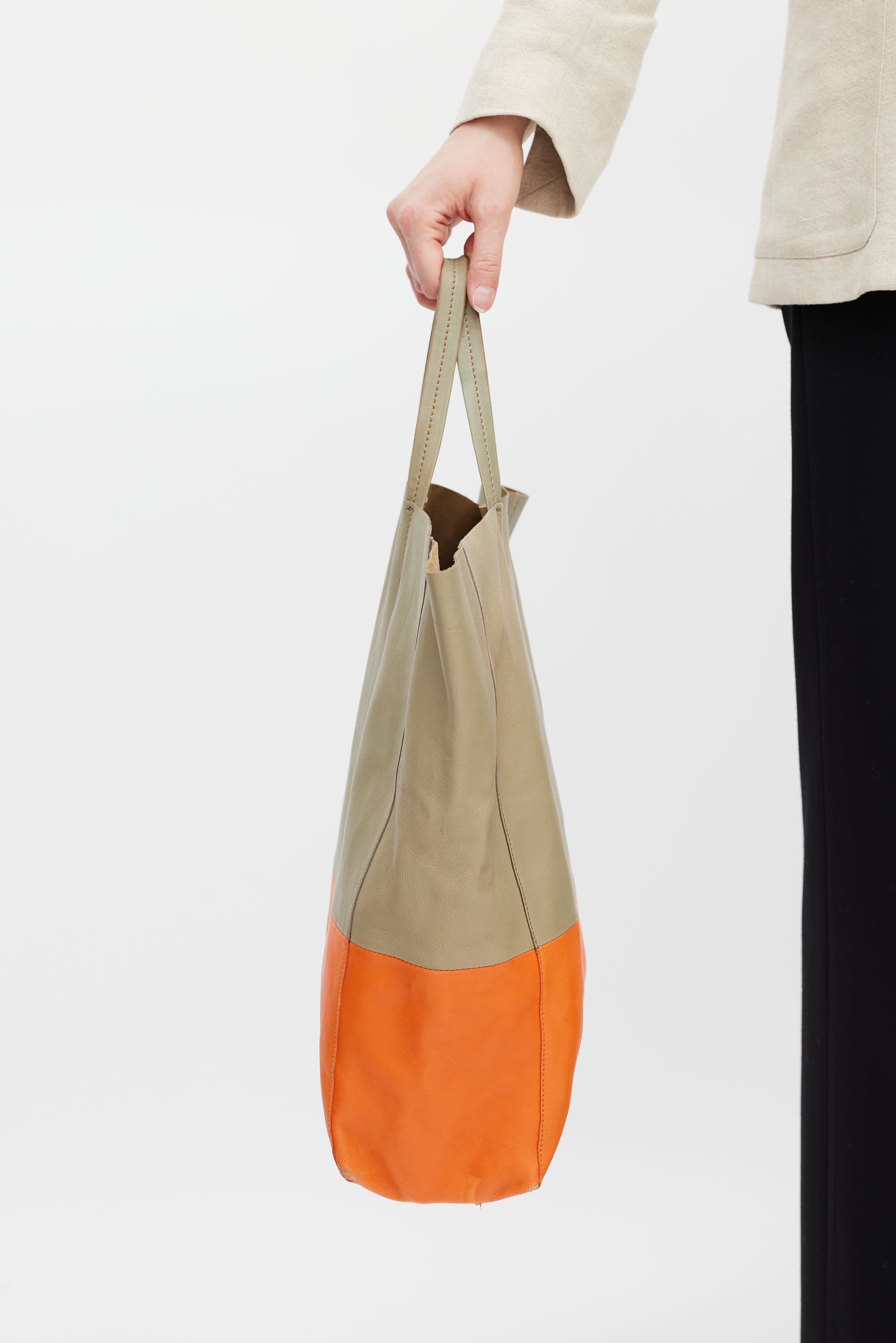 Pre-owned Celine beige Cabas leather tote featuring orange panelling, two top handles, and one main compartment with one zip pocket.