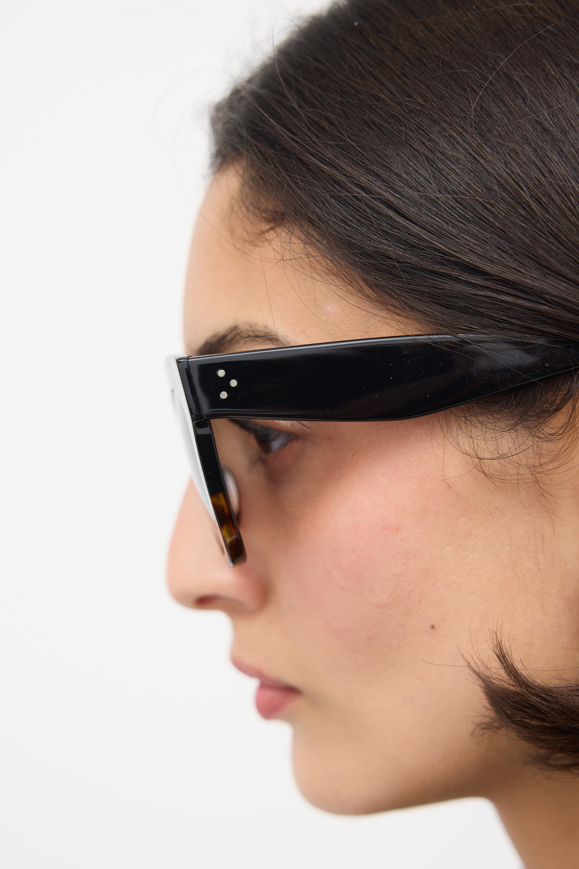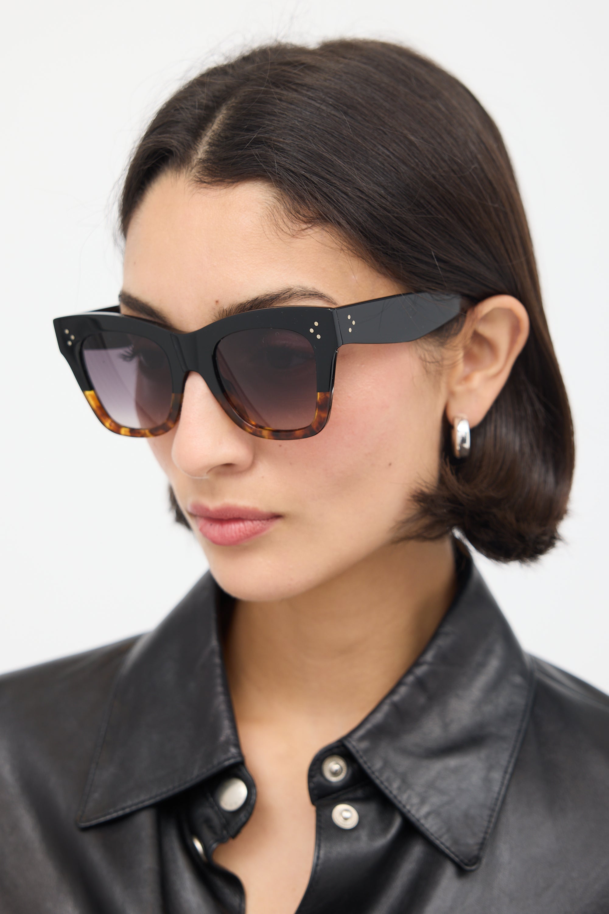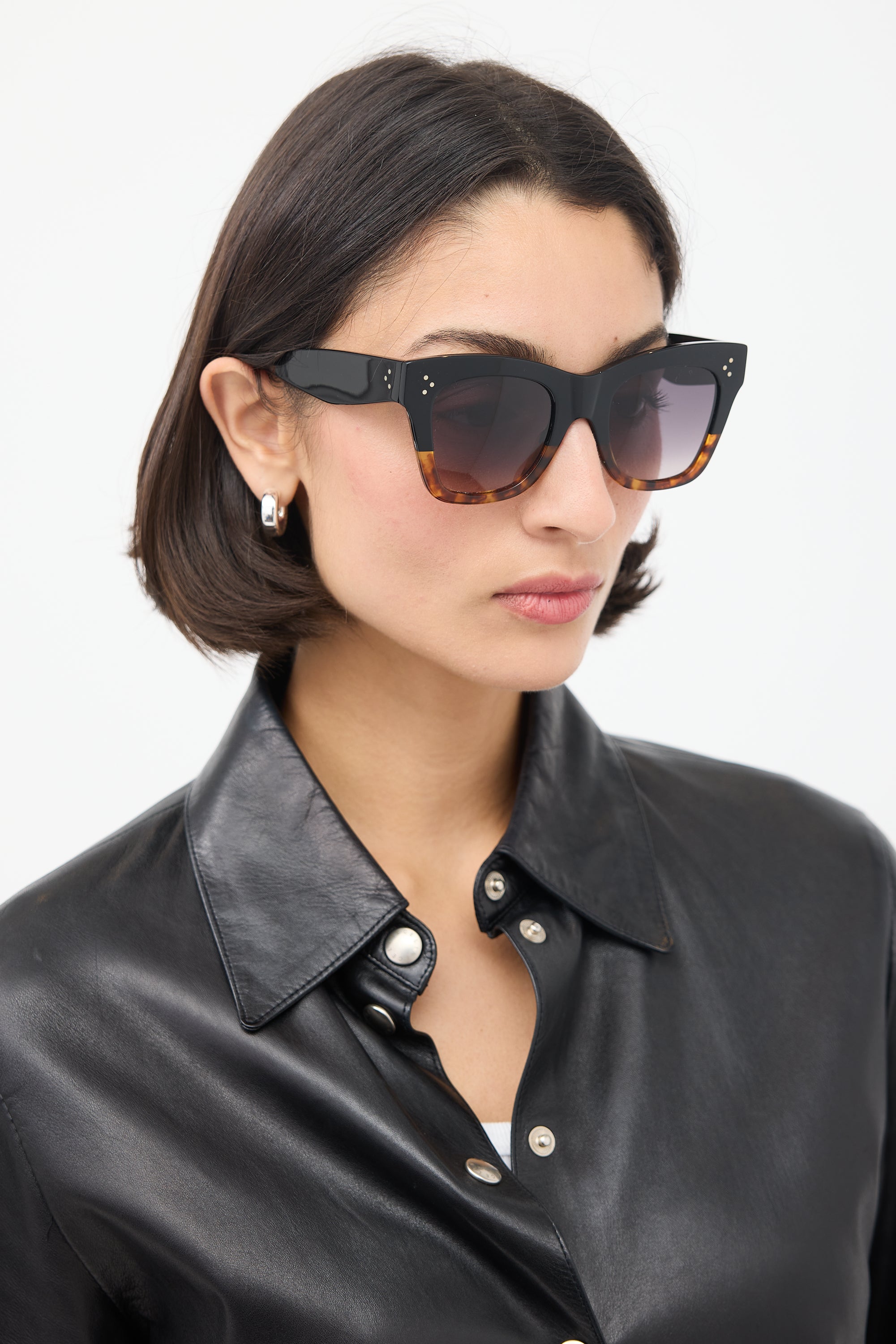 Pre-owned Celine CL4004IN sunglasses featuring grey tinted lenses and two tone black and brown tortoiseshell square frame. Comes with original case, box, and wipe cloth.