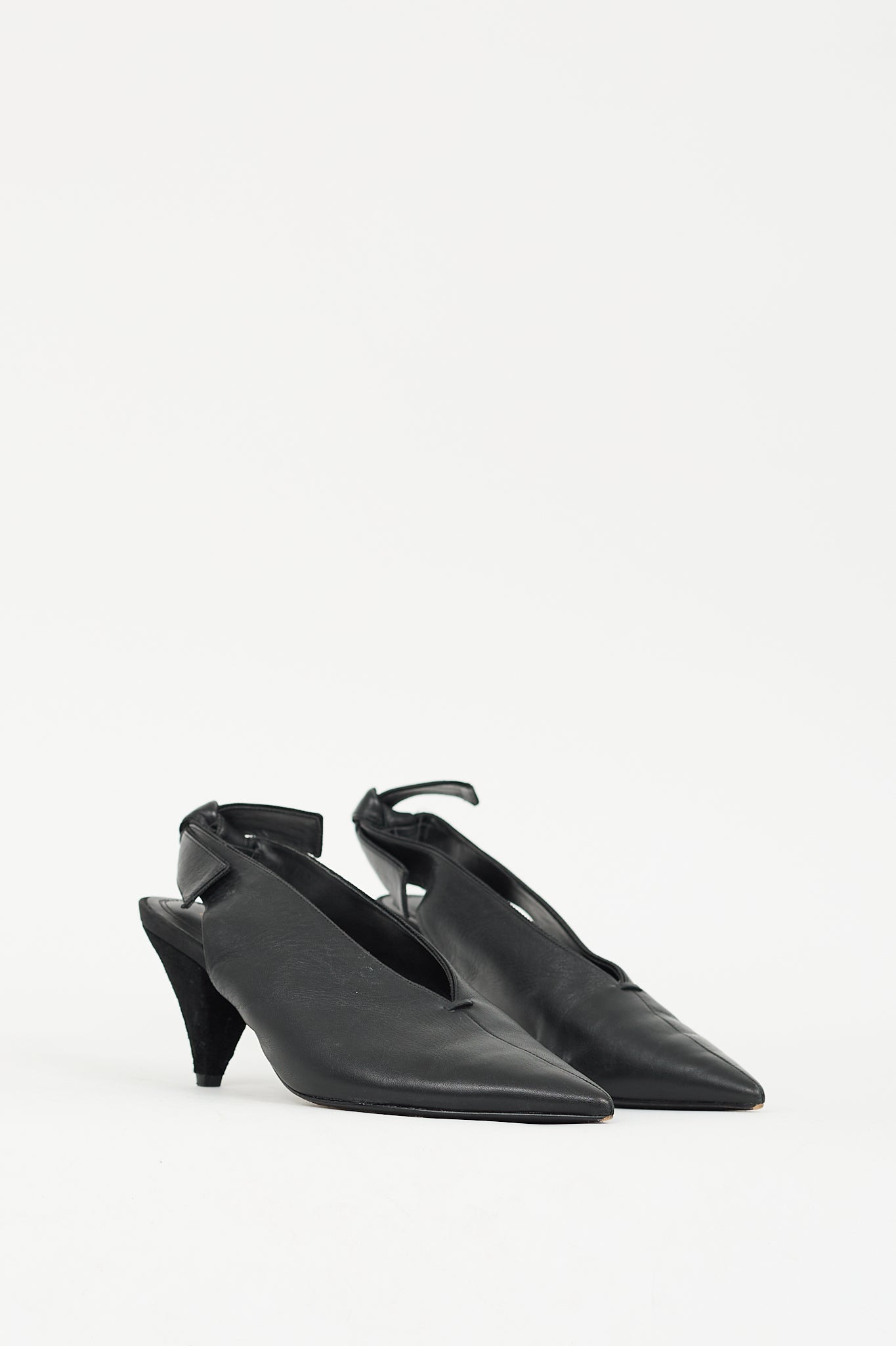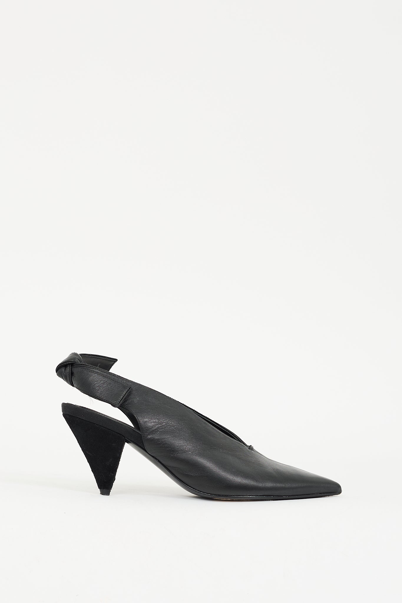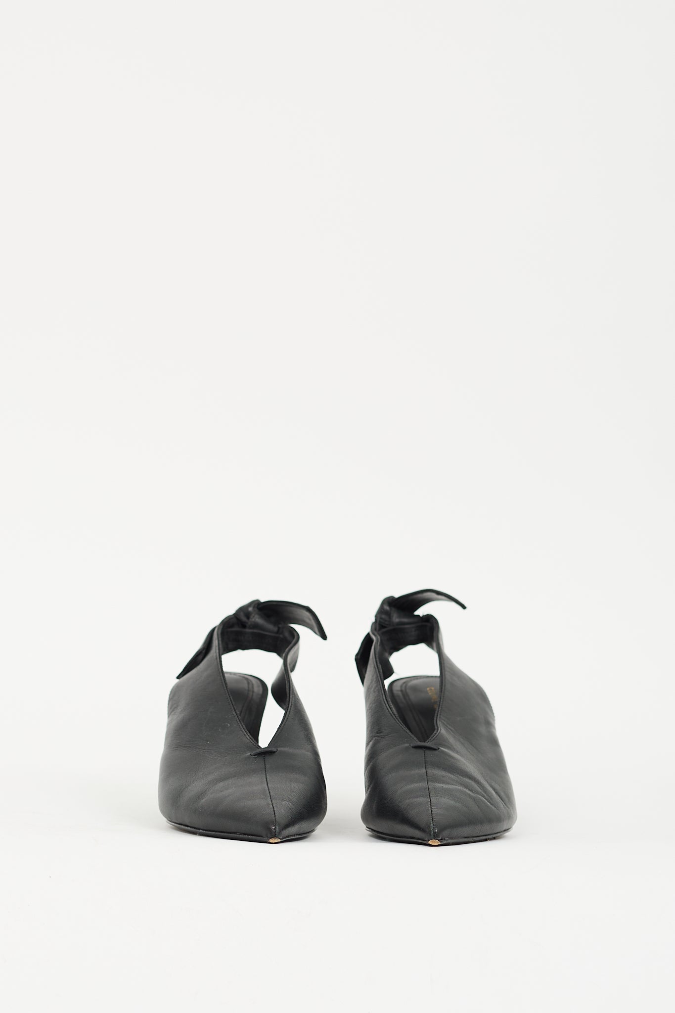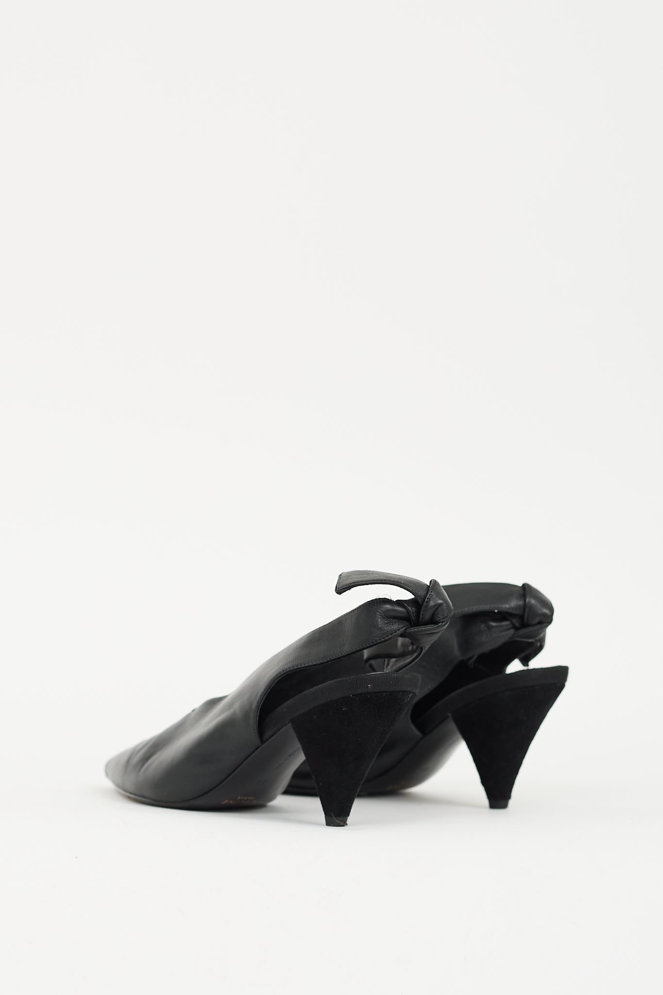 Pre-owned Celine black lambskin leather slingback heels featuring pointed toe, elasticized ankle strap, knotted bow at counter, and suede covered cone heel.