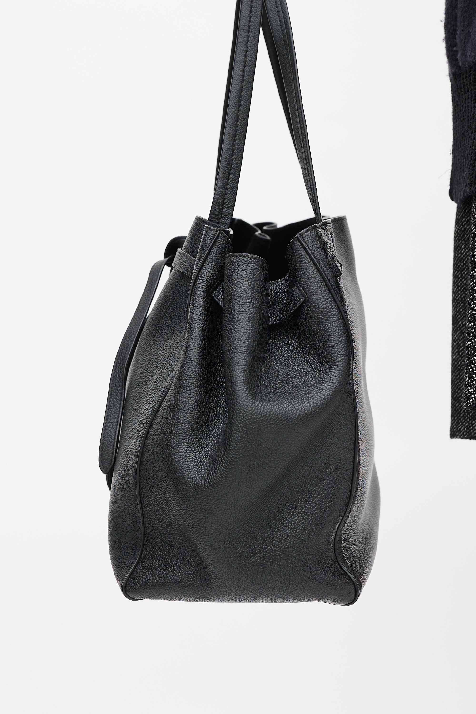 Pre-owned Celine black leather small Cabas Phantom leather tote bag featuring tonal stitching, gold tone stamped logo at top centre front, tie belt at topline, dual leather top handles, and one main compartment with one zip pocket and two slip pockets. Comes with original dust bag.