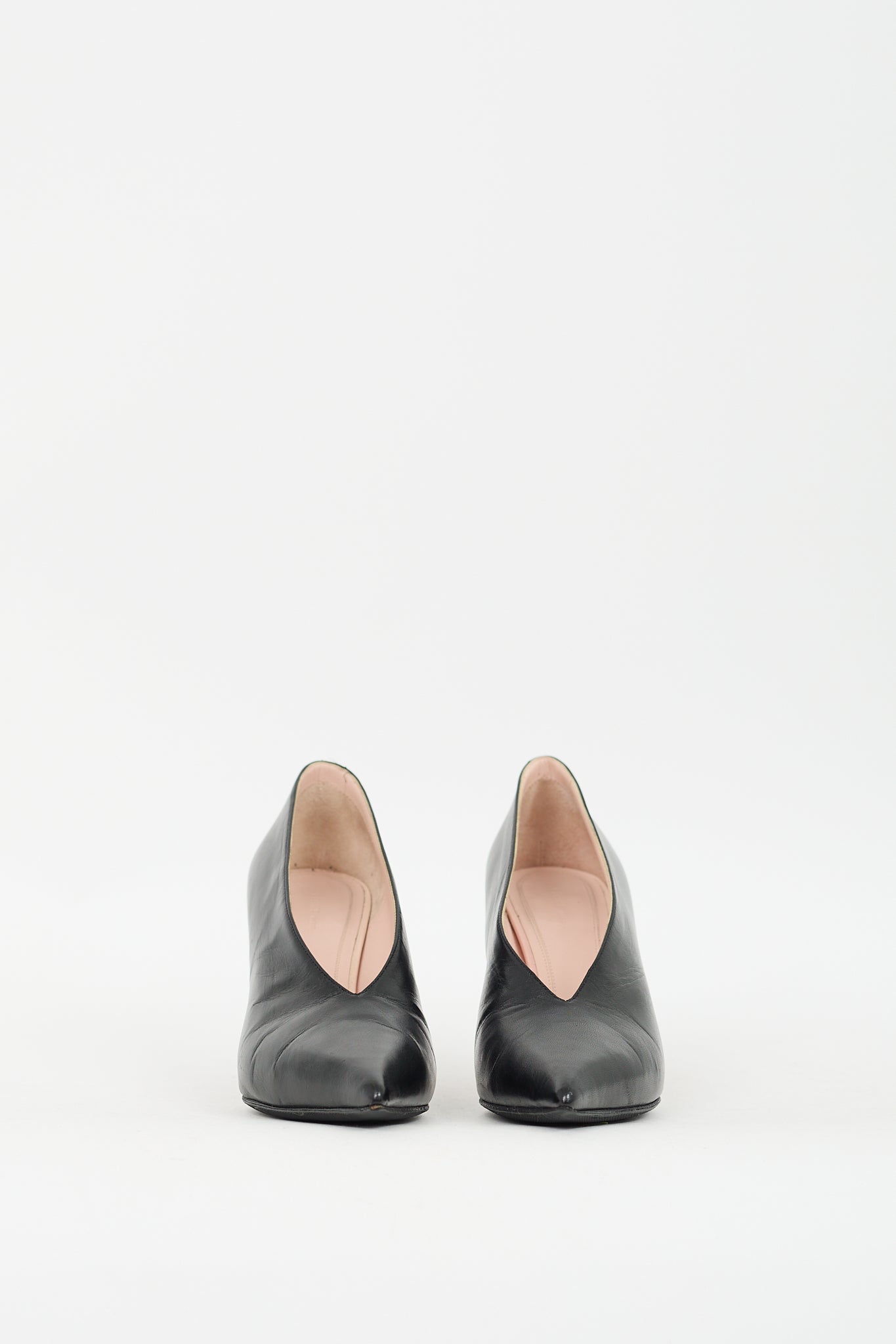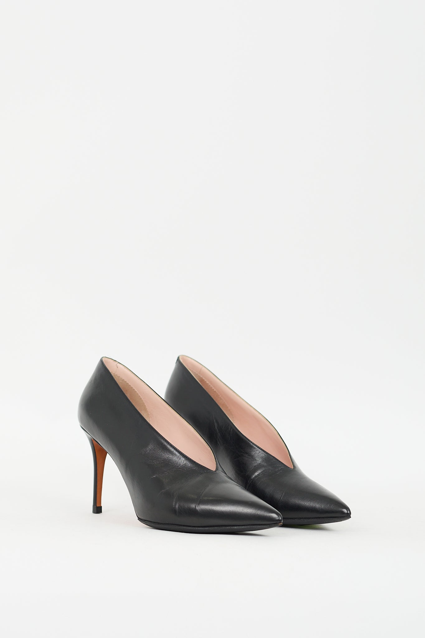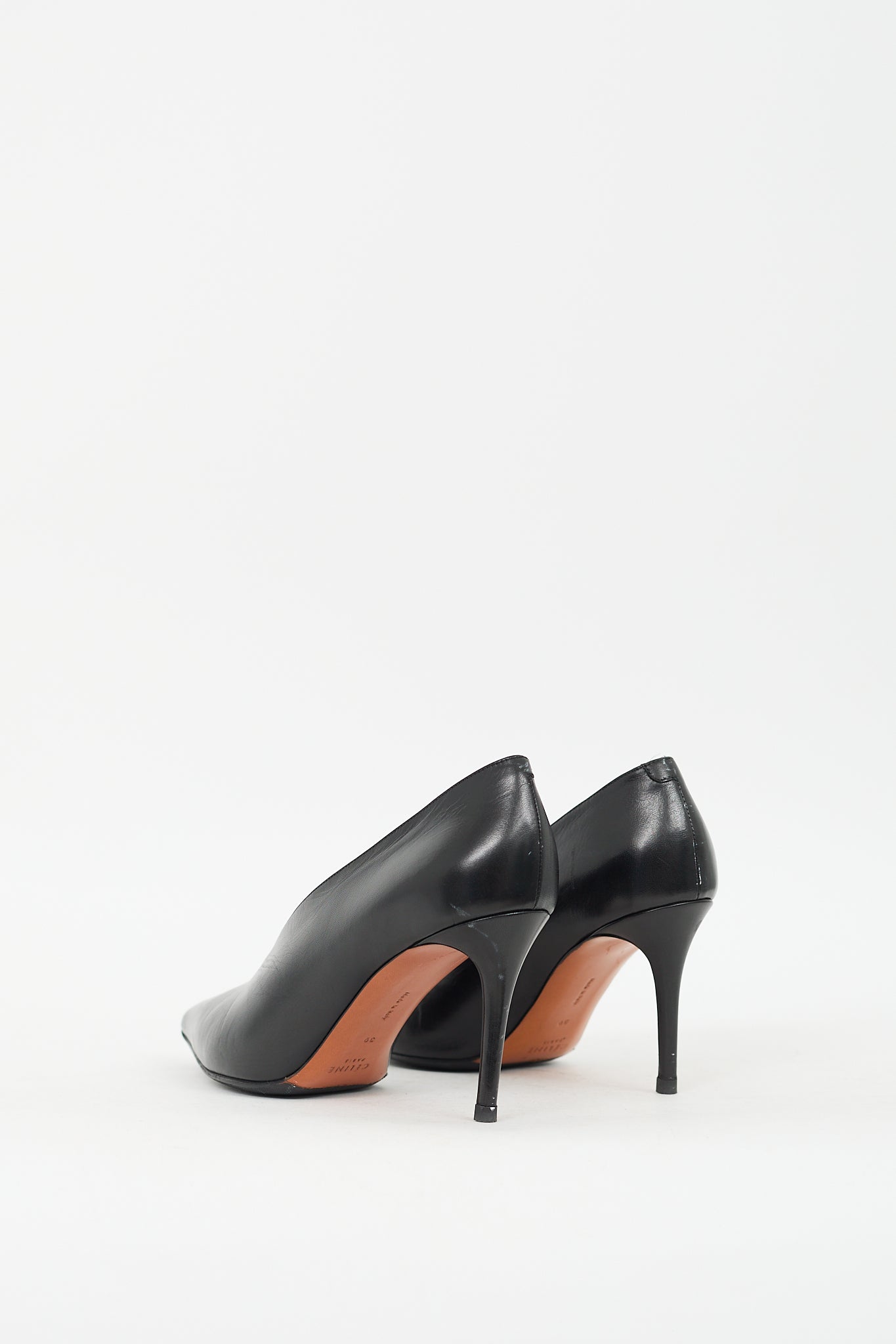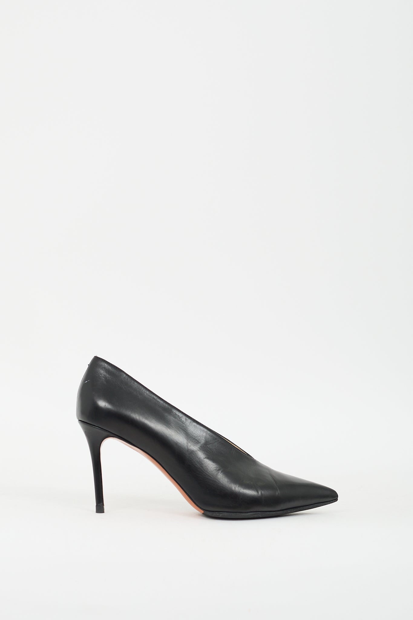 Pre-owned Celine black leather pumps featuring pointed toe, deep V-topline, covered stiletto heel, and slip on entry. Comes with original dust bag.