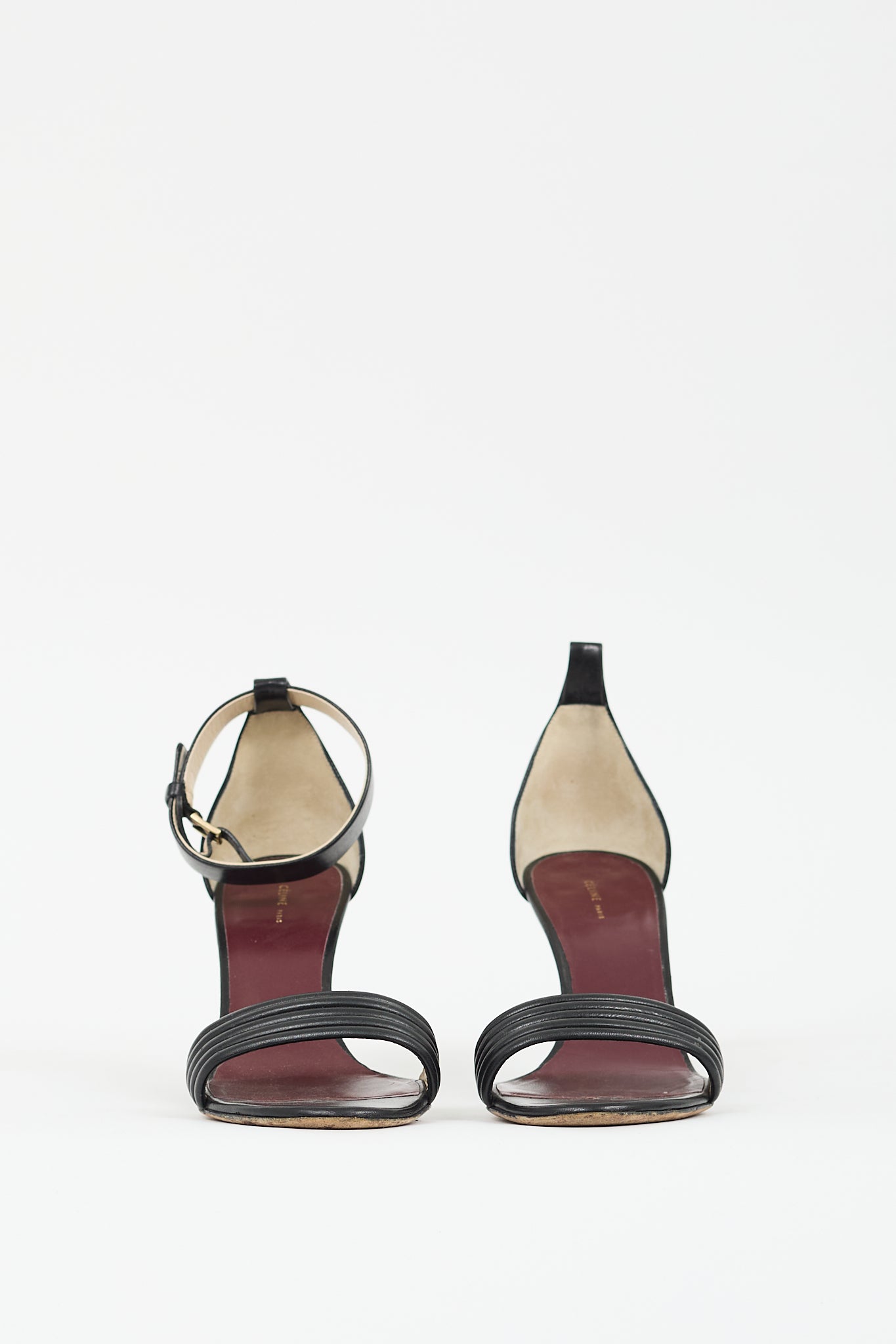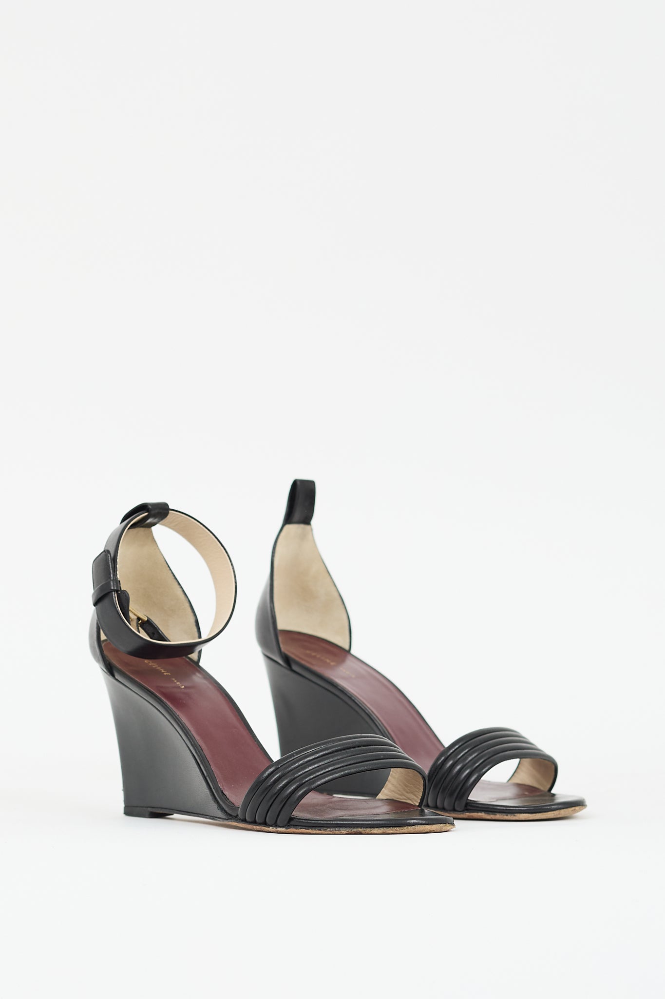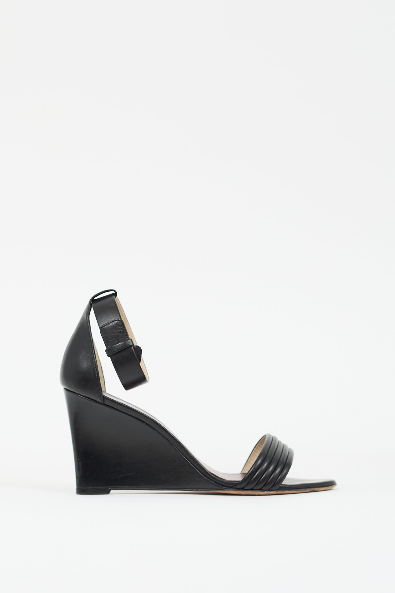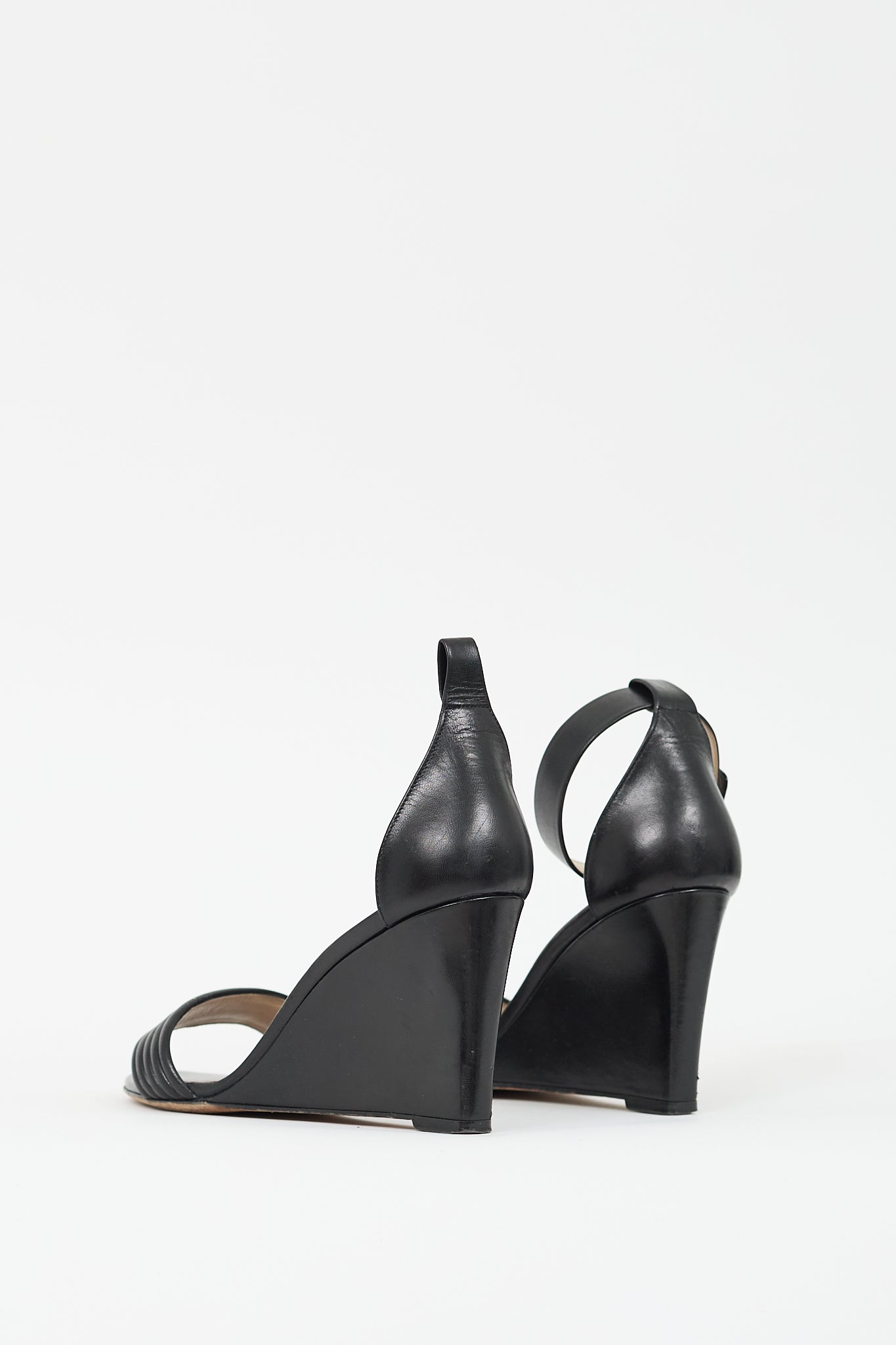 Pre-owned Celine black leather wedge sandals featuring open rounded toe, ribbed strap across vamp, closed counter, adjustable ankle strap with gold tone buckle fastening, and covered wedge platform.