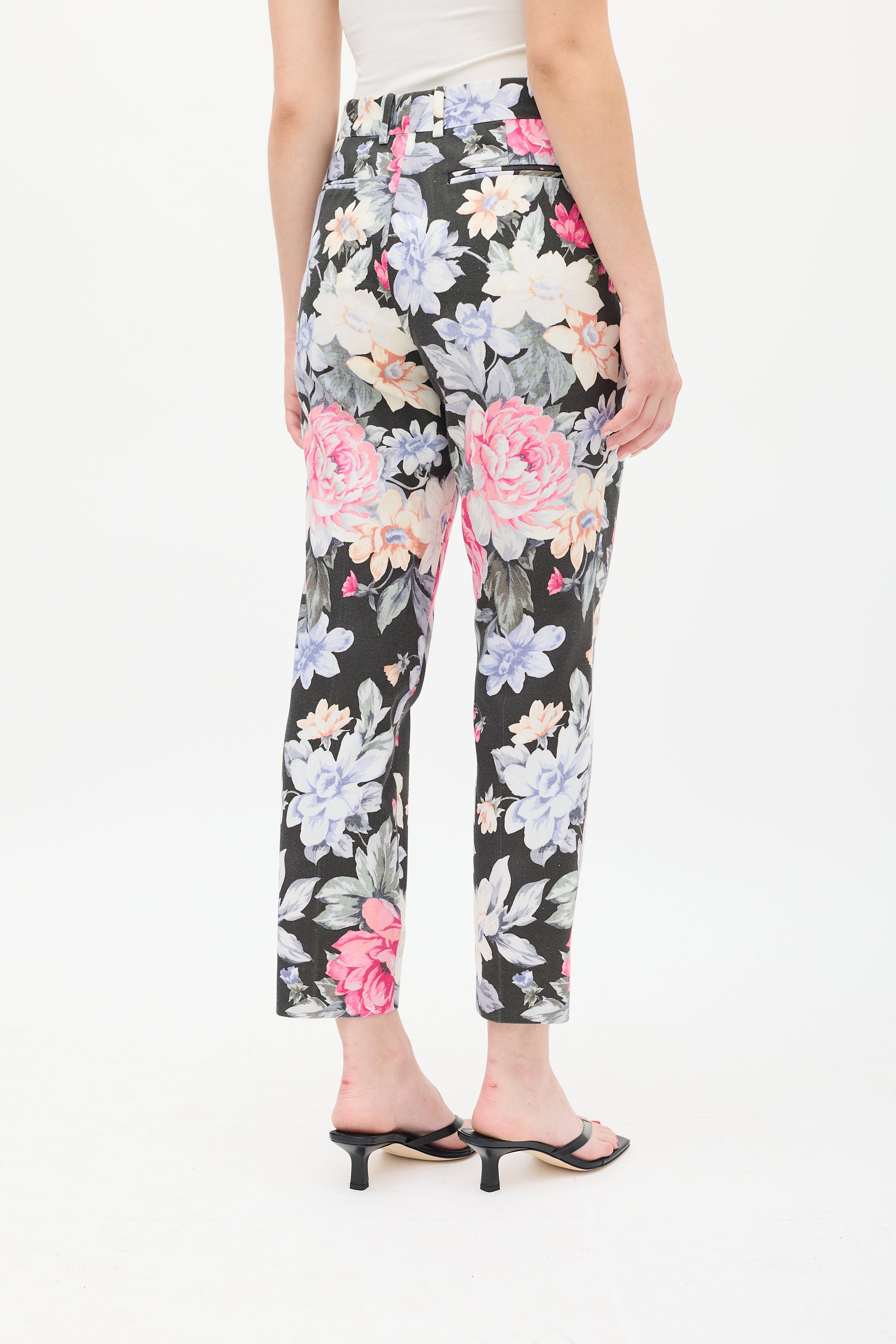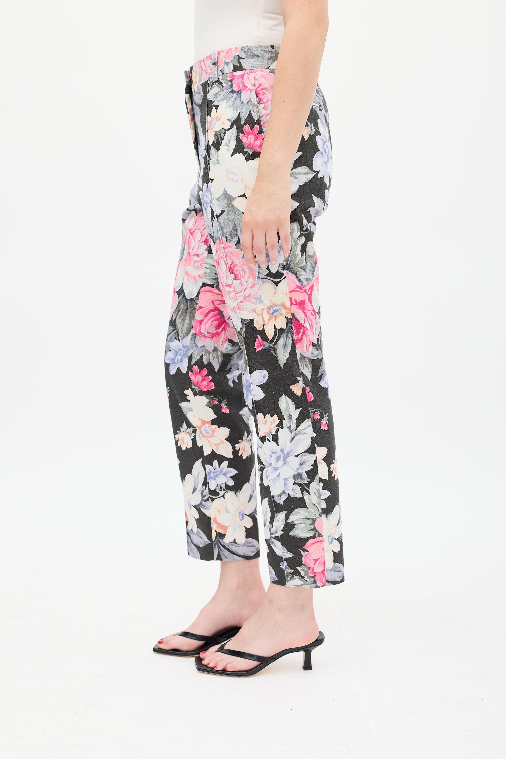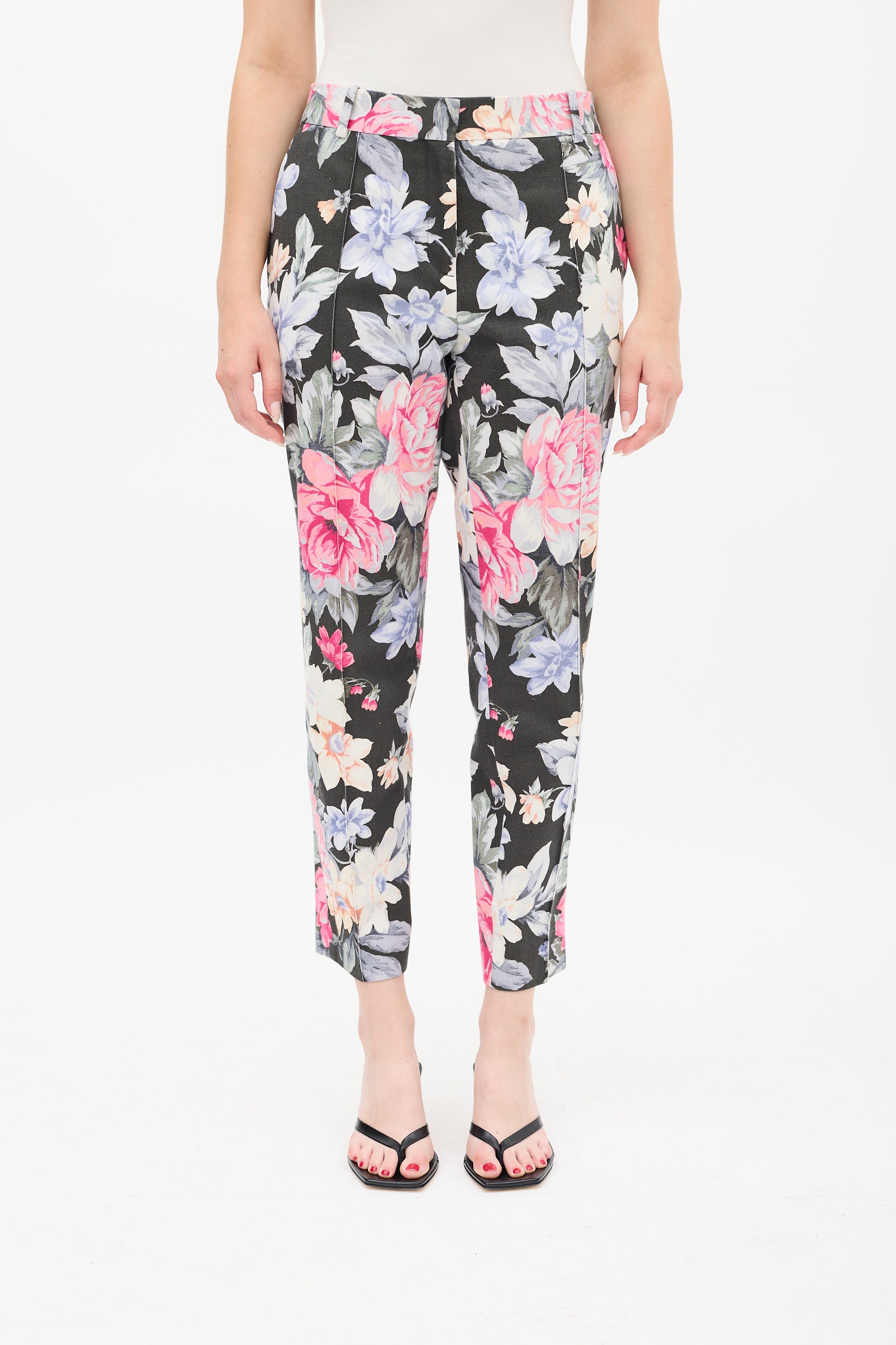 Pre-owned Celine Resort 2012 black and multicolour cotton trousers featuring a floral print throughout, dropped seat, tapered leg with front pintucks, four pocket styling, and zip fly. Phoebe Philo era design. Clipped to fit model.
