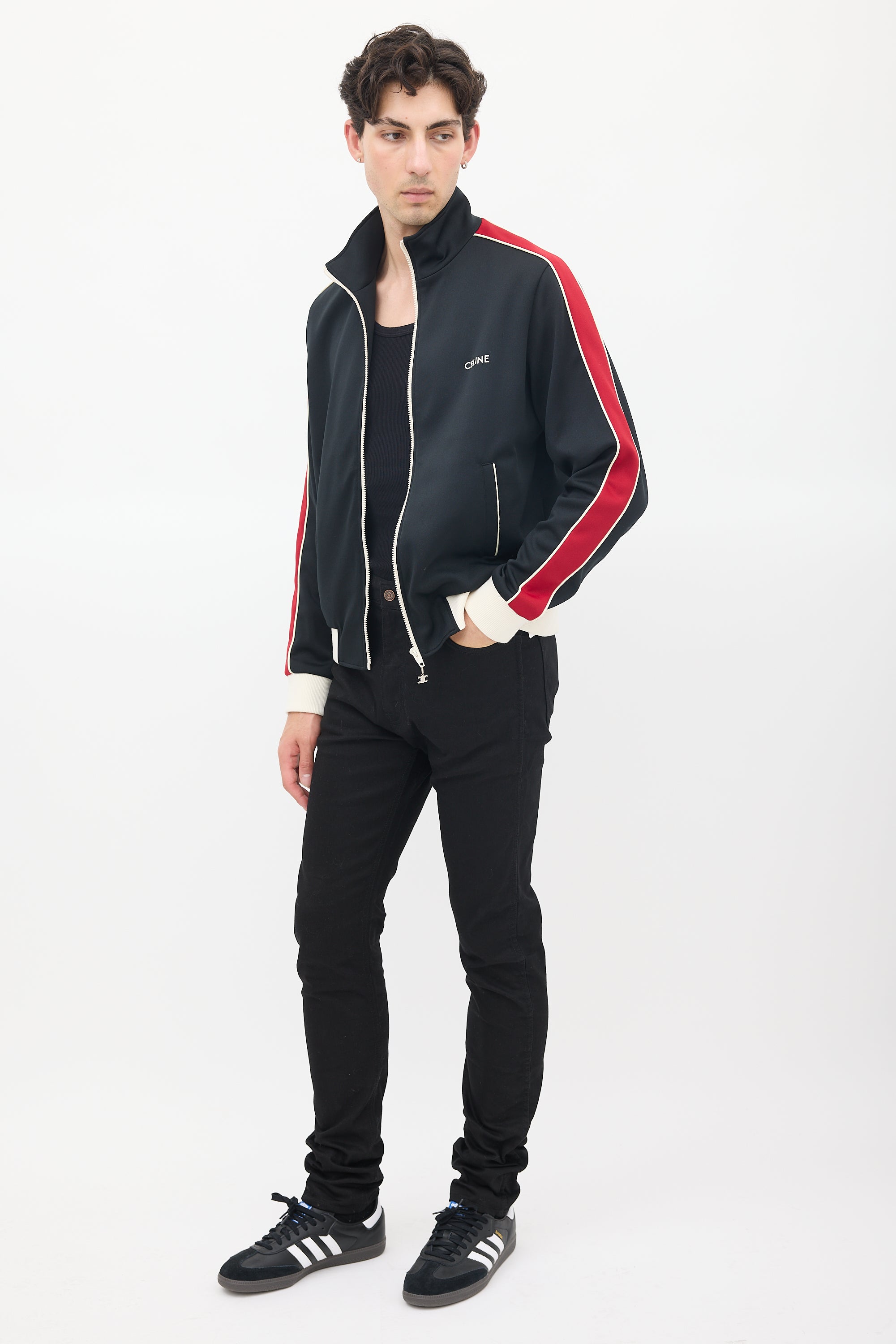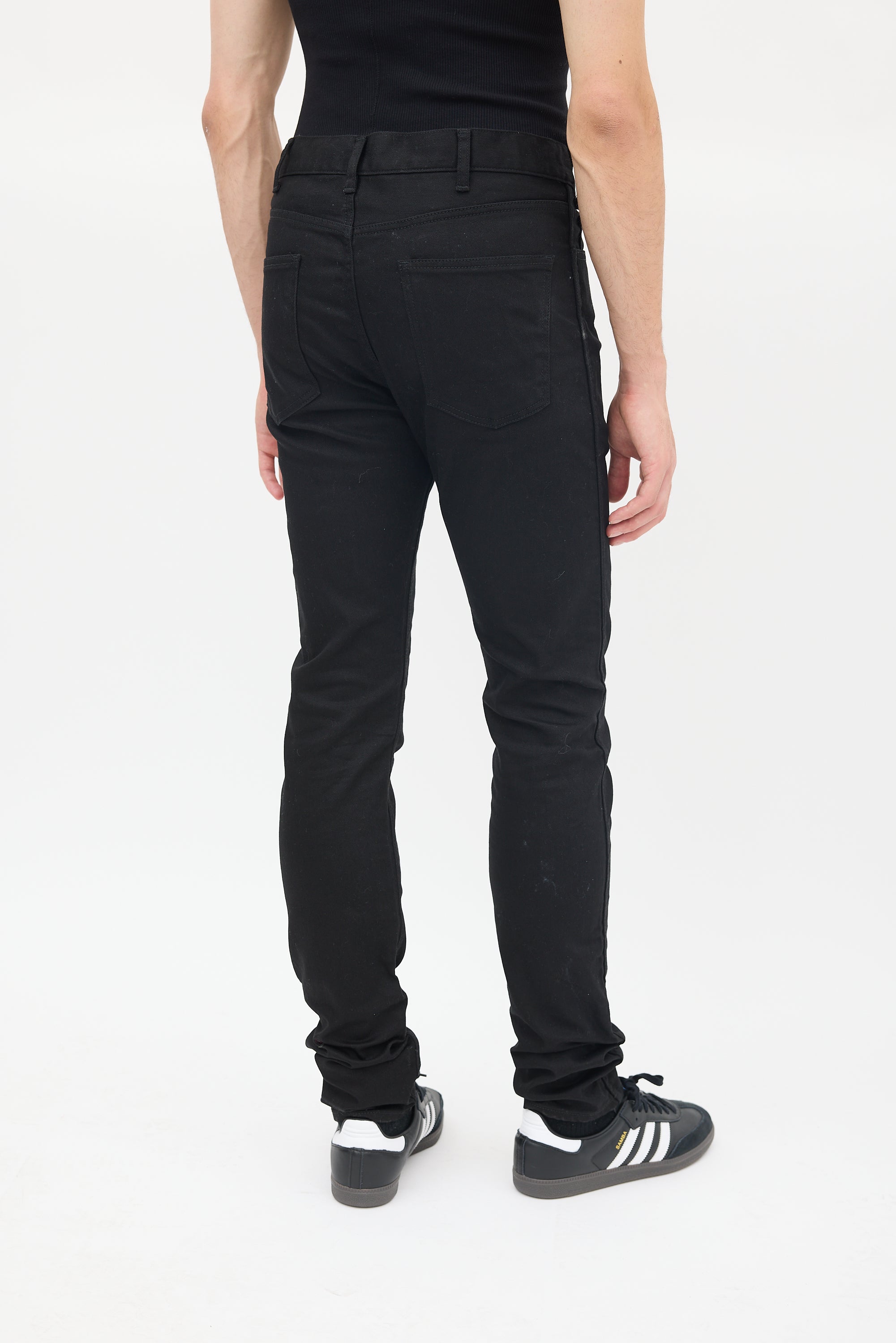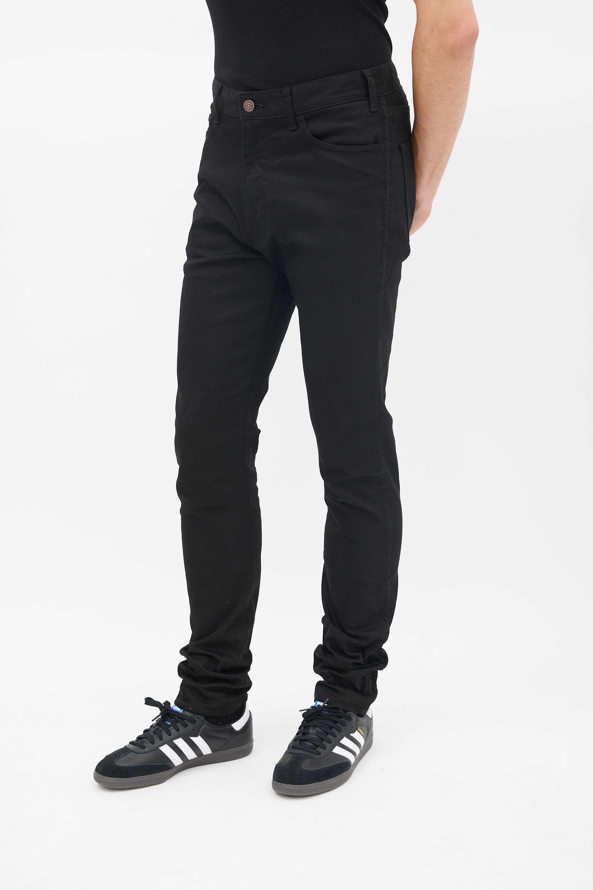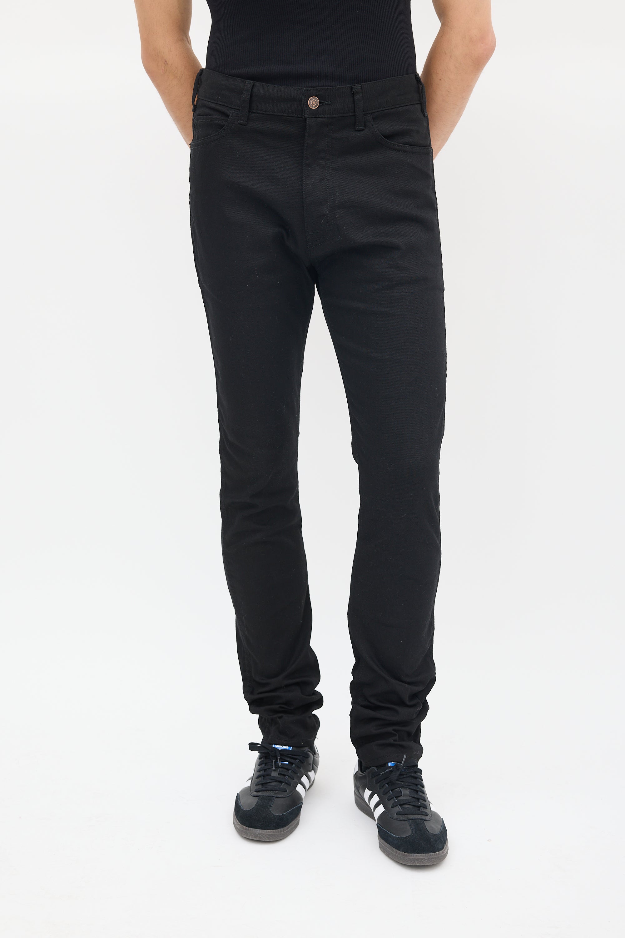 Pre-owned Celine black jeans featuring a regular waist, dropped seat, slim leg, five pocket styling, and zip fly.