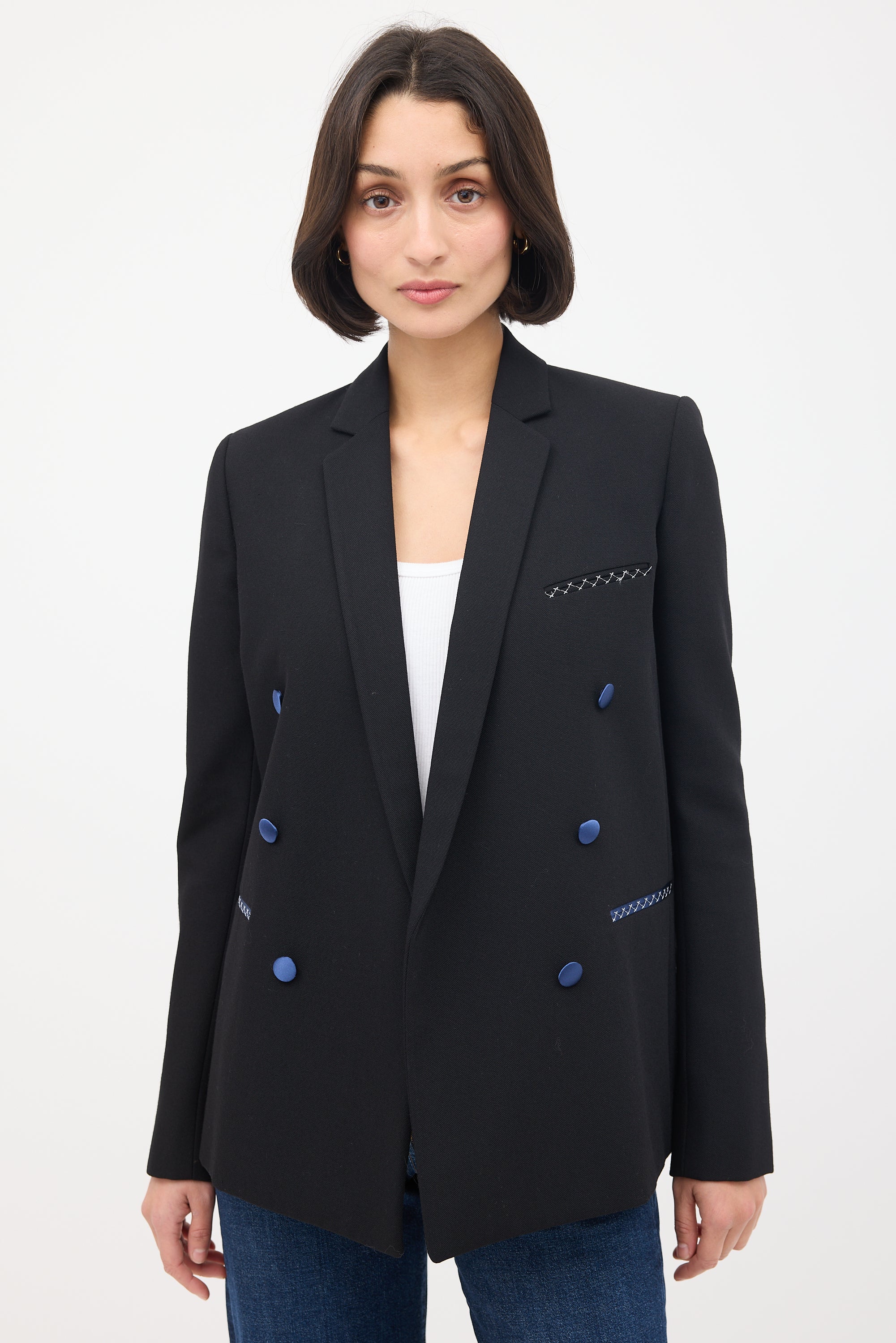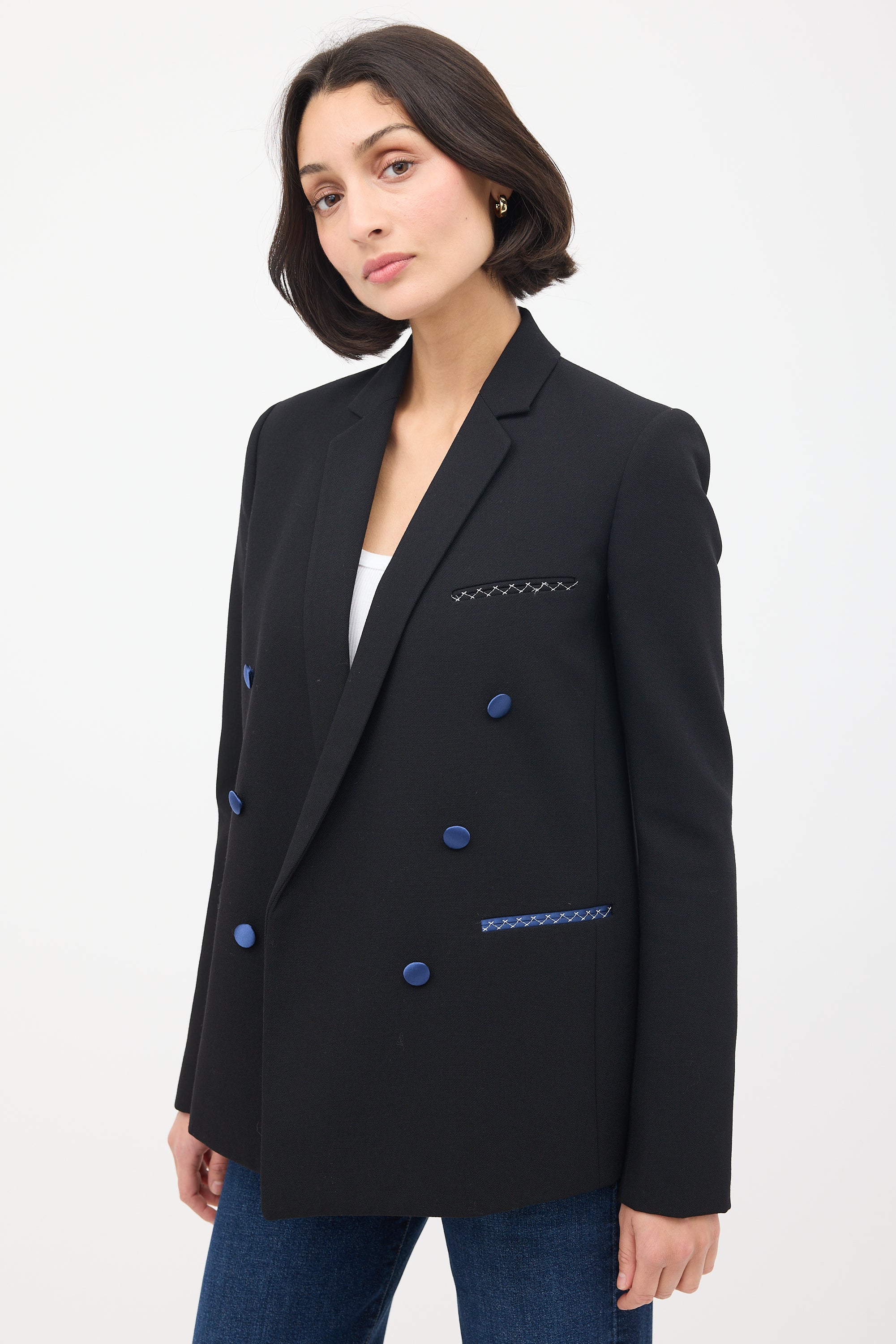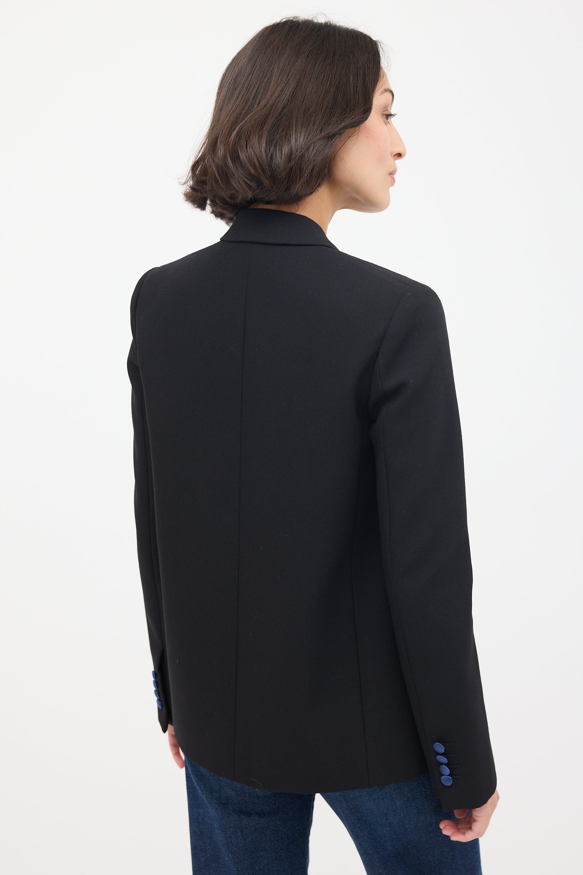 Pre-owned Celine black wool blazer featuring a notched collar, open front with decorative double breasted blue silk covered buttons, slip pocket at left chest, two welt pockets with blue silk trim at front hip, buttoned welt pocket at interior left chest, shoulder padding, and long sleeves with covered buttons at cuff. Lined.