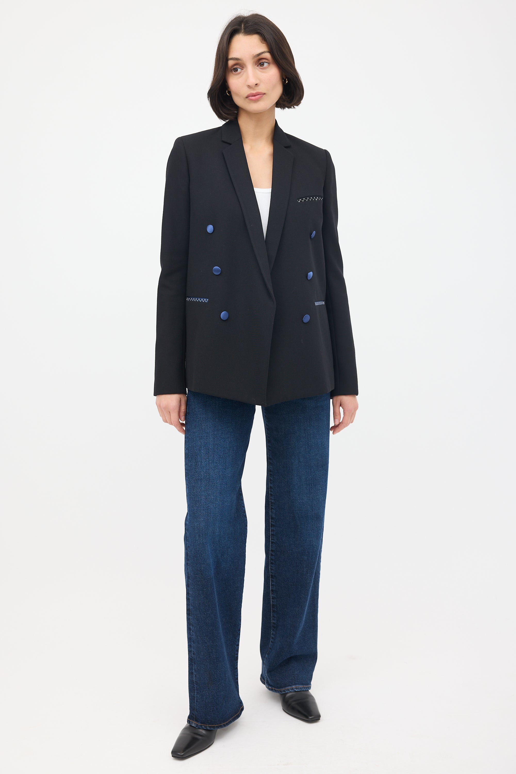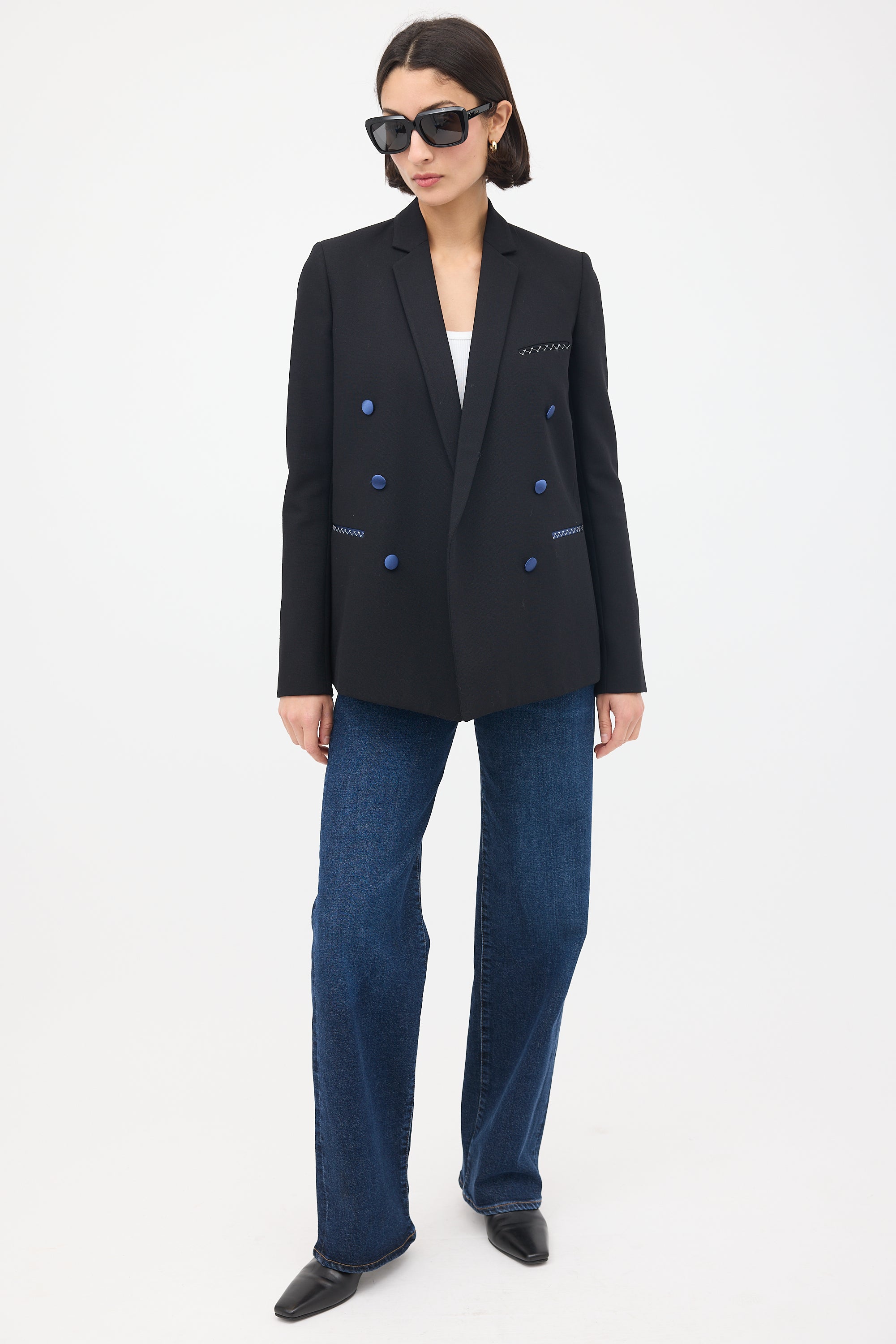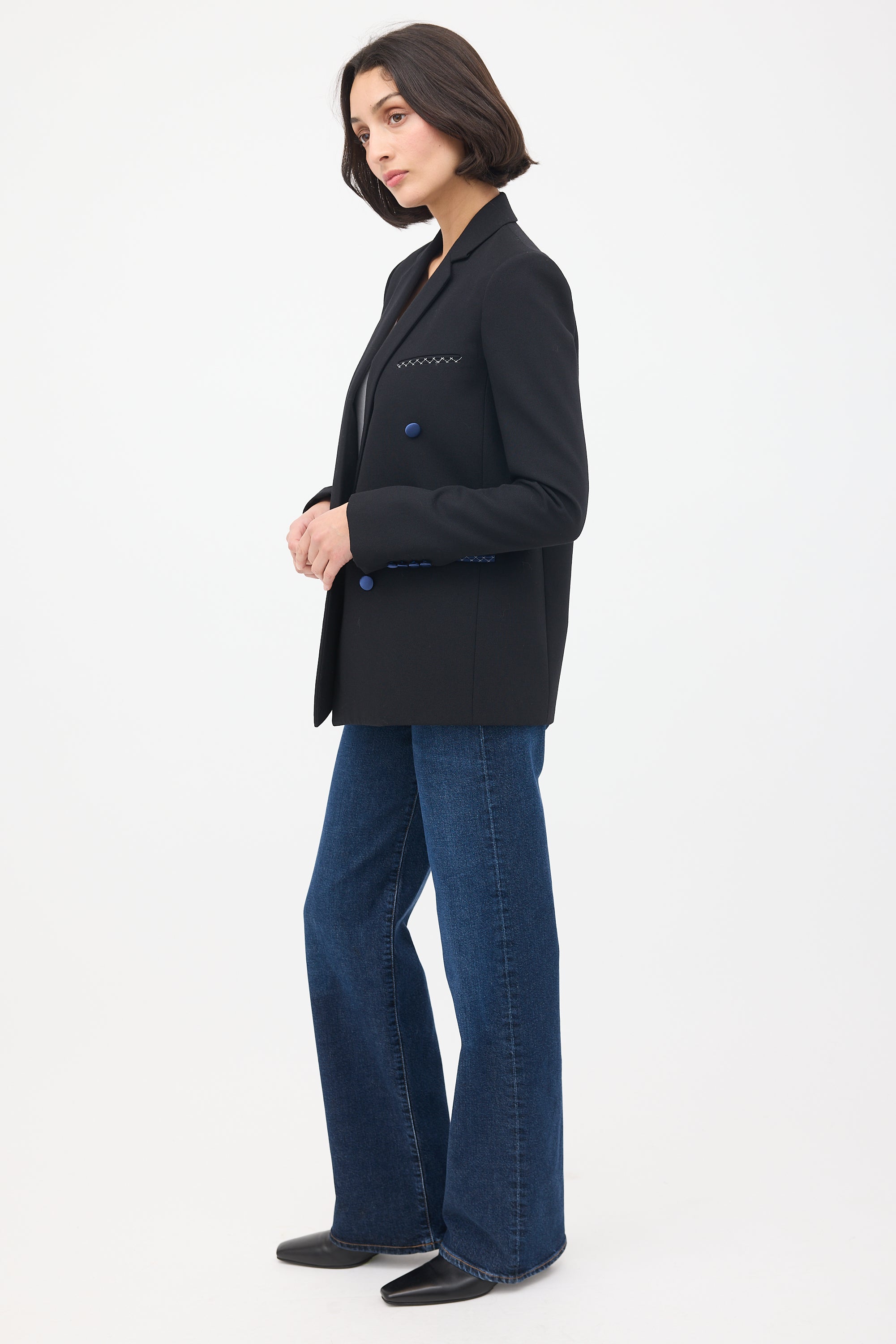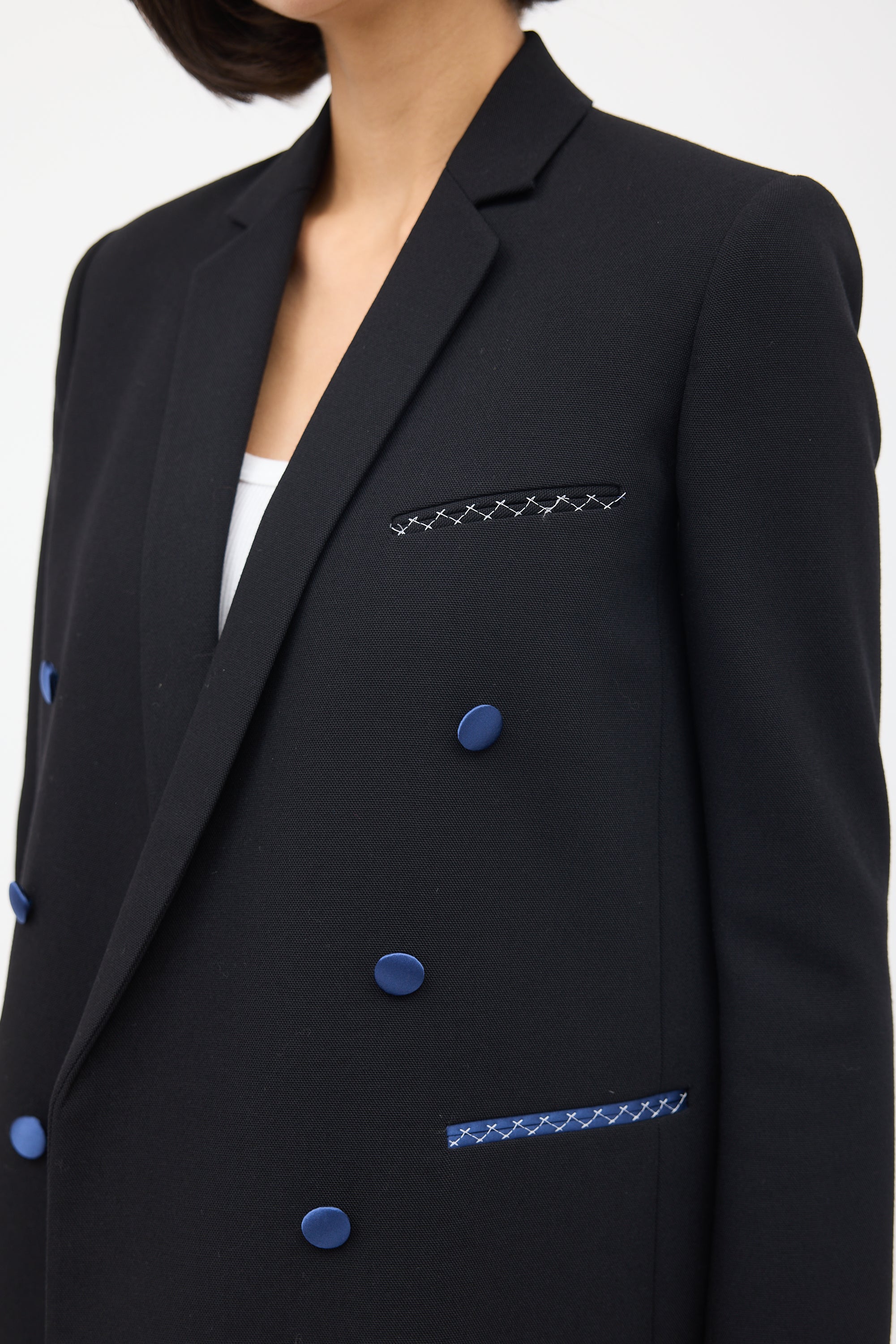 Pre-owned Celine black wool blazer featuring a notched collar, open front with decorative double breasted blue silk covered buttons, slip pocket at left chest, two welt pockets with blue silk trim at front hip, buttoned welt pocket at interior left chest, shoulder padding, and long sleeves with covered buttons at cuff. Lined.