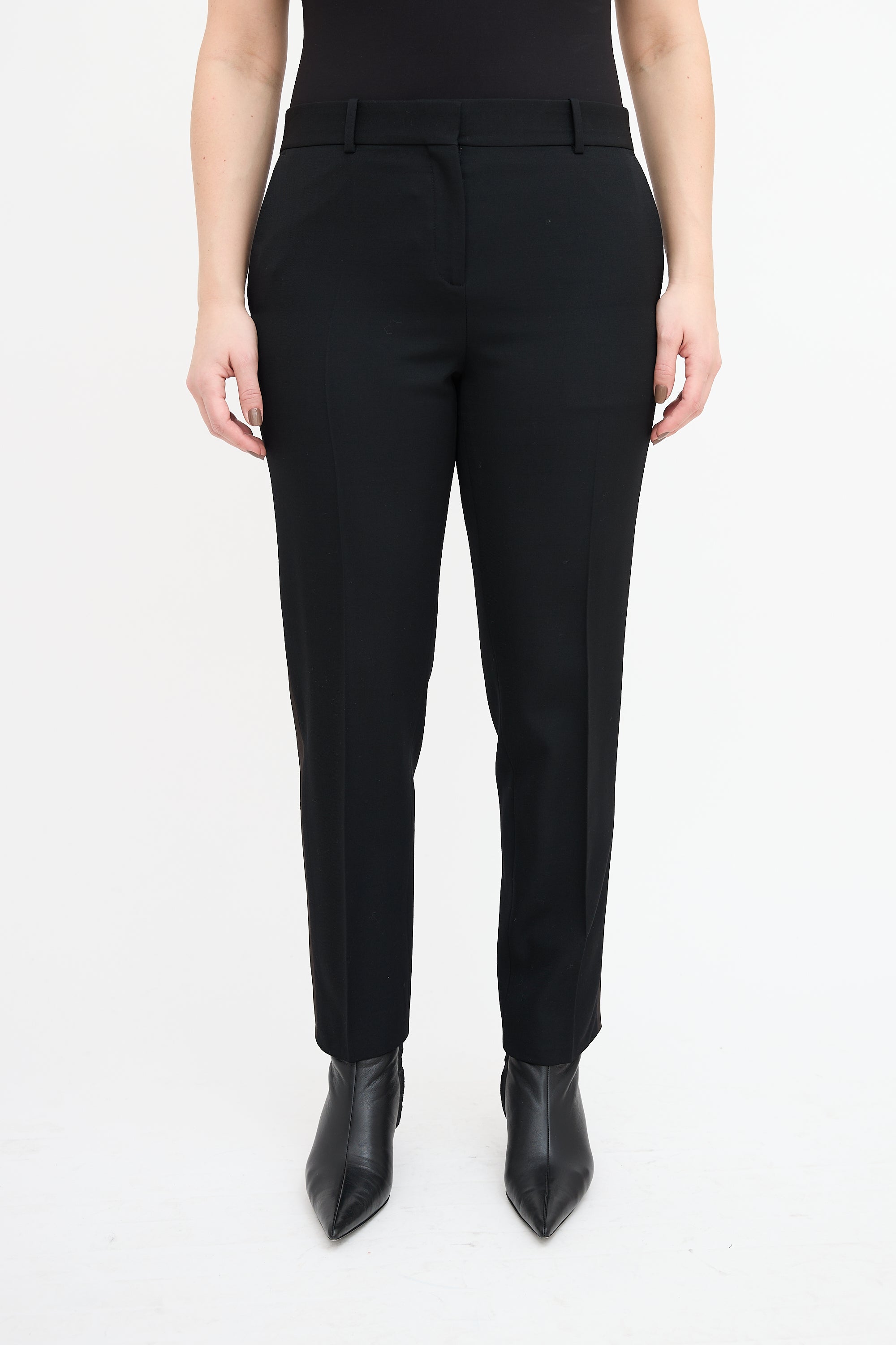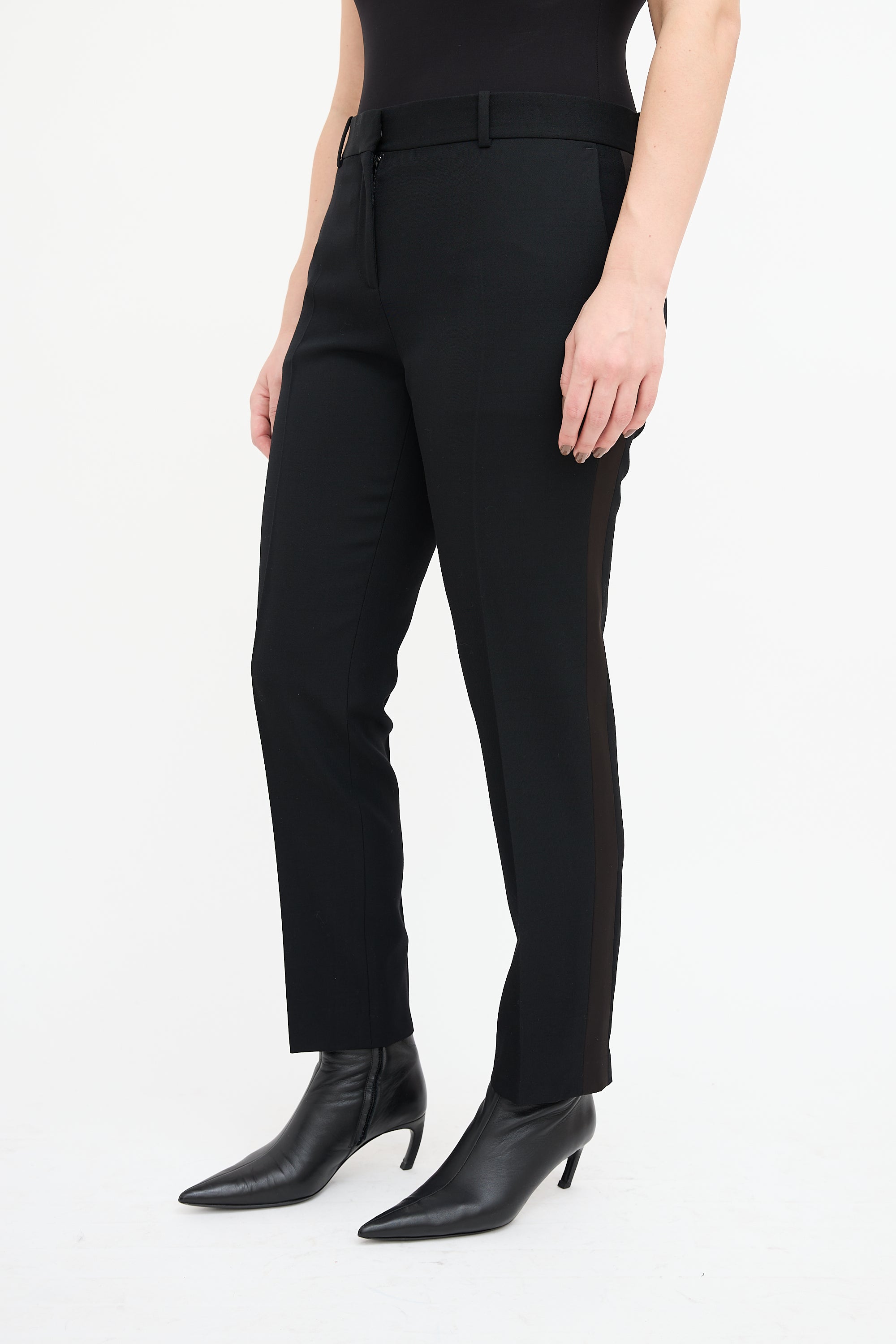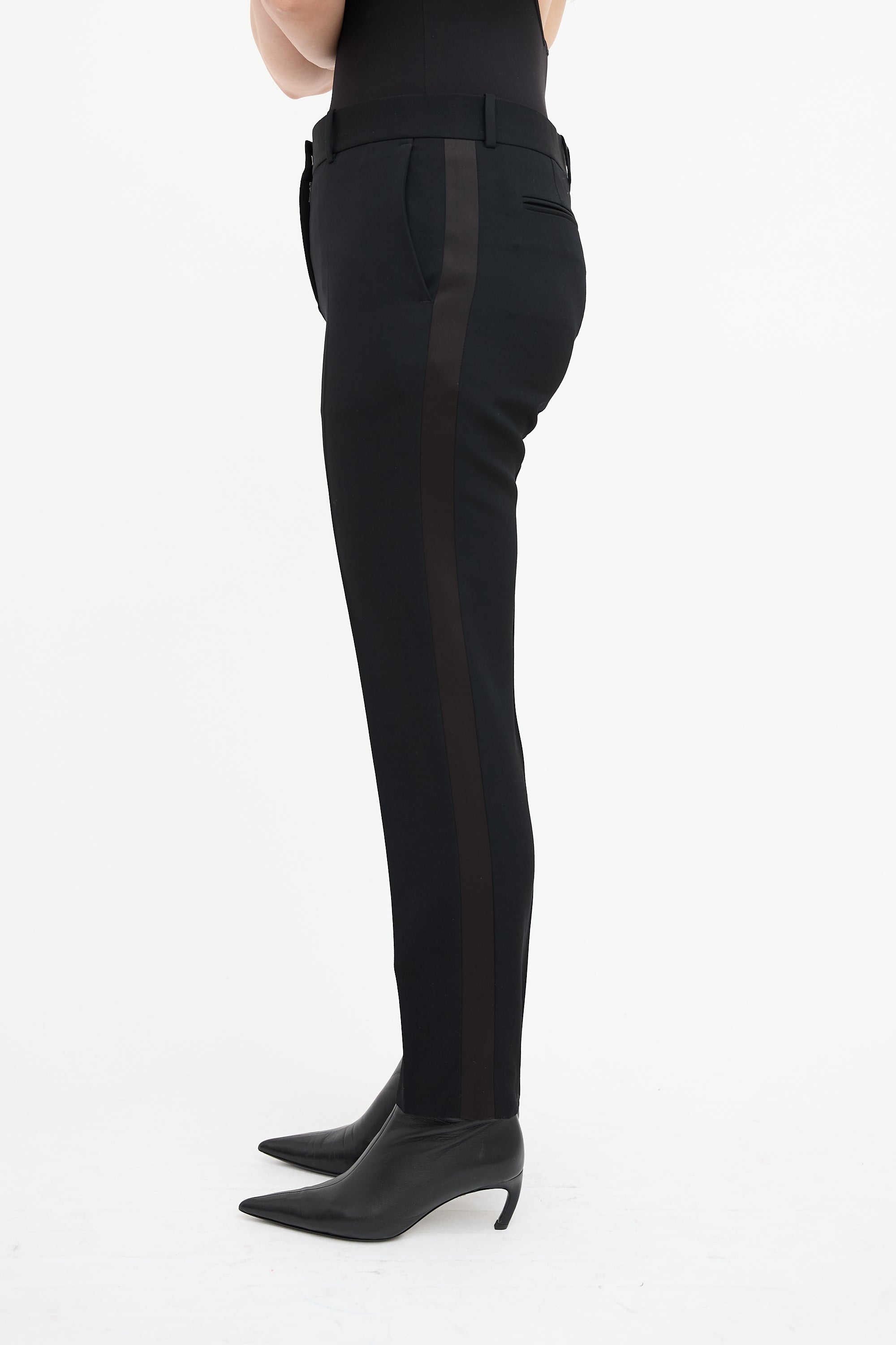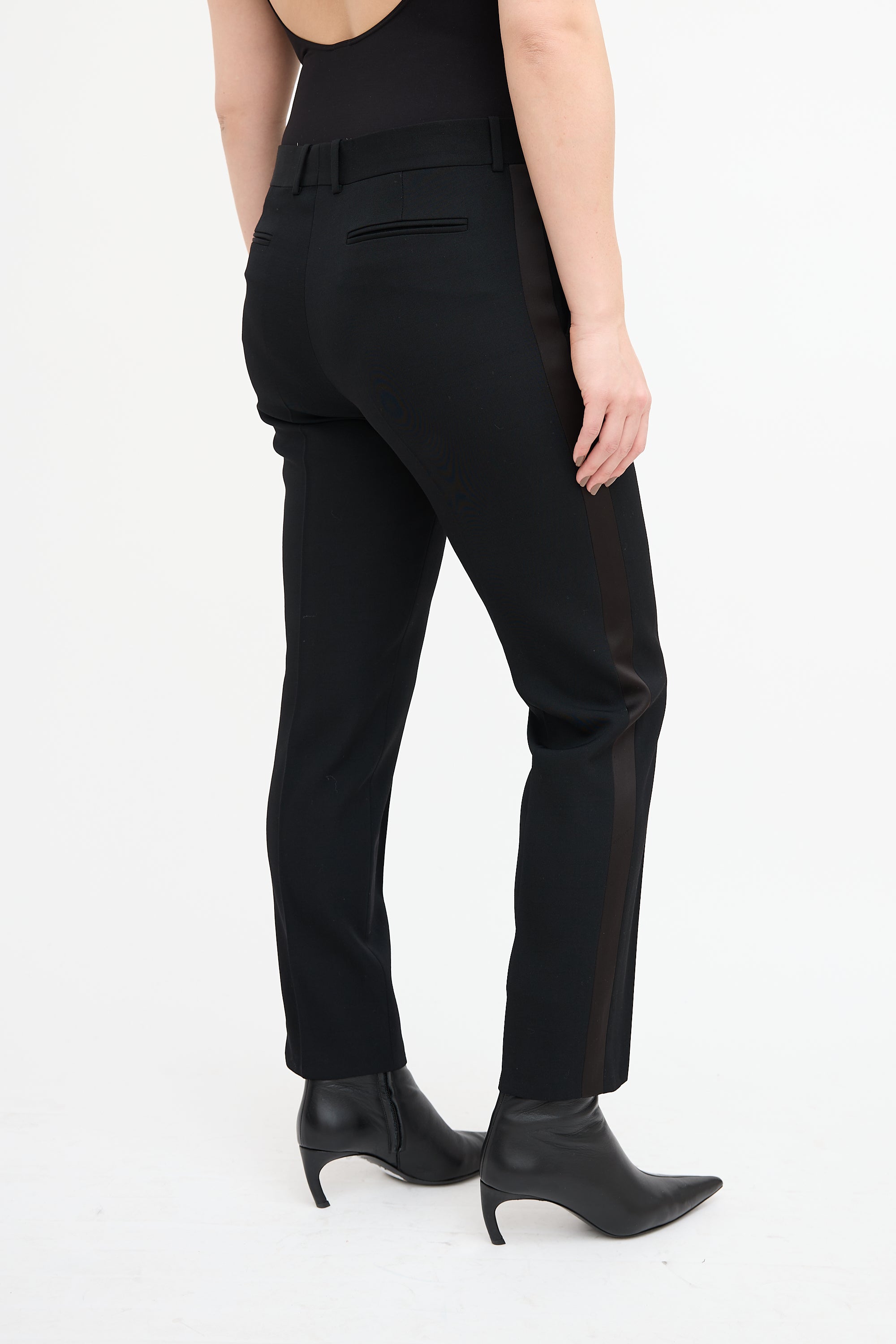 Pre-owned Celine black wool tuxedo trousers featuring a tapered leg with creases, satin side stripes, four pocket styling, and zip fly.