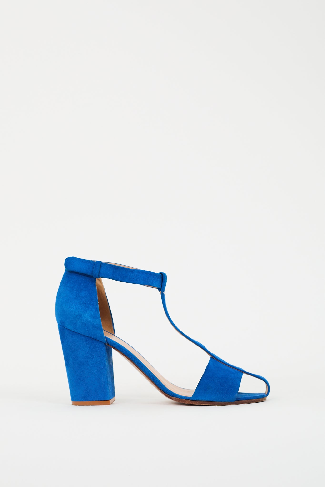Pre-owned Celine blue suede heels featuring caged square toe, strap at vamp and front, adjustable ankle strap, and covered block heel. Comes with original dust bag.