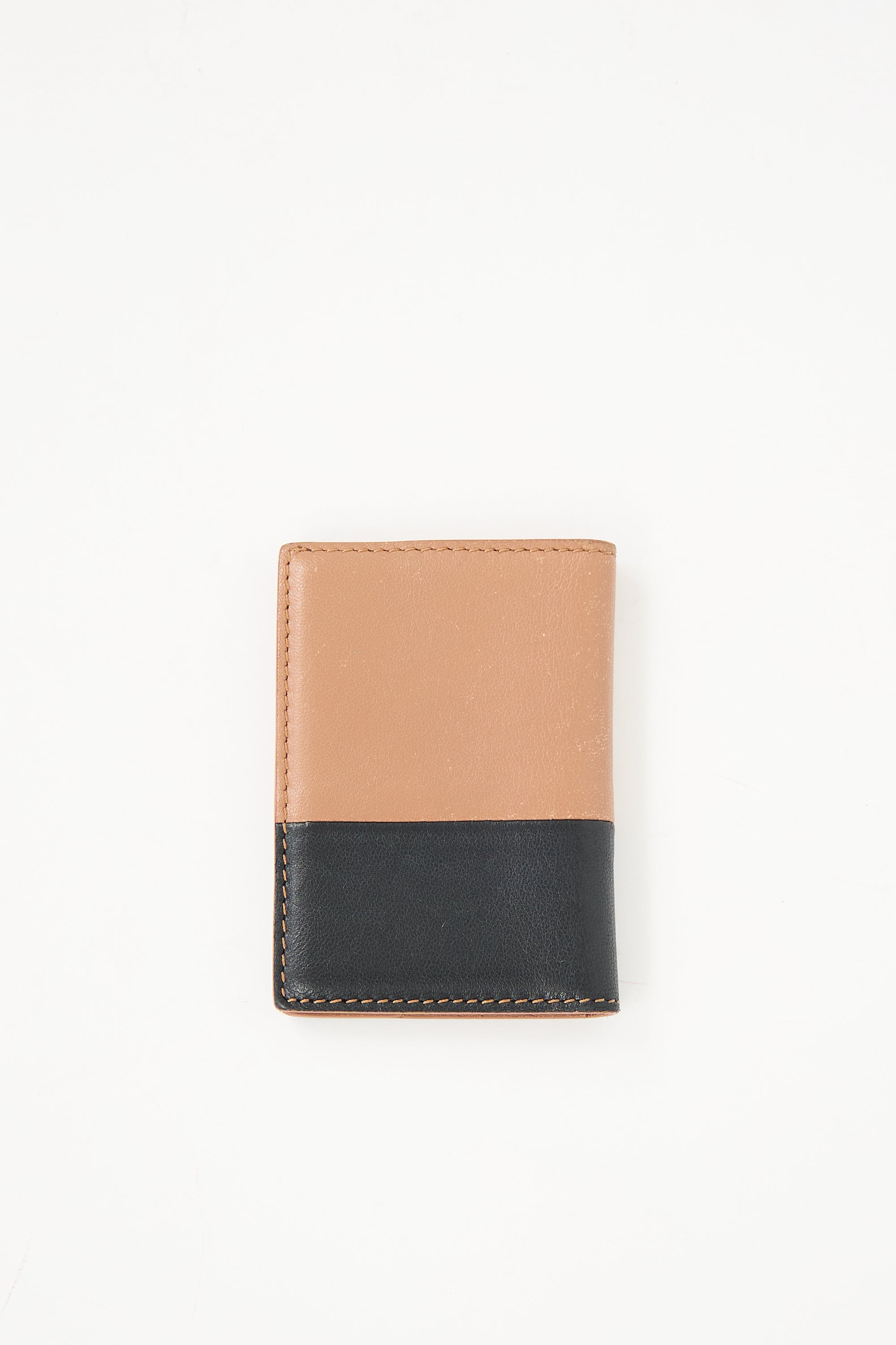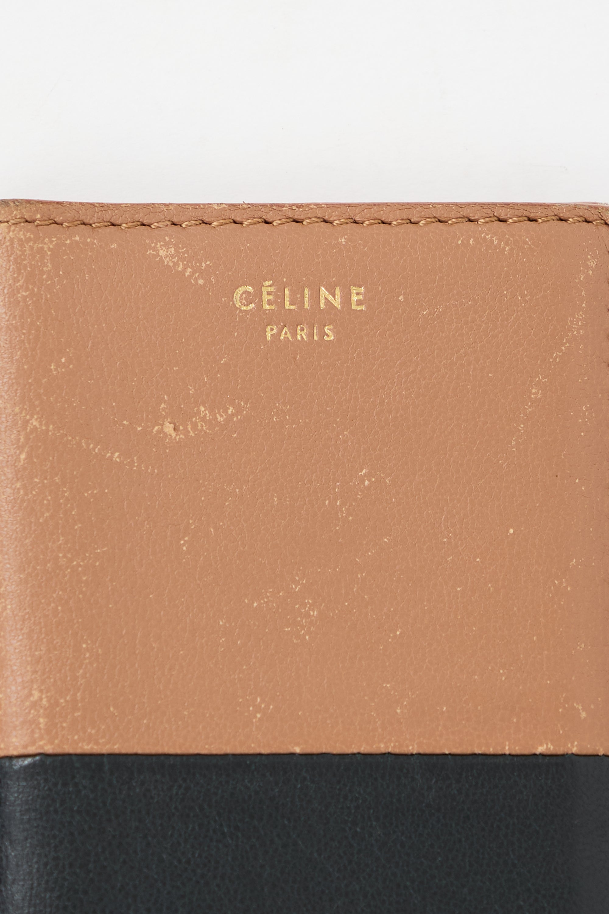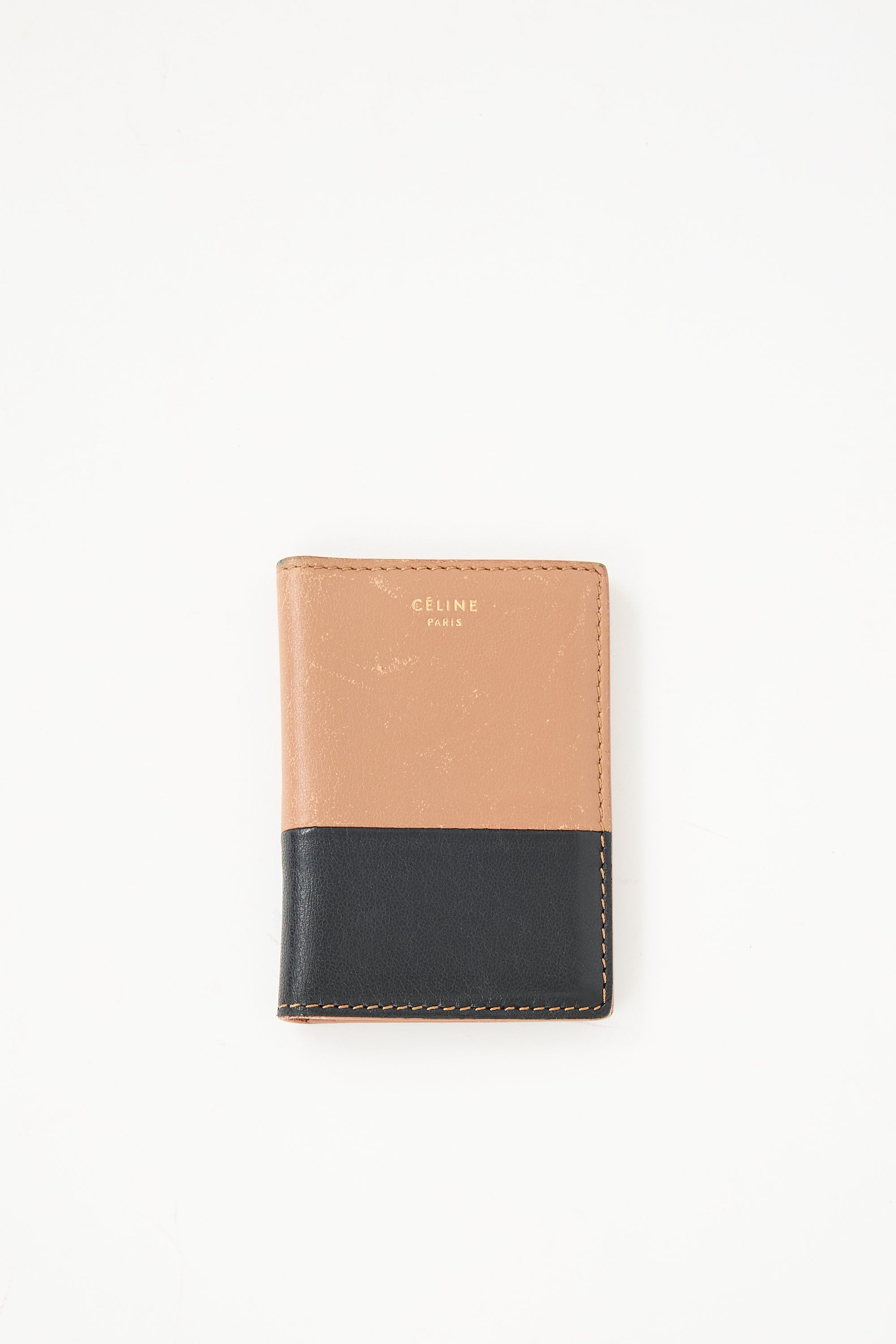 Pre-owned Celine brown and black leather card holder featuring a gold stamped logo at front and four slip pockets at interior. Includes original box and dust bag.
