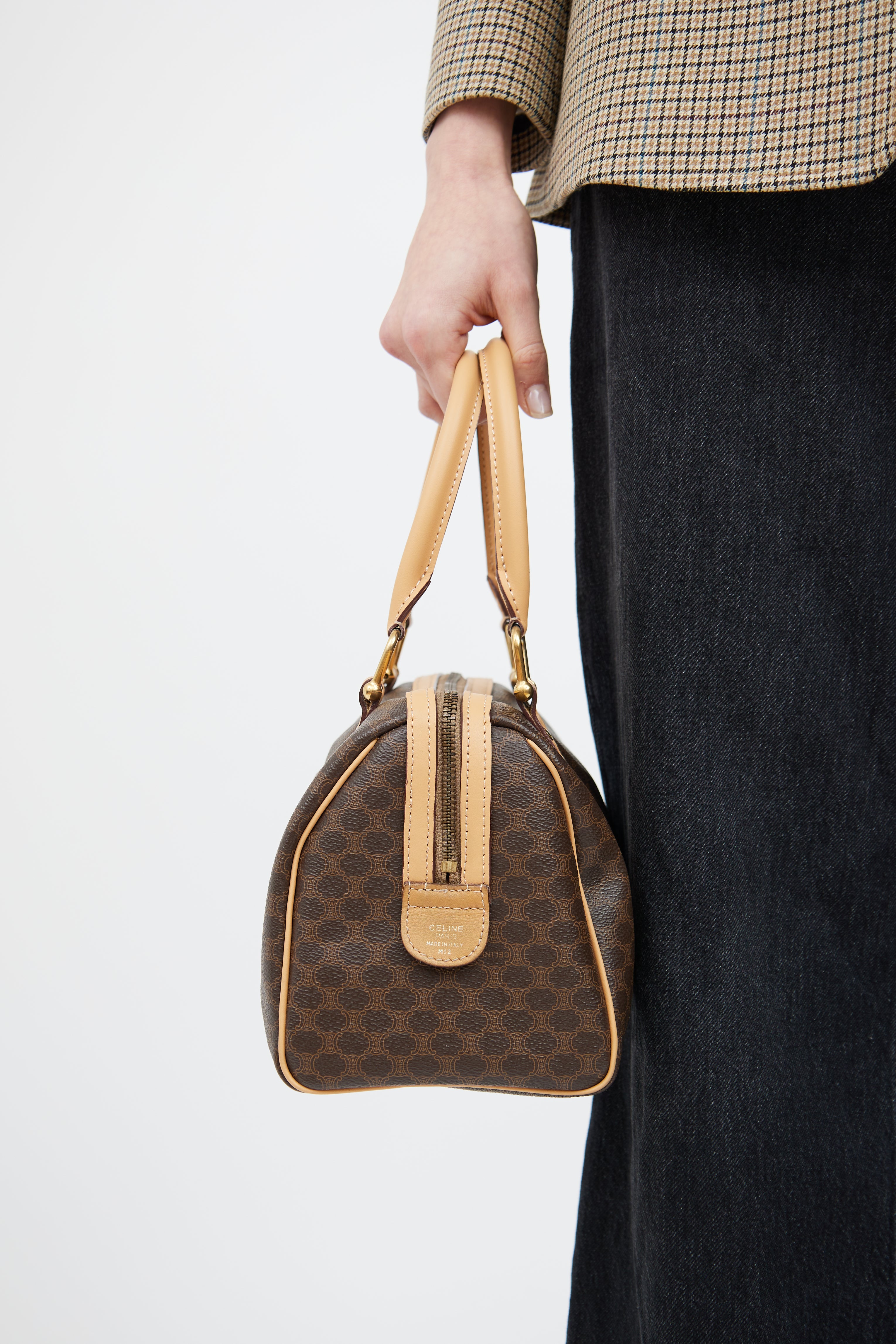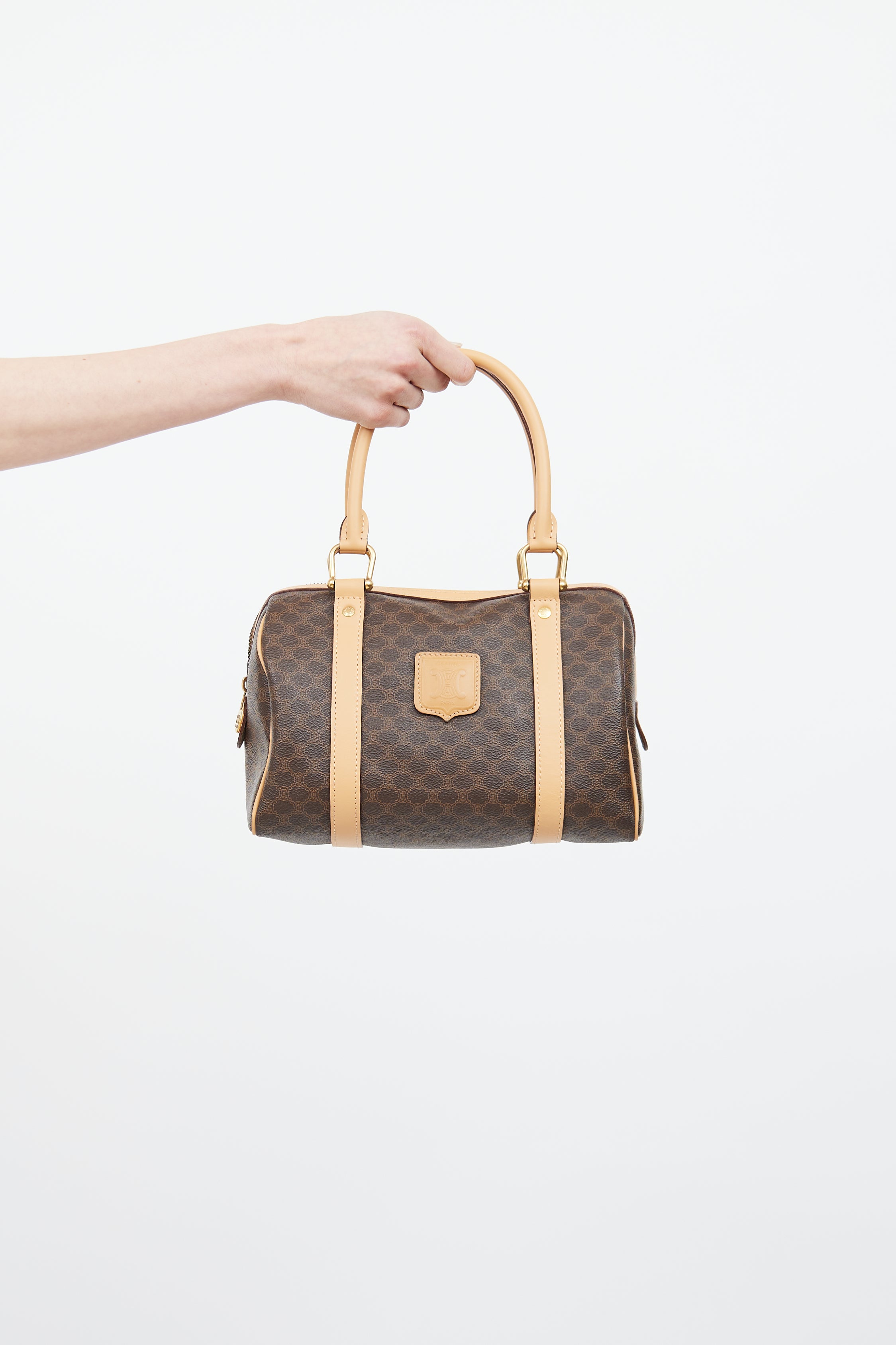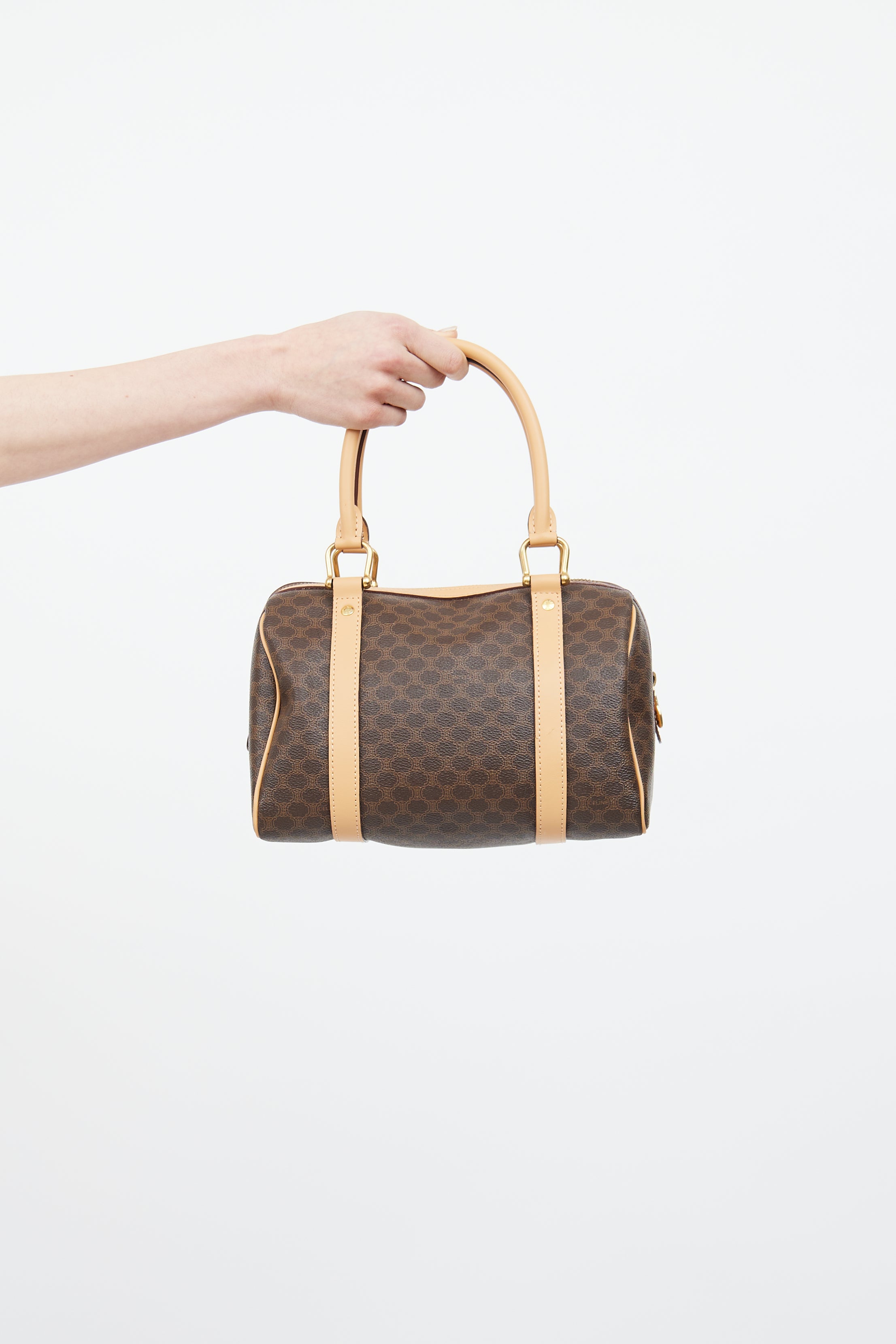 Pre-owned Celine brown Macadam Boston bag in triomphe monogram coated canvas, two rolled top handles, debossed leather logo tab at front, one main compartment with one zip pocket, and top zip closure.