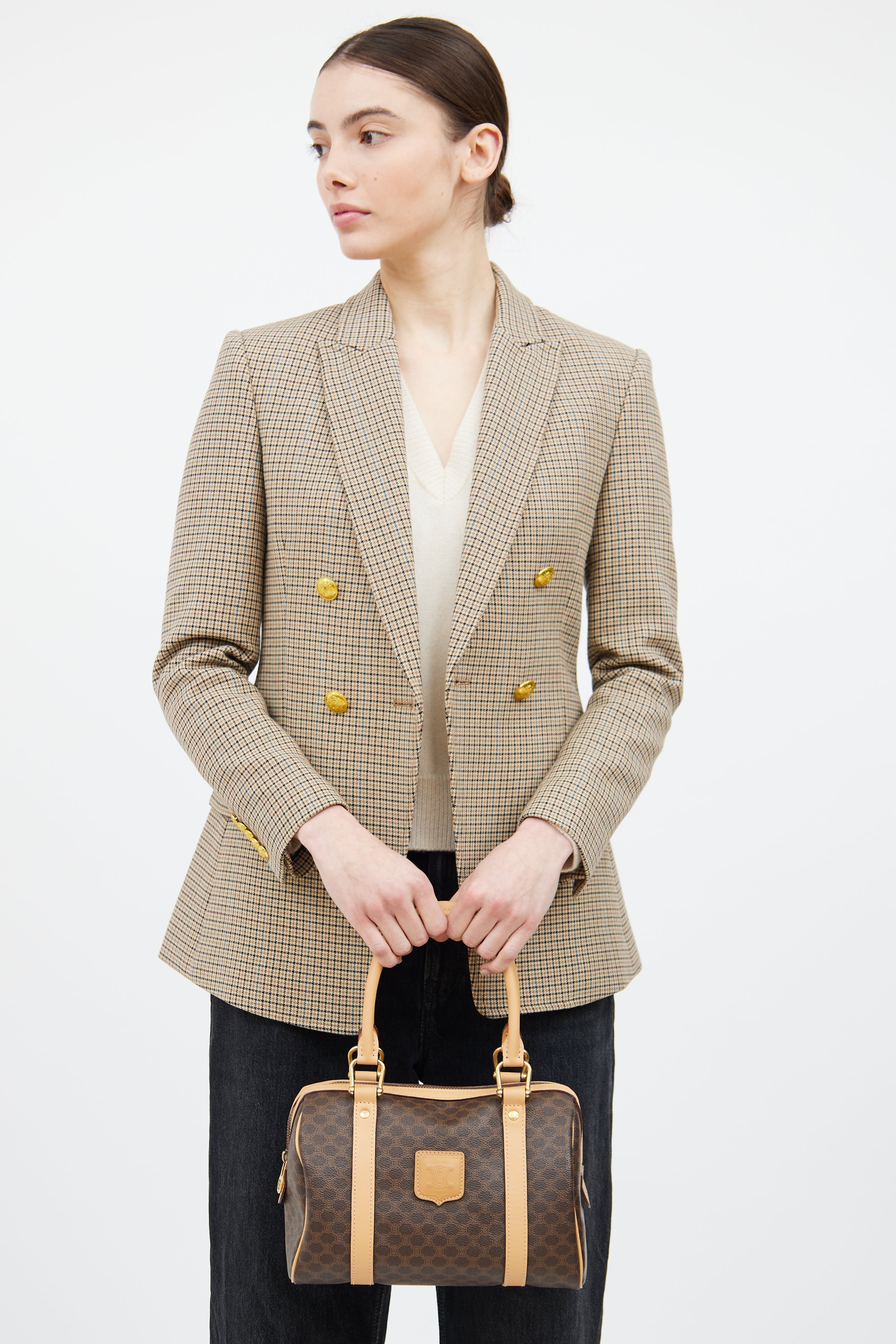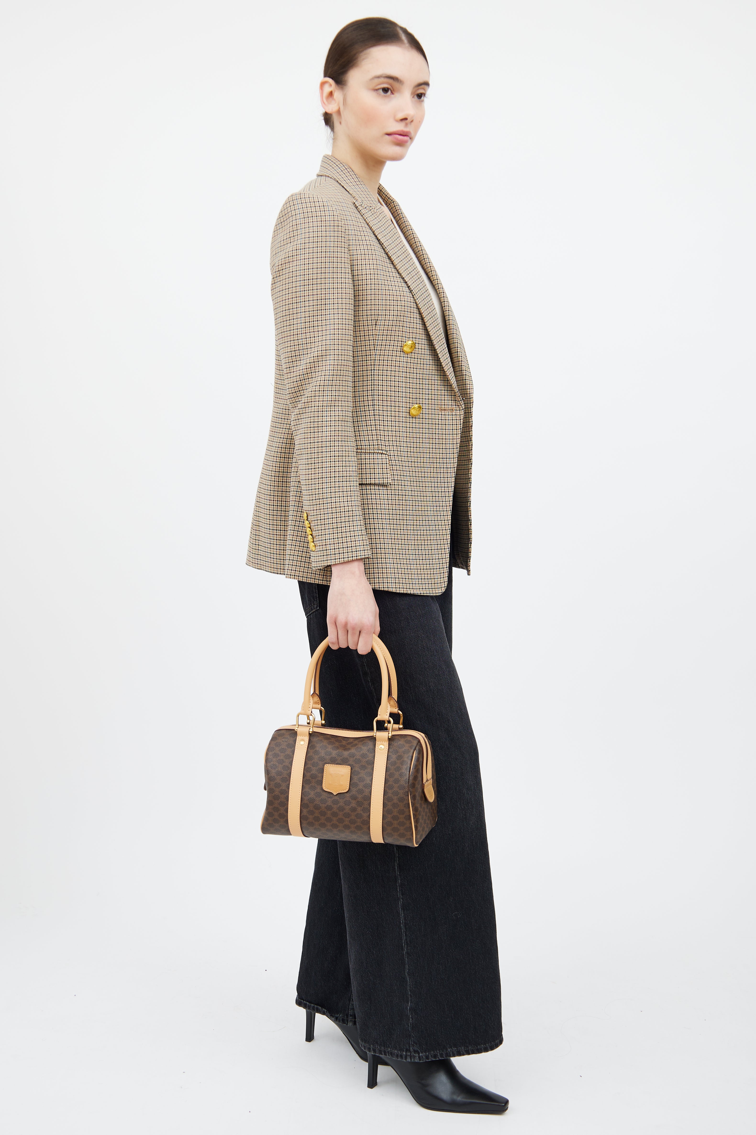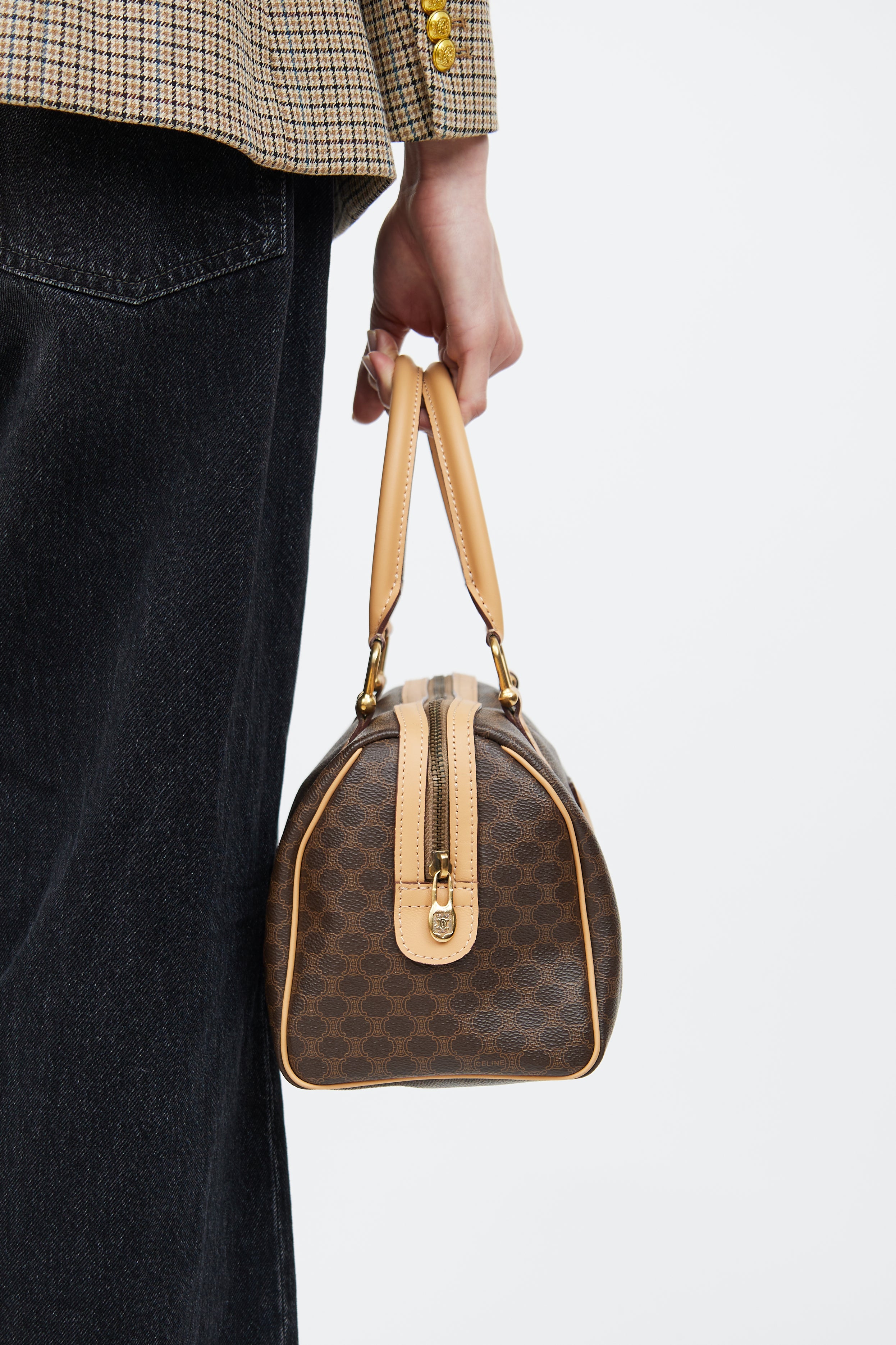 Pre-owned Celine brown Macadam Boston bag in triomphe monogram coated canvas, two rolled top handles, debossed leather logo tab at front, one main compartment with one zip pocket, and top zip closure.