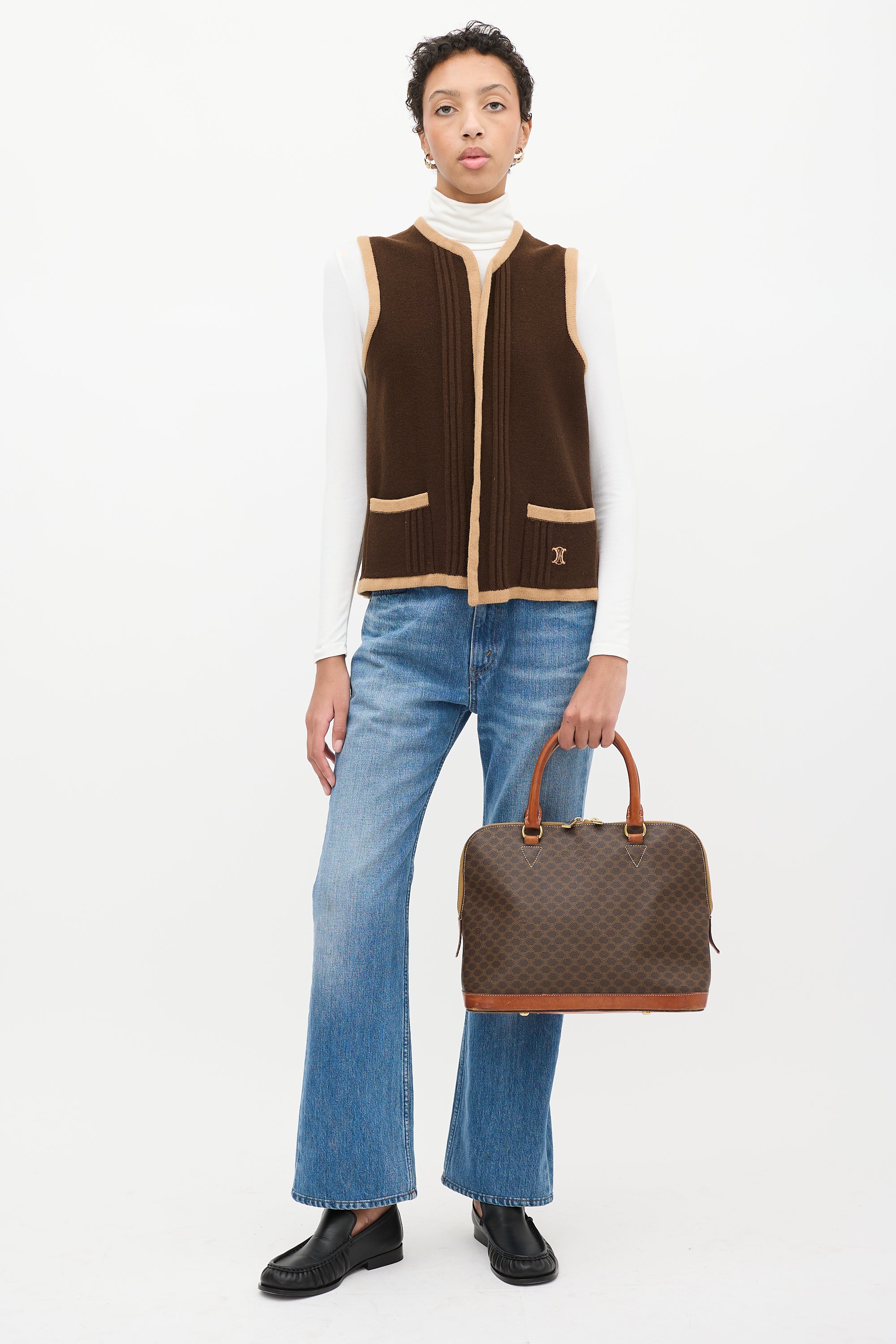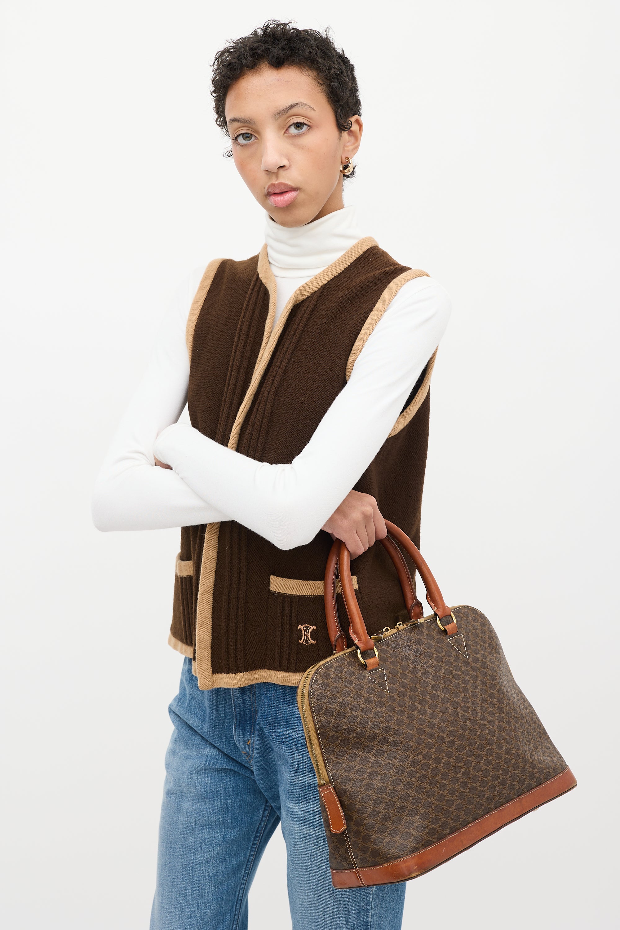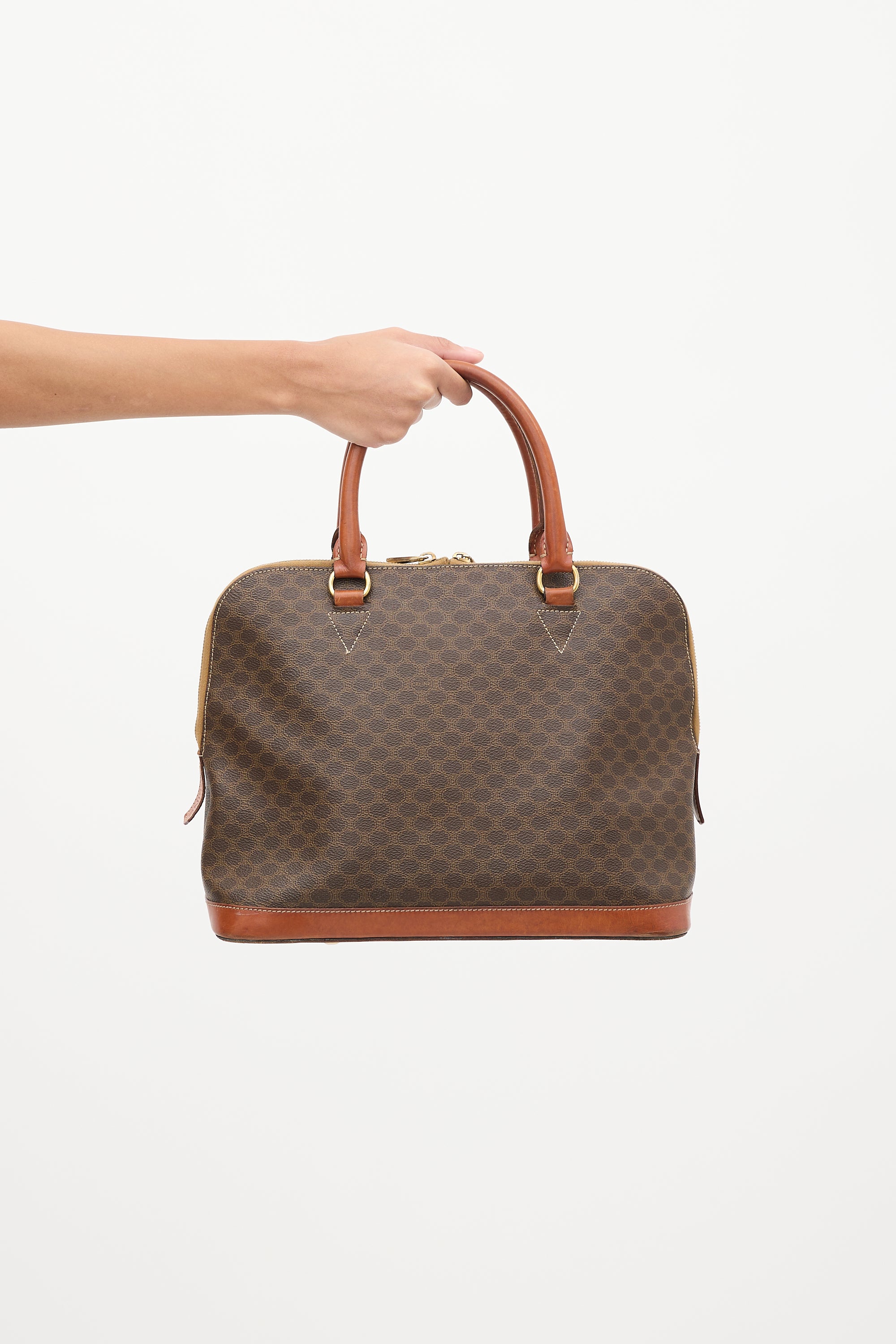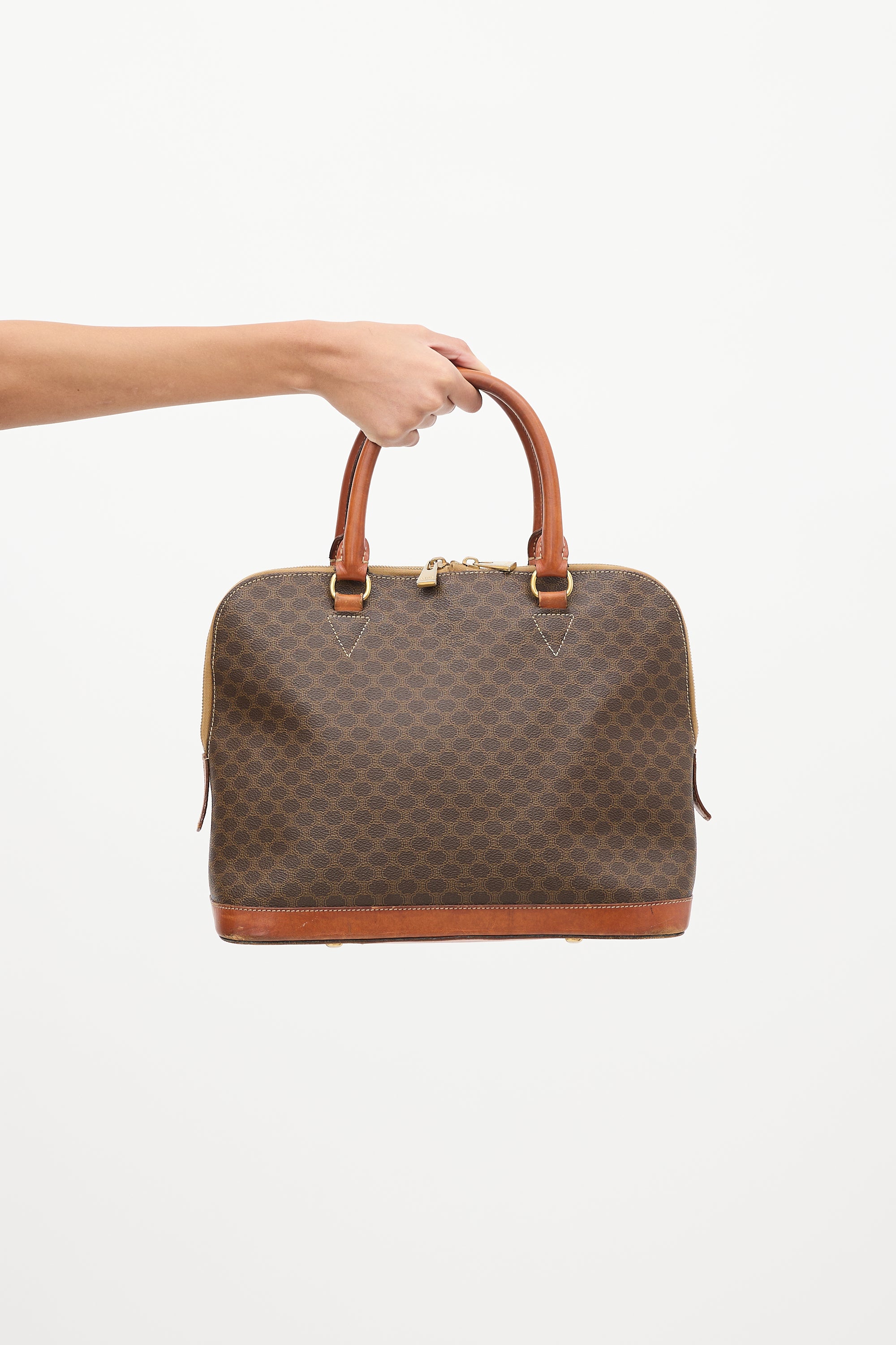 Pre-owned Celine brown Macadam top handle bag featuring repeating Triomphe printed coated canvas body, brown leather panelling, gold tone hardware, four protective feet at base, dual rolled top handles, dual top zip closure, and one lined main compartment with one zip pocket and three slip pockets.