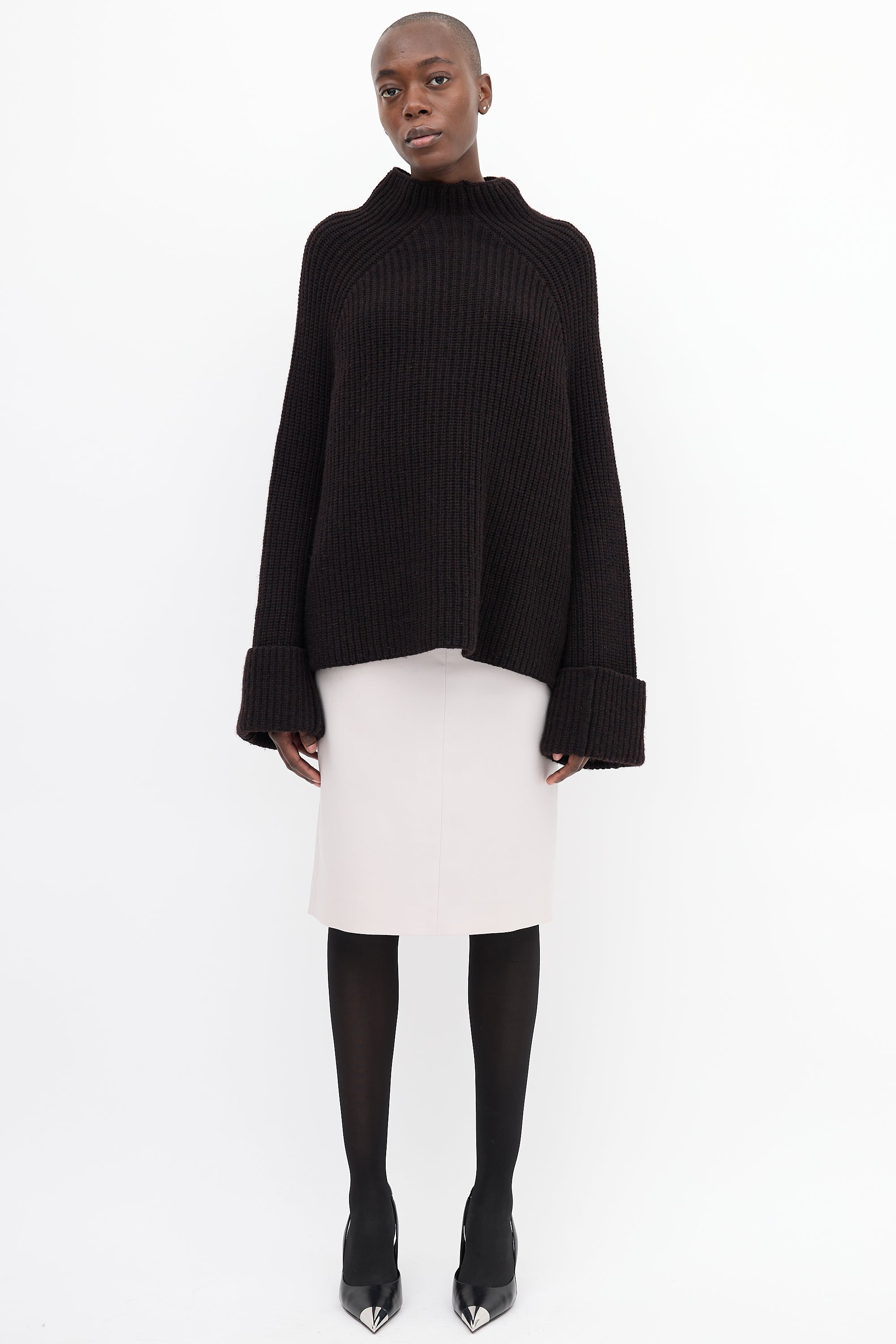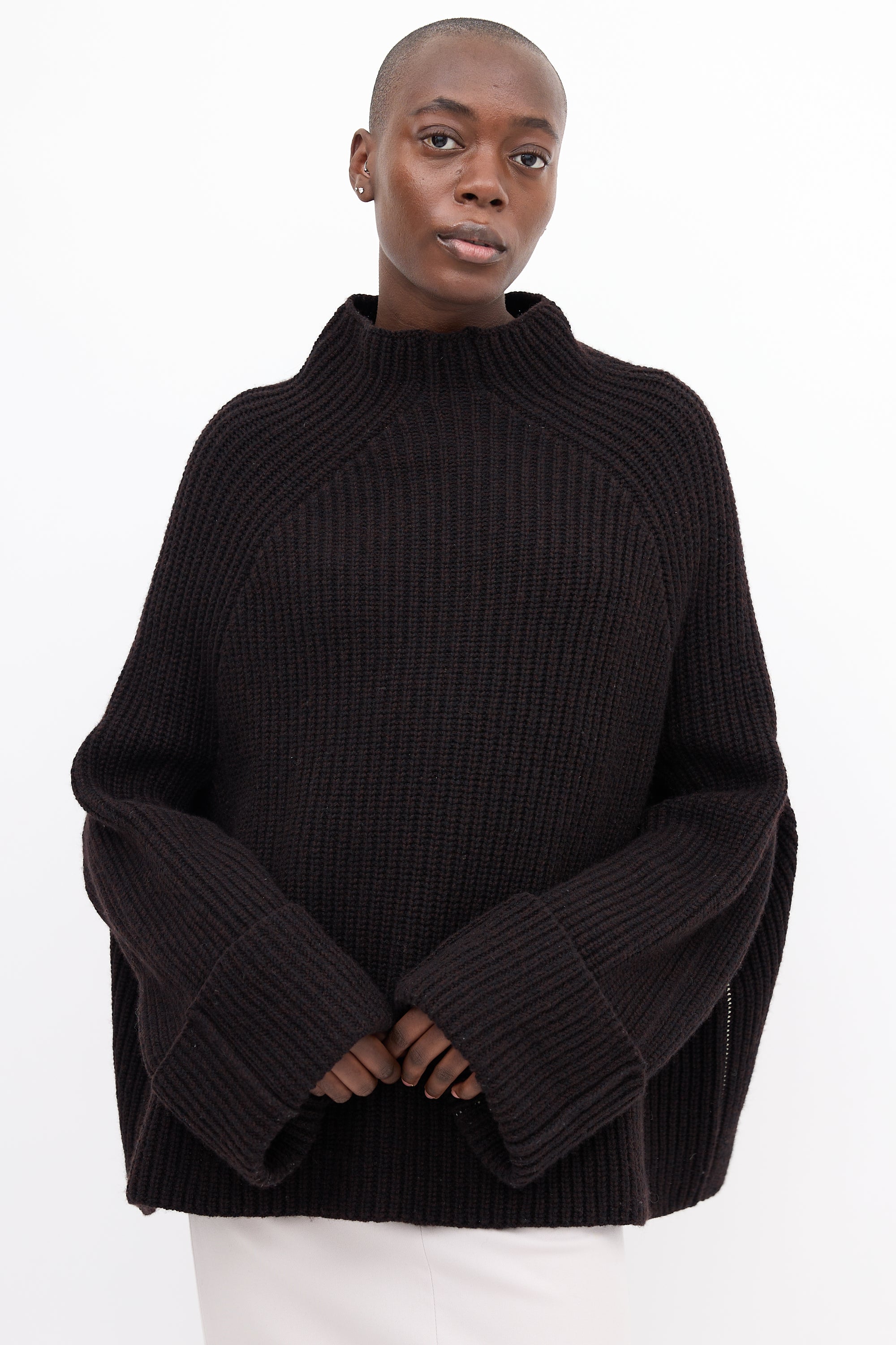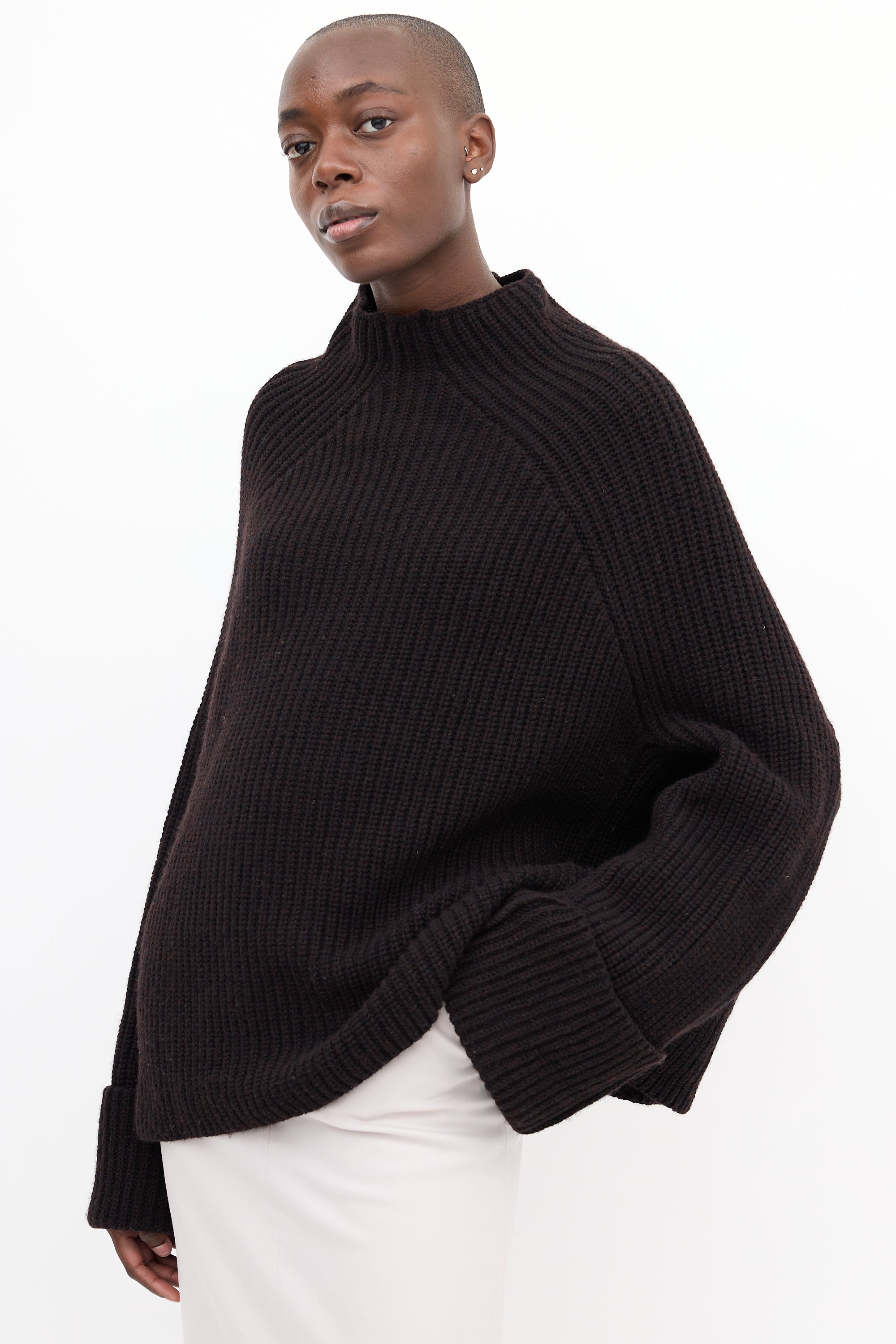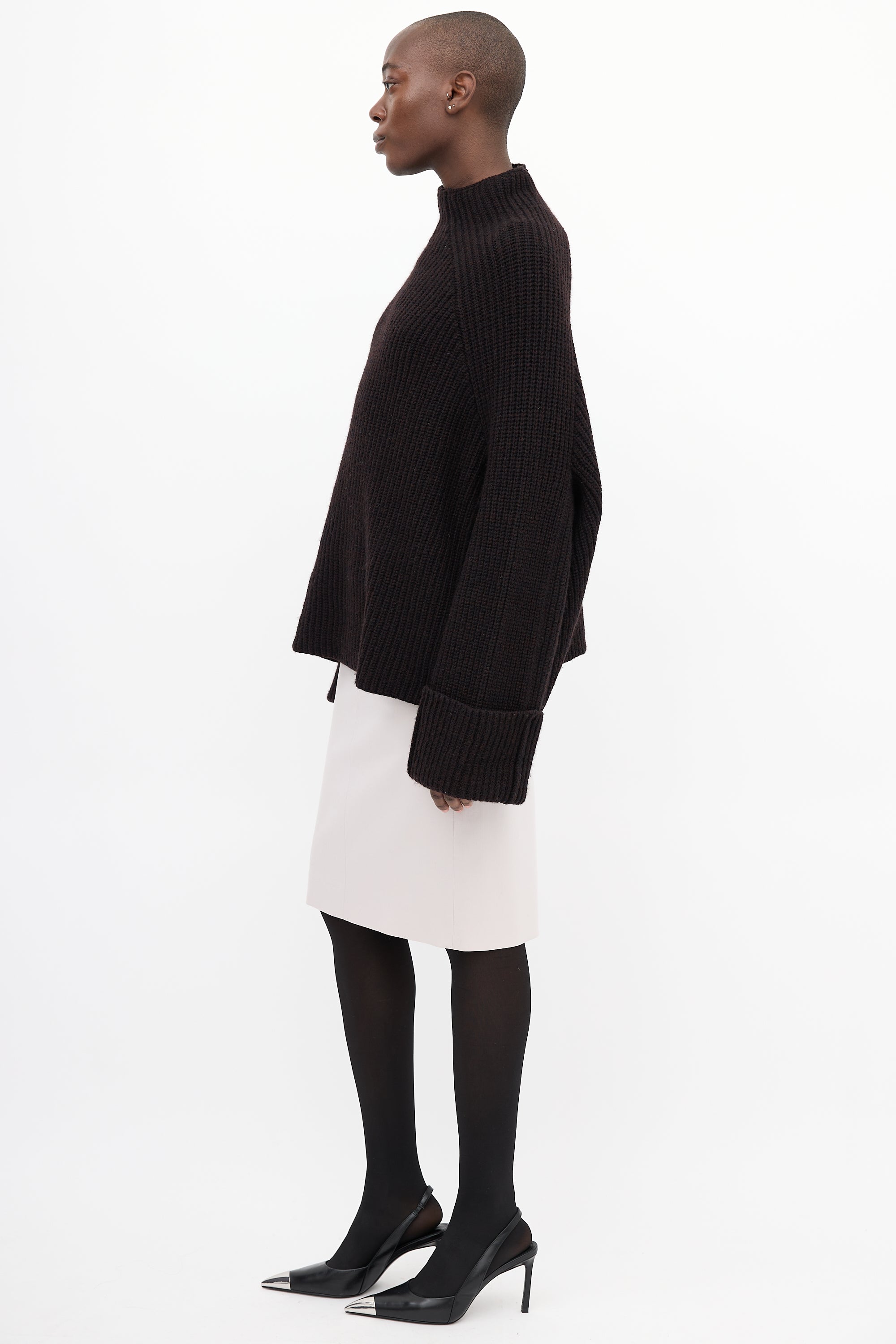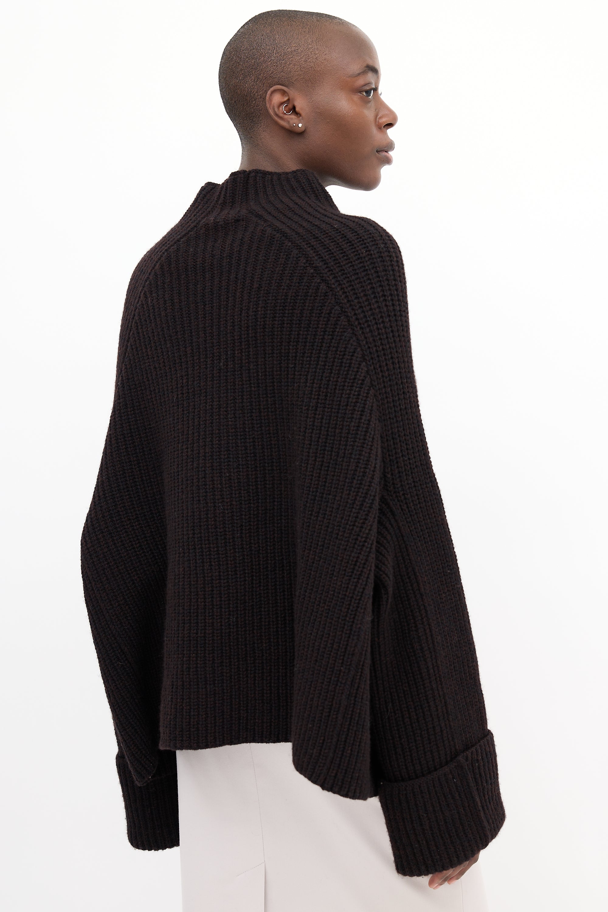 Pre-owned Celine brown wool blend sweater featuring a mock neck, Fisherman's rib knit, white stitch detail along sides of body and sleeves, and wide fold over cuffs.