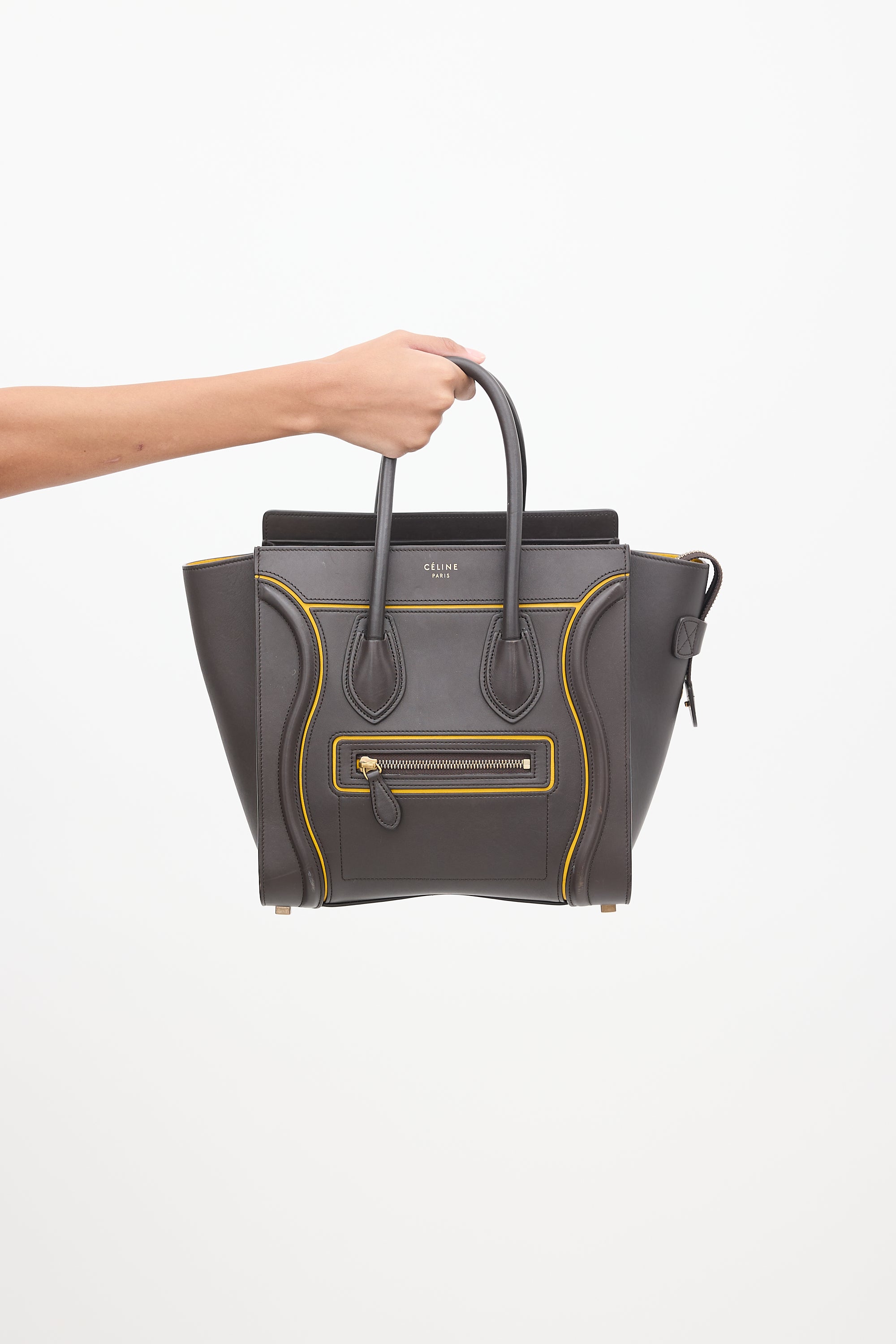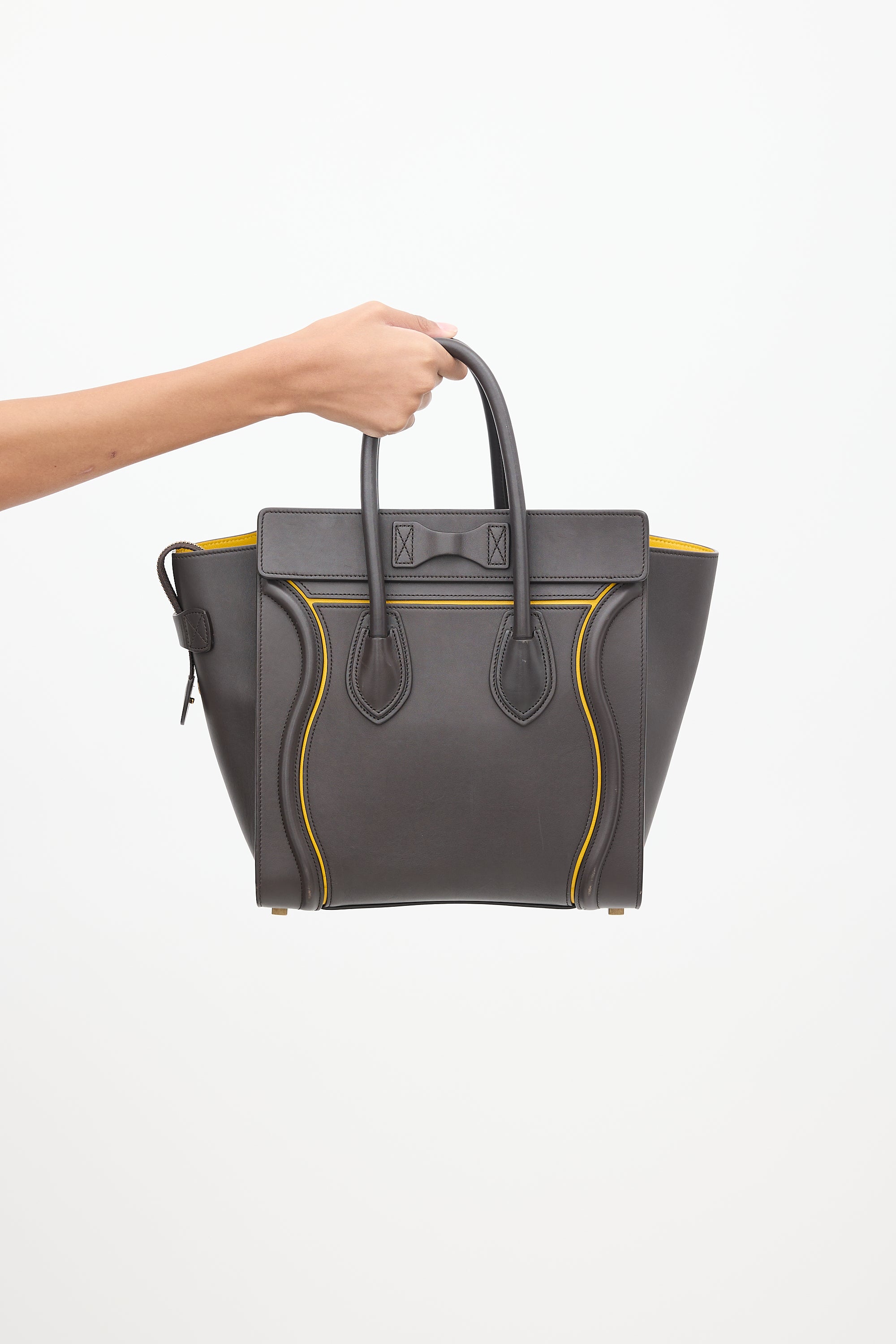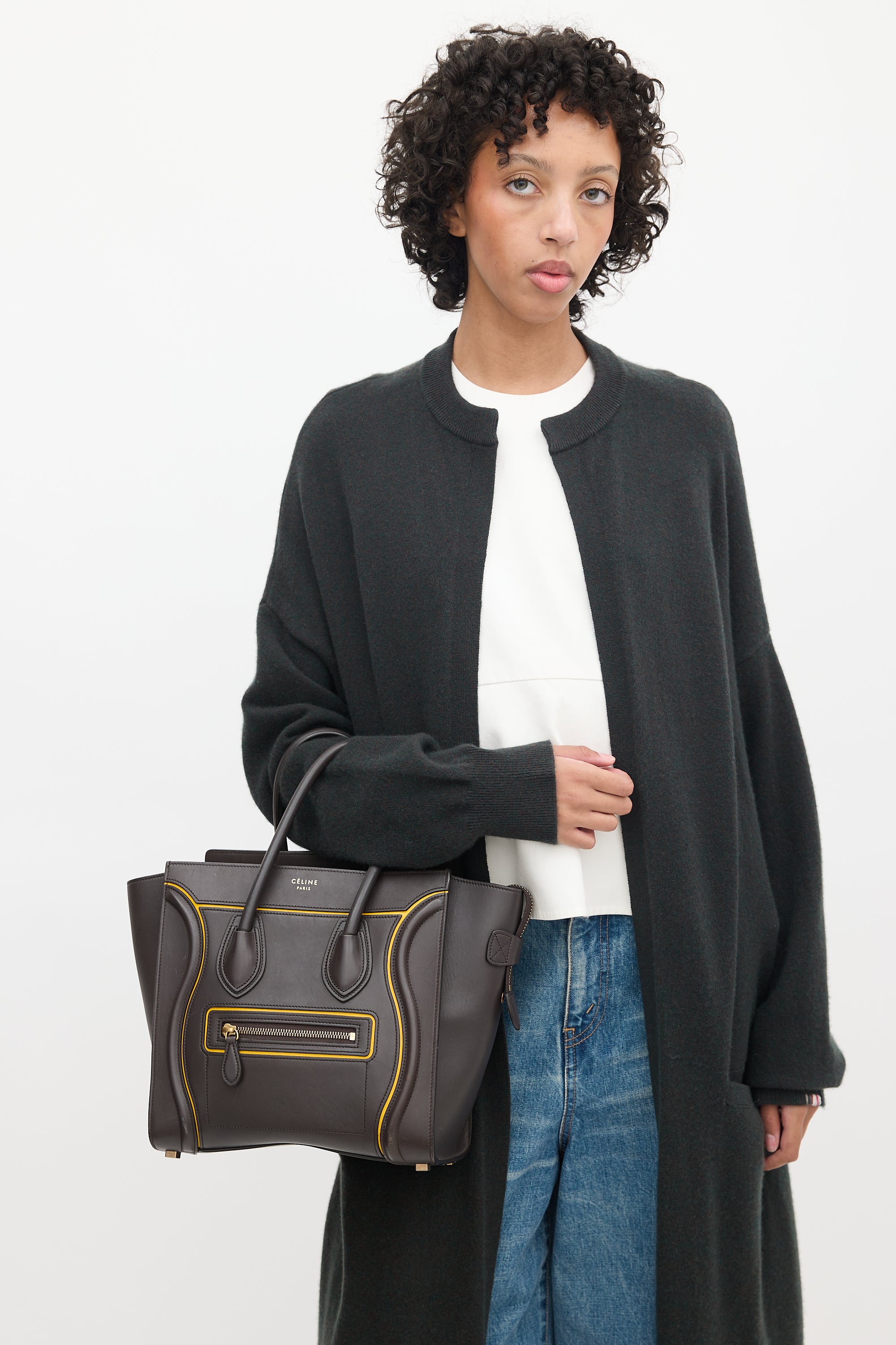 Pre-owned Celine brown Luggage leather tote featuring a printed logo at front, two rolled top handles, yellow piped trim throughout, one zip pocket at front, one main compartment with two slip pockets and one zip pocket, tonal piped detailing, and top zip closure. Comes with original dust bag.