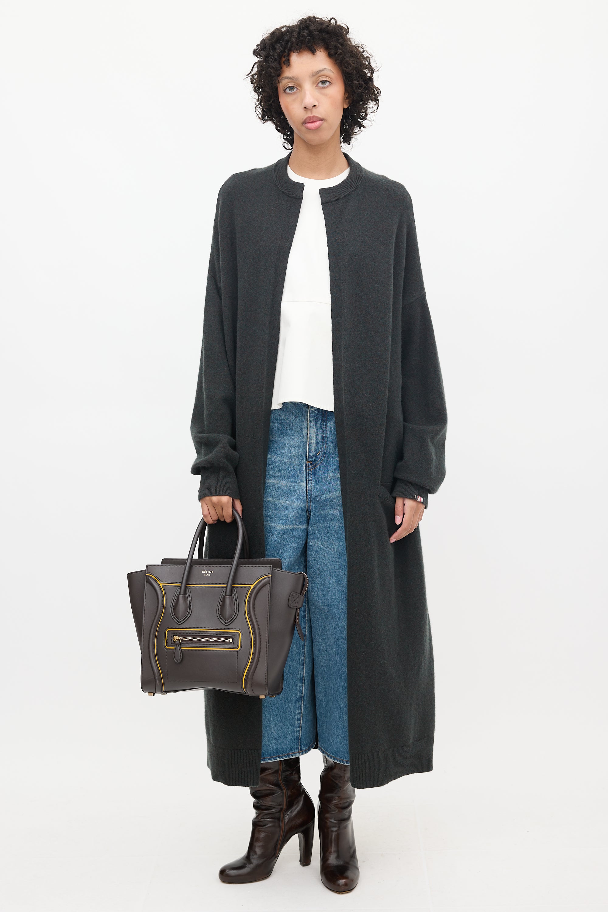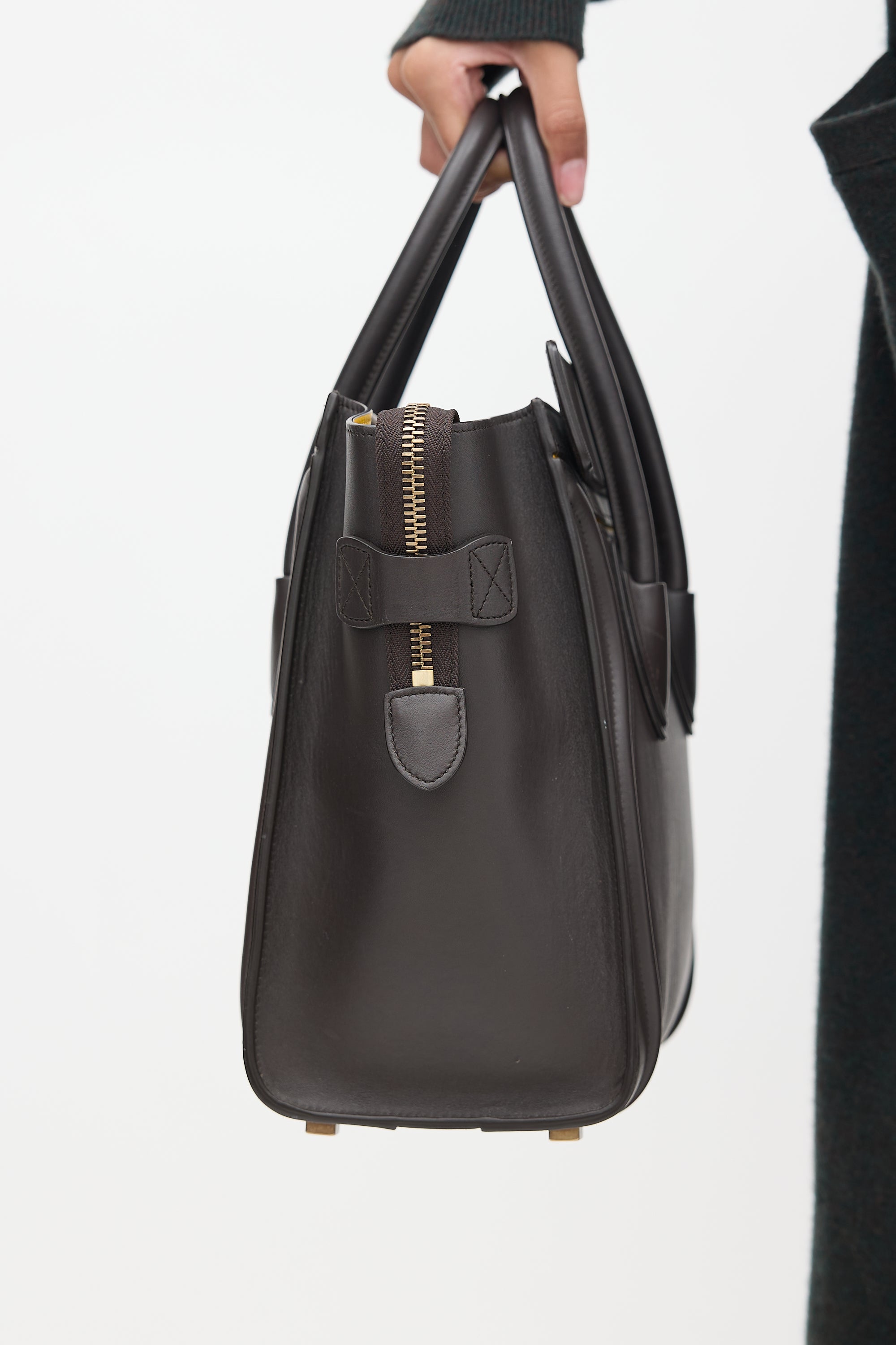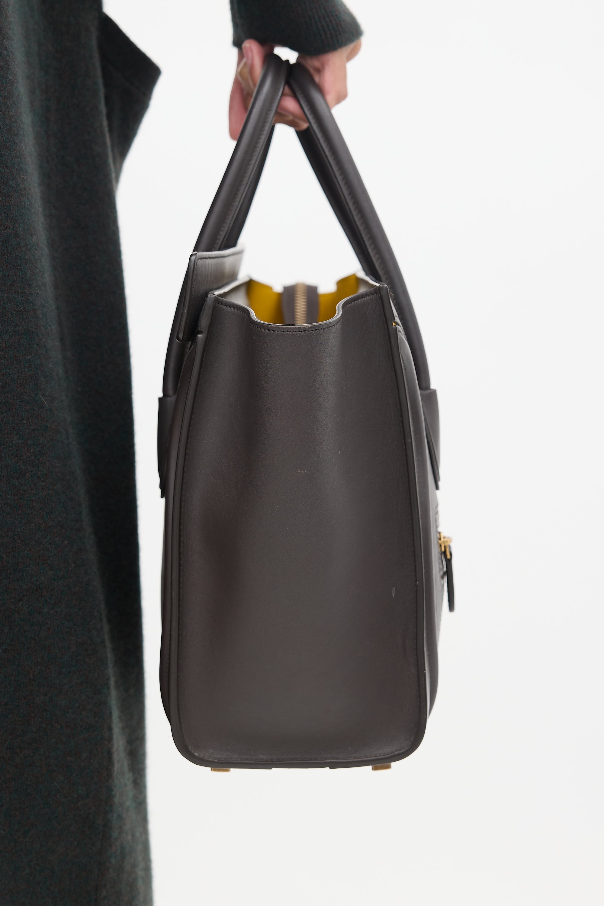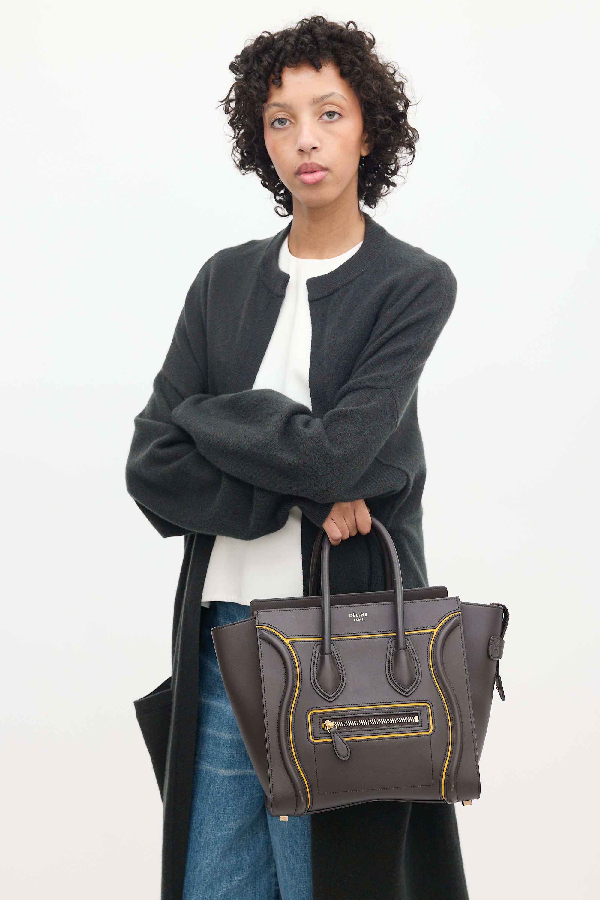 Pre-owned Celine brown Luggage leather tote featuring a printed logo at front, two rolled top handles, yellow piped trim throughout, one zip pocket at front, one main compartment with two slip pockets and one zip pocket, tonal piped detailing, and top zip closure. Comes with original dust bag.