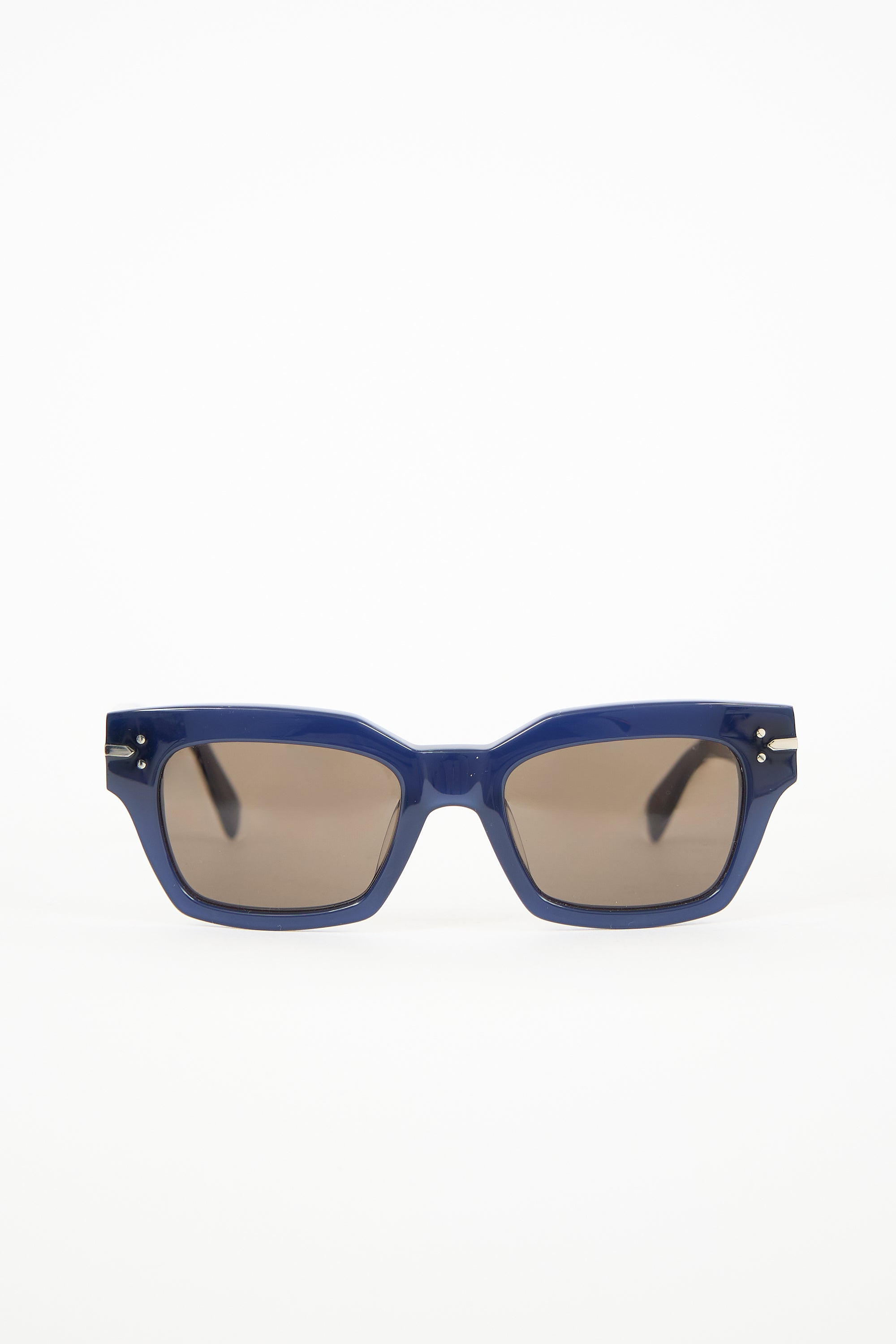 Pre-owned Celine CL41070/S sunglasses featuring grey tinted lenses, navy acetate square frame, and silver tone accent at temples. Comes with original case and wipe cloth.