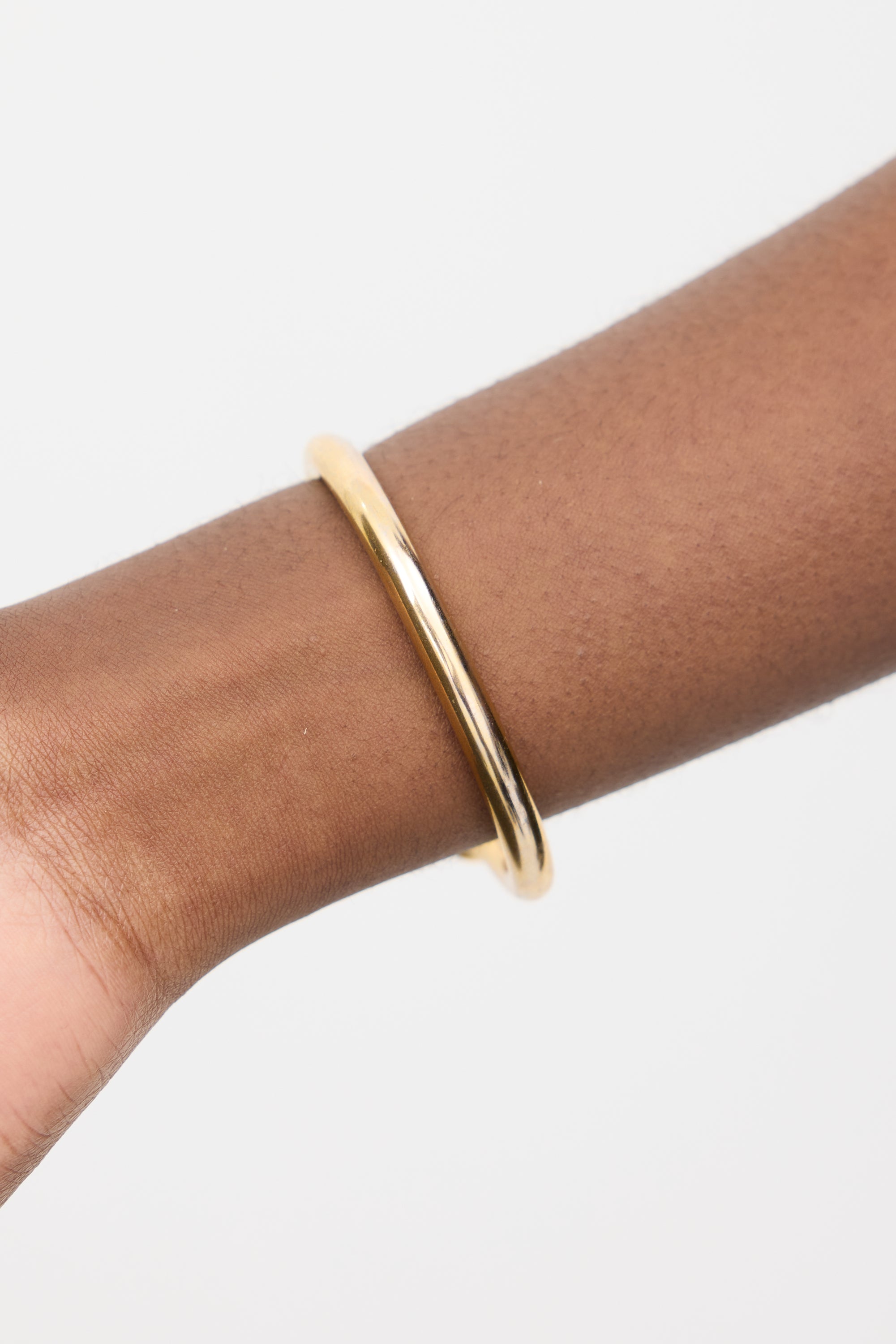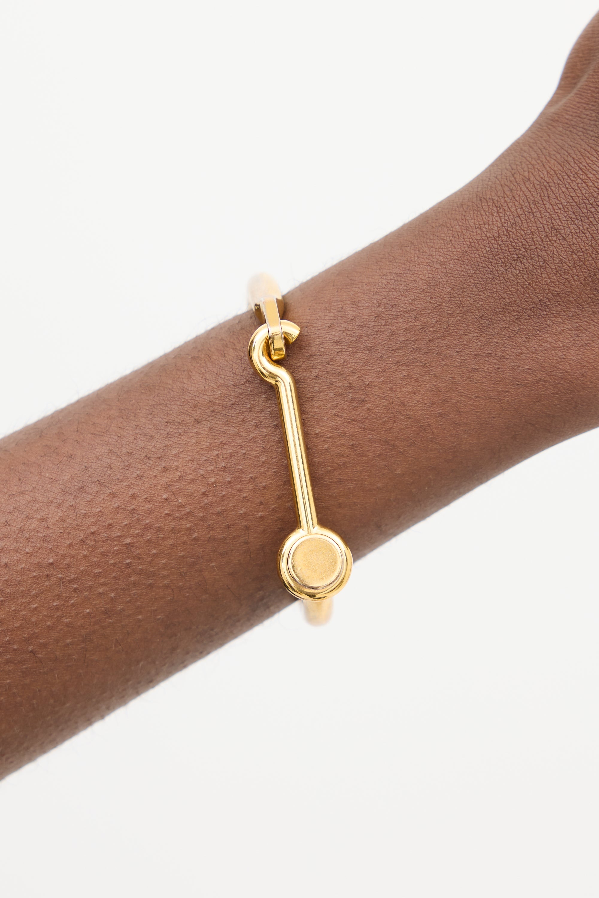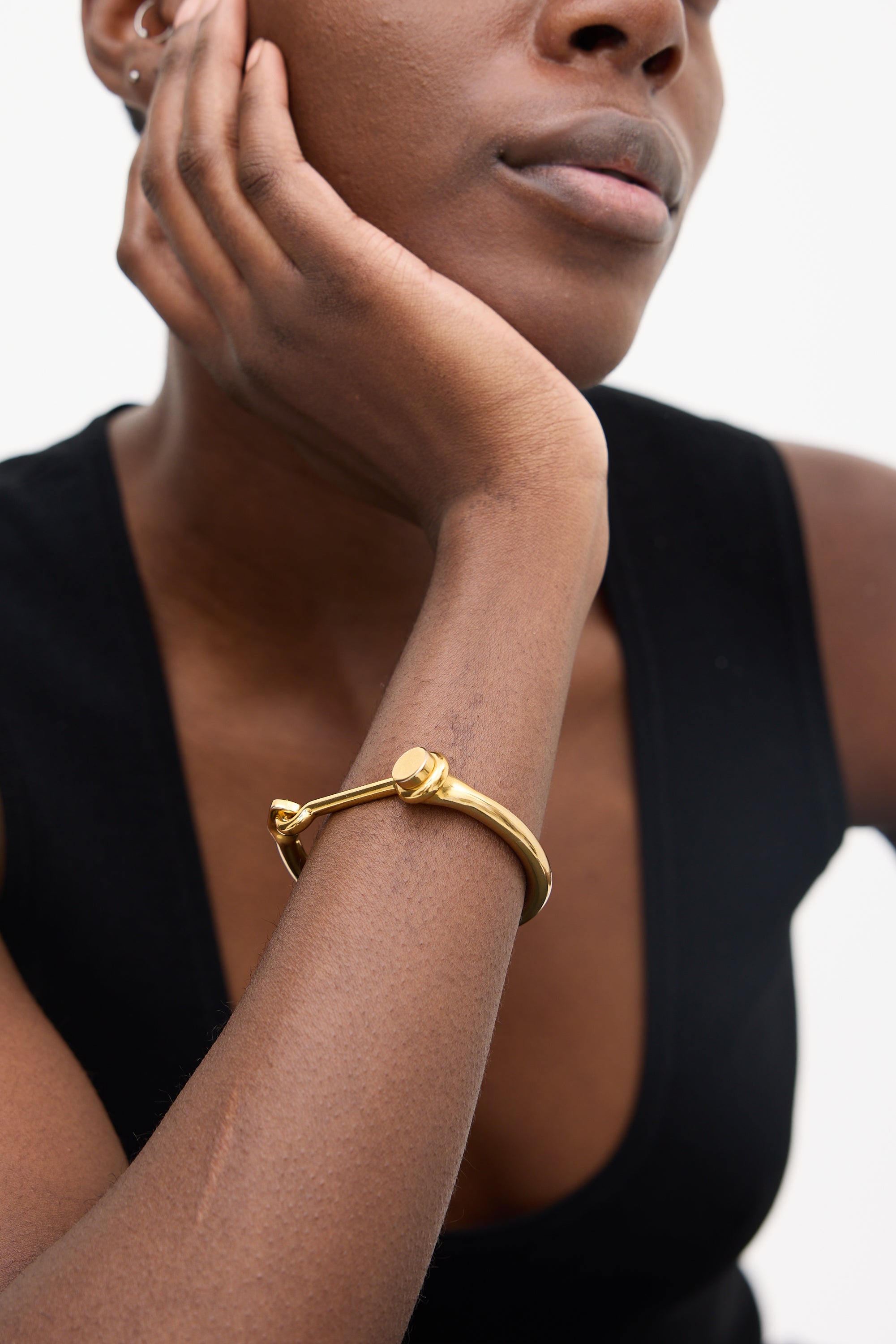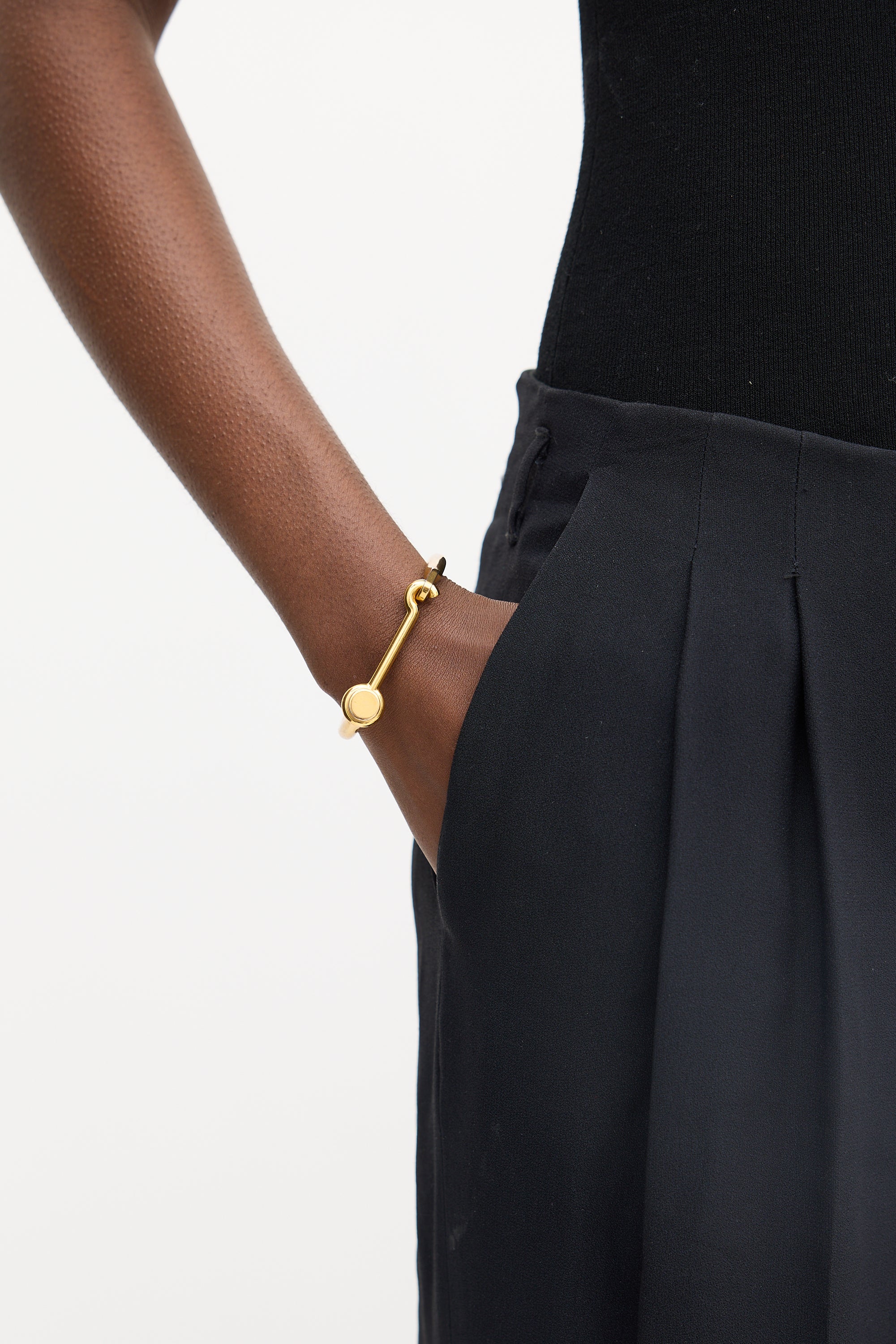 Pre-owned Celine gold tone bracelet featuring hinge closure and stamps at inner side. Stamped with designer signature, "Made in Italy", and "M."