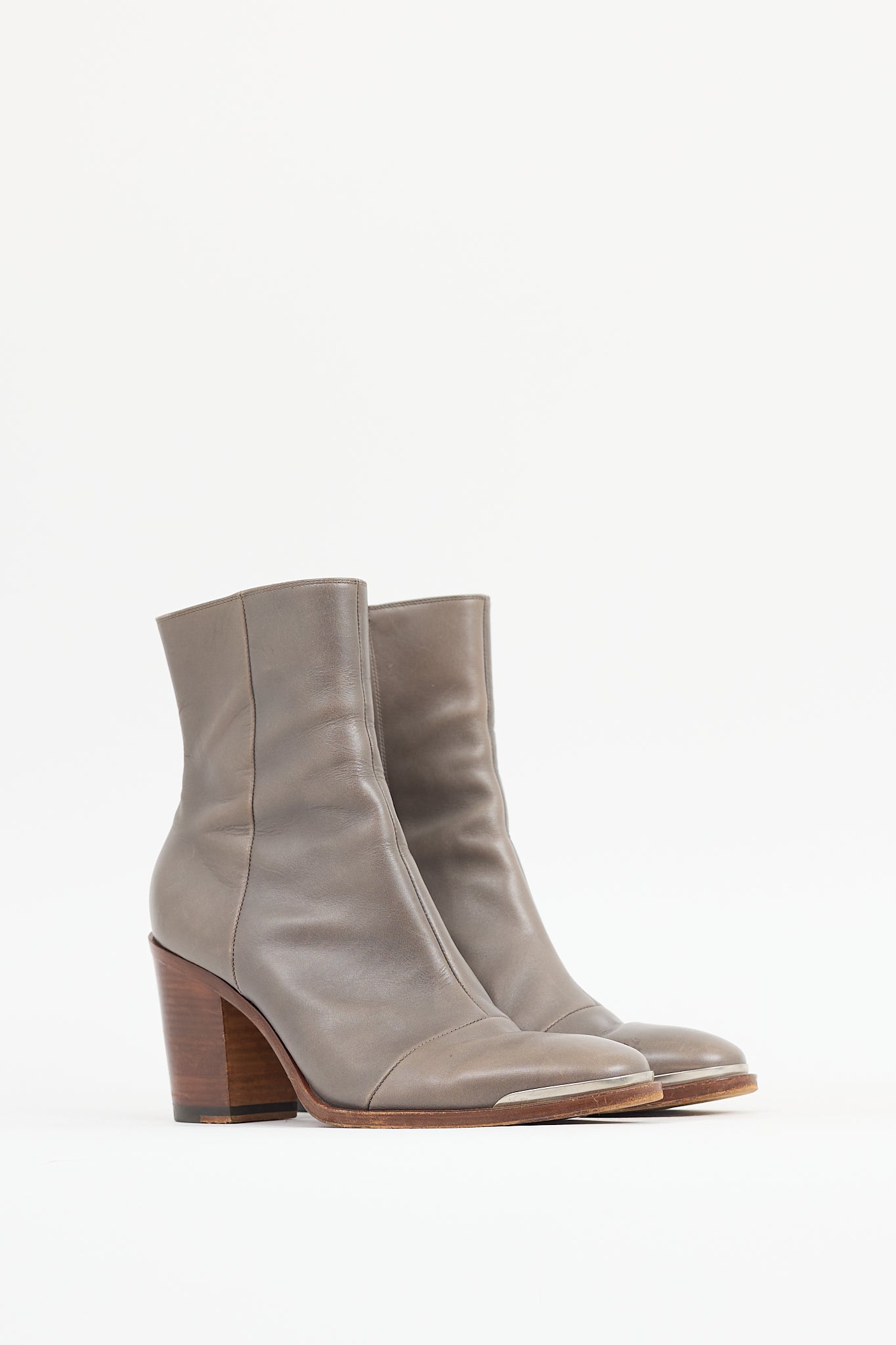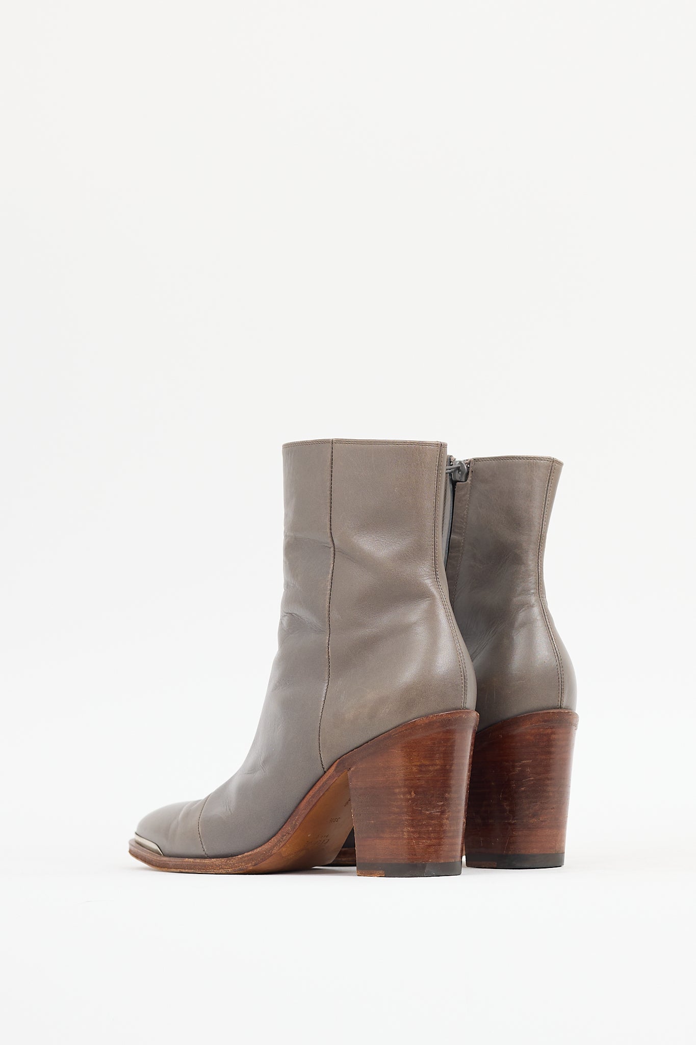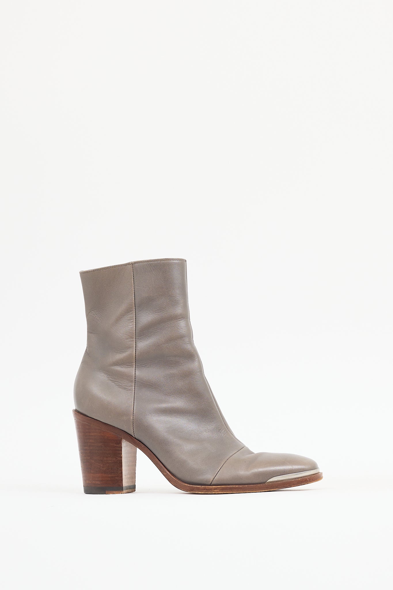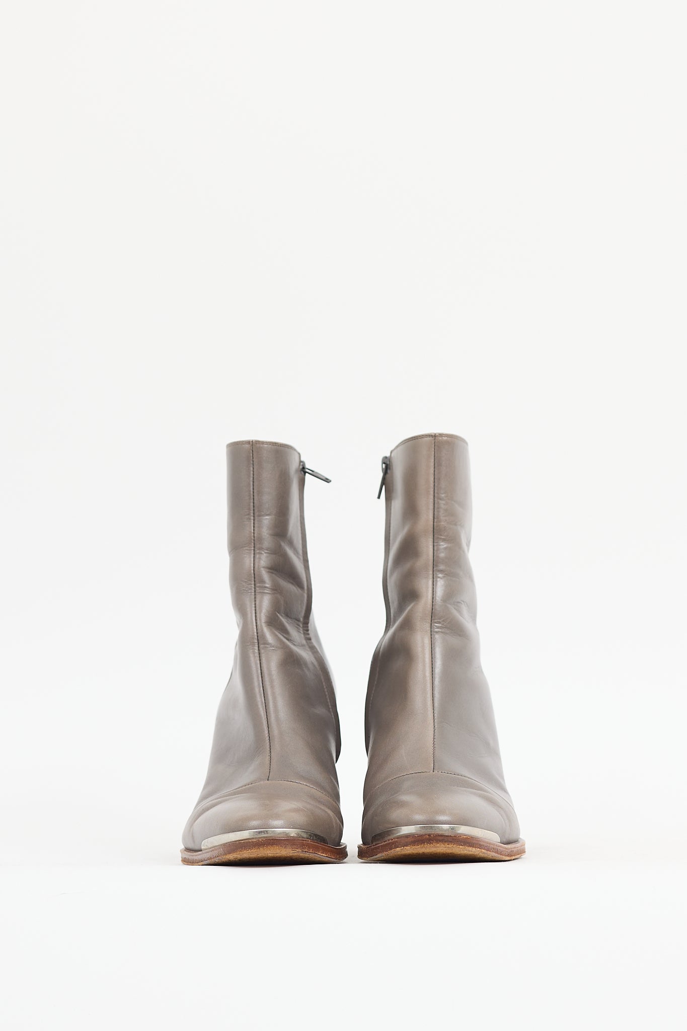 Pre-owned Celine grey leather boots featuring a round toe with silver tone hardware, stacked block heel, and zip closure at side. Comes with original dust bag.