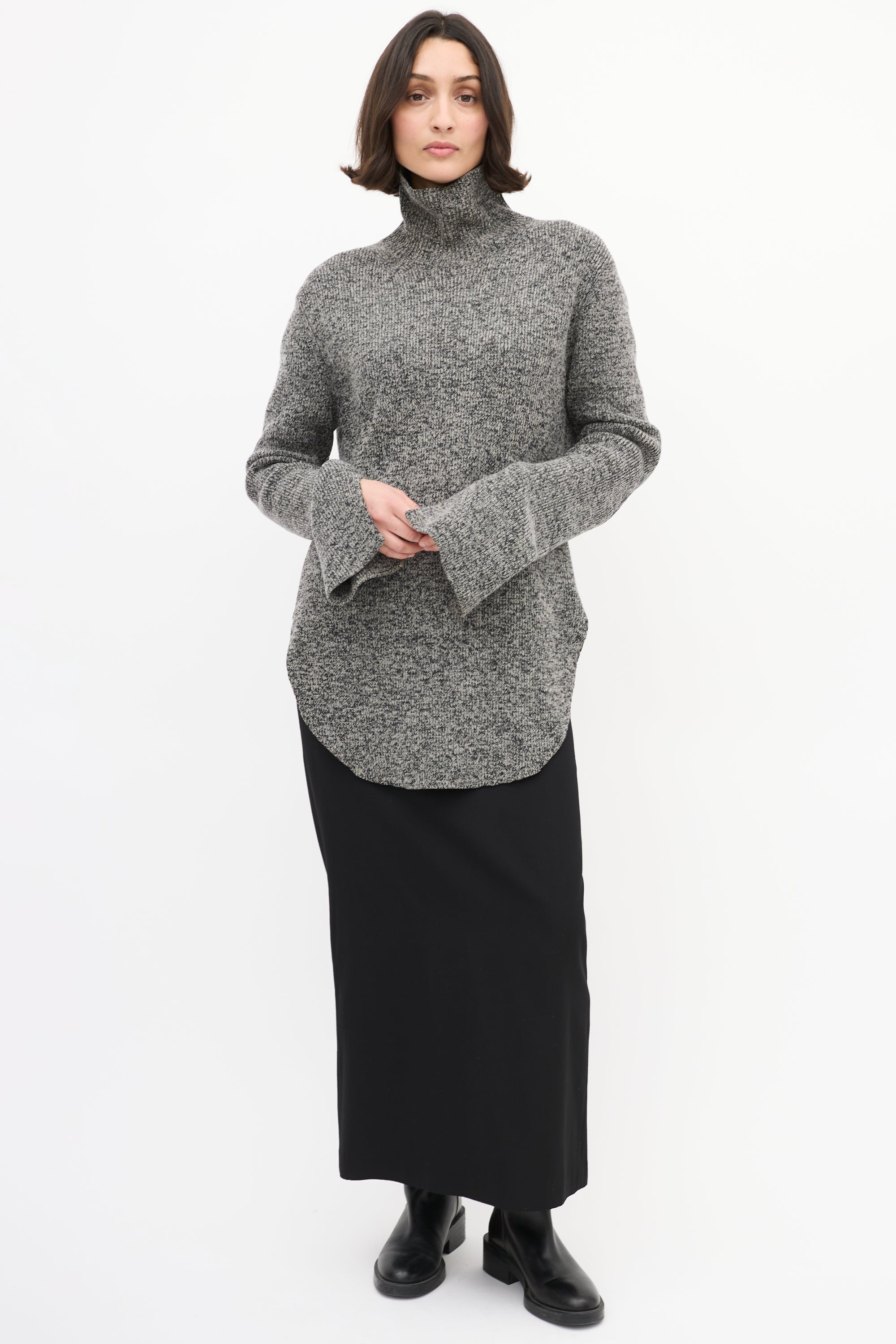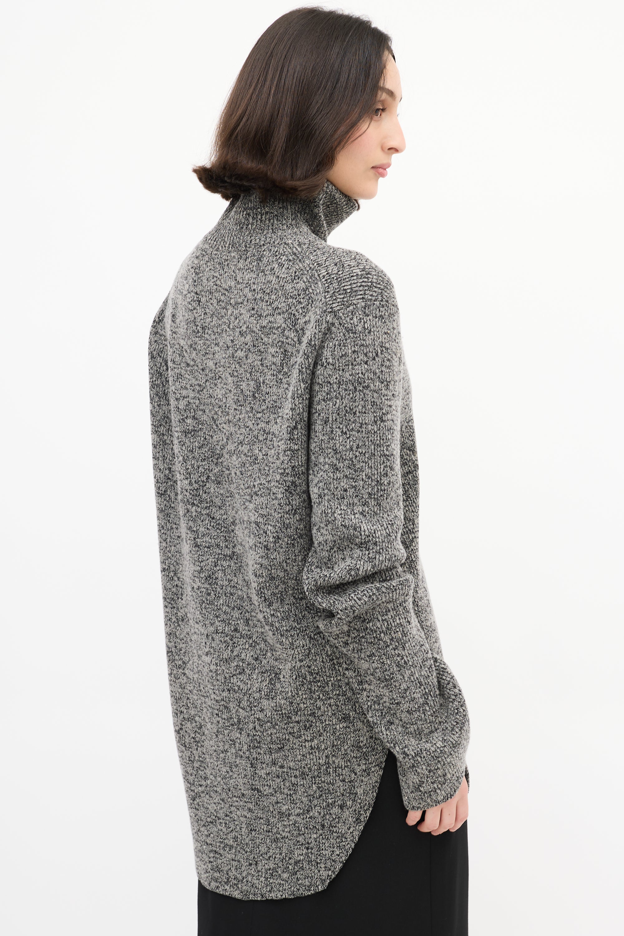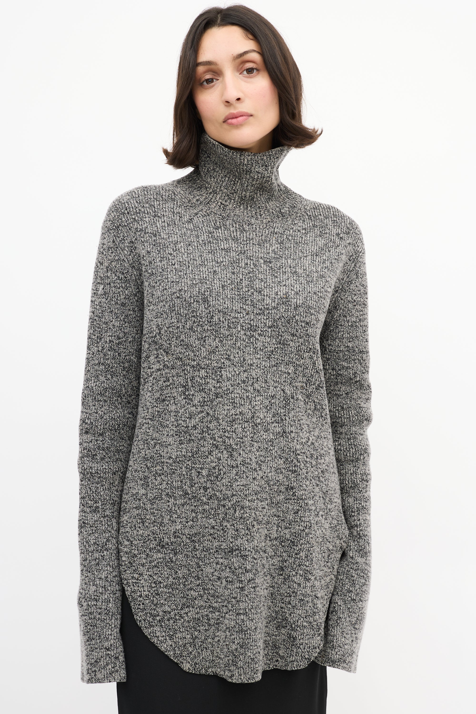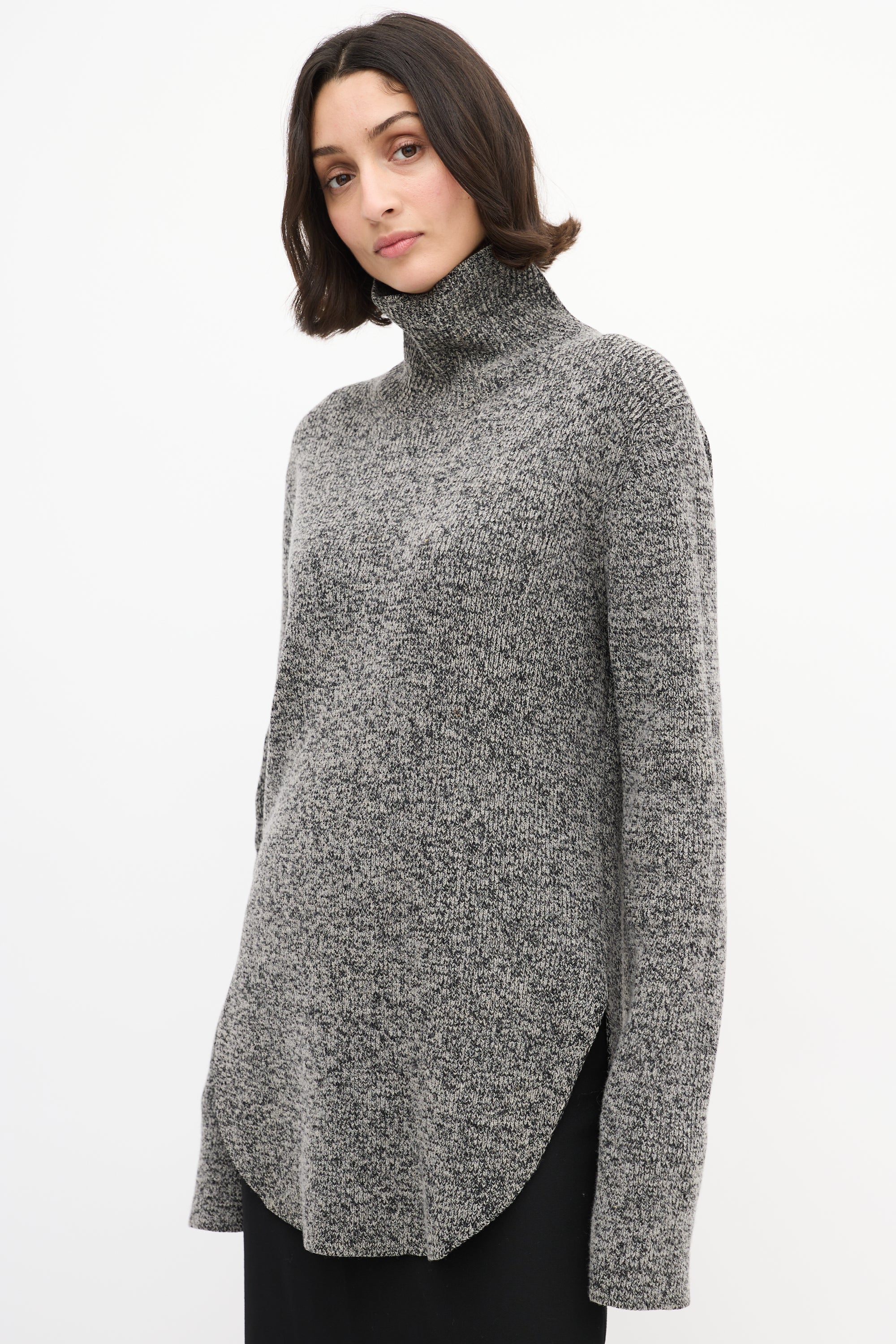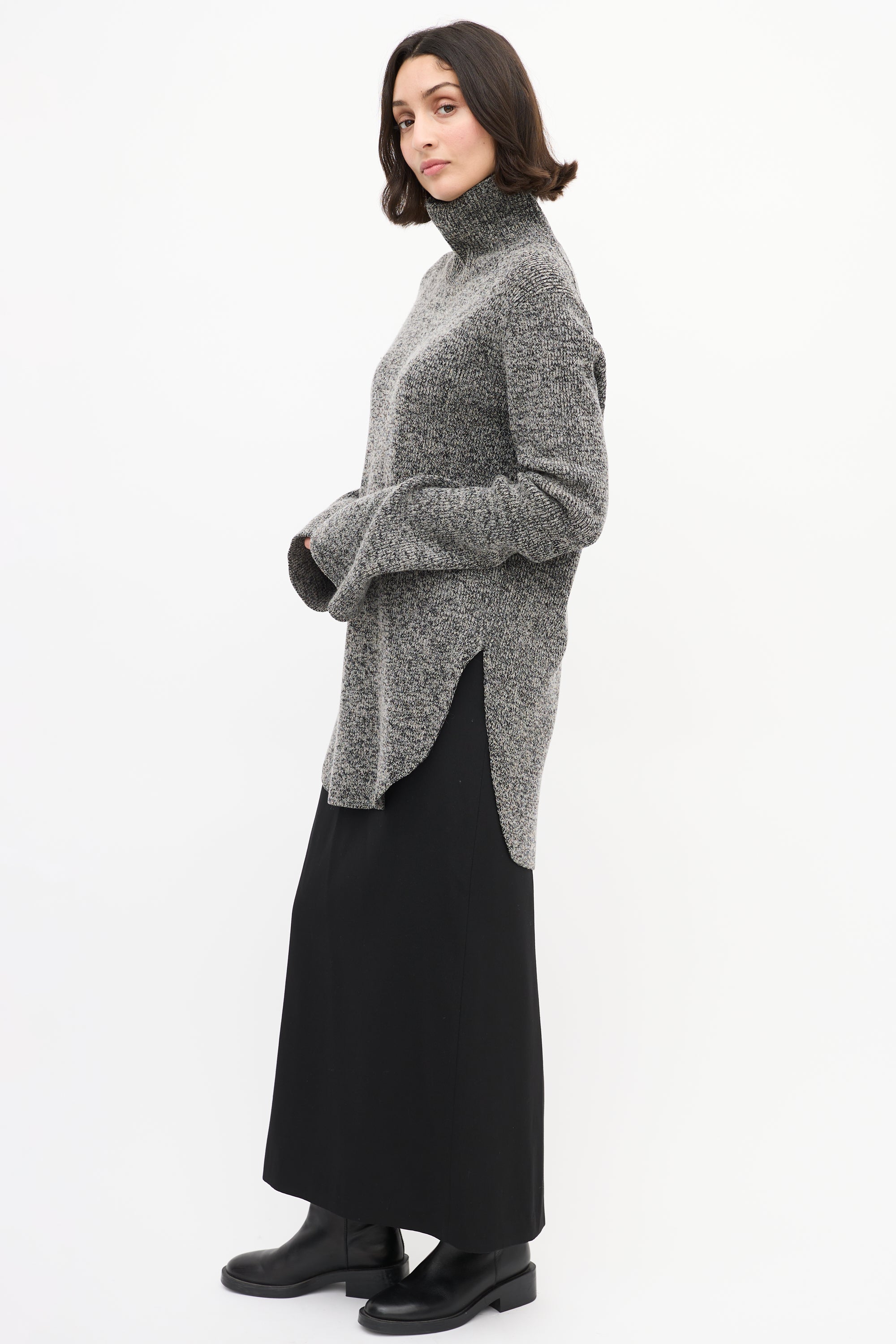 Pre-owned Celine grey melange wool blend turtleneck sweater featuring side vents, curved hem, and long sleeves with split cuffs.