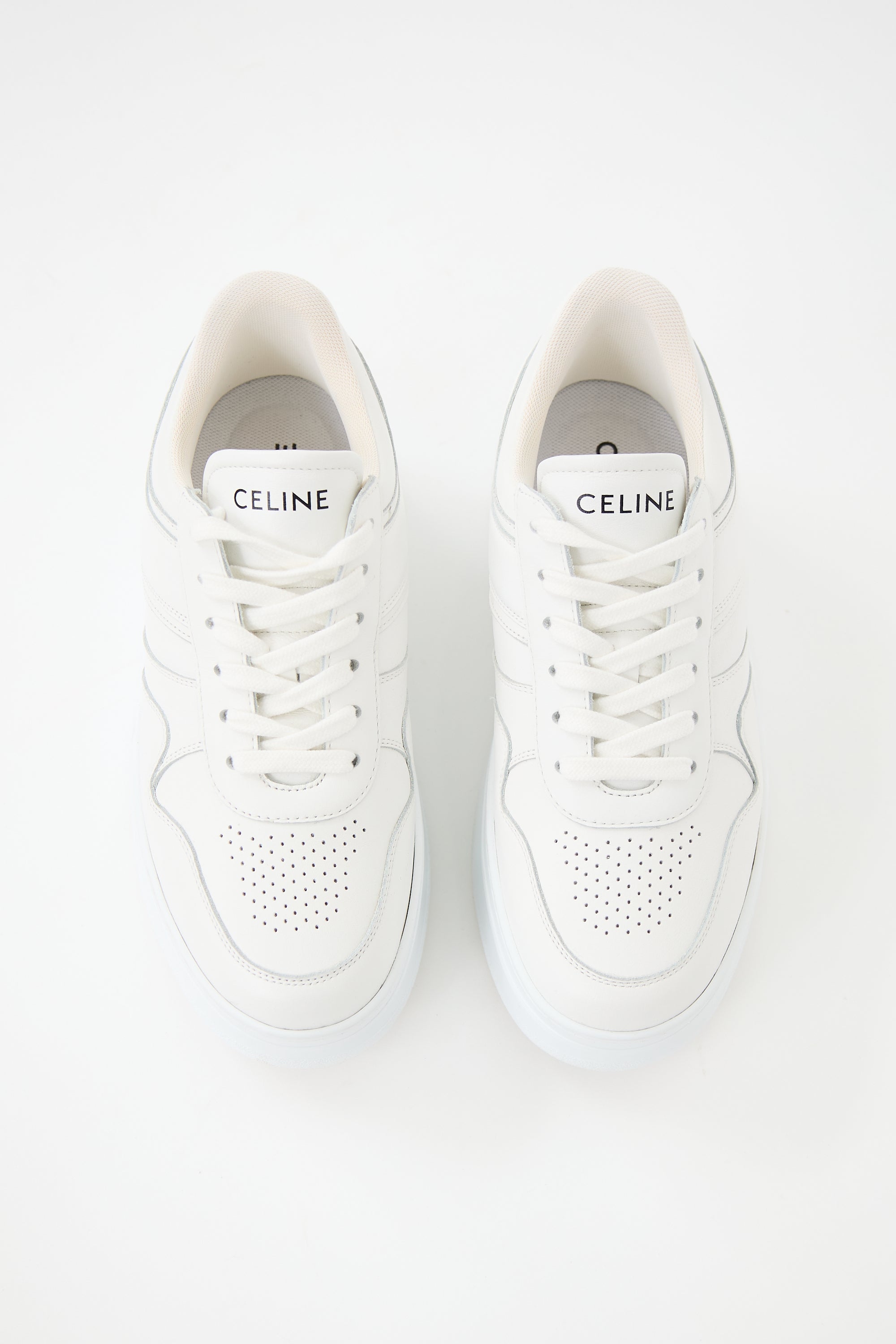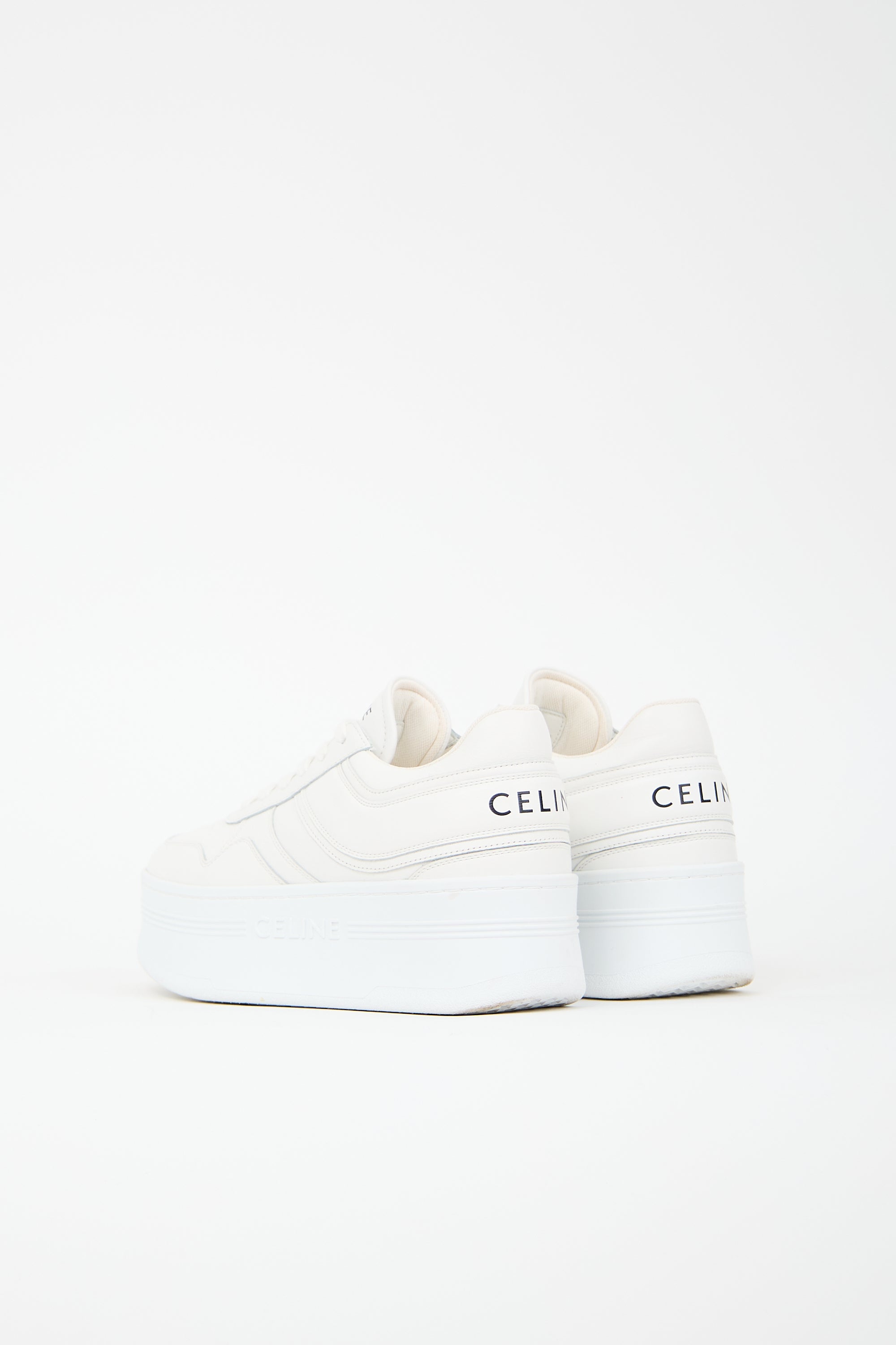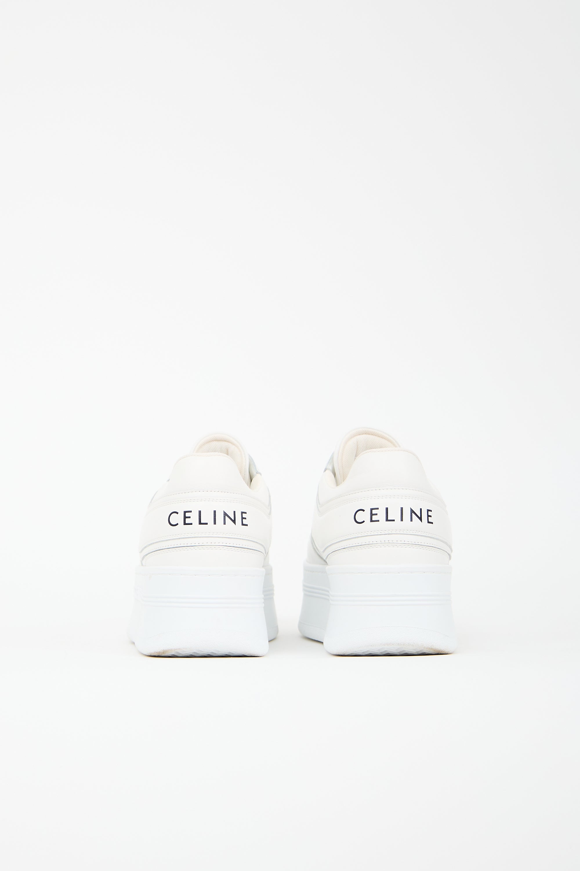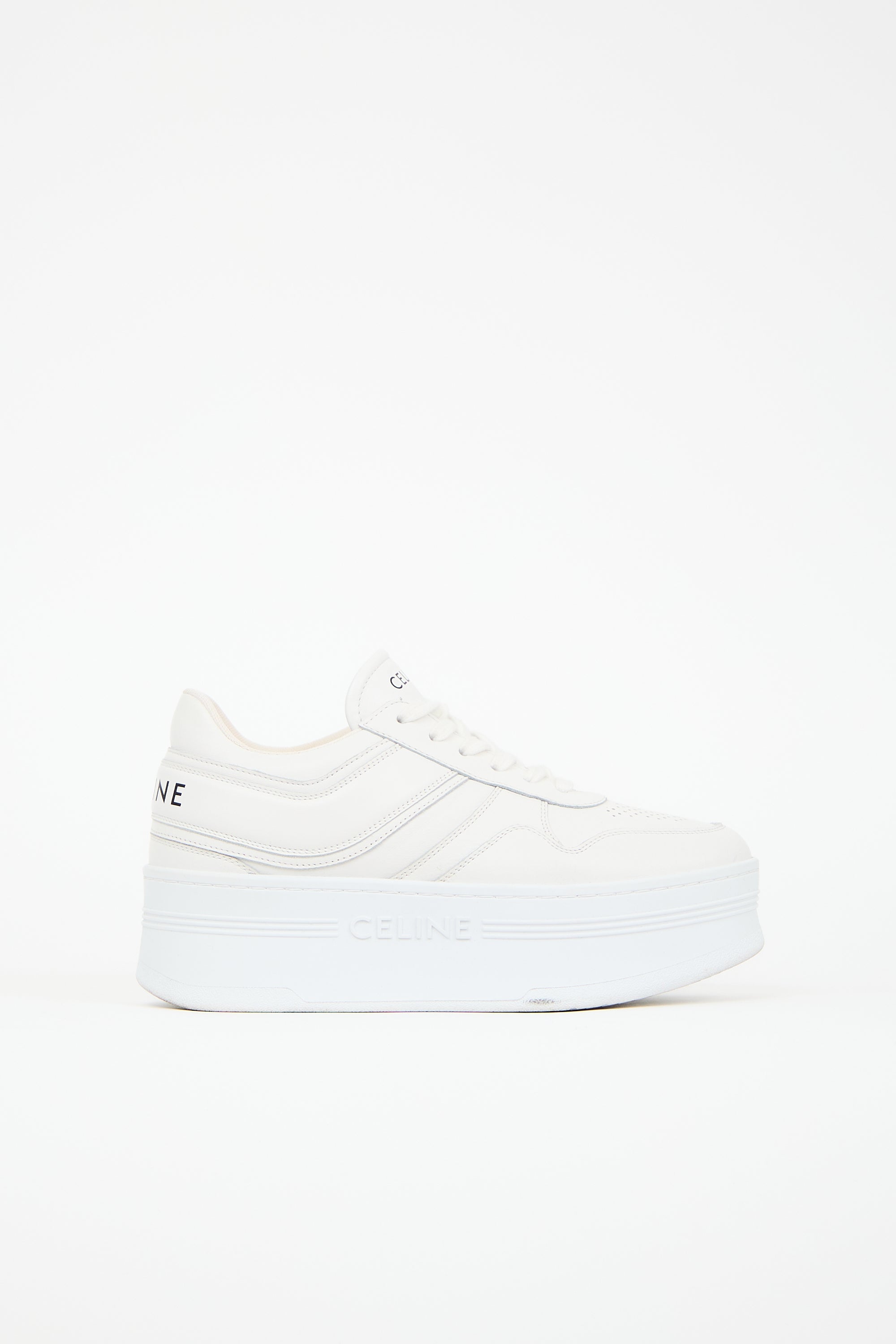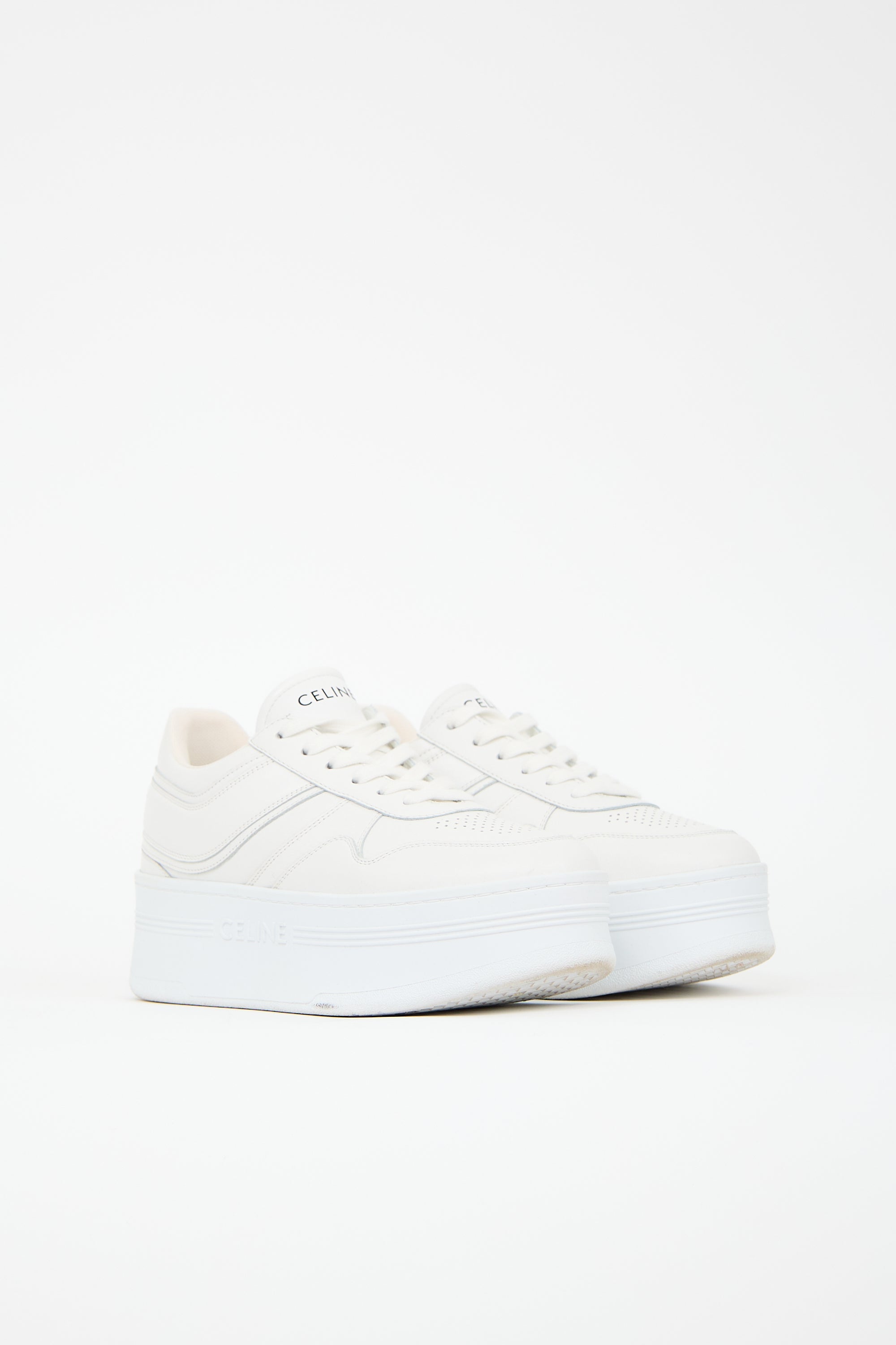 Pre-owned Celine white Block sneakers featuring rounded toe, leather upper, perforated toe box, lace up vamp, printed logos at tongue and counter, and platform rubber sole with embossed logo at outer side. Comes with original drawstring bag.