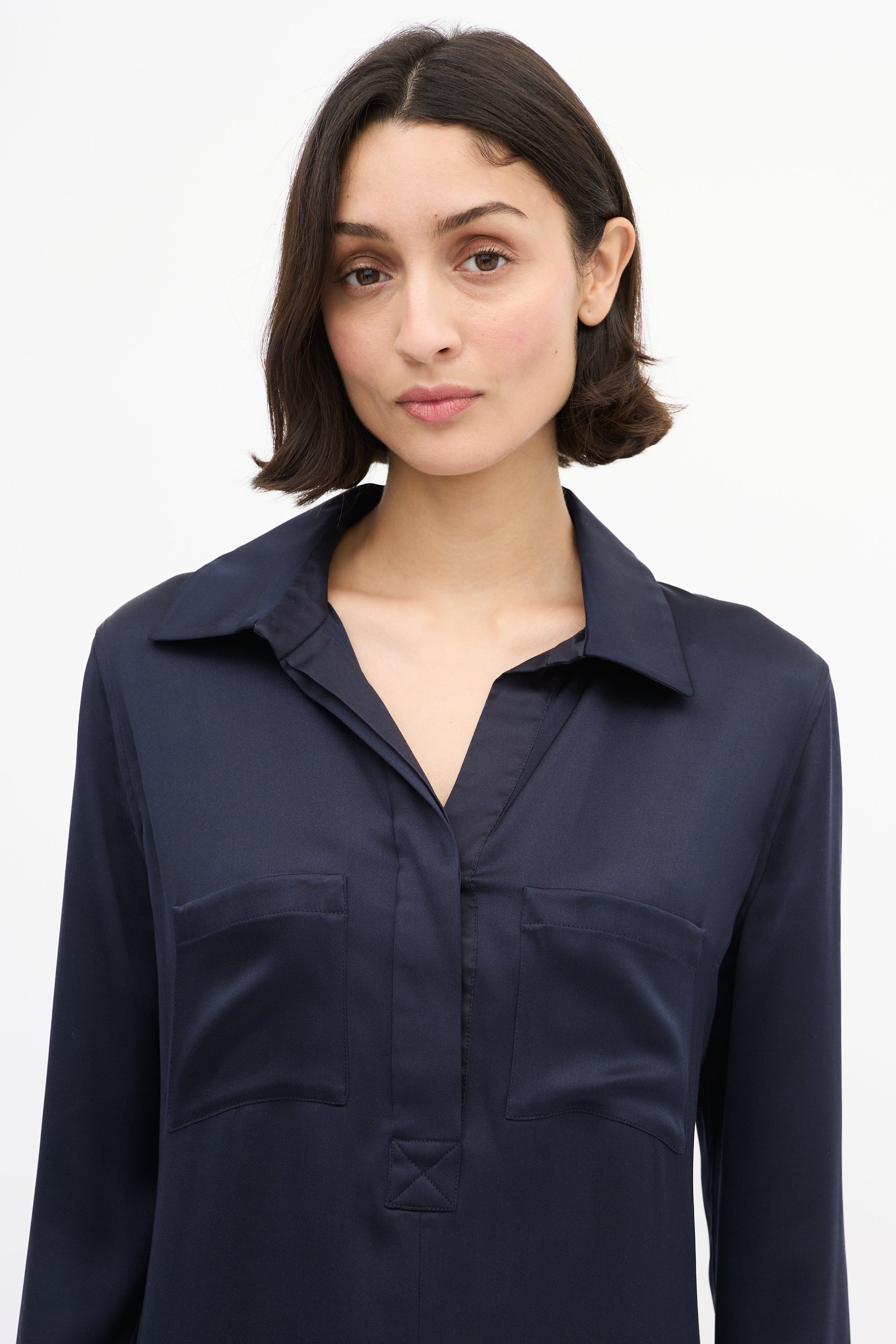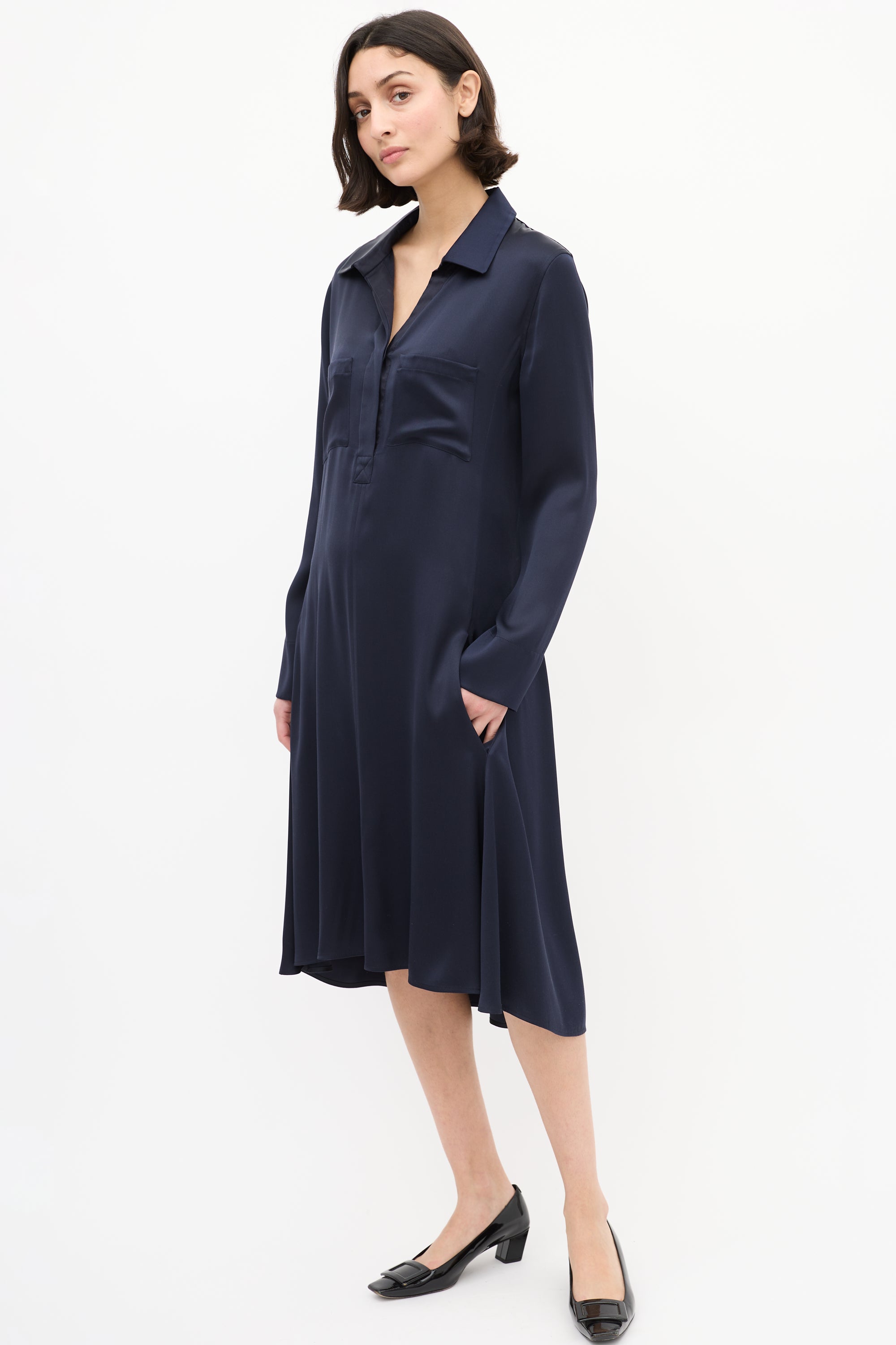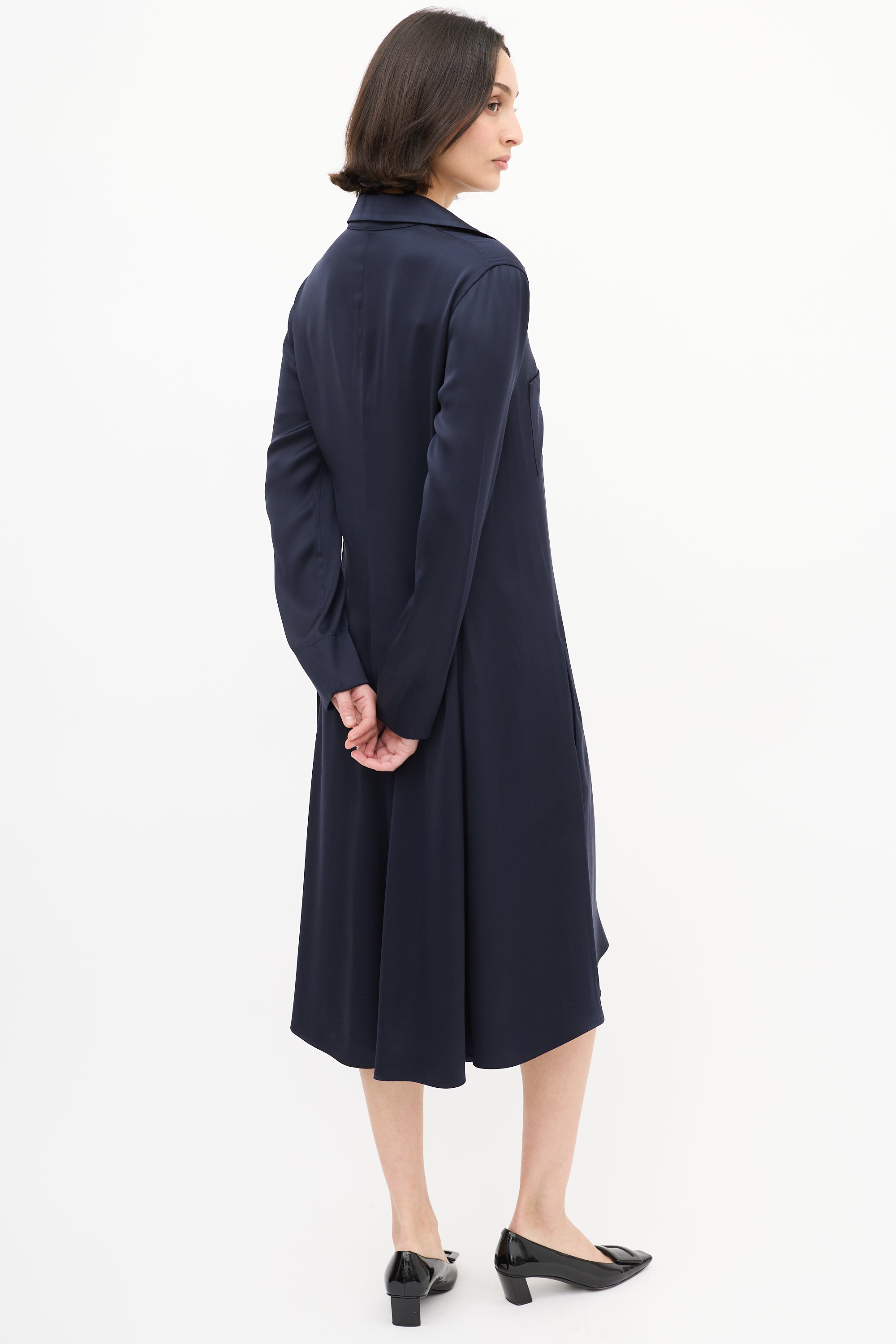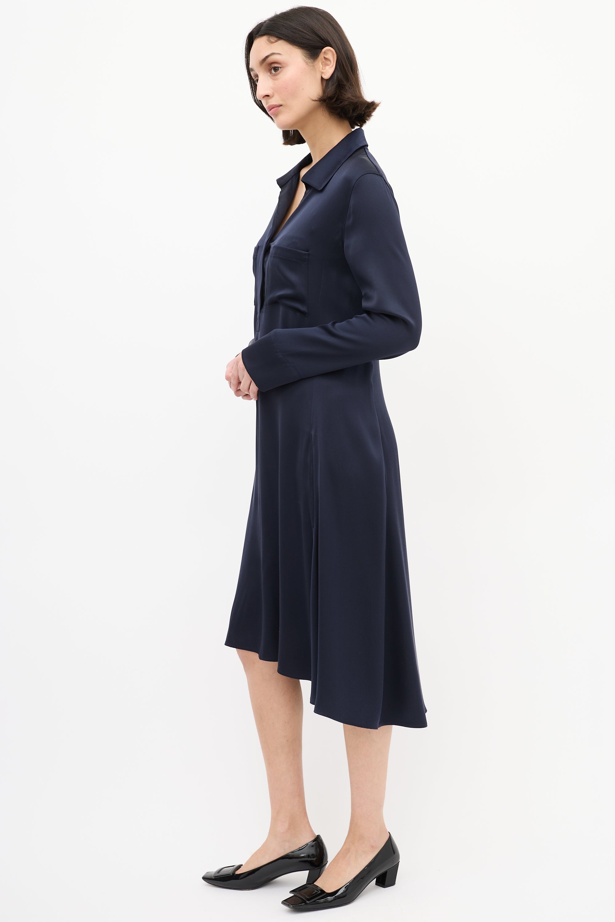 Pre-owned Celine navy silk midi dress featuring a collared button up neckline, two patch pockets at chest, in seam pockets at hip, high low hem, and cuffed long sleeves.