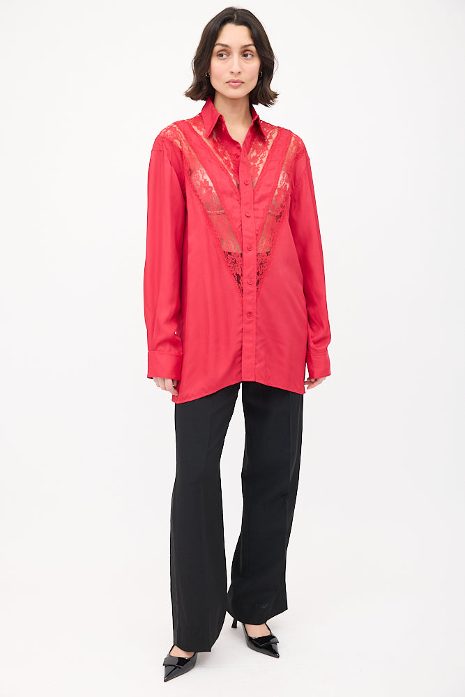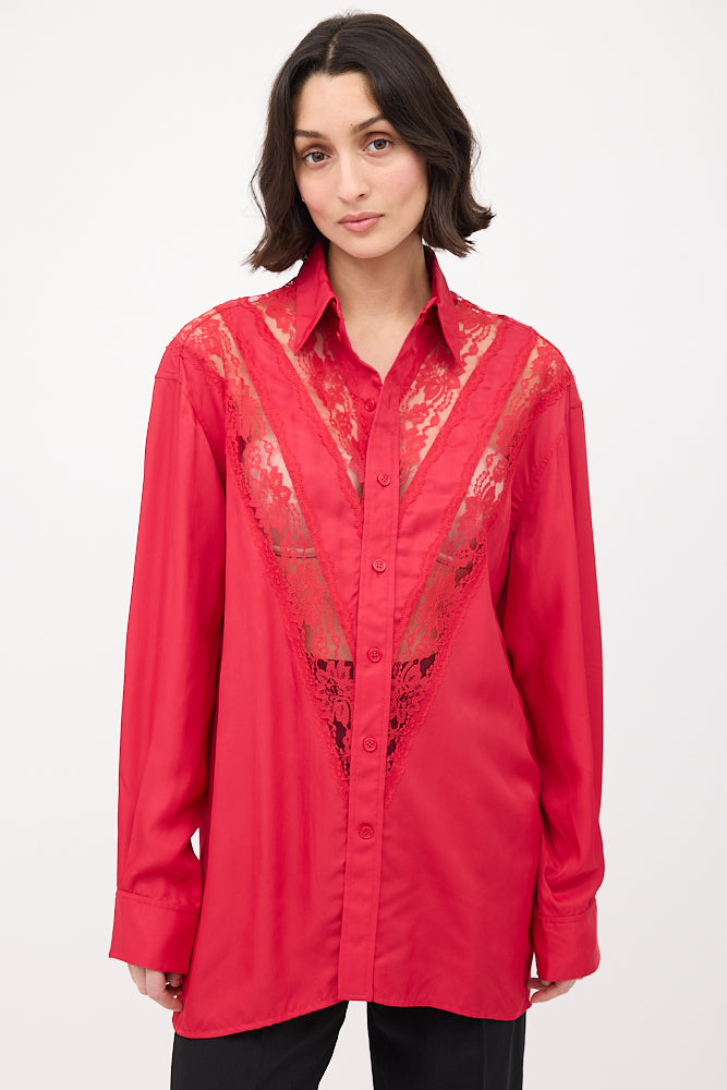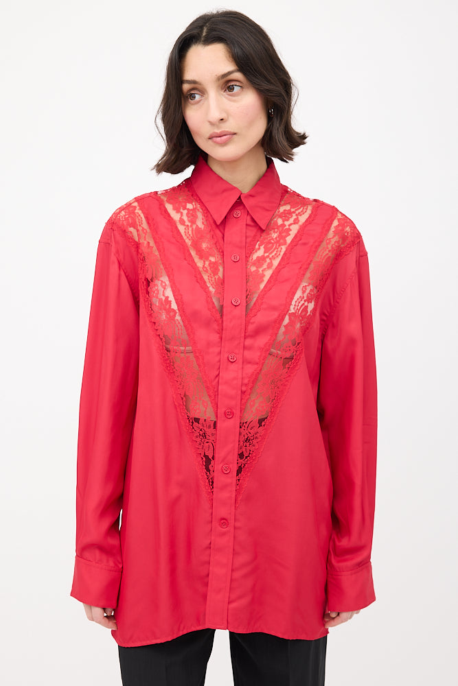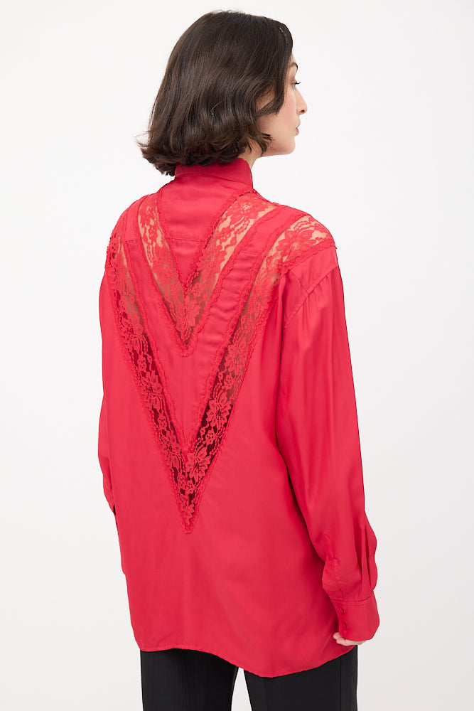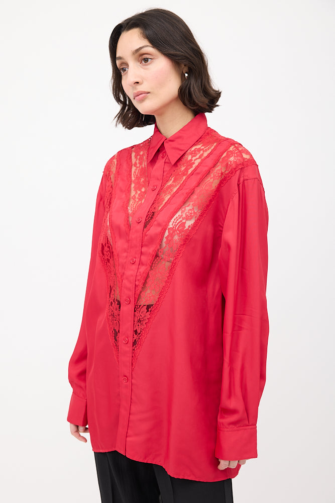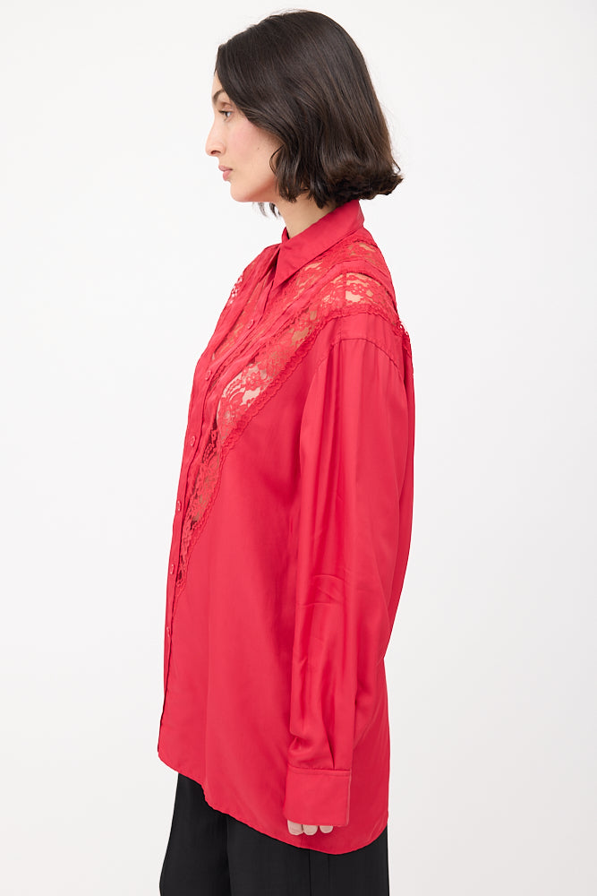Pre-owned Celine red shirt featuring a point collar, button up front closure, floral Chantilly lace panelling at front and back body, and pleated and buttoned cuffs.