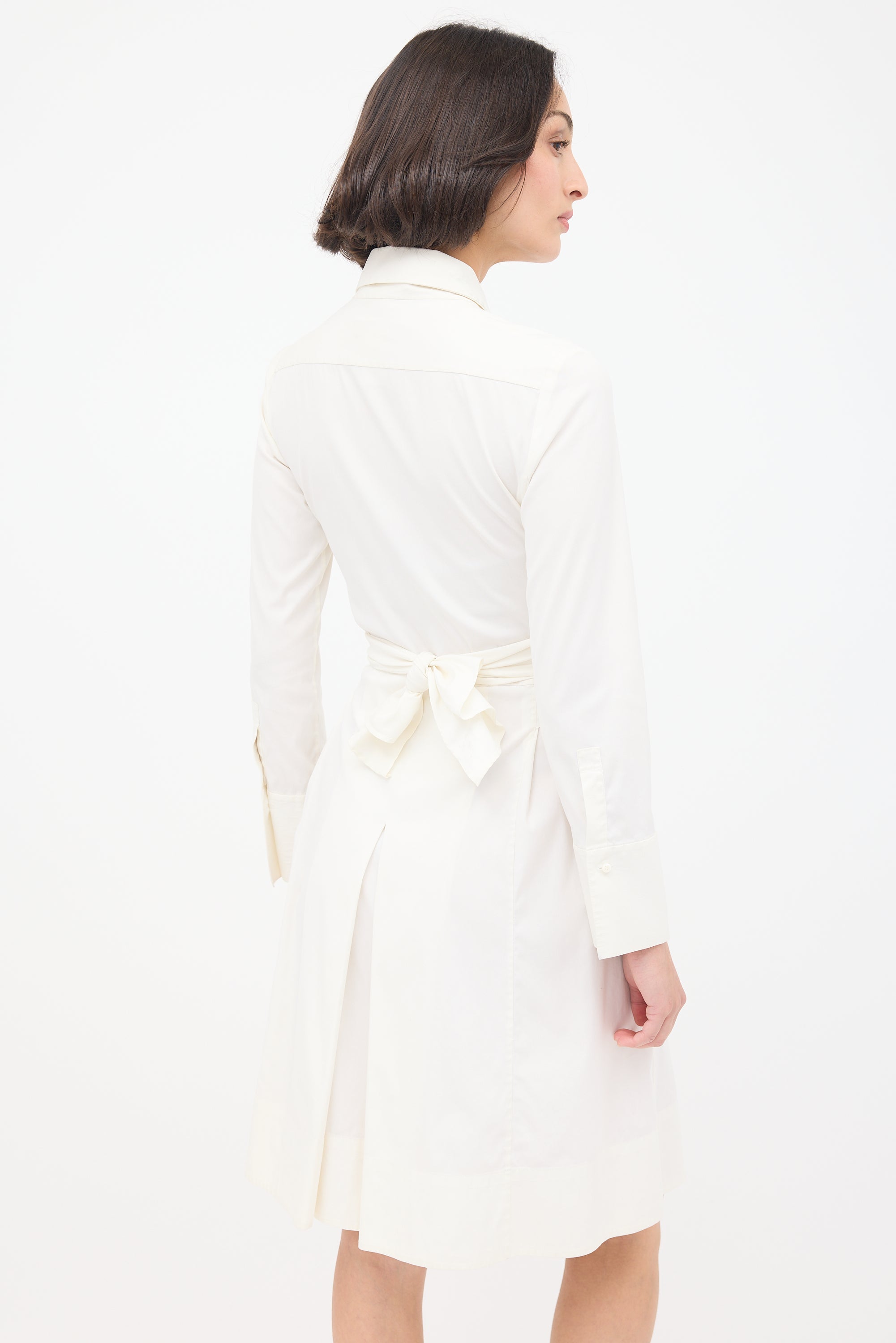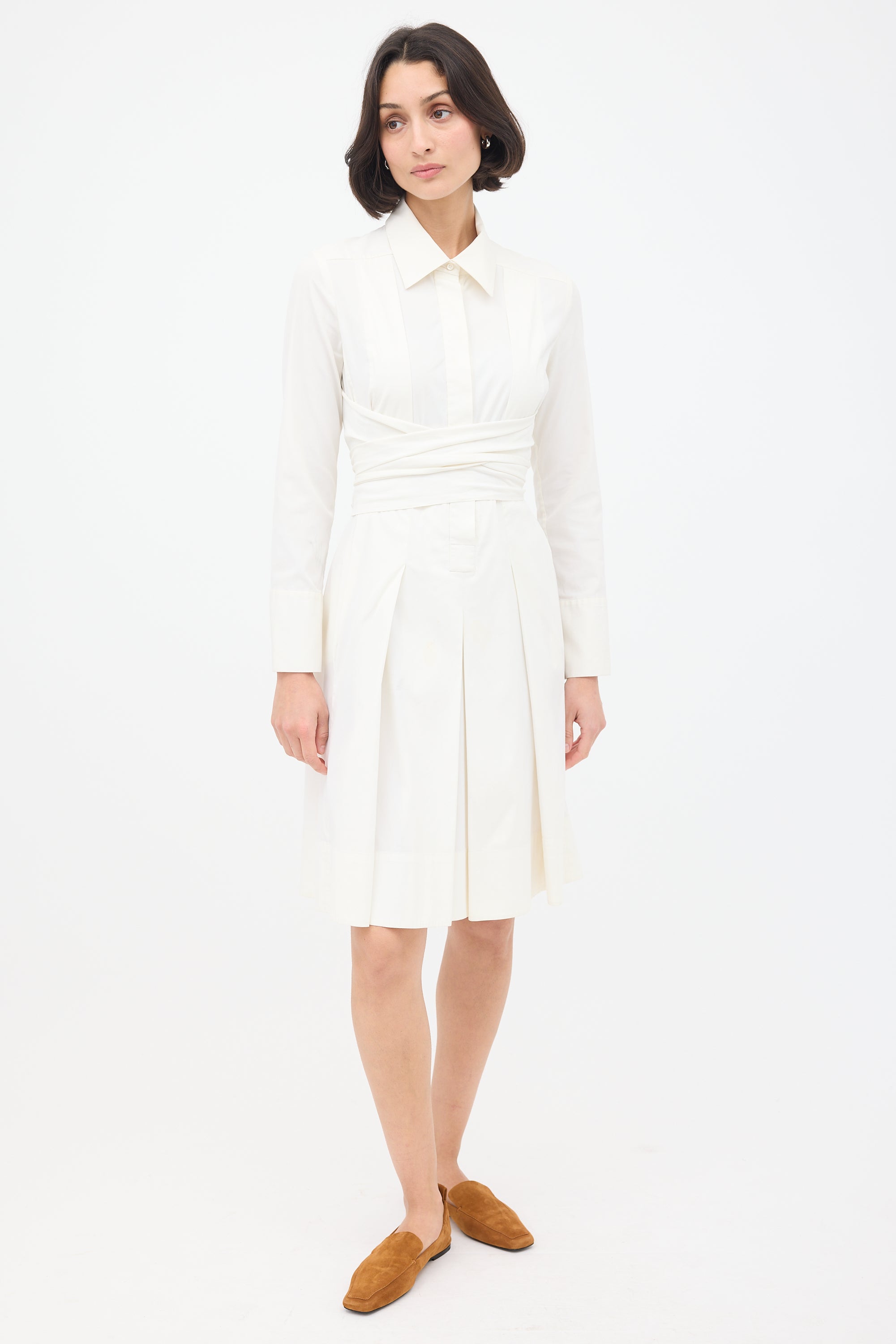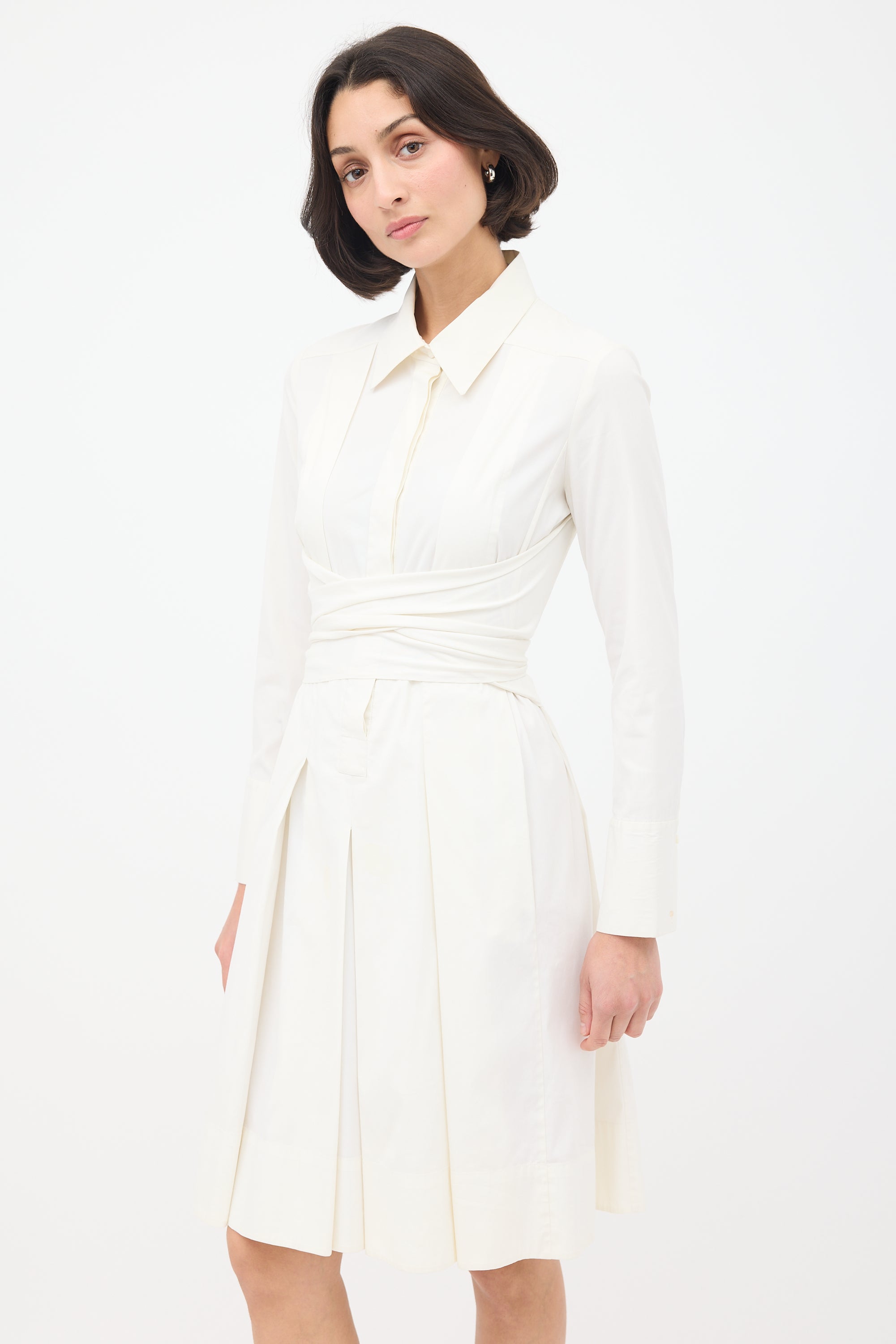 Pre-owned Celine white cotton blend midi shirt dress featuring a spread collar, concealed button up upper front, pleating at front bodice, sash tie waist, box pleated A-line skirt, and long sleeves with buttoned cuffs.