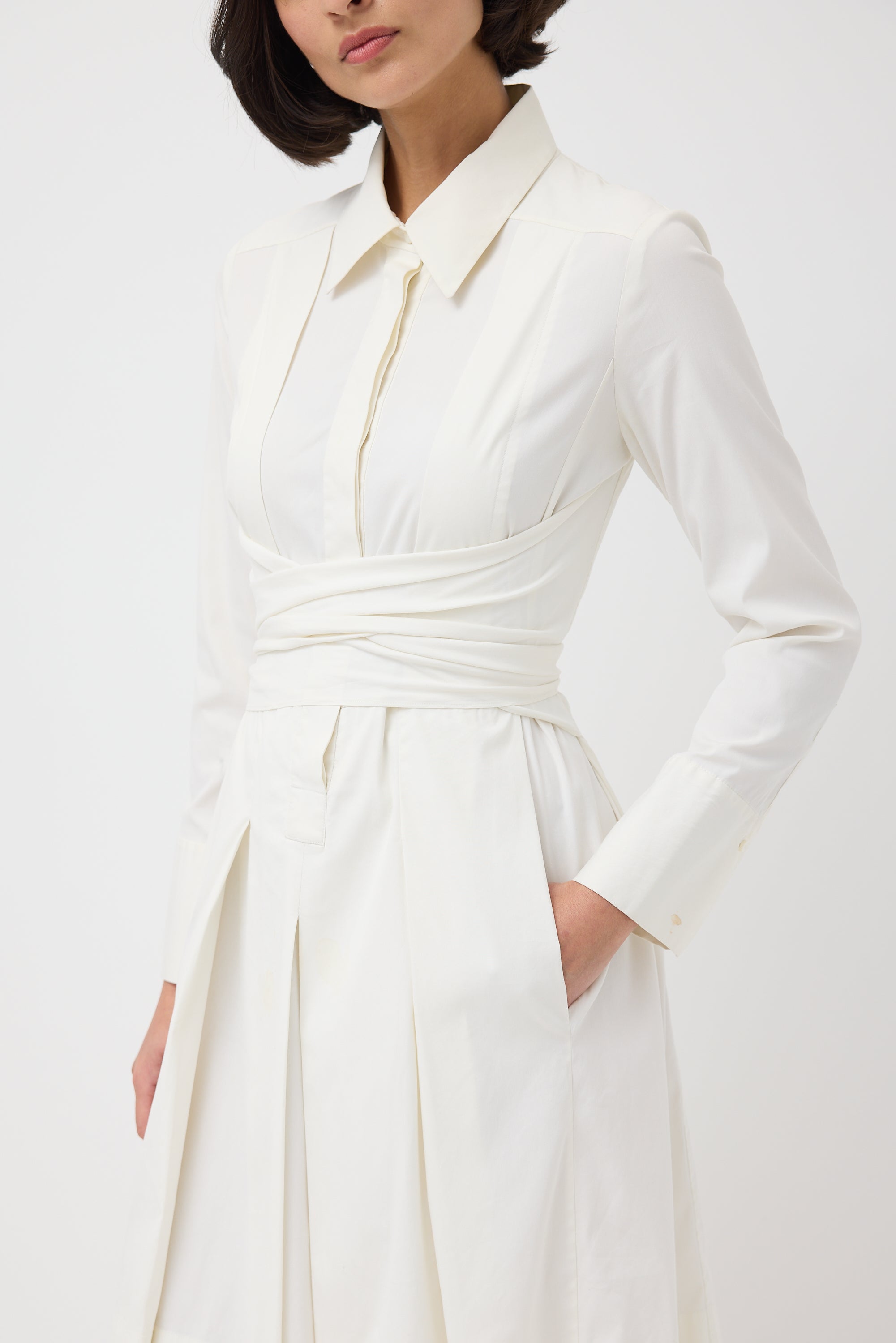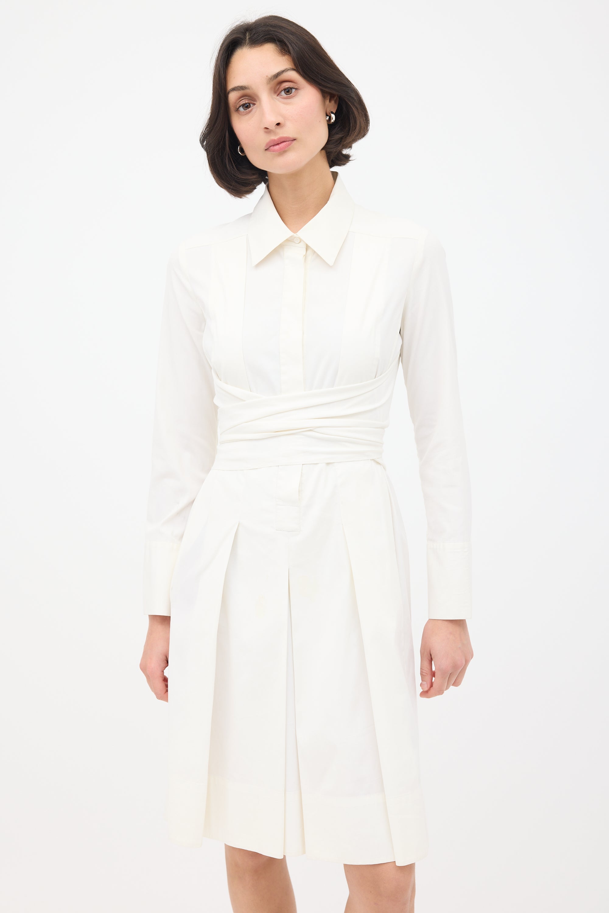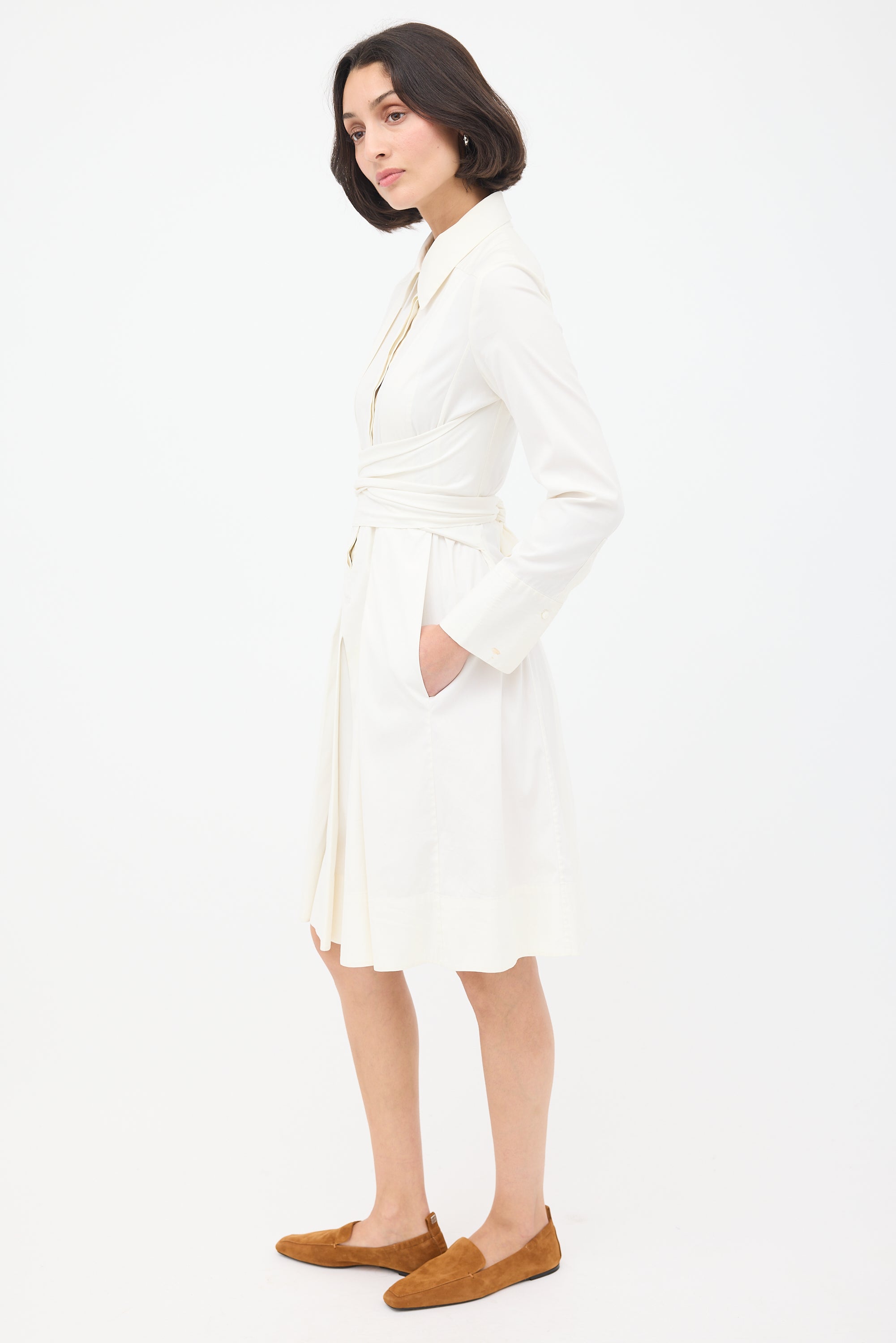Pre-owned Celine white cotton blend midi shirt dress featuring a spread collar, concealed button up upper front, pleating at front bodice, sash tie waist, box pleated A-line skirt, and long sleeves with buttoned cuffs.