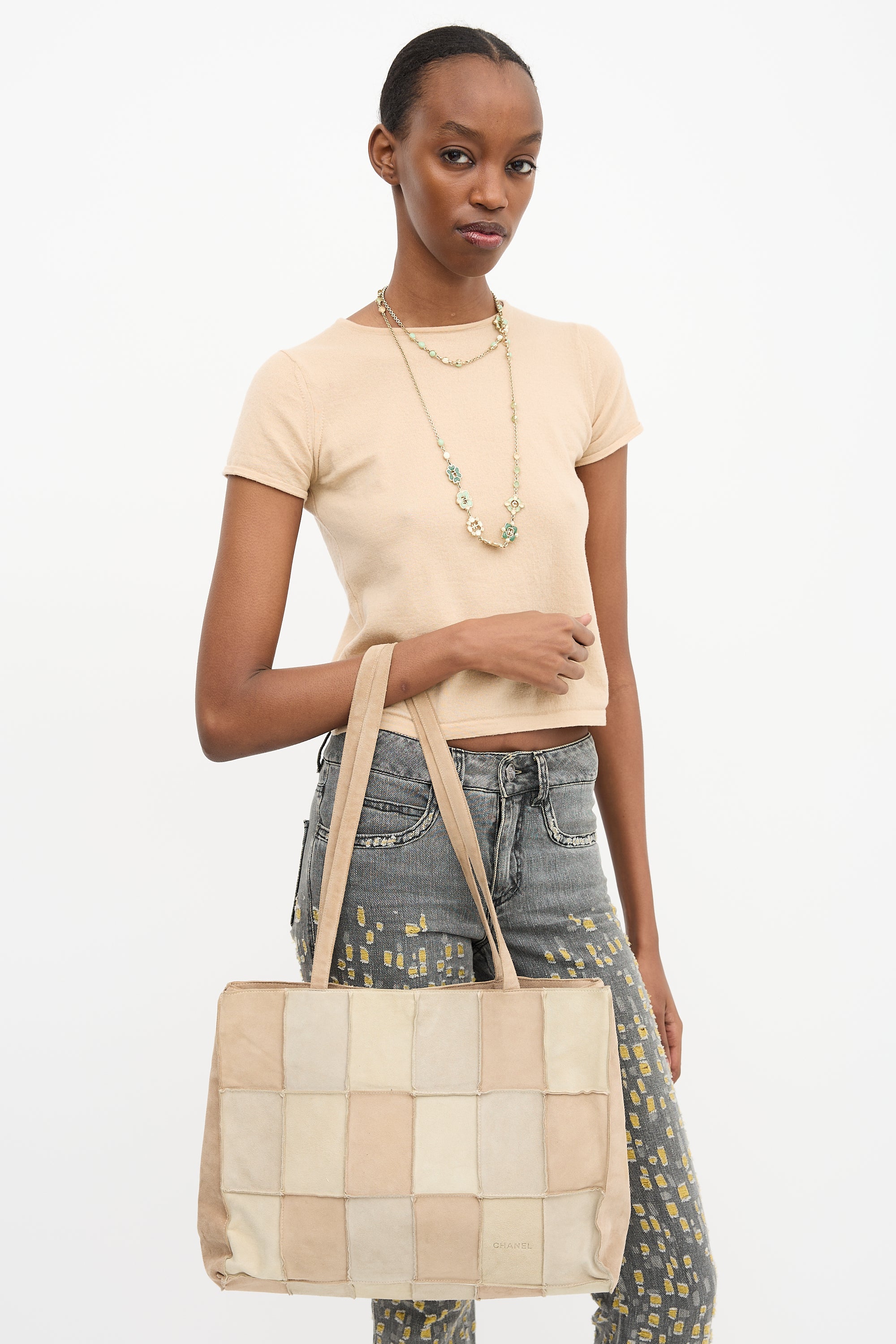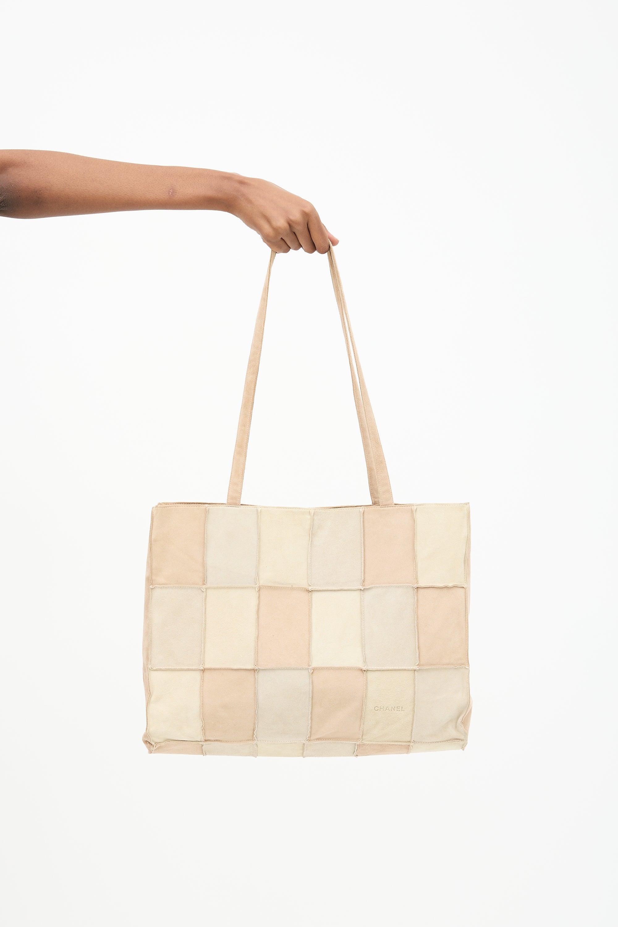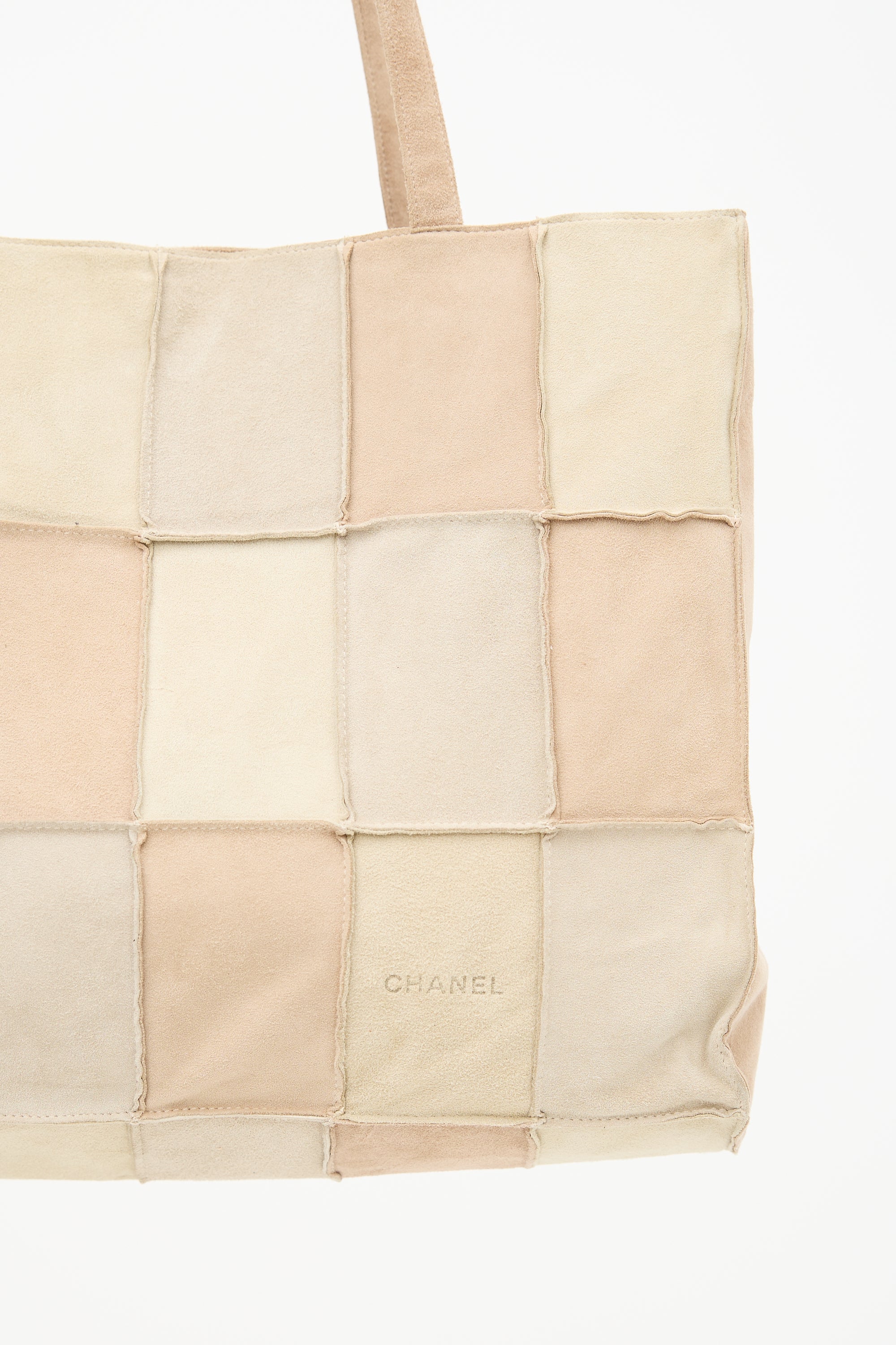 Pre-owned Chanel 2000-2002 beige suede patch work tote bag featuring two flat top handles, raw edge seams, debossed logo at front, single snap buttoned top, and one interior zip pocket.