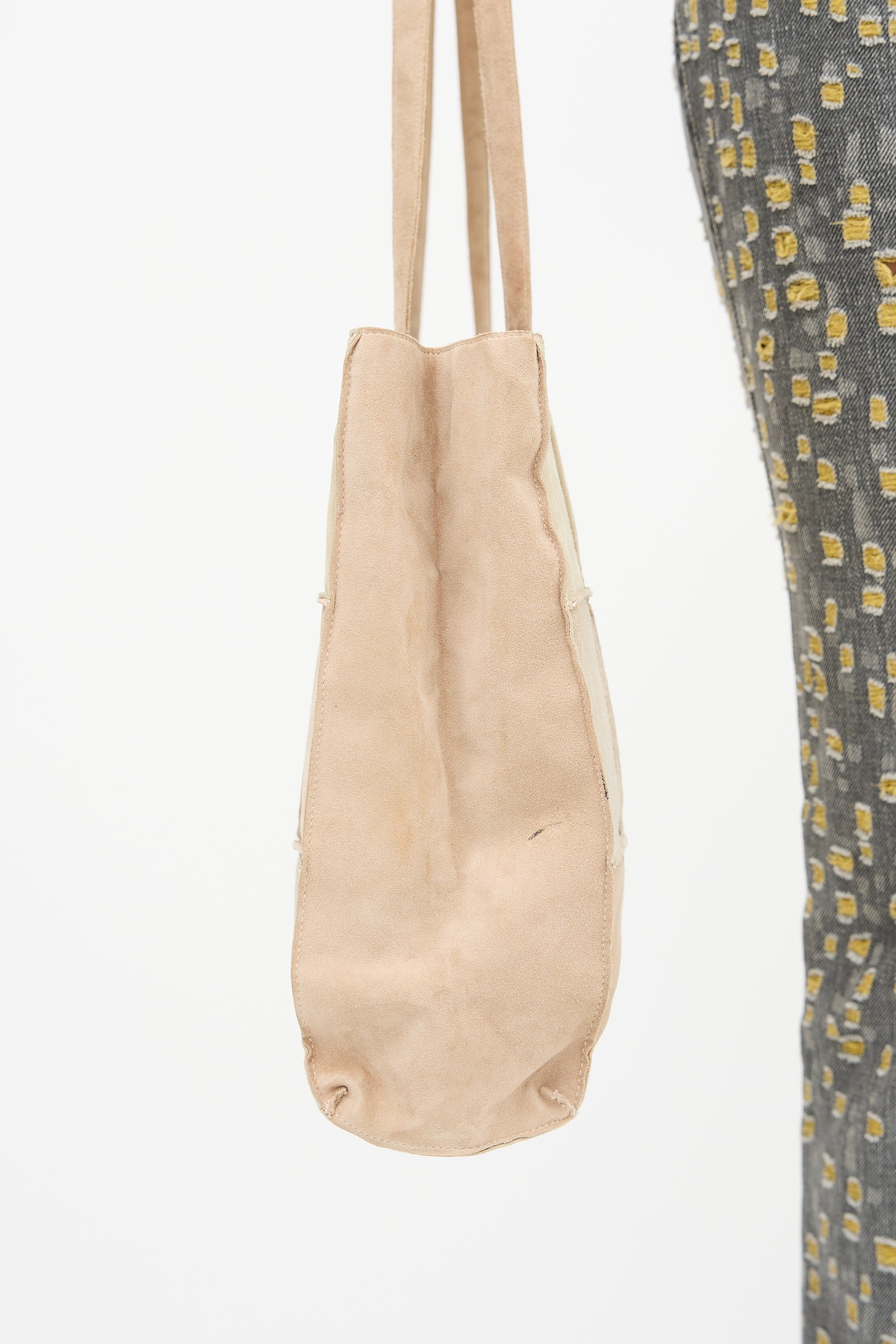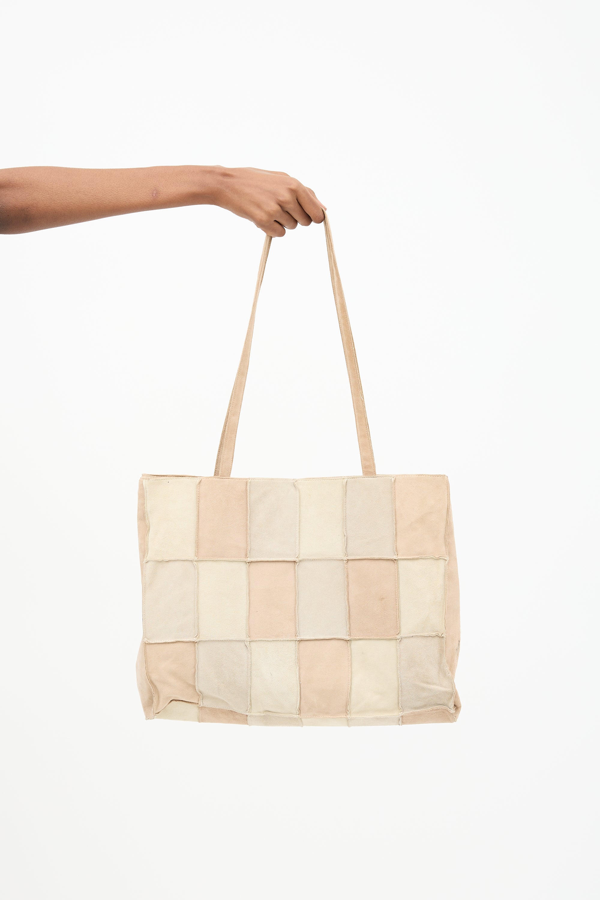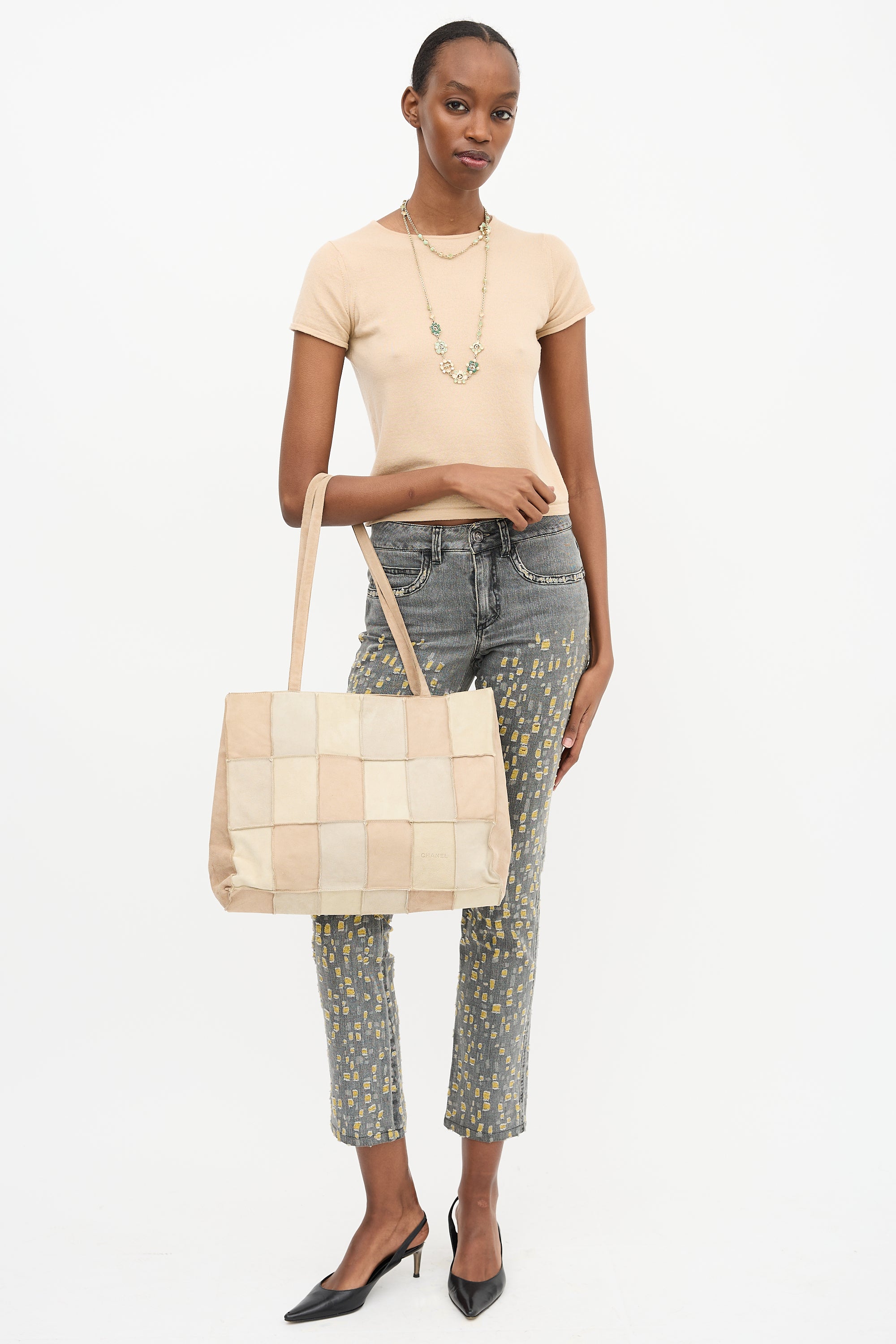 Pre-owned Chanel 2000-2002 beige suede patch work tote bag featuring two flat top handles, raw edge seams, debossed logo at front, single snap buttoned top, and one interior zip pocket.