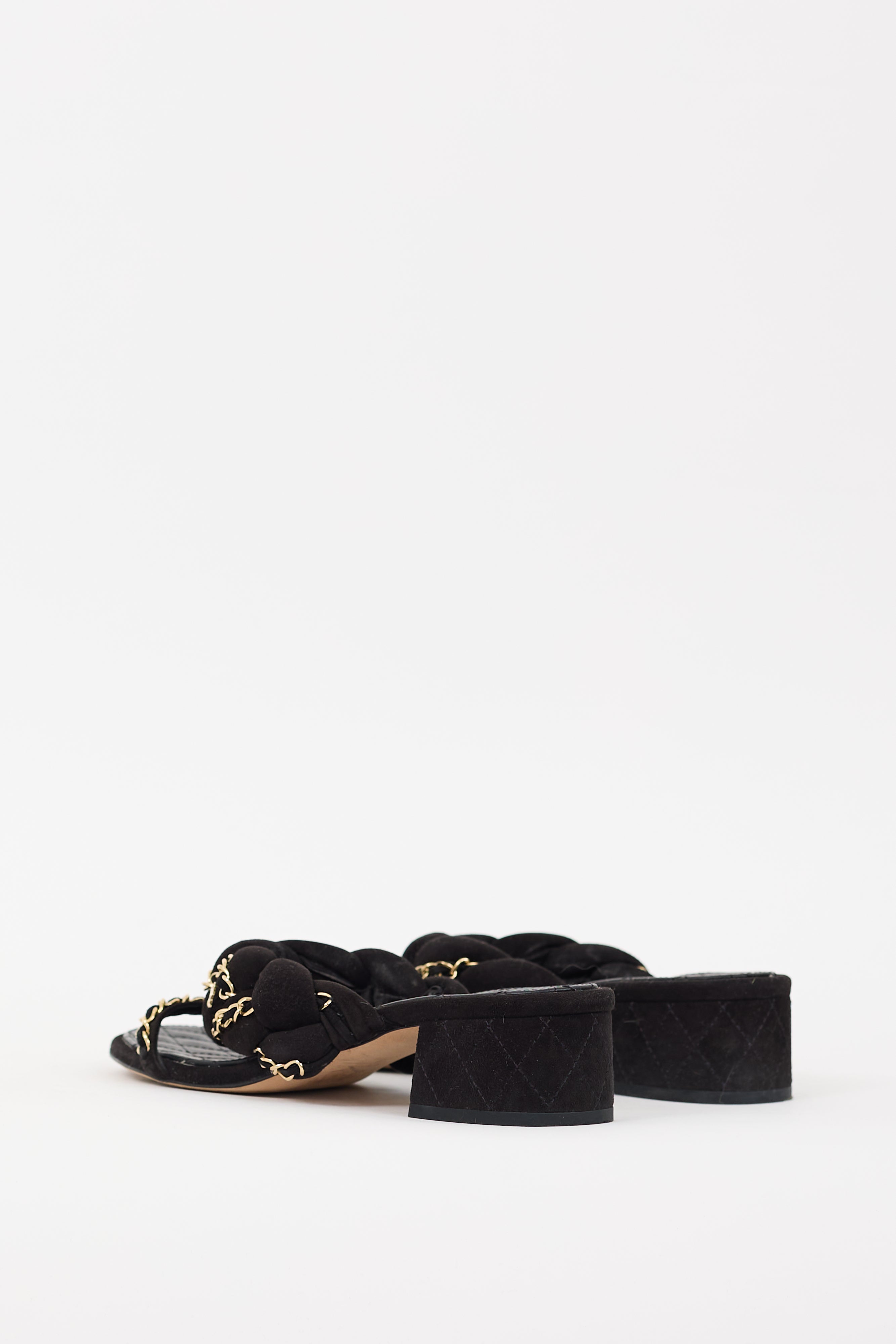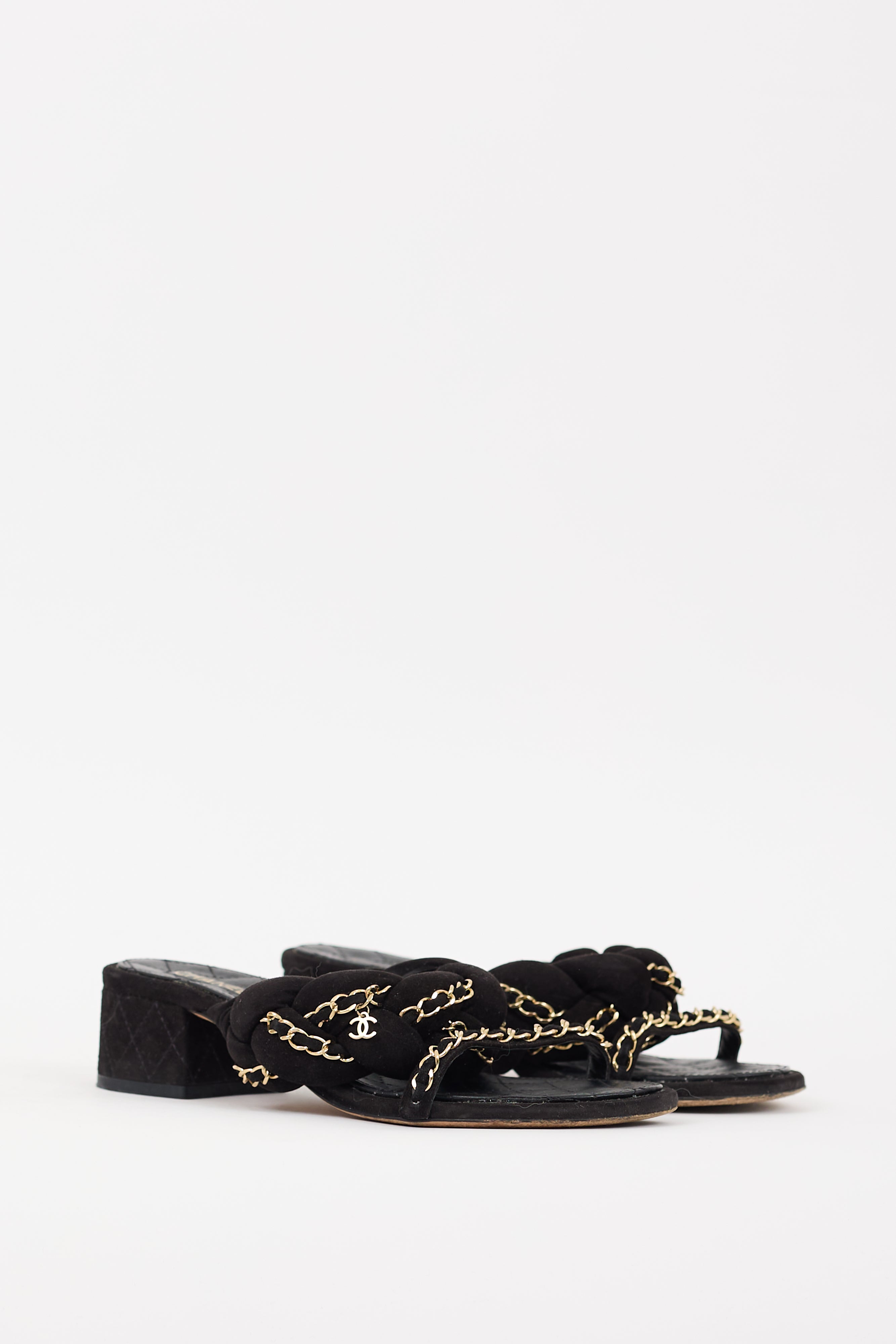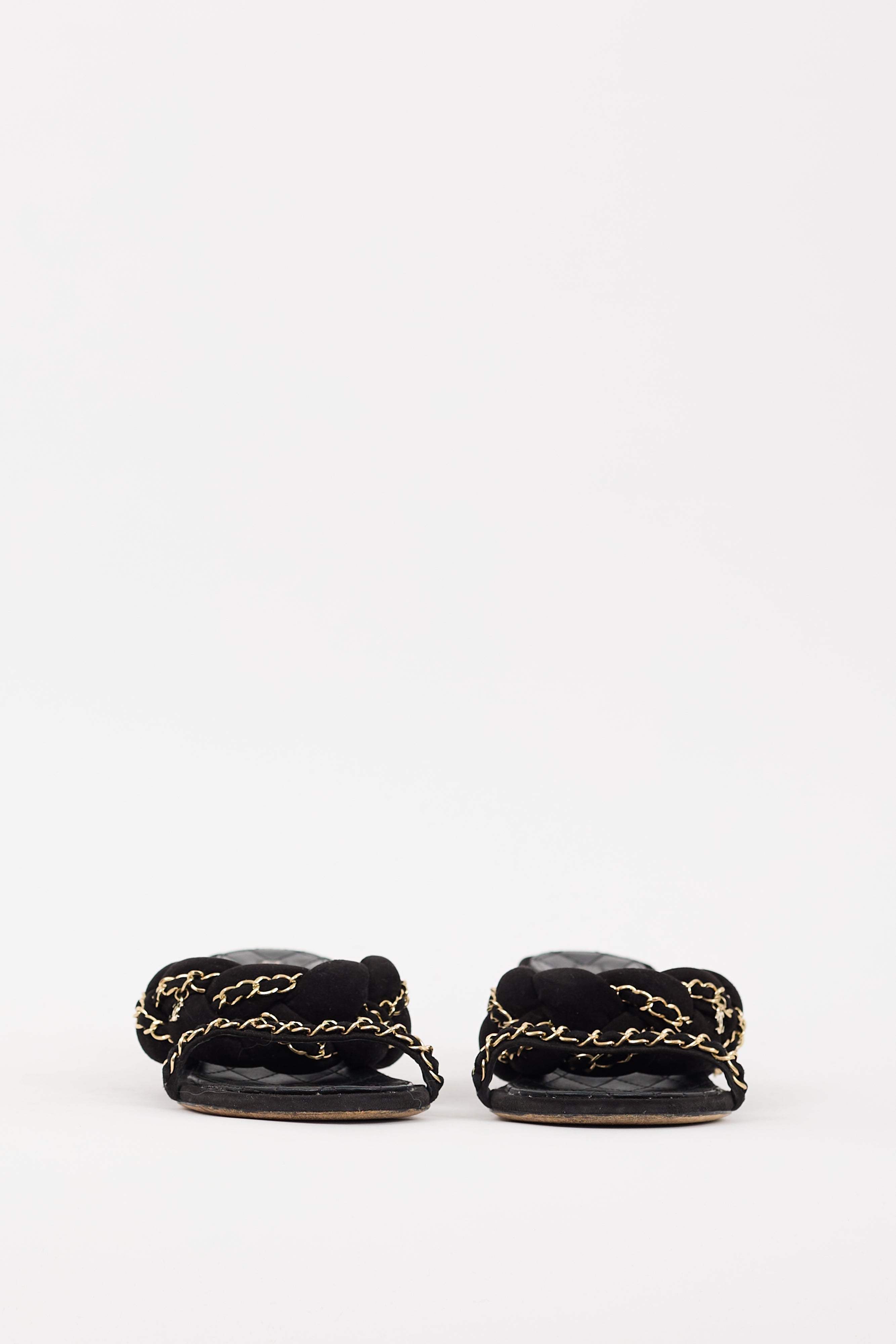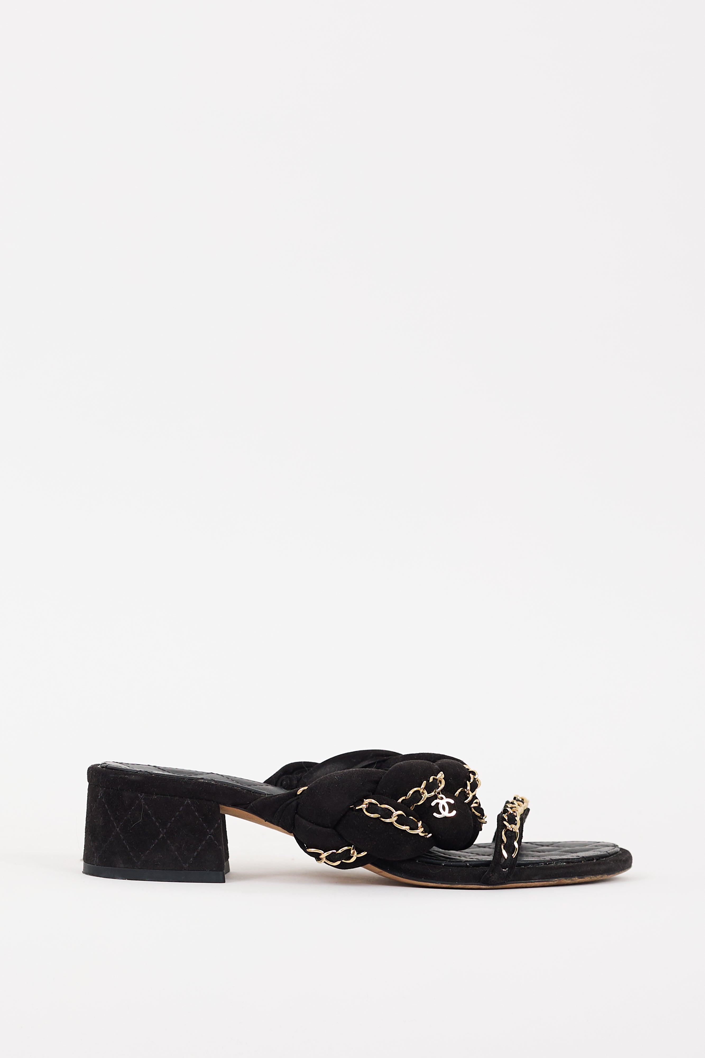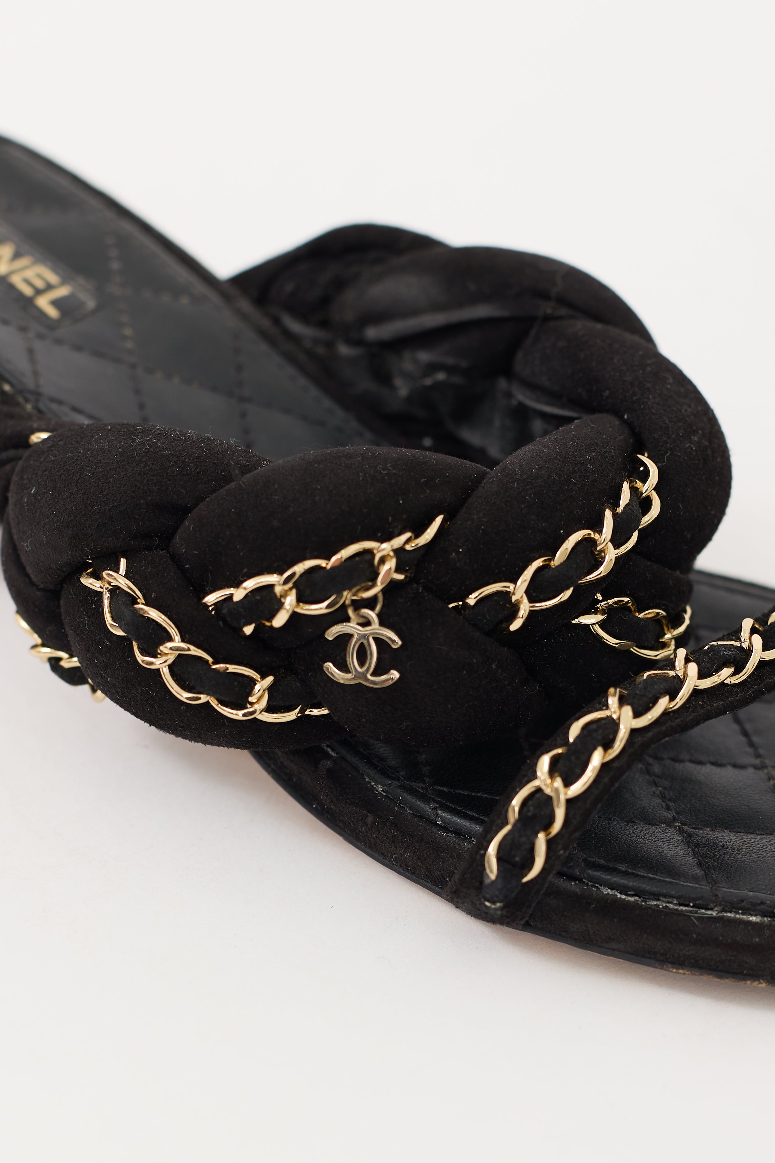 Pre-owned Chanel 2017 black suede sandals featuring an open rounded toe, gold tone hardware, thin strap across vamp with chain detail, chunky braided strap across instep with chain and CC charm detail, and quilted block heel. Comes with original box.